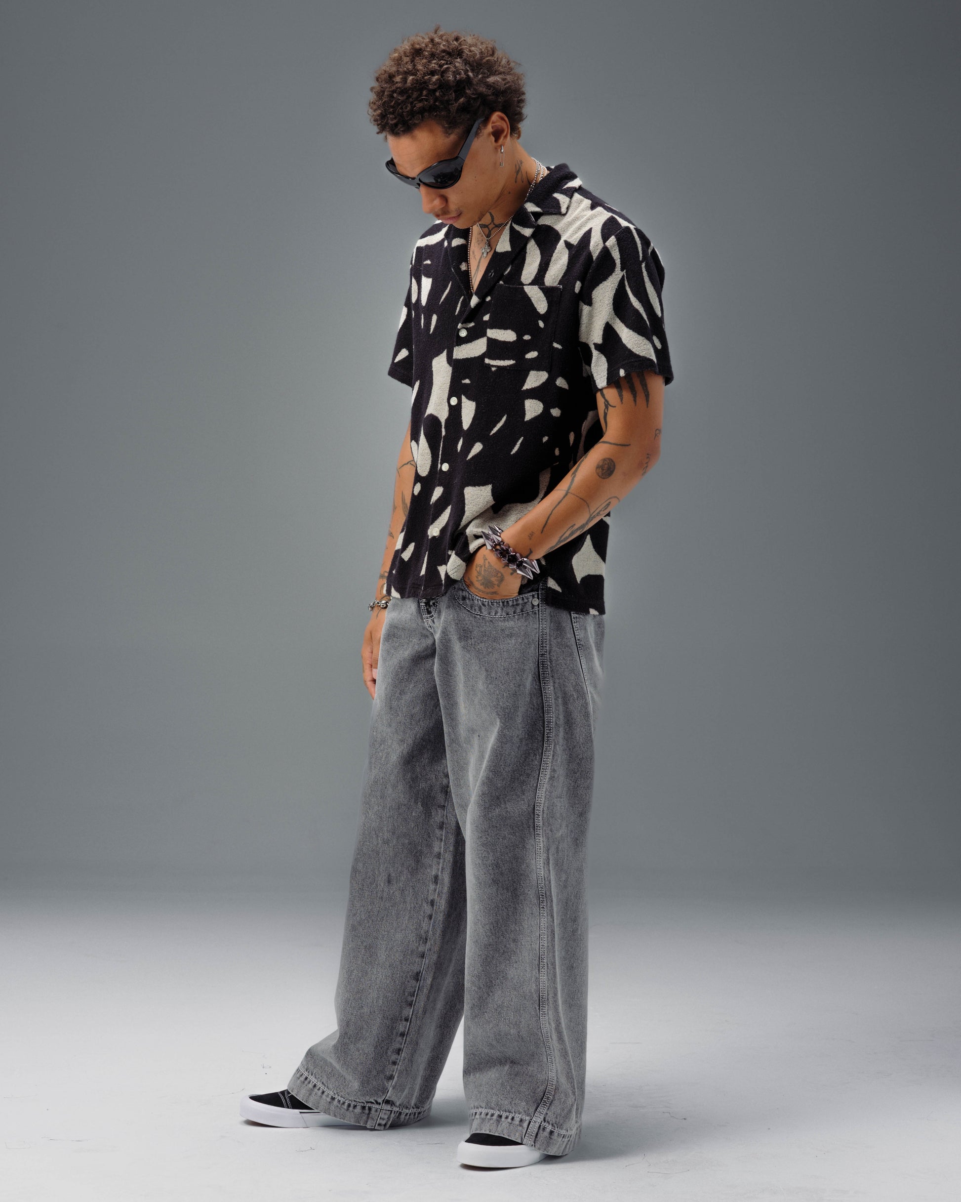 A JNCO classic in Vintage Black denim. 13oz 100% cotton rope-dyed with a luxe starch wax finish and vintage “moonlight” wash. 26" bottom opening with contrast stitching and wide double-stitched scoop and back pockets. Features original artwork, labels, and metallic swivel J embroidery on back pocket. Collectible flasher included.