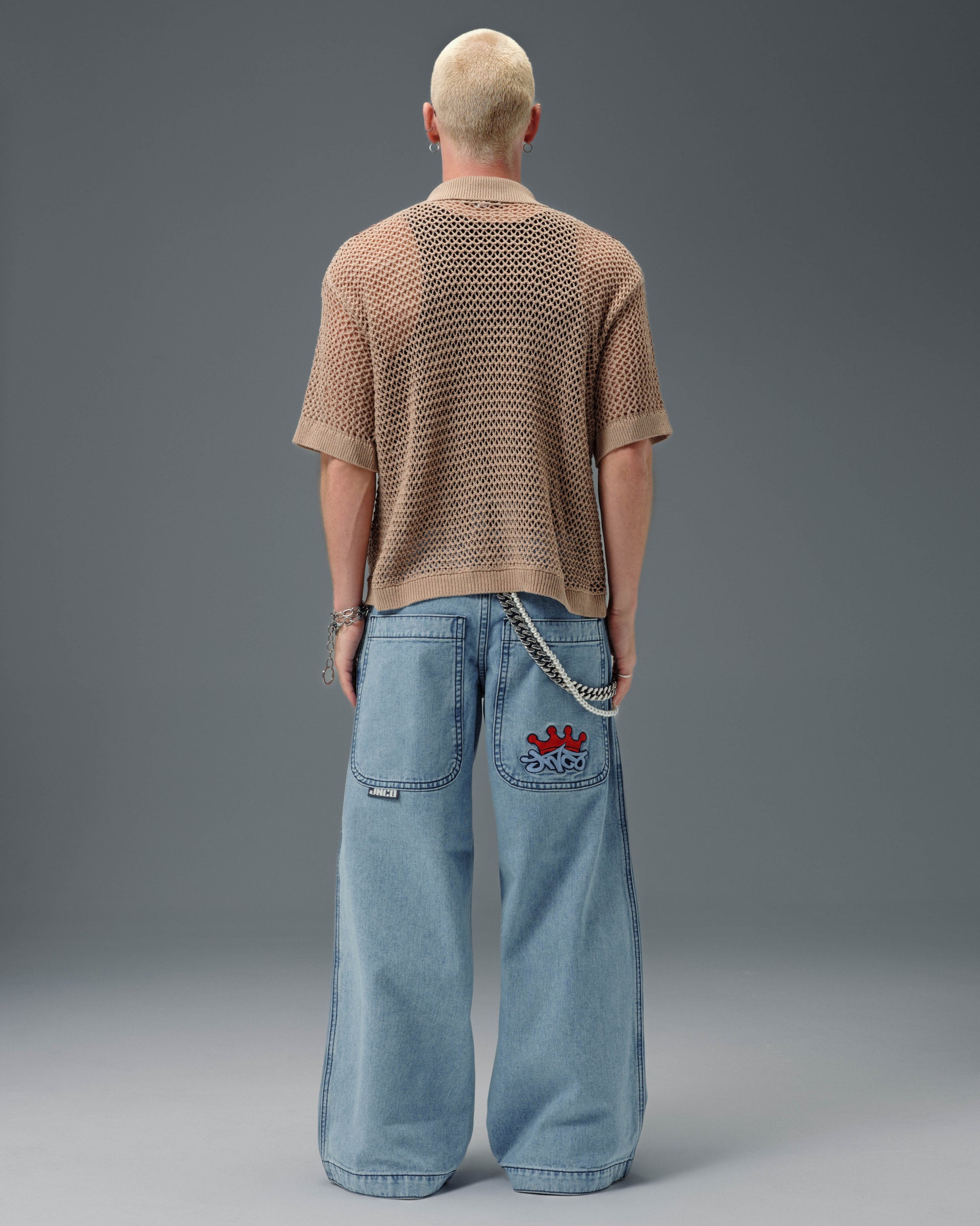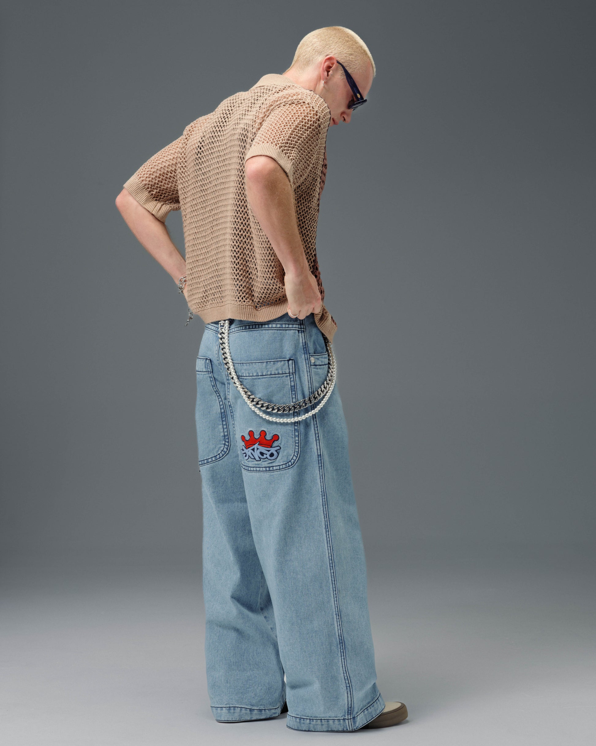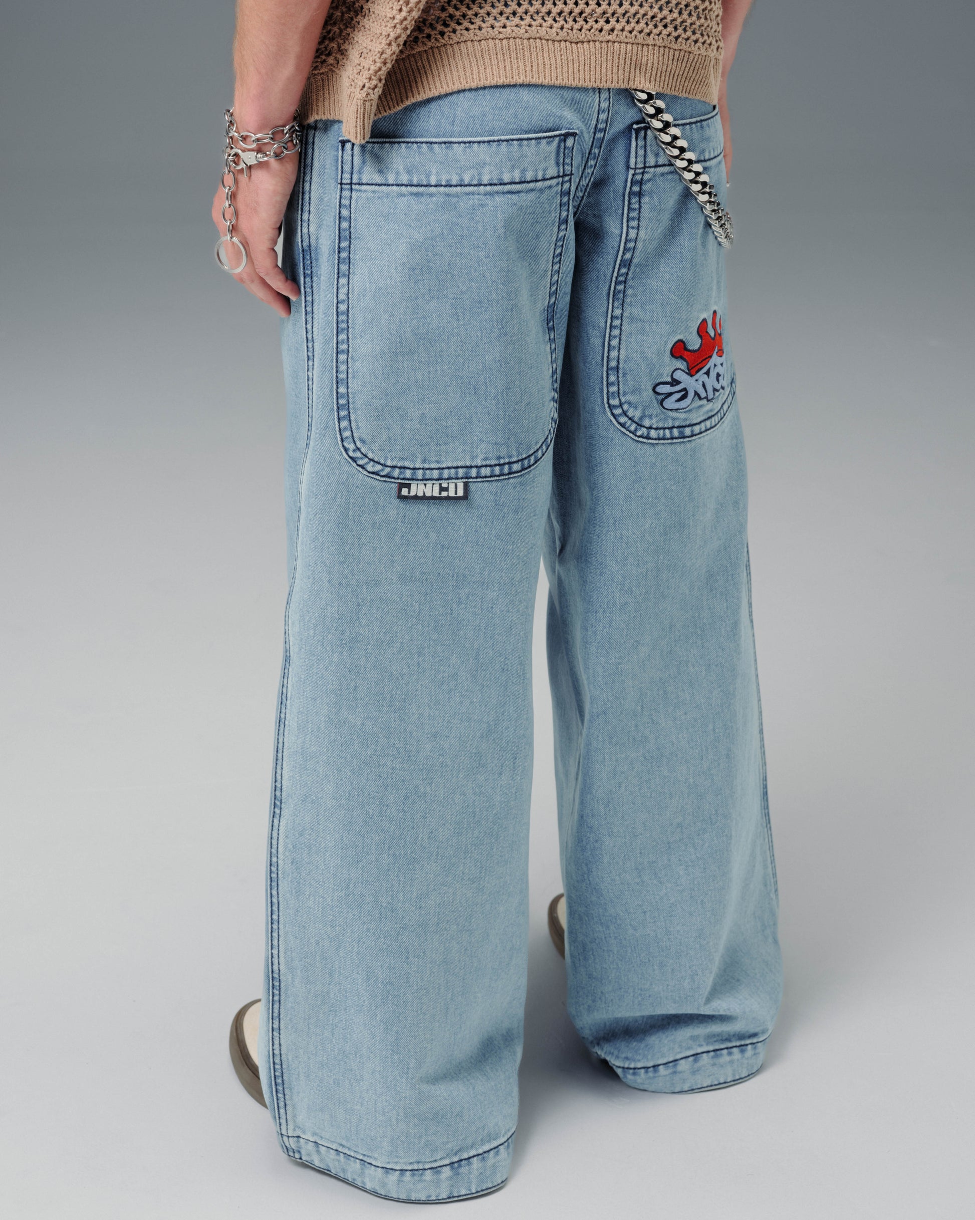 A revamped rendition of the original Twin Cannon in a classic Antique Wash. 14oz 100% cotton denim with a 3x1 left-hand weave and original contrast stitching. 26" bottom opening with double chain stitch detailing on the waistband and hem. Features the iconic JNCO Crown logo embroidery, and new custom buttons and rivets. Collectible new edition flasher included.