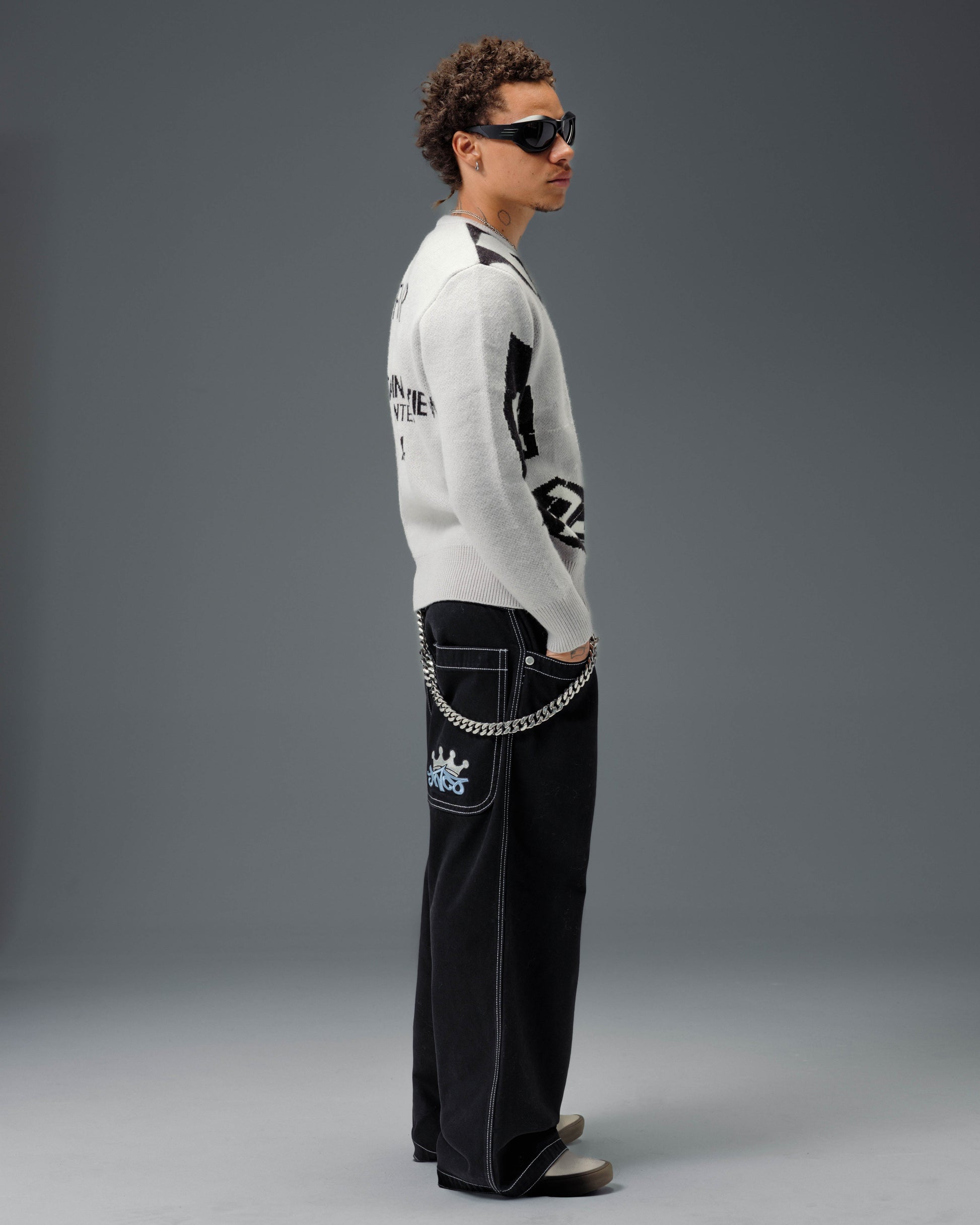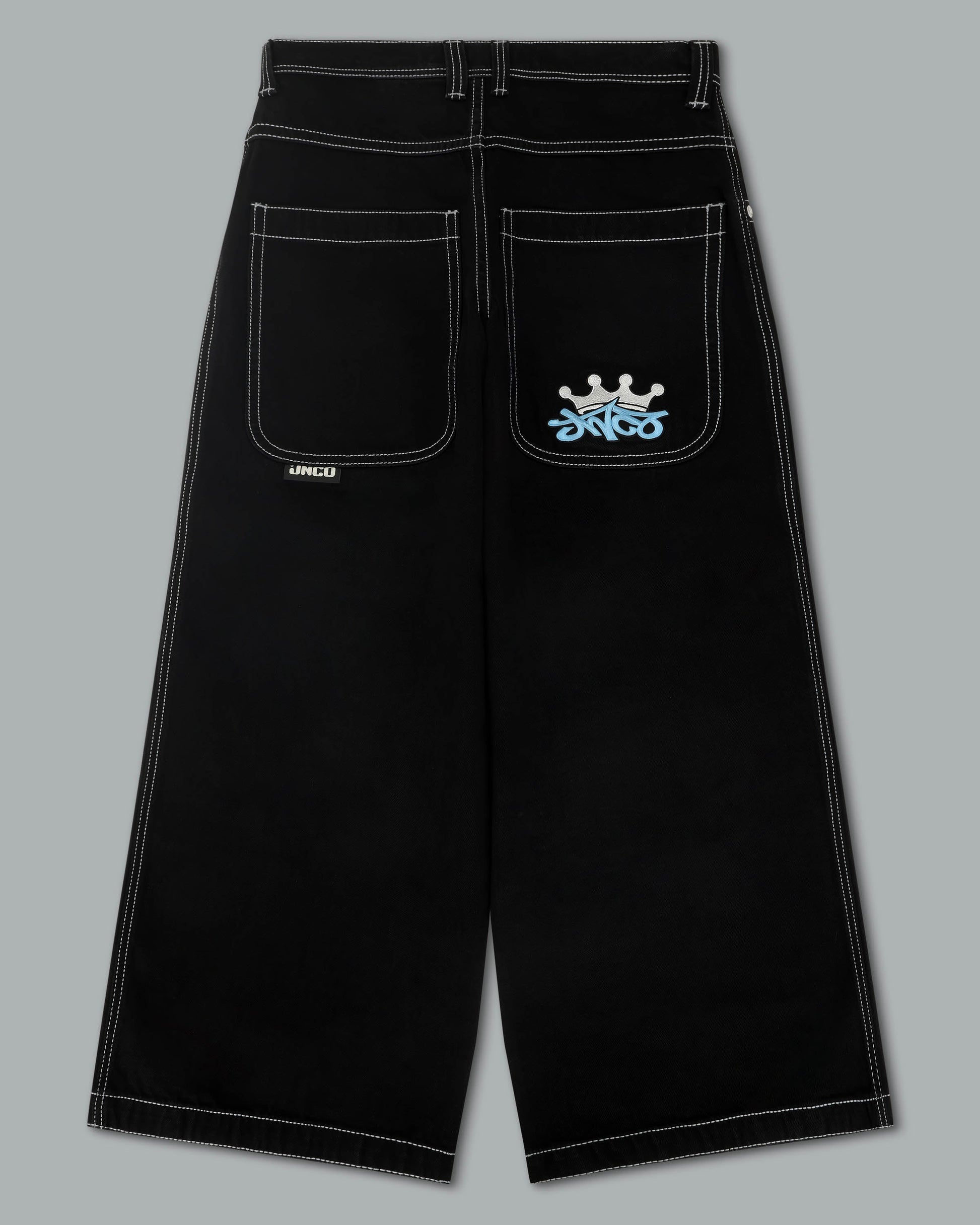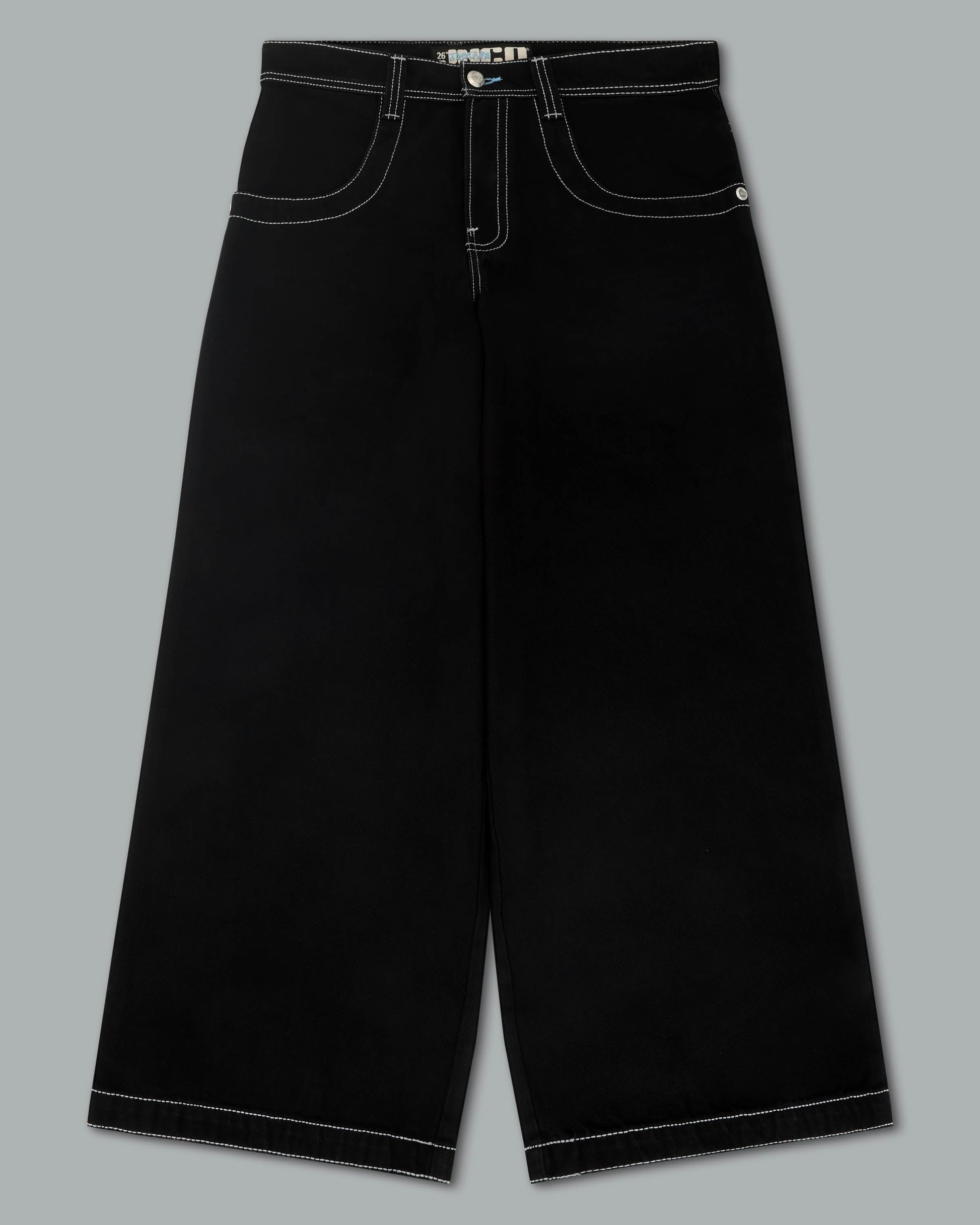 A revamped rendition of the original Twin Cannon, now elevated with bold new detailing. 13oz 100% cotton rope-dyed Jet Black denim, finished with a blended starch wax for a smooth, luxurious feel. 26" bottom opening with original contrast stitching and double chain stitch details at the waistband and hem. Features iconic JNCO Crown logo metallic embroidery, and new custom buttons and rivets. Collectible new edition flasher included.