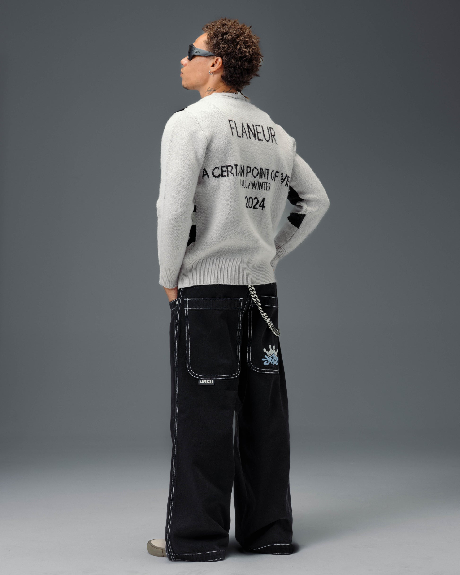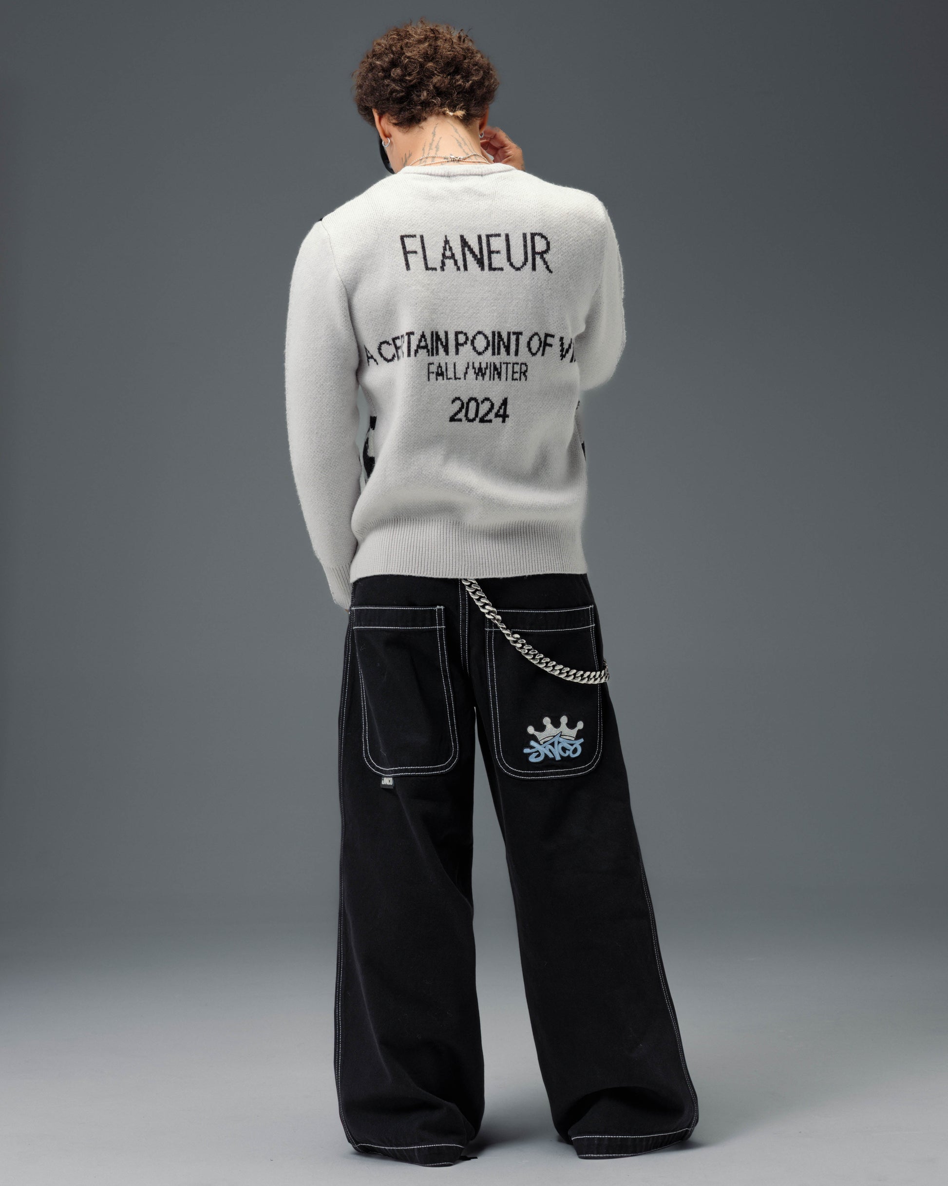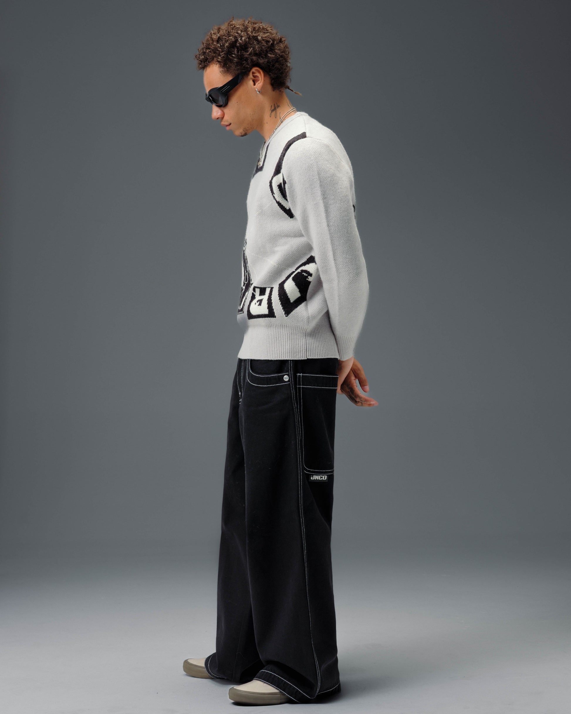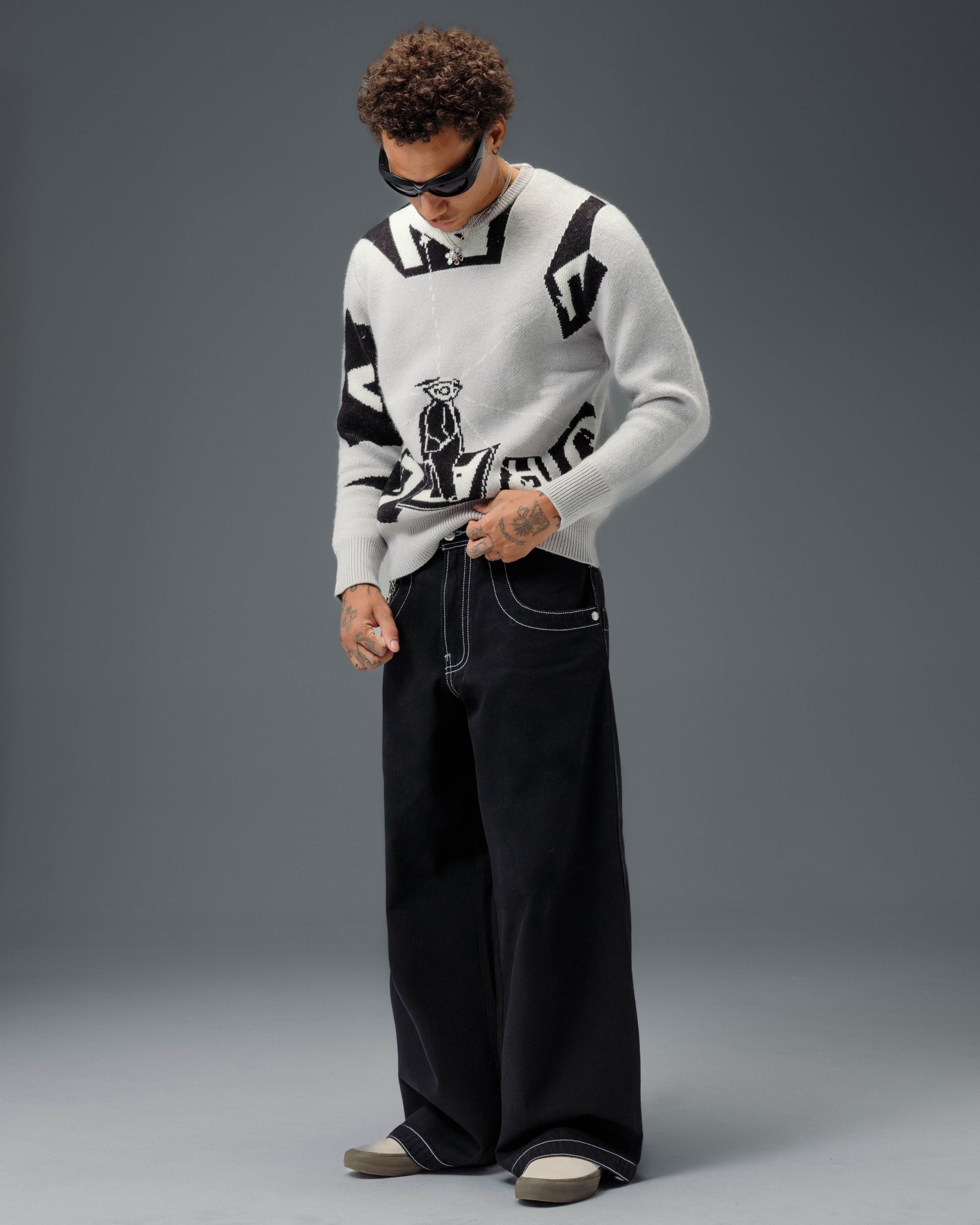 A revamped rendition of the original Twin Cannon, now elevated with bold new detailing. 13oz 100% cotton rope-dyed Jet Black denim, finished with a blended starch wax for a smooth, luxurious feel. 26" bottom opening with original contrast stitching and double chain stitch details at the waistband and hem. Features iconic JNCO Crown logo metallic embroidery, and new custom buttons and rivets. Collectible new edition flasher included.