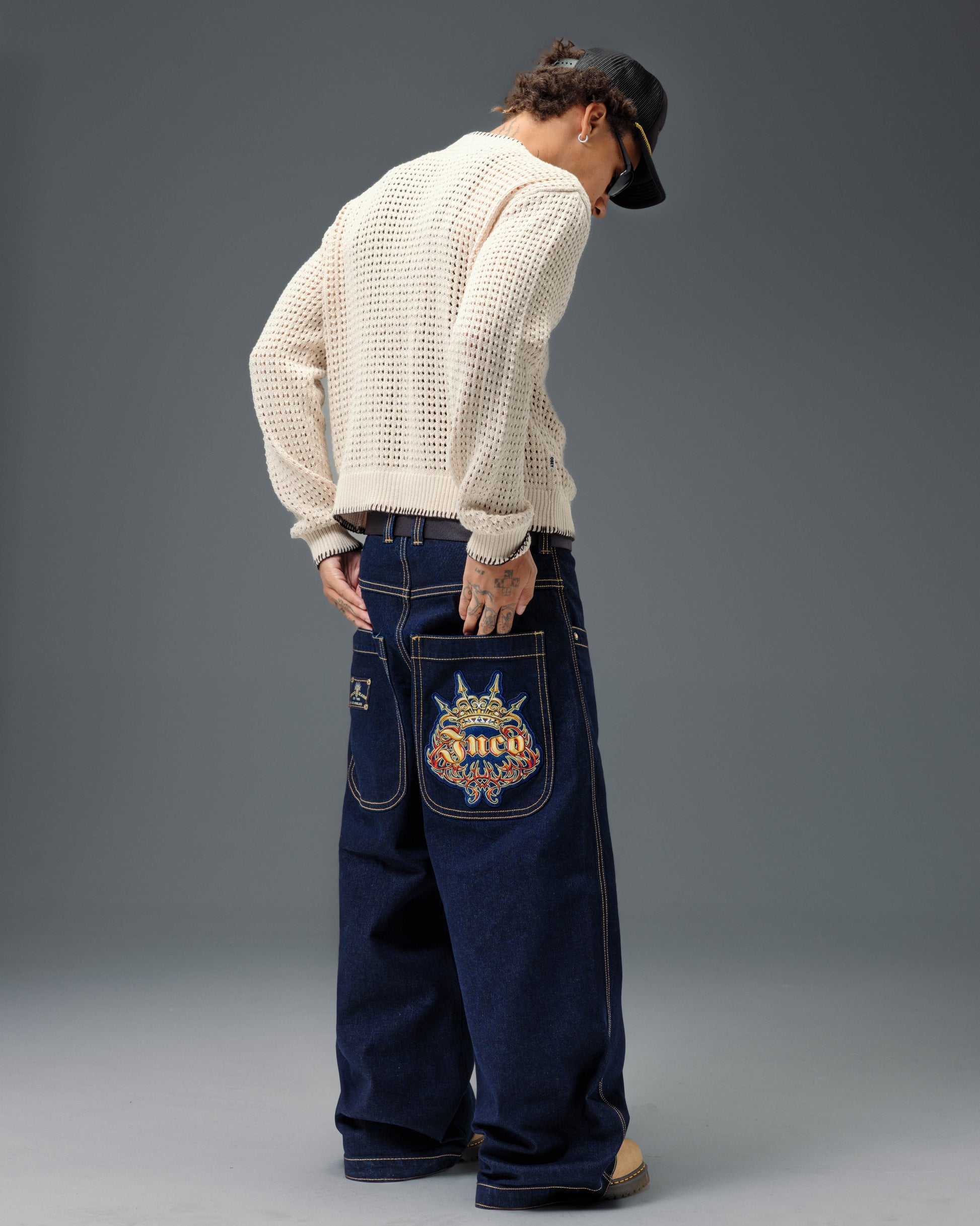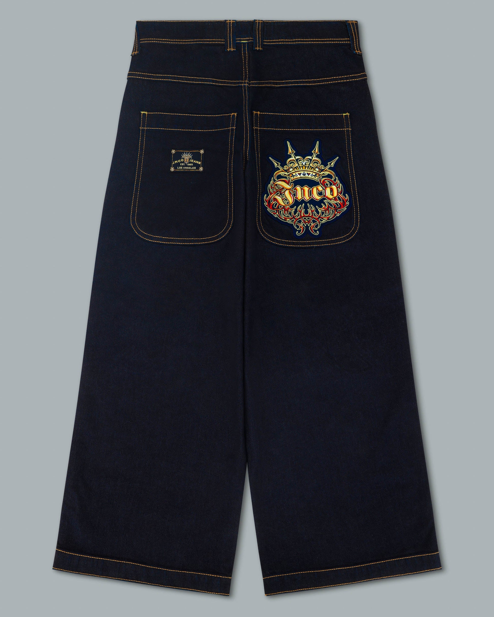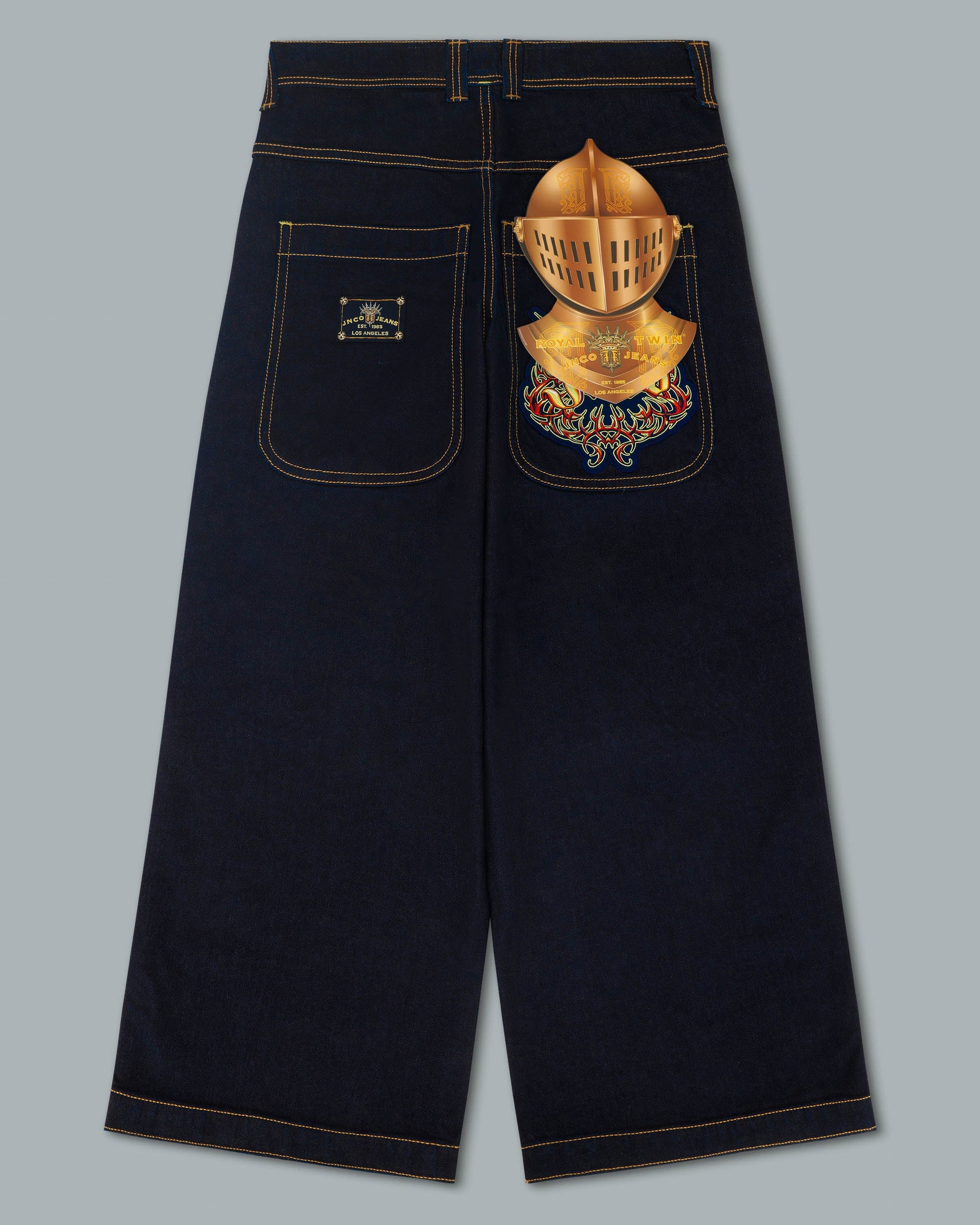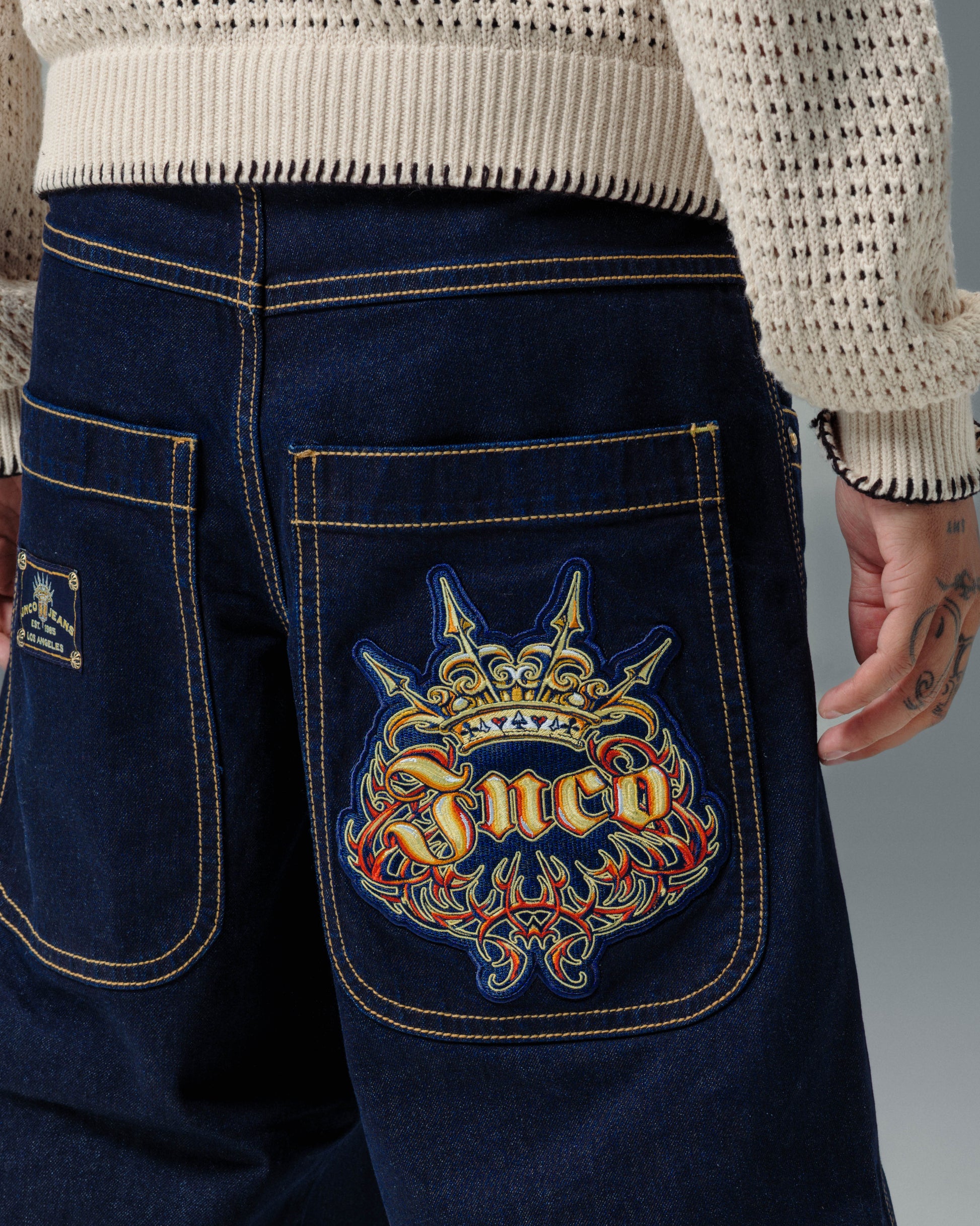 A fusion of JNCO’s Twin Cannons and Royals. Deep indigo with resin treatment, semi-rigid feel. 26" bottom opening with original contrast stitching. Features wide double topstitching, Royal embroidery patch (80,000 stitches), and exclusive “J” monogram (160,000 metallic gold stitches). Custom rivets and collectible flasher included.