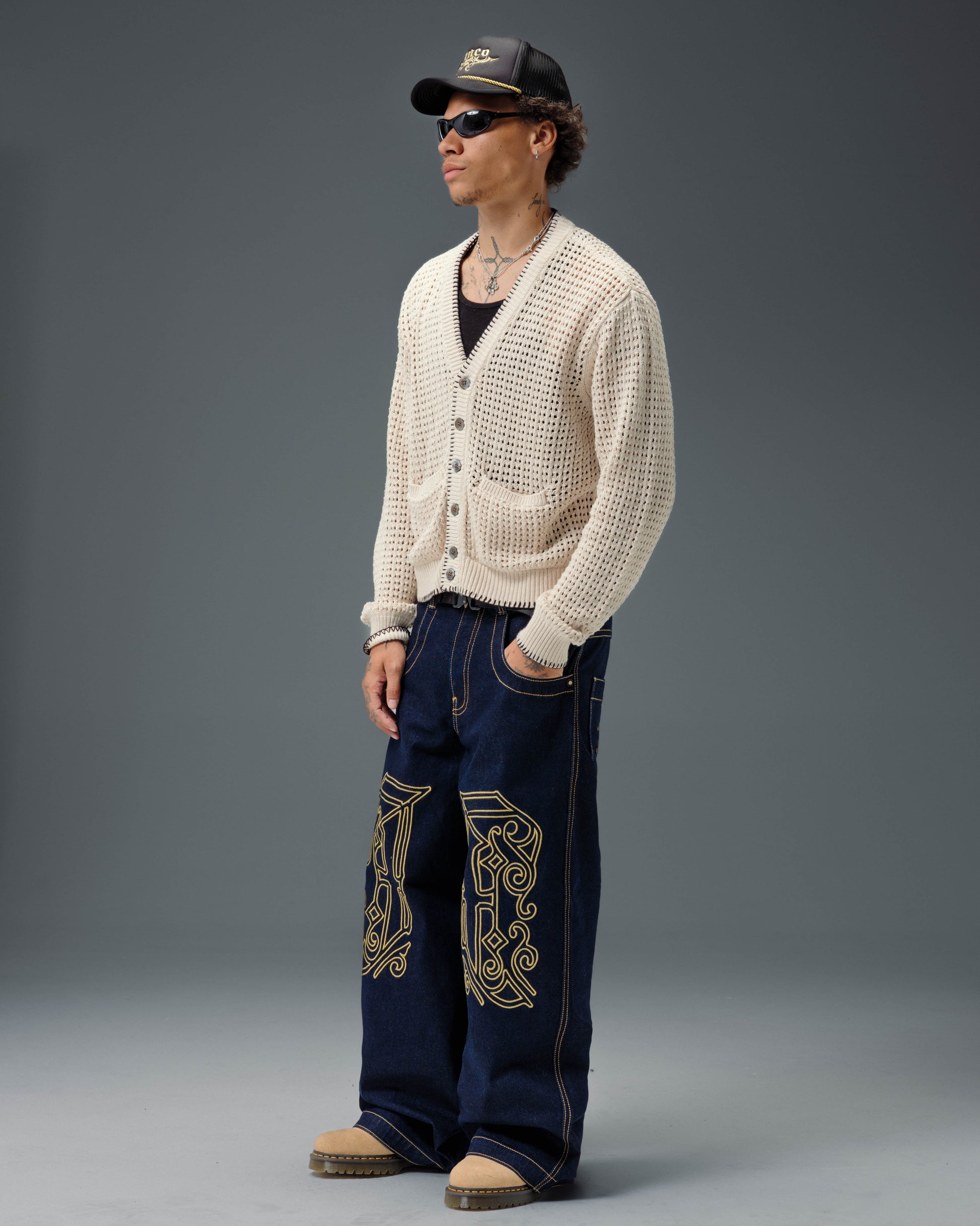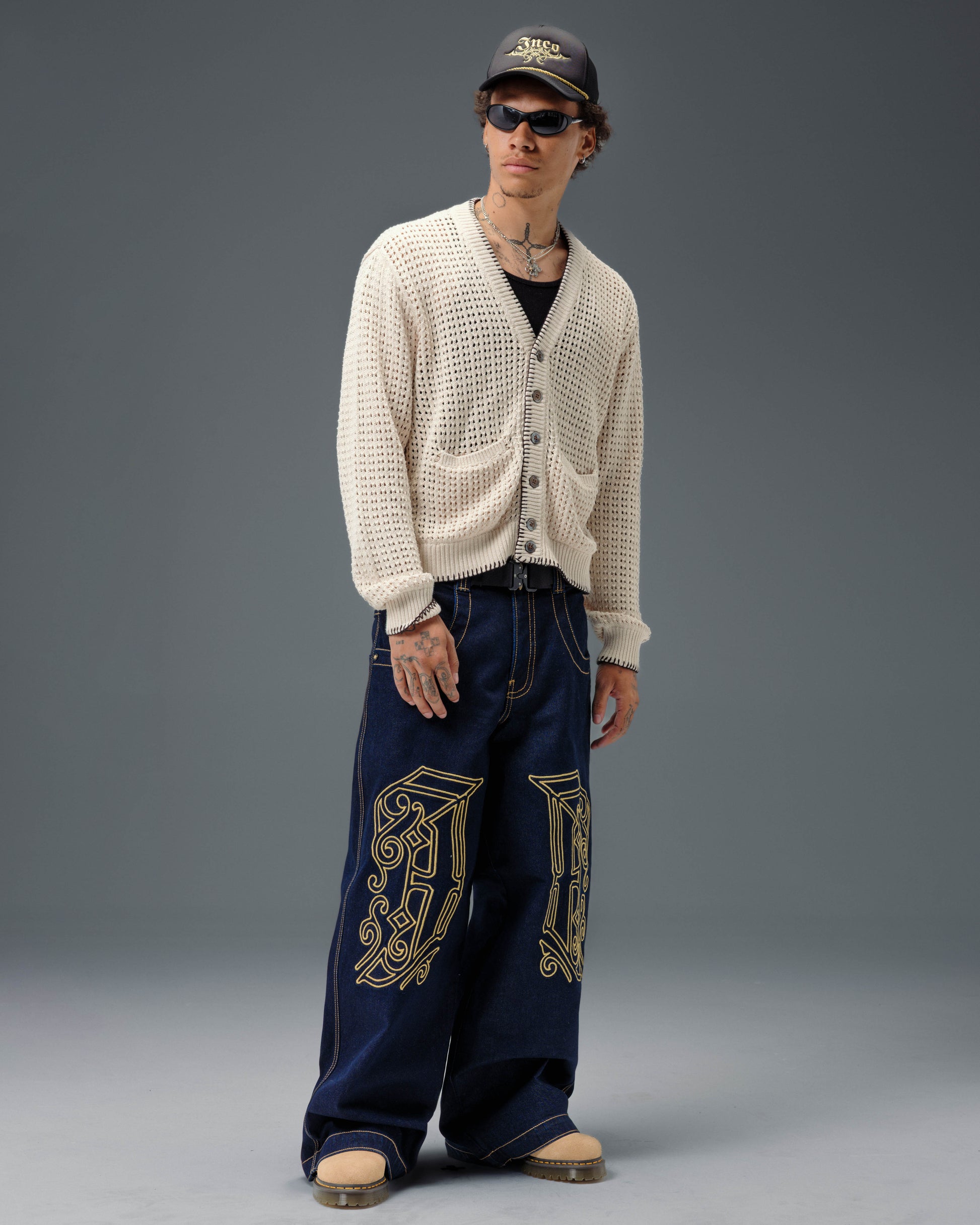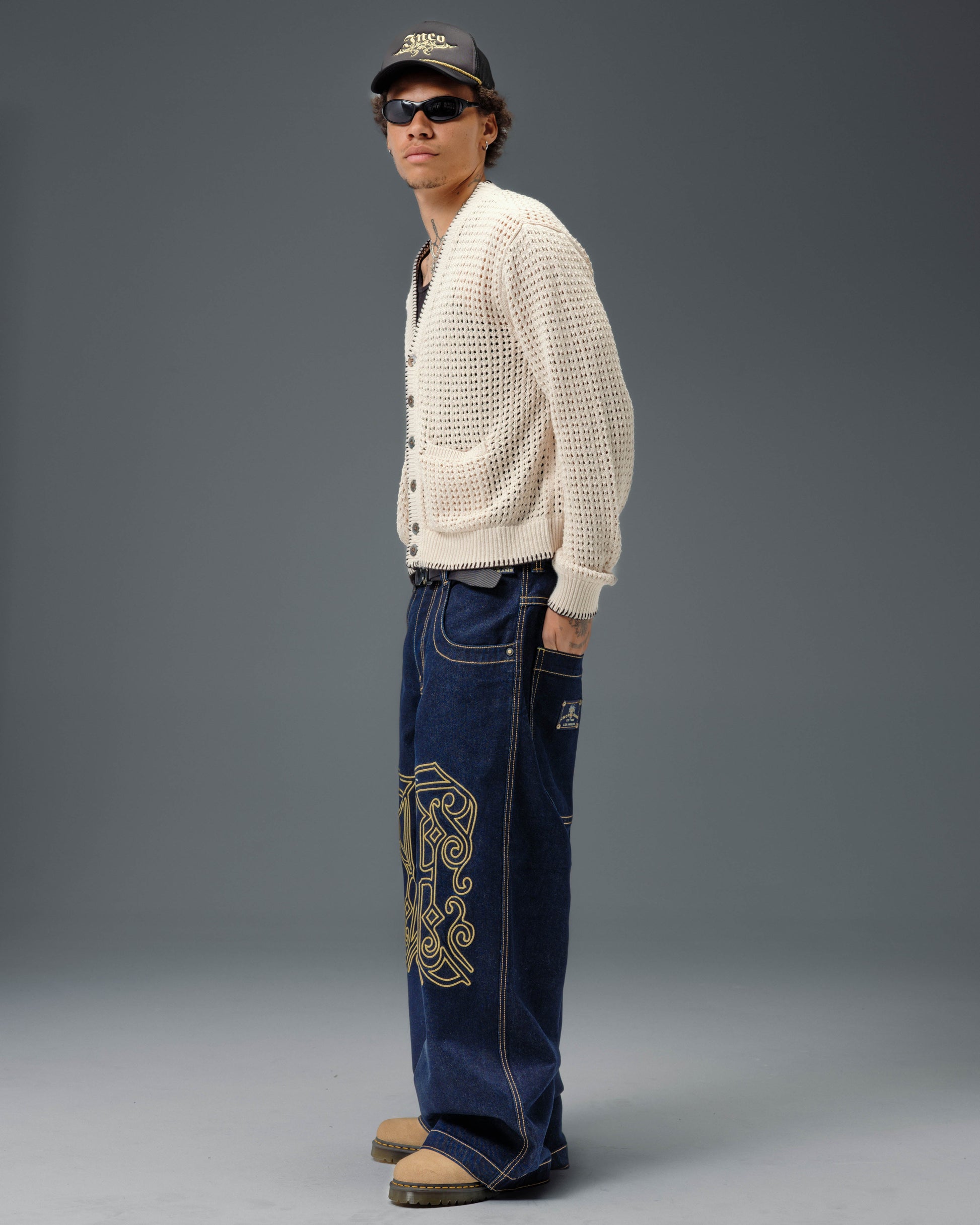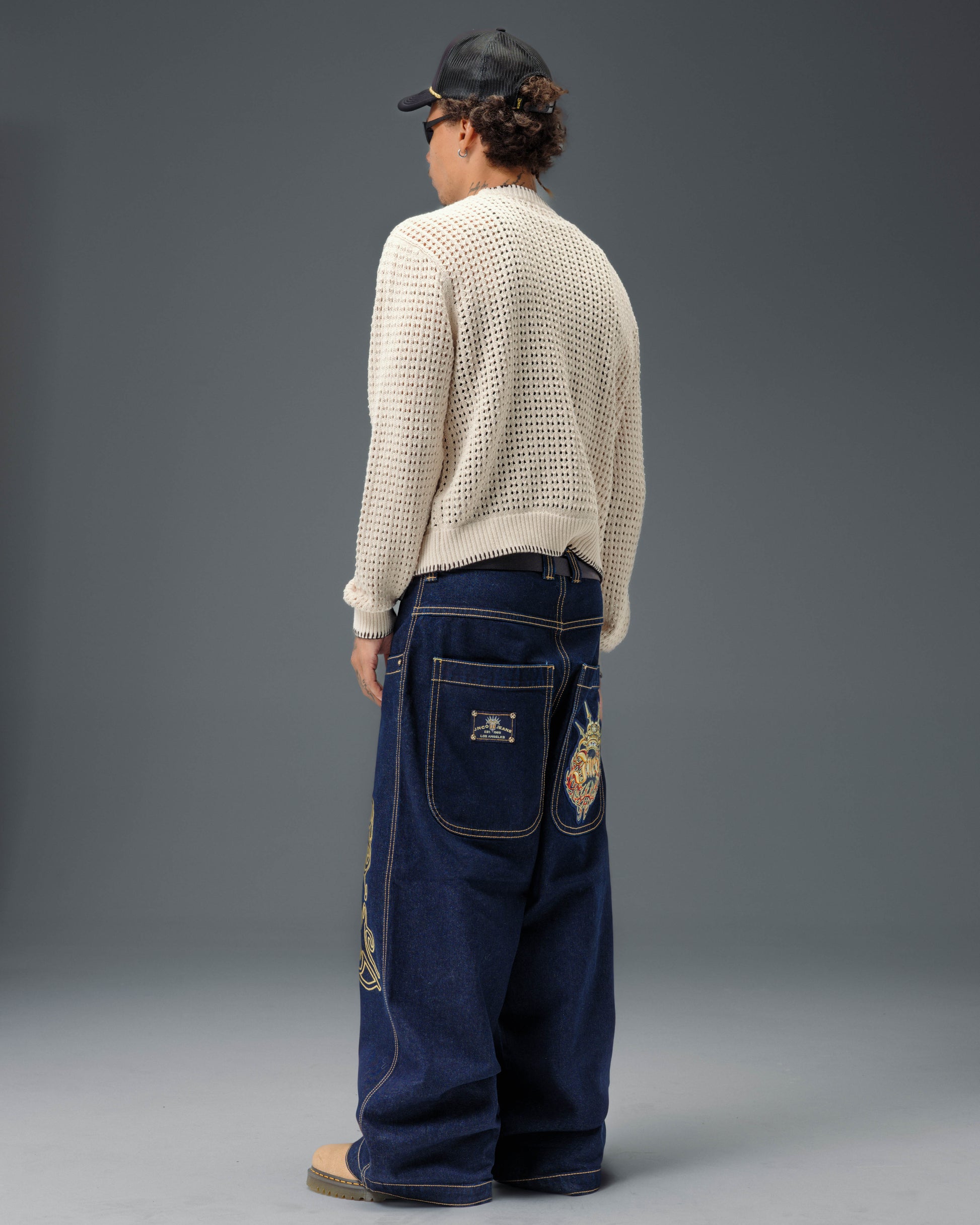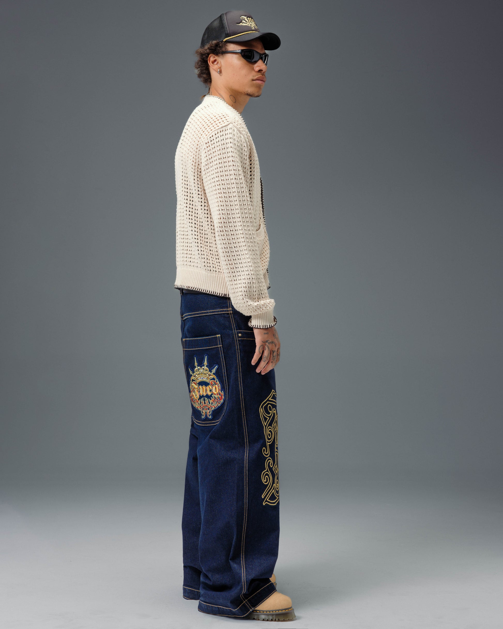 A fusion of JNCO’s Twin Cannons and Royals. Deep indigo with resin treatment, semi-rigid feel. 26" bottom opening with original contrast stitching. Features wide double topstitching, Royal embroidery patch (80,000 stitches), and exclusive “J” monogram (160,000 metallic gold stitches). Custom rivets and collectible flasher included.
