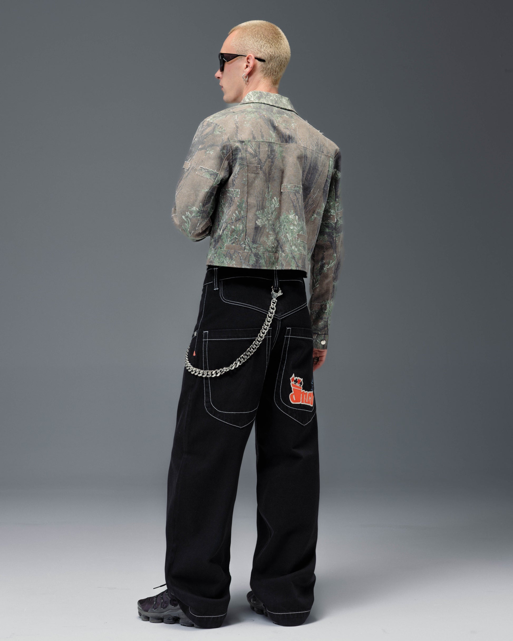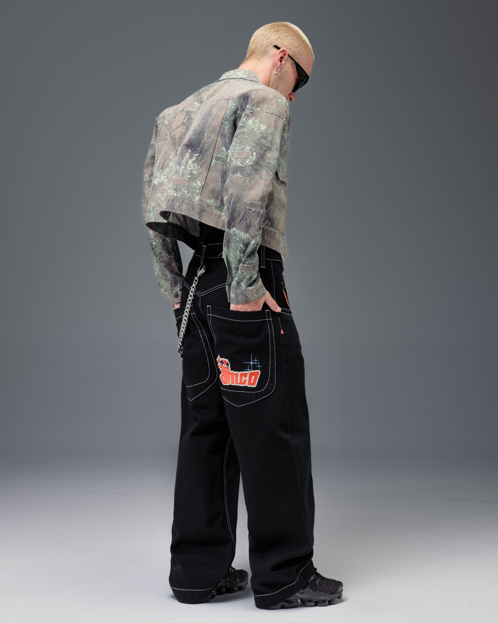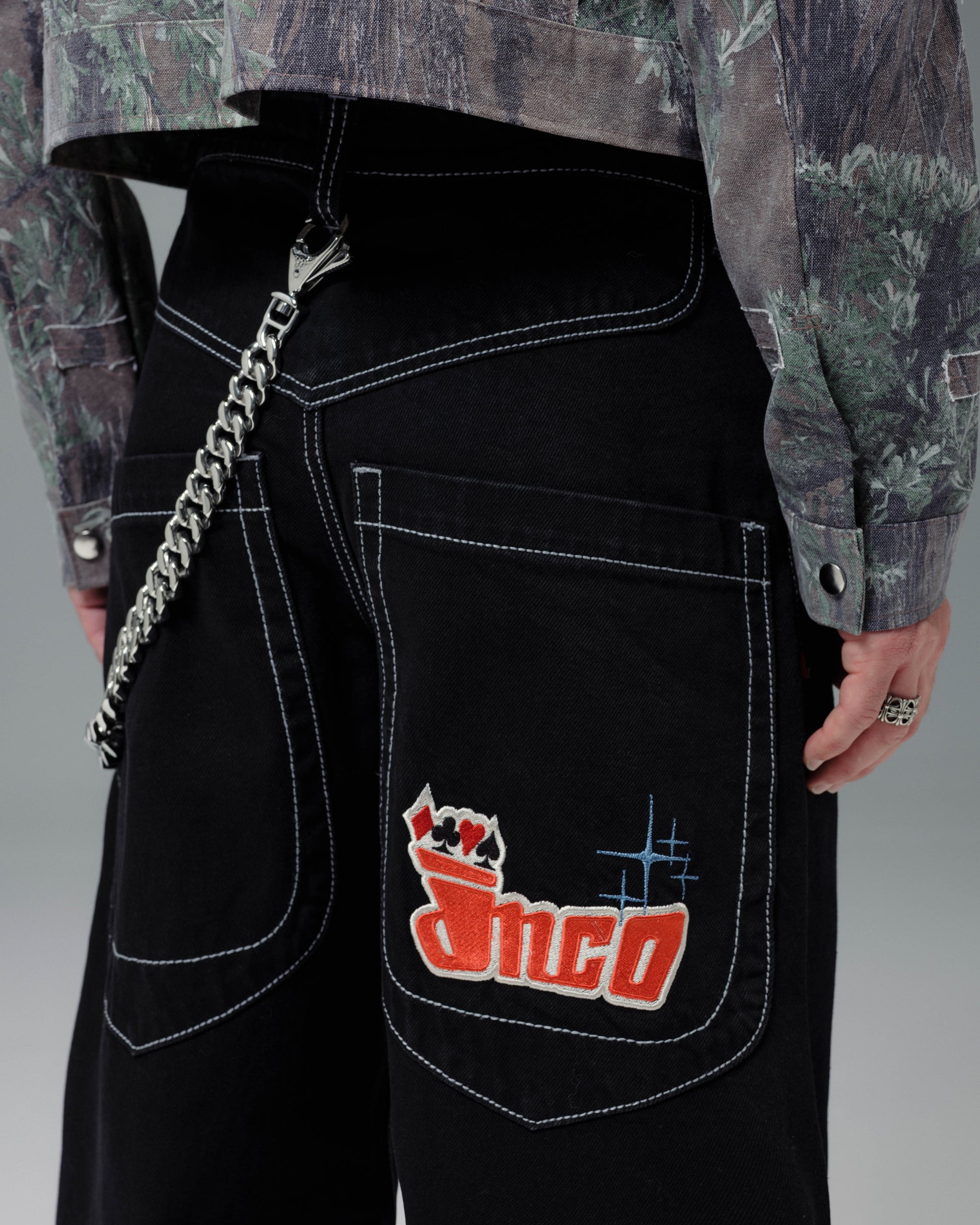 A revamped take on the original Low Down in premium Jet Black denim. 13oz 100% cotton rope-dyed denim, finished with a blended starch wax for a smooth, luxurious feel. 20" bottom opening with contrast stitching, double chain stitch detailing at the waistband and hem. Features the new JNCO Deck embroidery inspired by the four card suits, and custom buttons and rivets. Collectible new edition flasher included.