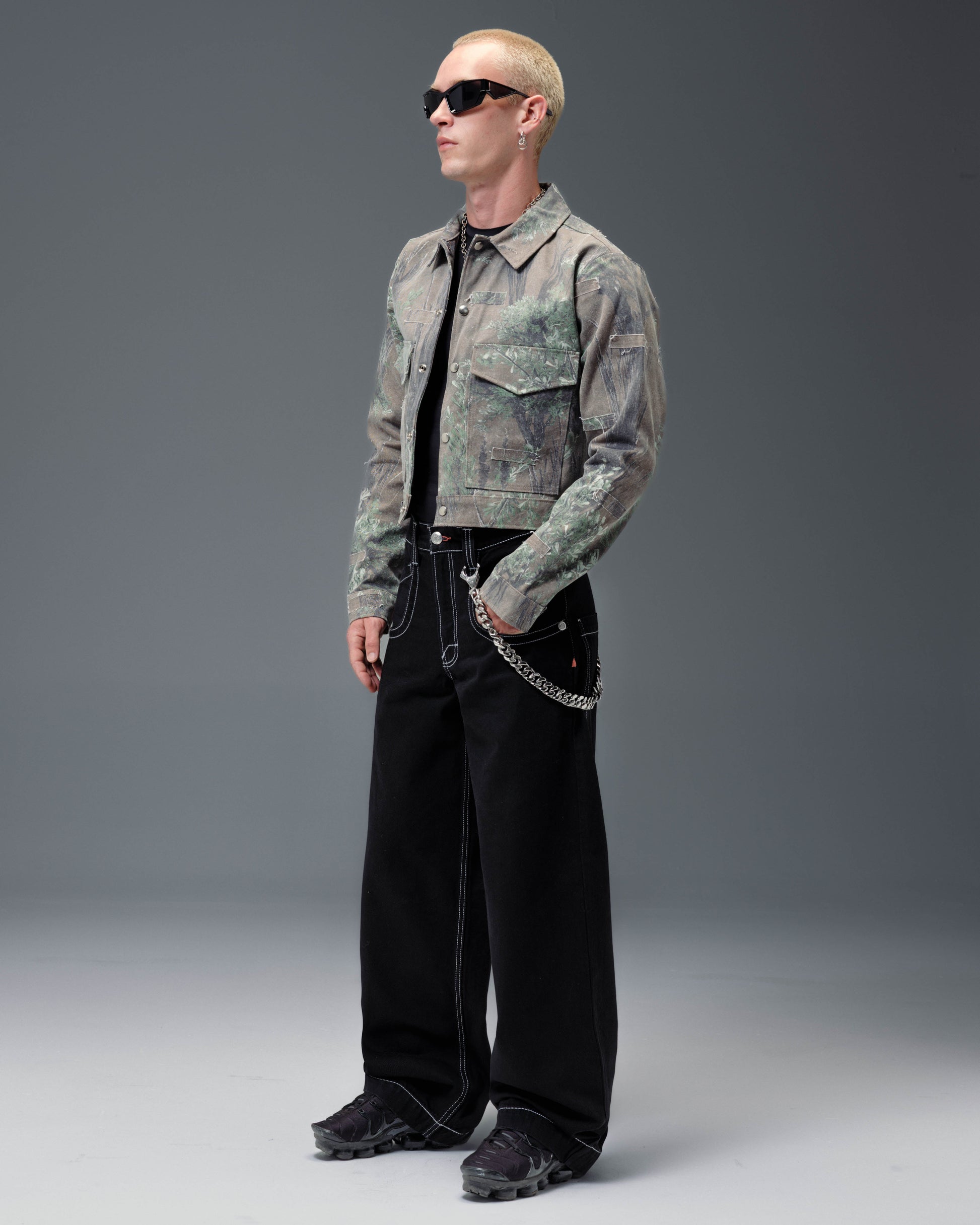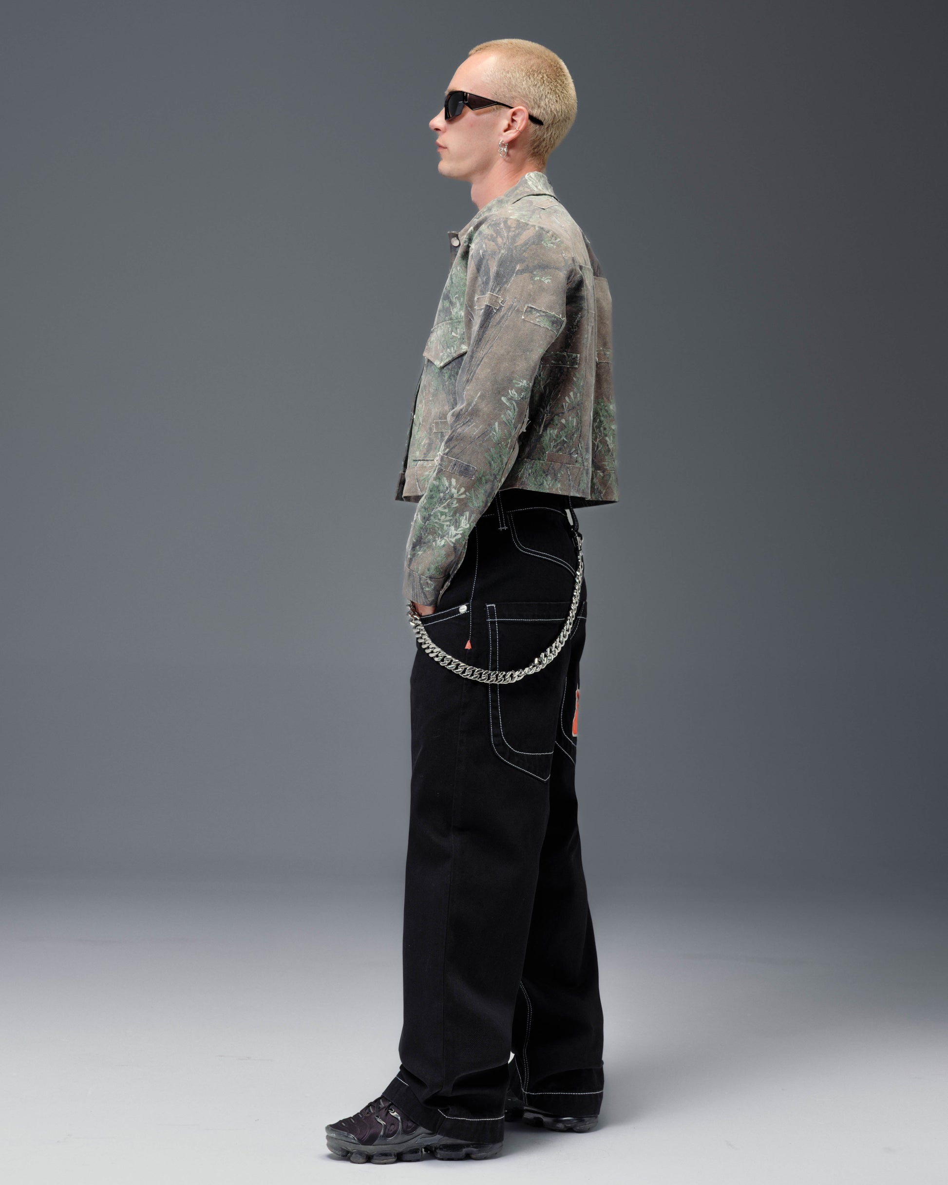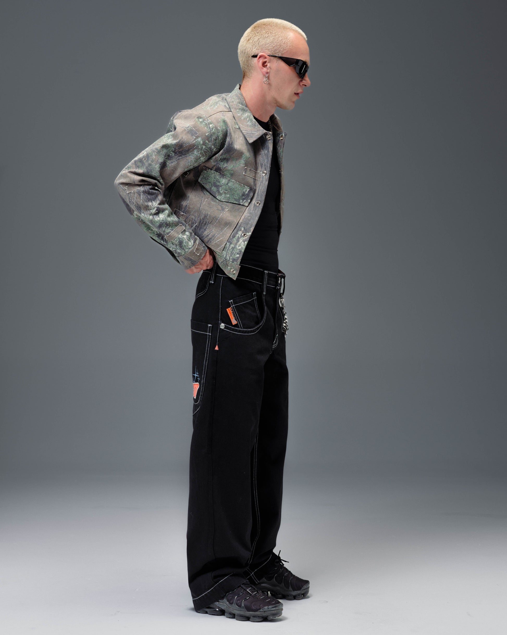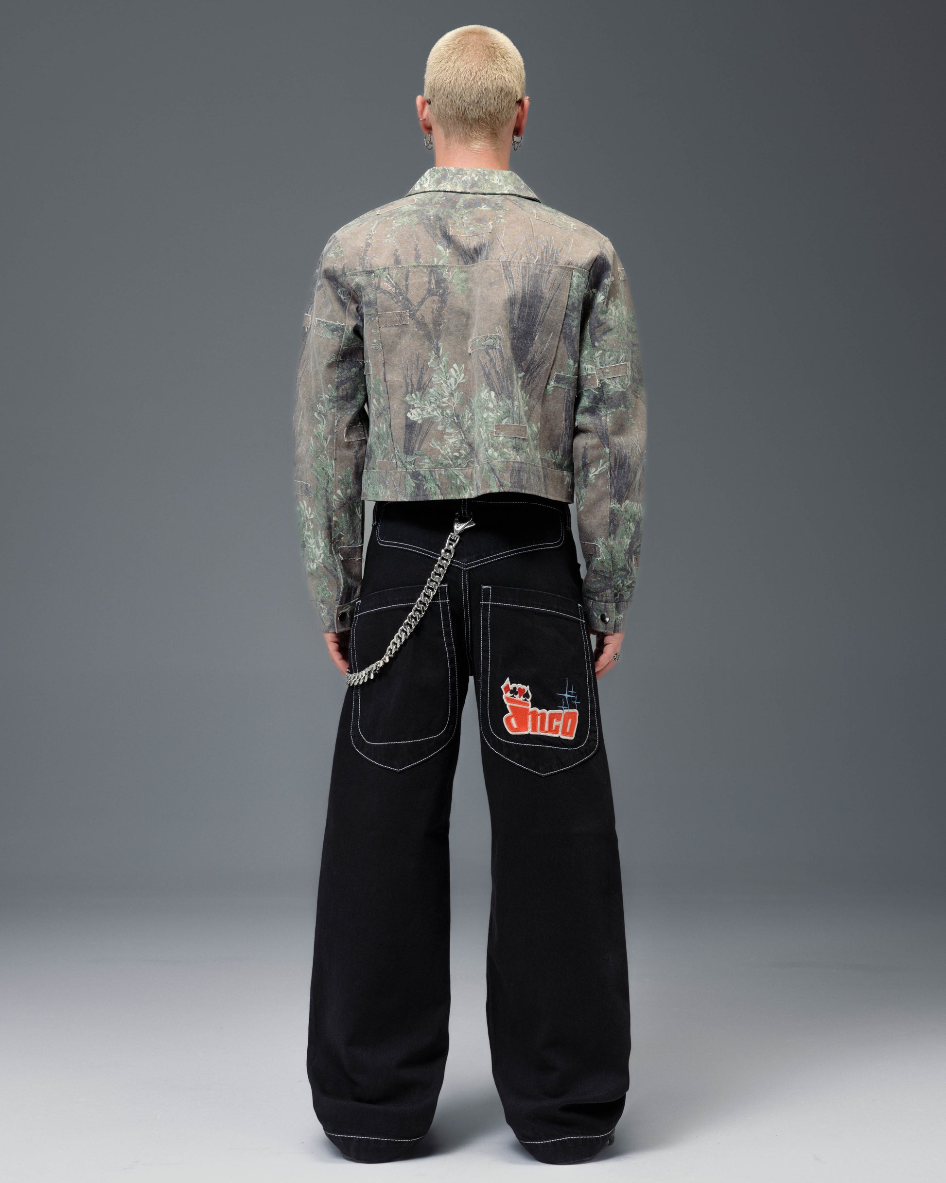 A revamped take on the original Low Down in premium Jet Black denim. 13oz 100% cotton rope-dyed denim, finished with a blended starch wax for a smooth, luxurious feel. 20" bottom opening with contrast stitching, double chain stitch detailing at the waistband and hem. Features the new JNCO Deck embroidery inspired by the four card suits, and custom buttons and rivets. Collectible new edition flasher included.