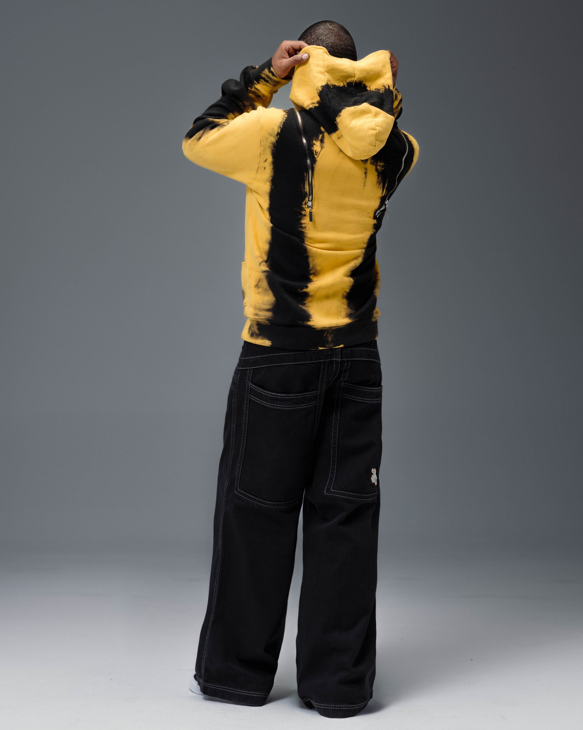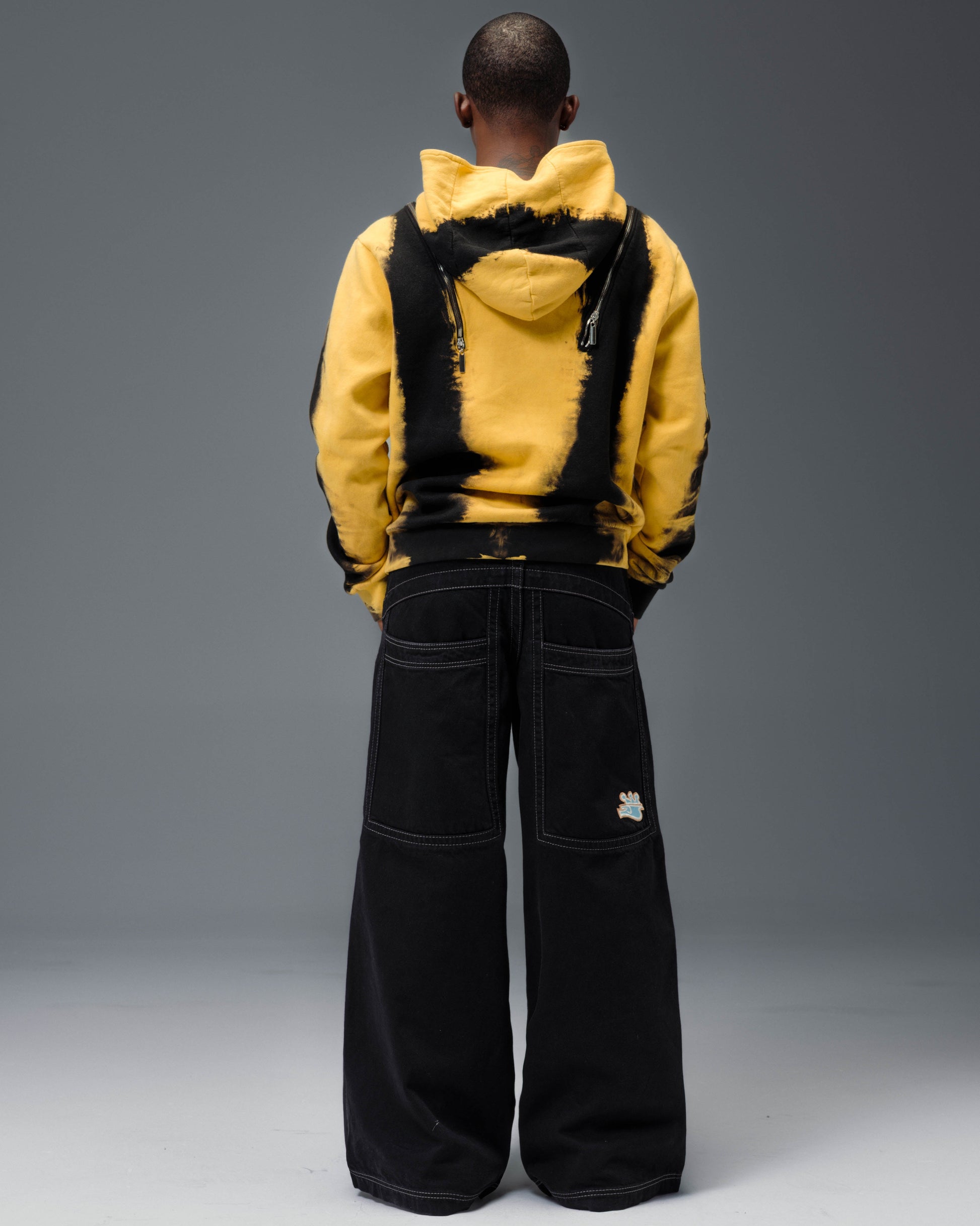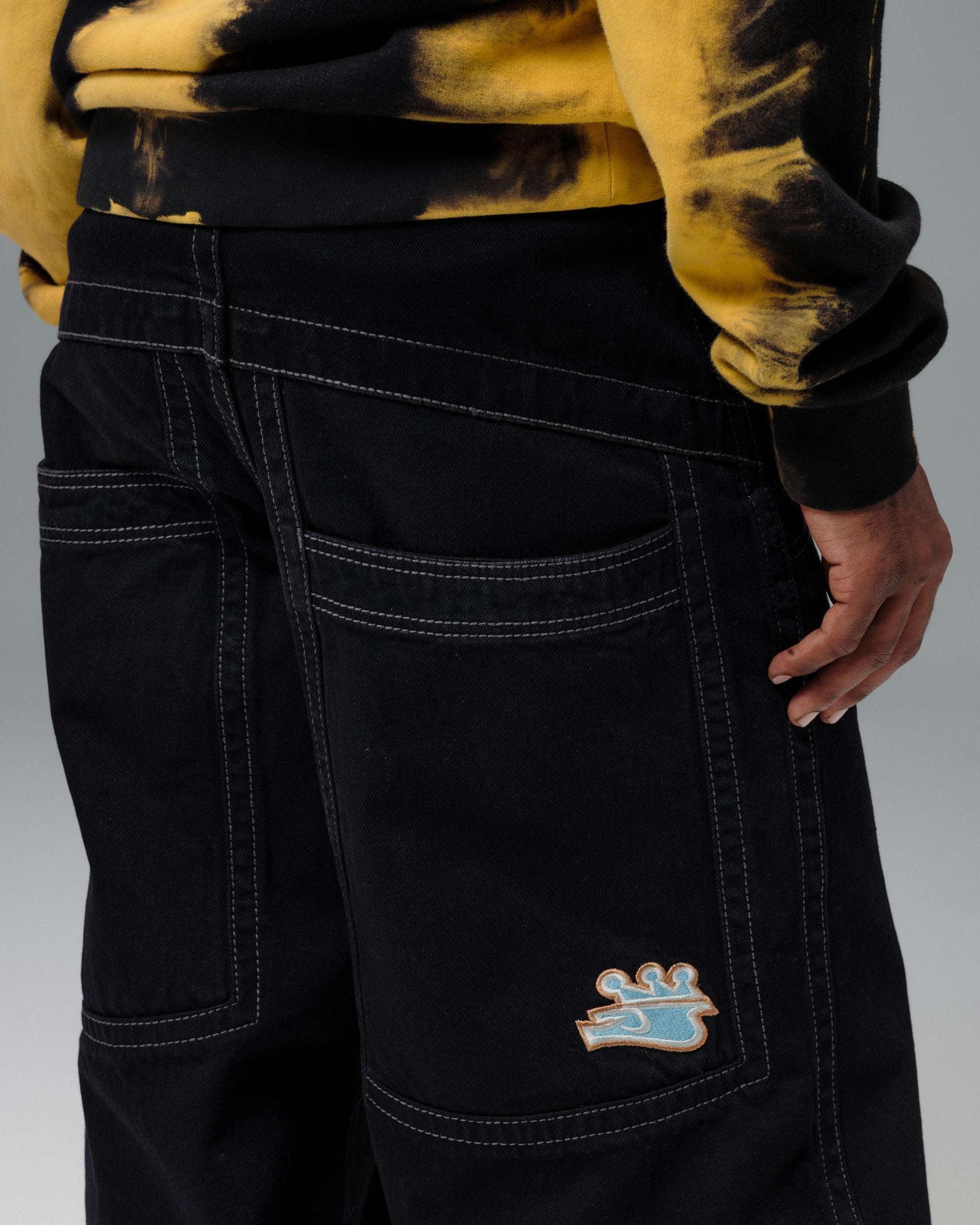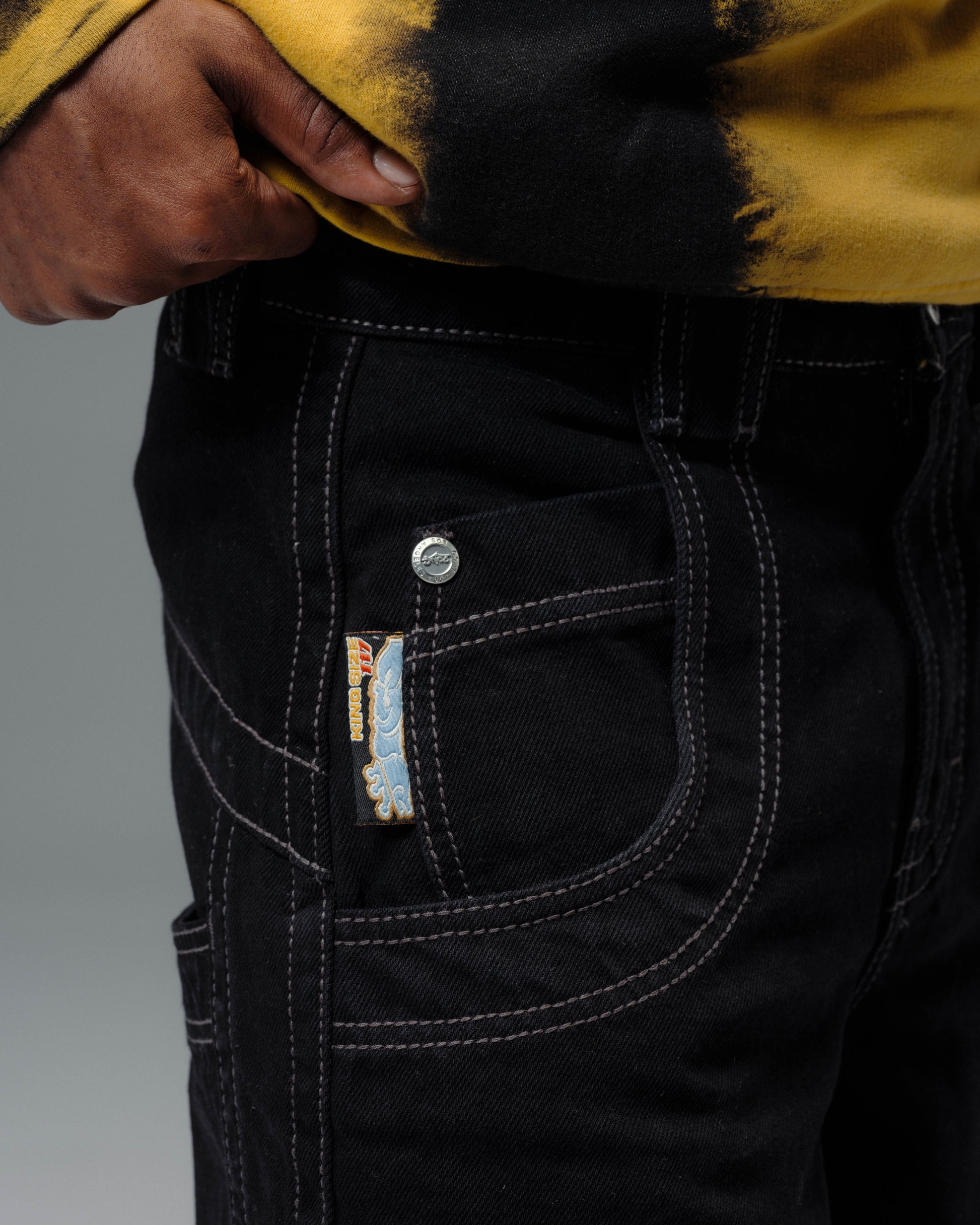Classic 28" bottom opening in Jet Black denim. 13oz rope-dyed 100% cotton with a luxe starch wax finish. Heavy double contrast stitching throughout. Features “Royal J” embroidery on back pocket and “Royal JNCO” on front leg. Includes collectible flasher. Limited Edition – limited stock.