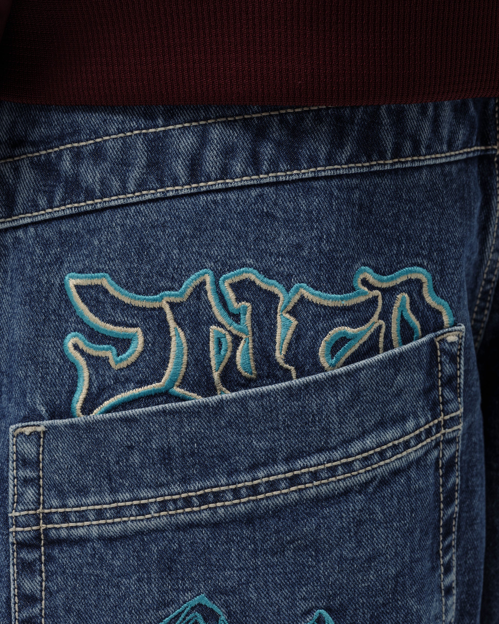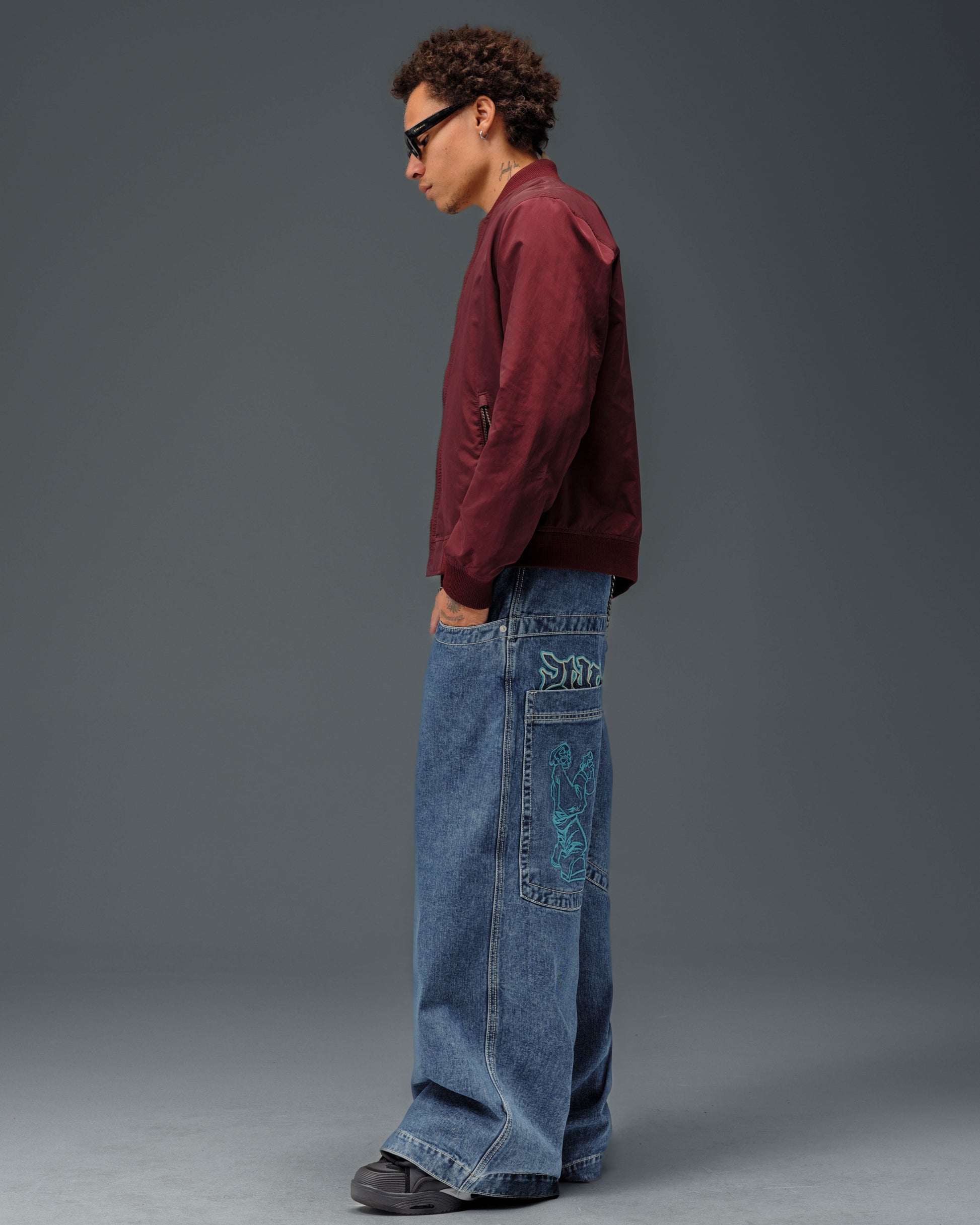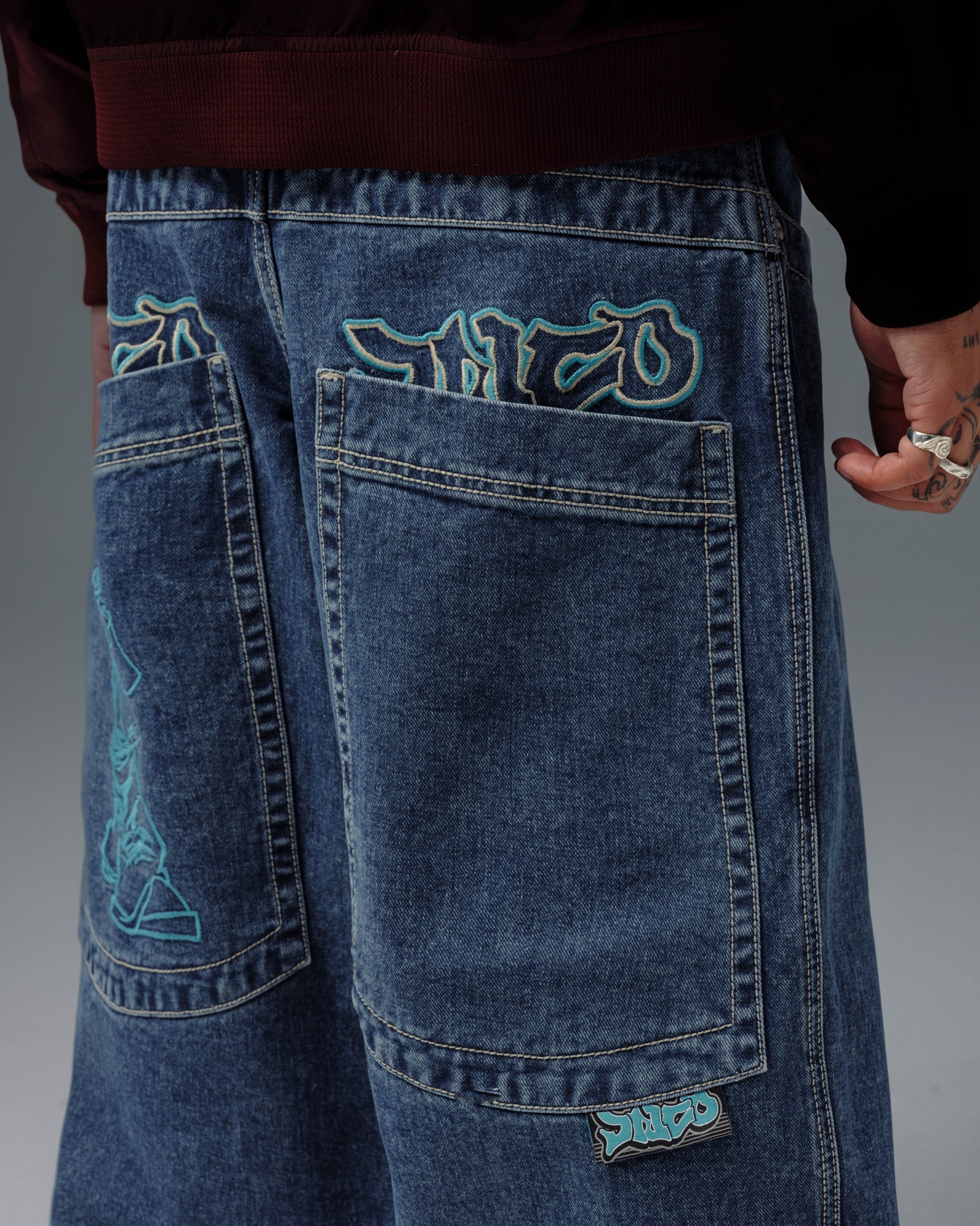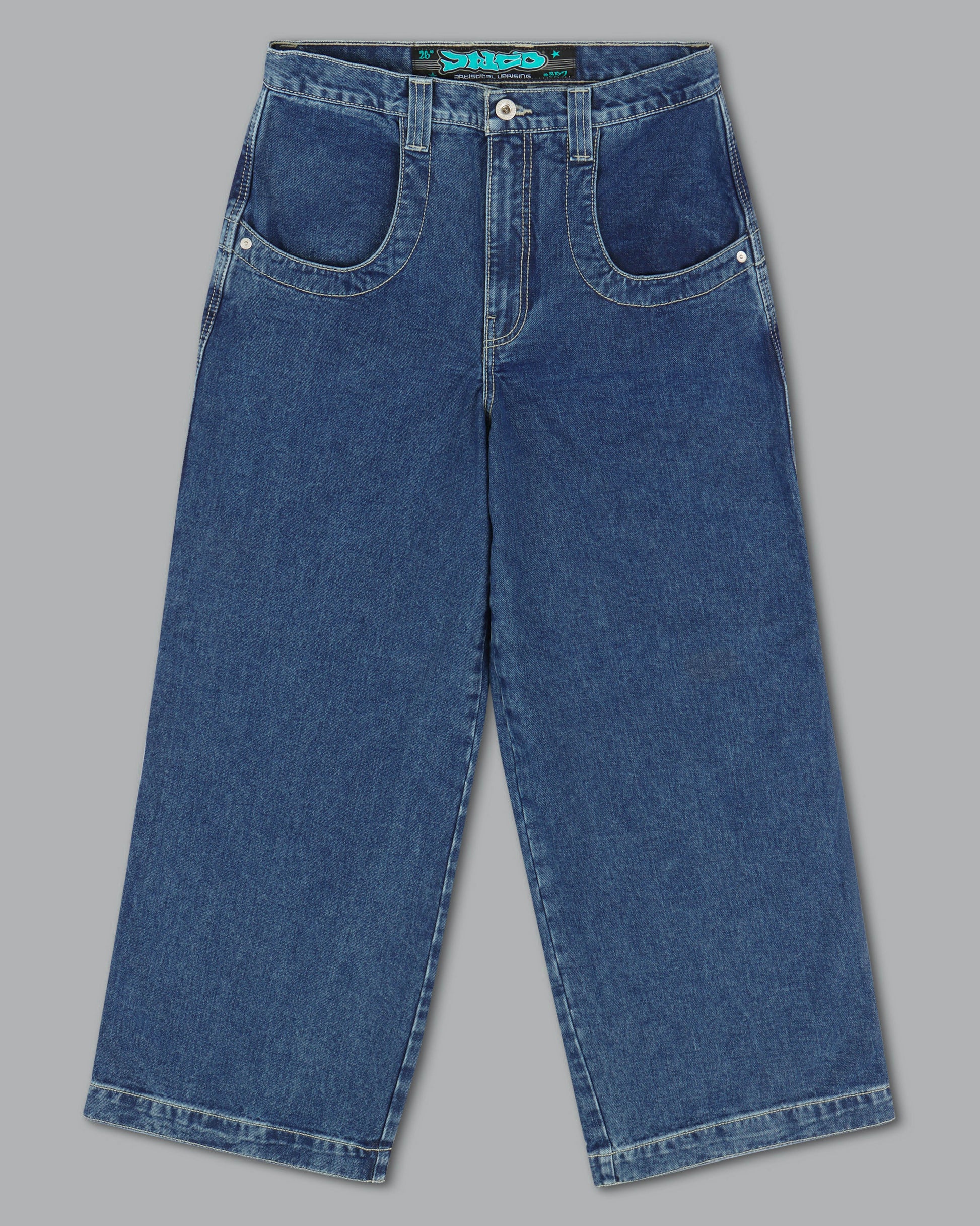 Collector’s item from the original JNCO Roots line. Dark Stone Wash, 26" bottom opening. 14oz 100% cotton denim with heavy double contrast stitching. JNCO logo embroidery above both back pockets with "tagger" embroidery below. Original labels, metallic Artistical Uprising flasher included. Limited Edition – very limited stock.