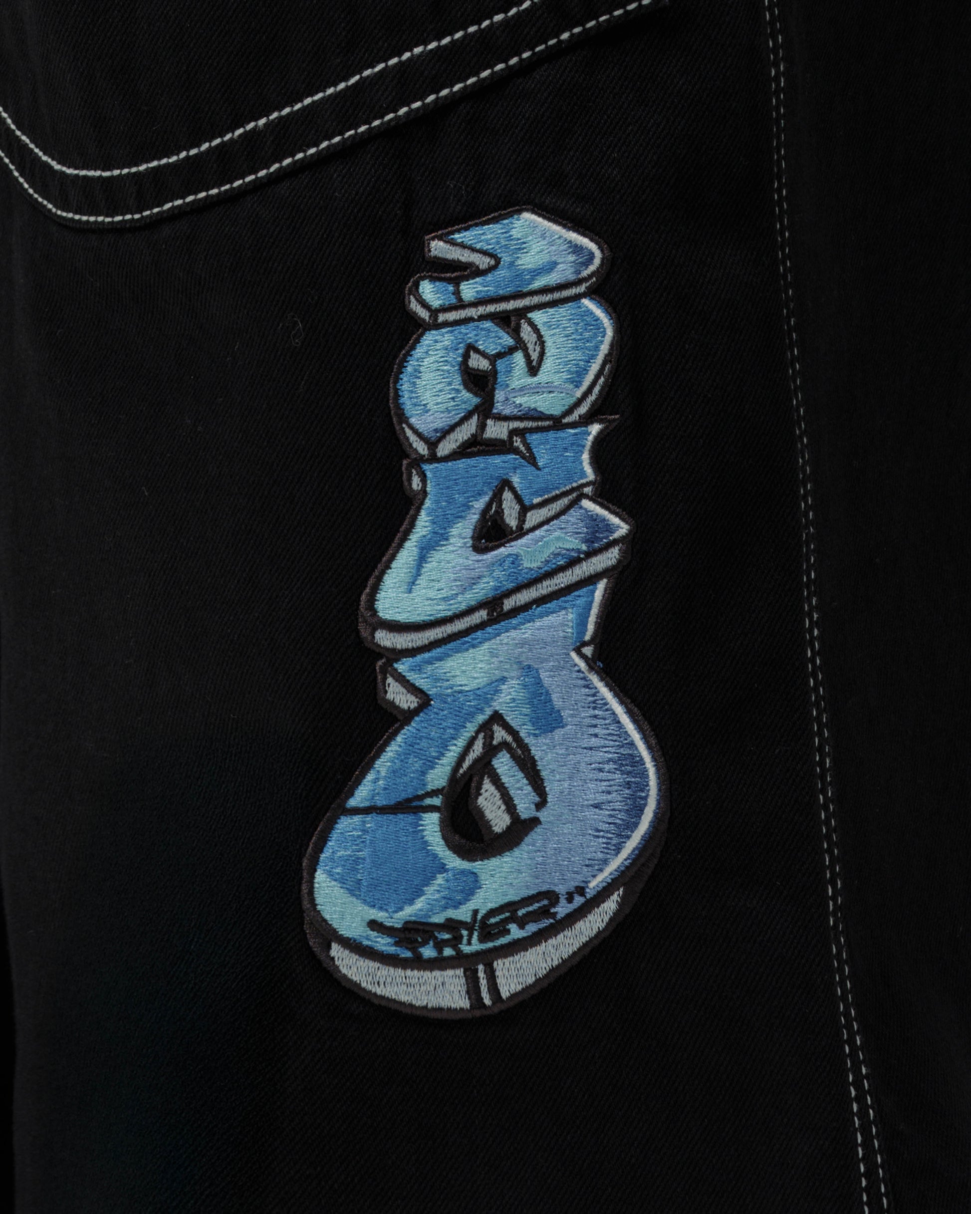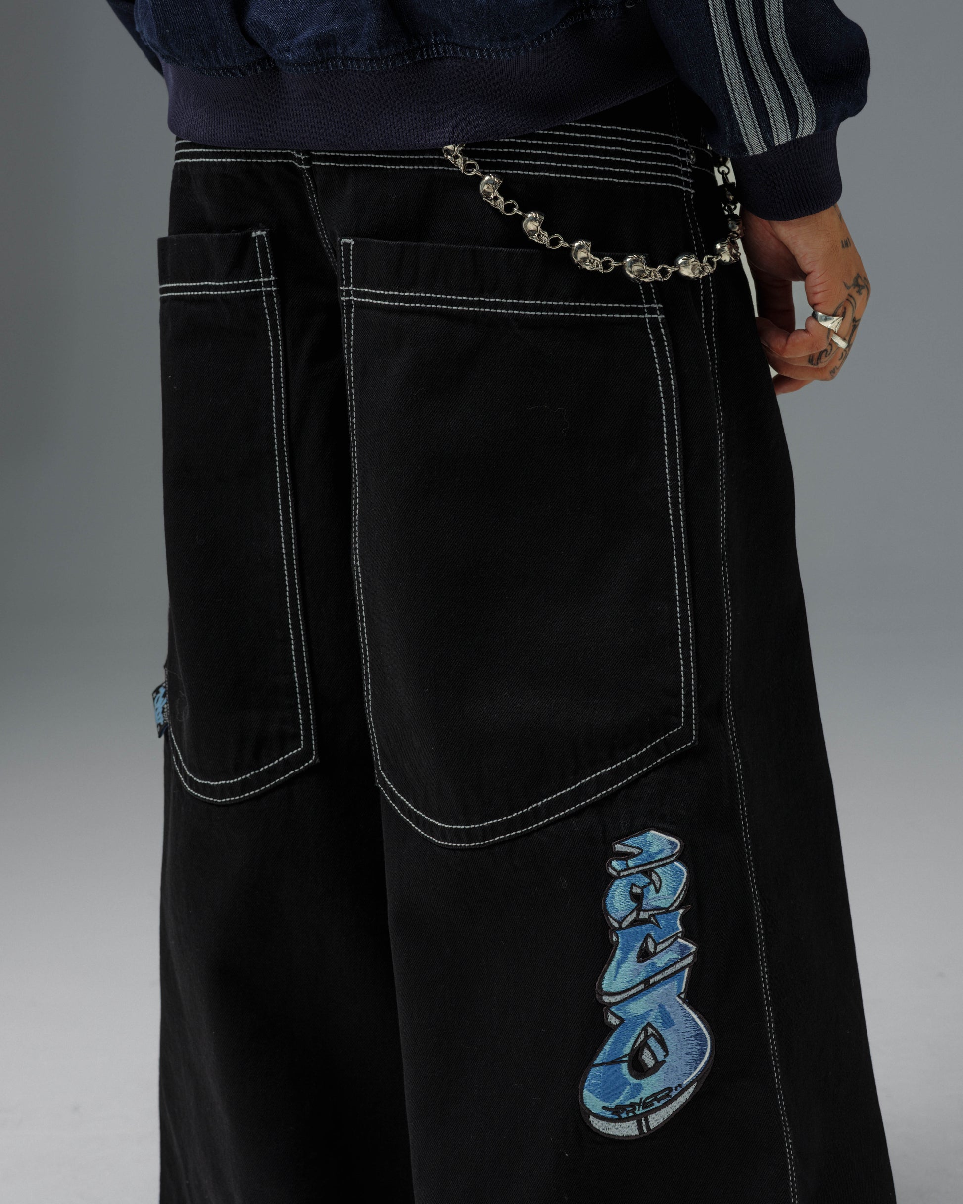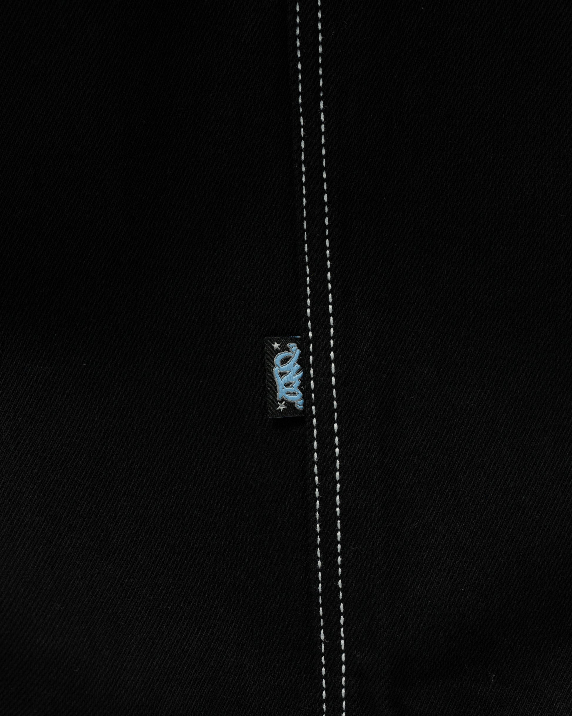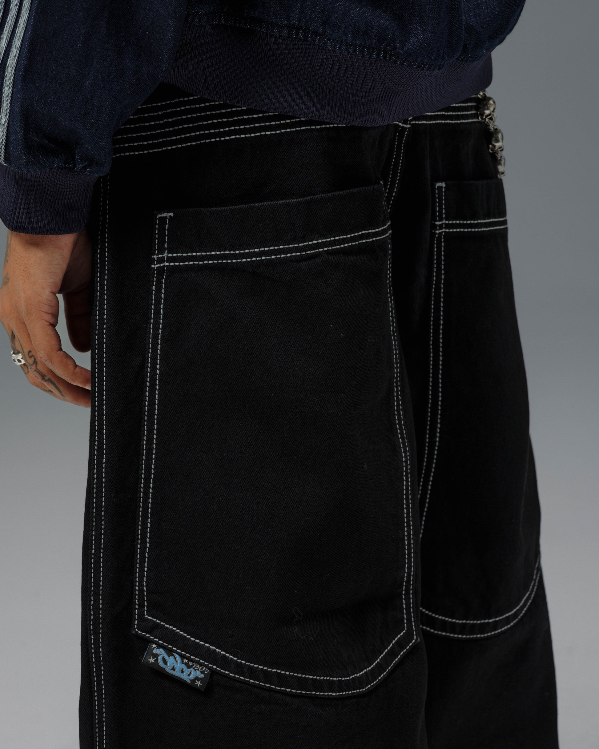 Collector’s item from the original JNCO “Roots” line. Jet Black denim, 30" bottom opening. 13oz rope-dyed 100% cotton with a luxe starch wax finish. Heavy contrast stitching and six rows of double back yoke seams. Back leg logo embroidery with over 50,000 stitches, signed by the original graffiti artist. Original labels, collectible flasher, and JNCO Roots stickers. Limited Edition – very limited stock.