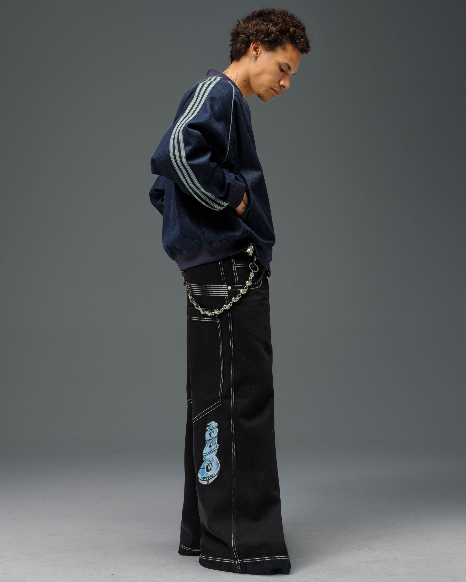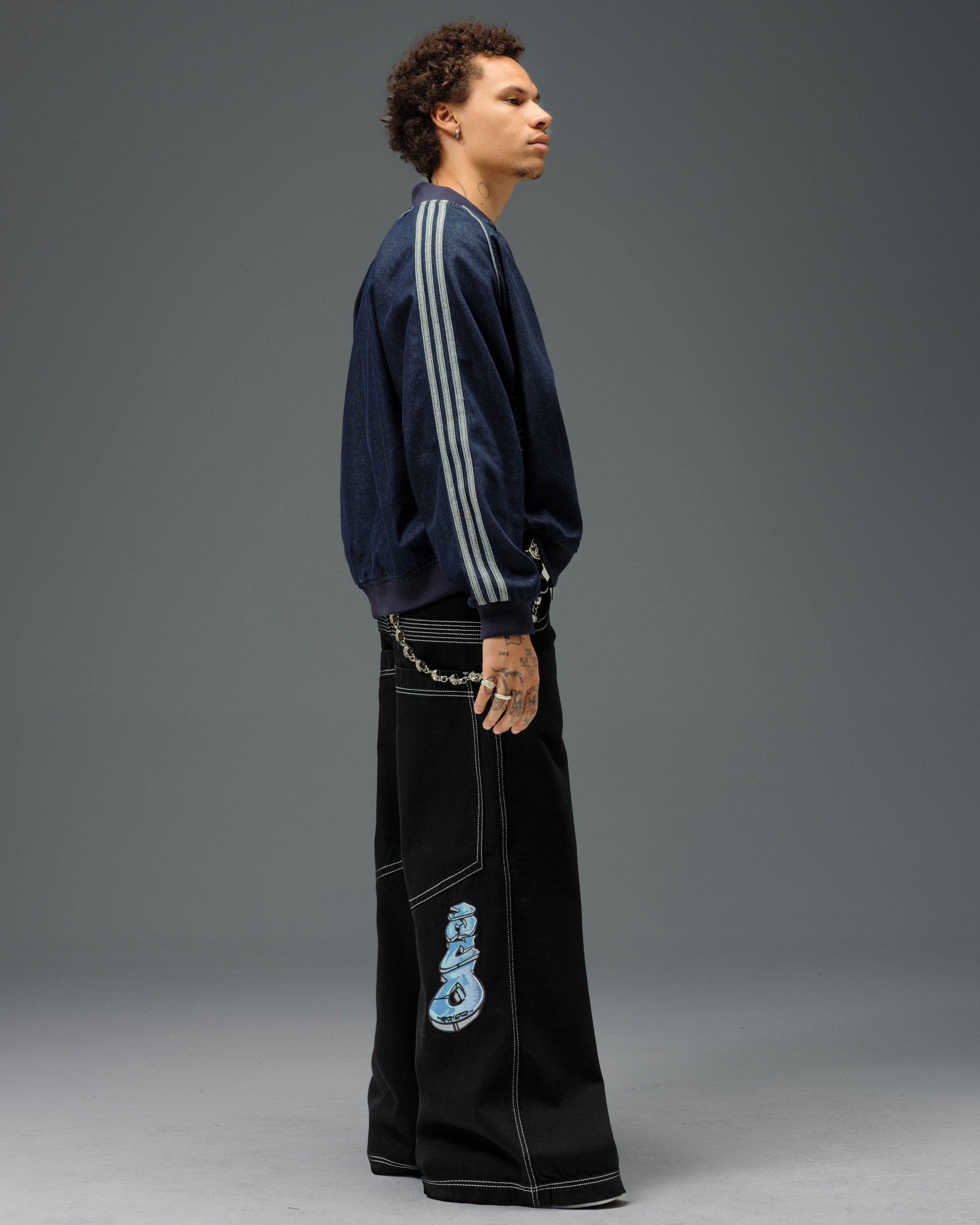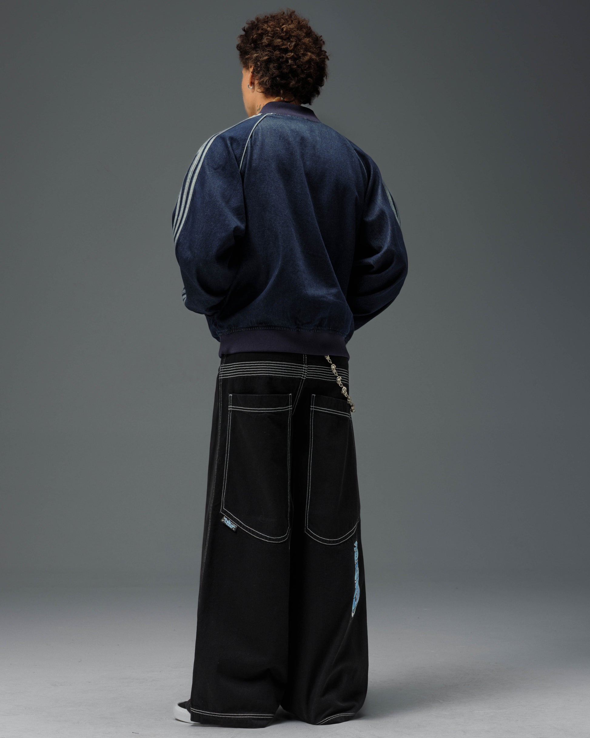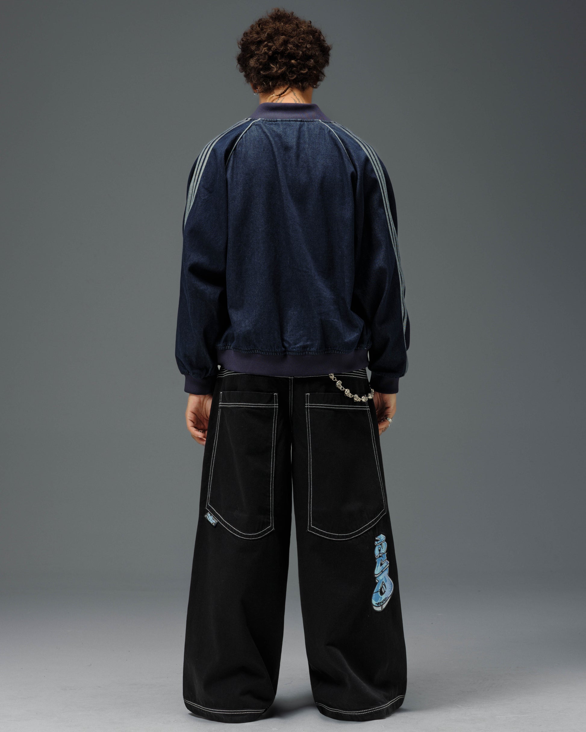 Collector’s item from the original JNCO “Roots” line. Jet Black denim, 30" bottom opening. 13oz rope-dyed 100% cotton with a luxe starch wax finish. Heavy contrast stitching and six rows of double back yoke seams. Back leg logo embroidery with over 50,000 stitches, signed by the original graffiti artist. Original labels, collectible flasher, and JNCO Roots stickers. Limited Edition – very limited stock.