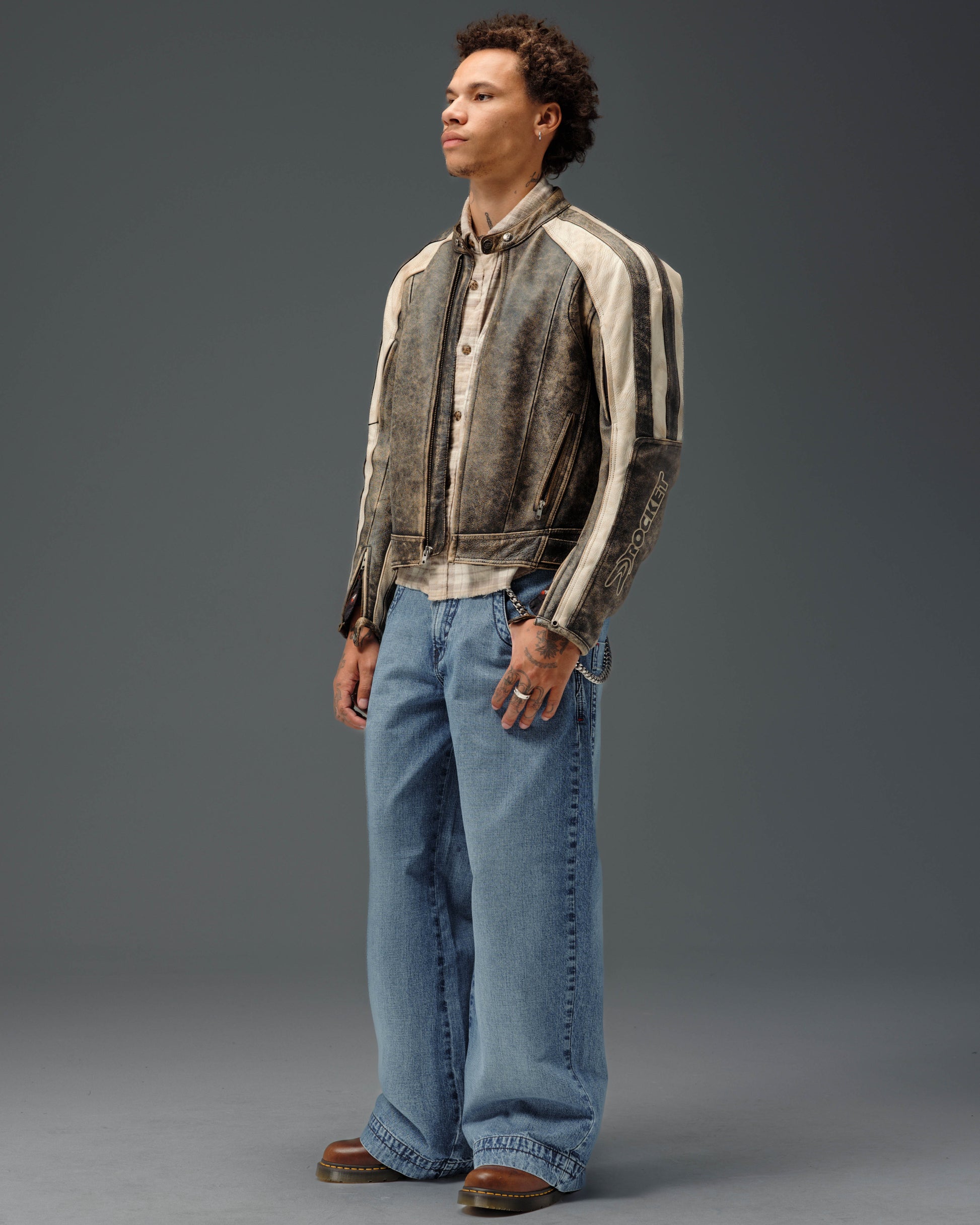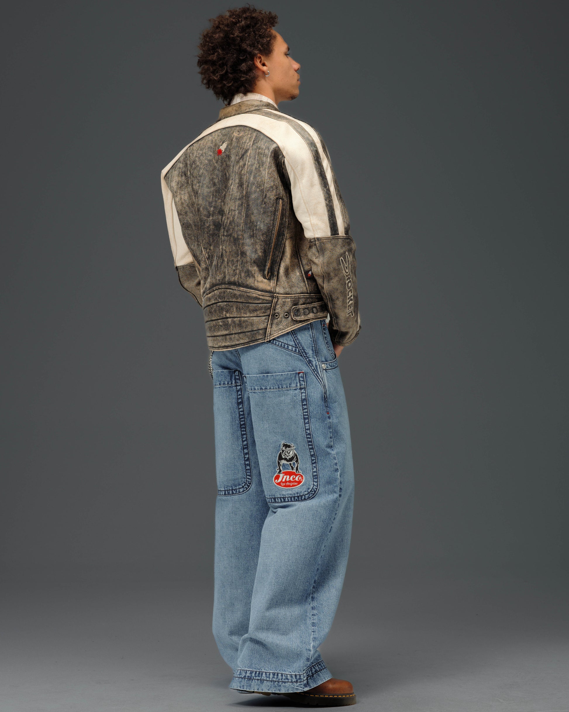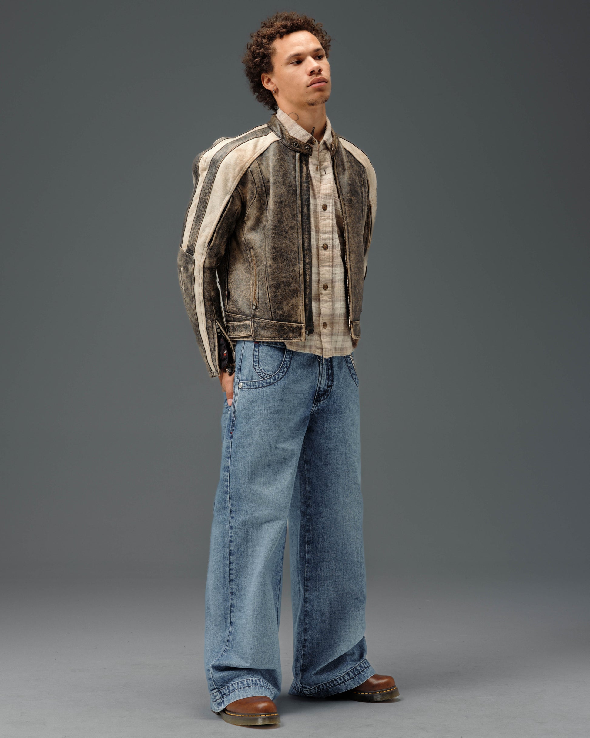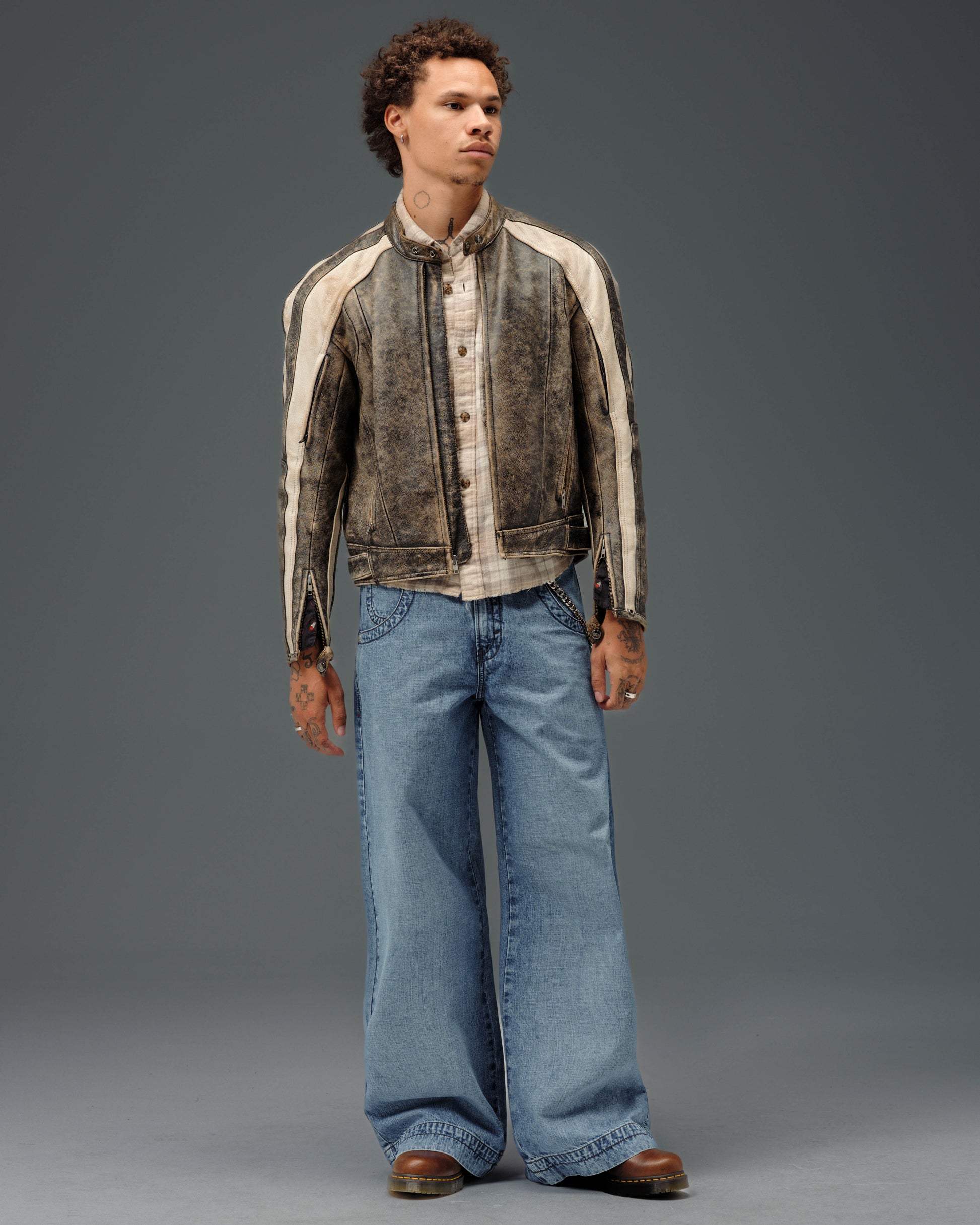 Original collector’s piece in Hand-Sand Medium Vintage Wash. 12.5oz 100% cotton cross-hatch denim with 3x1 right-hand weave. 26" bottom opening with extra-long pockets. Features dense metallic silver and red bulldog embroidery, custom Big Rig hardware, and collectible flasher. Designed for the Load. Powered for the Pull. Limited Edition – very limited stock.