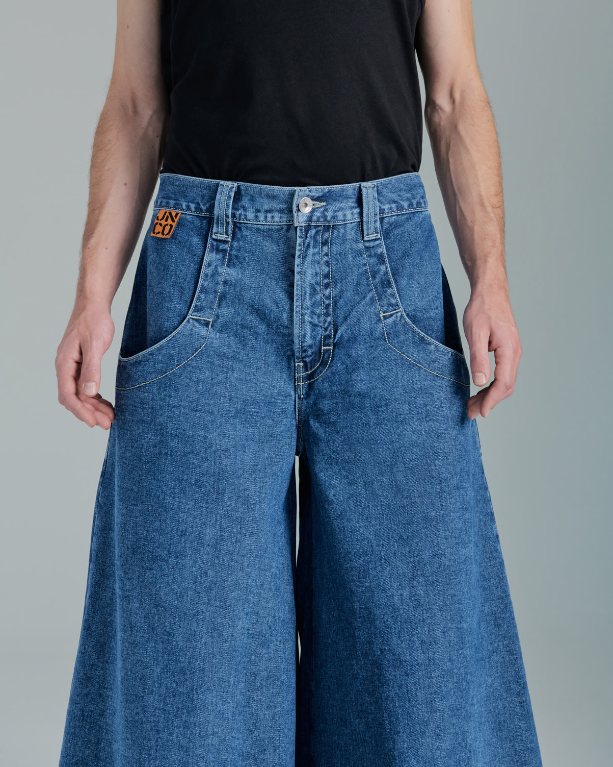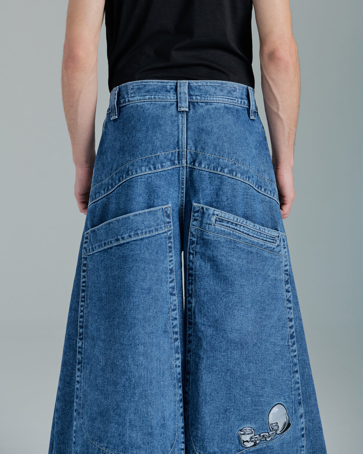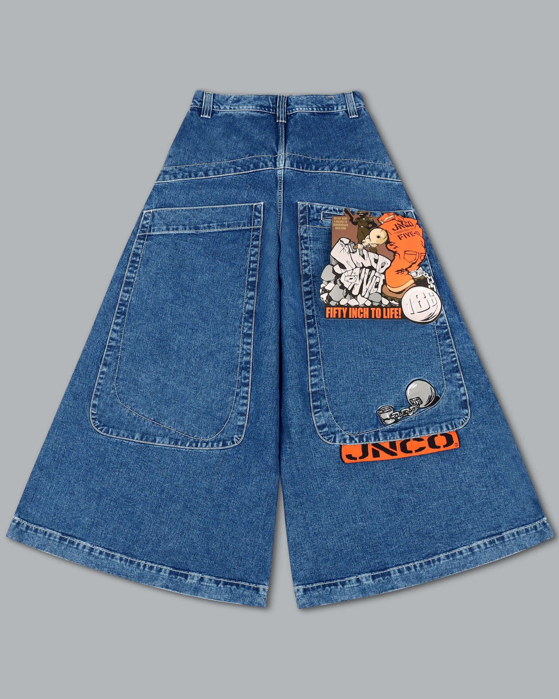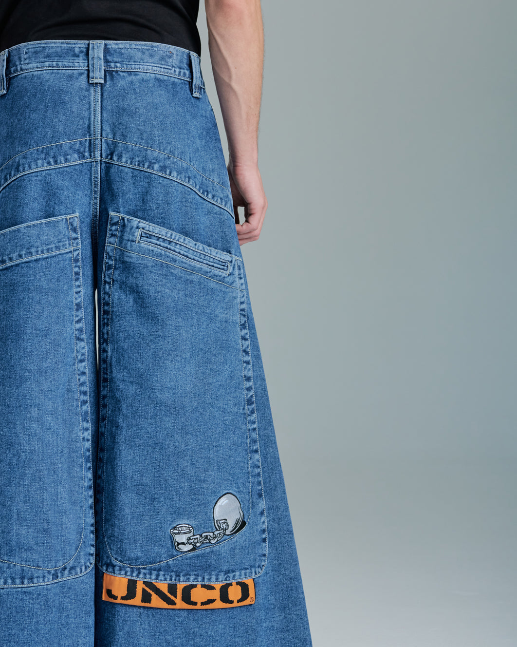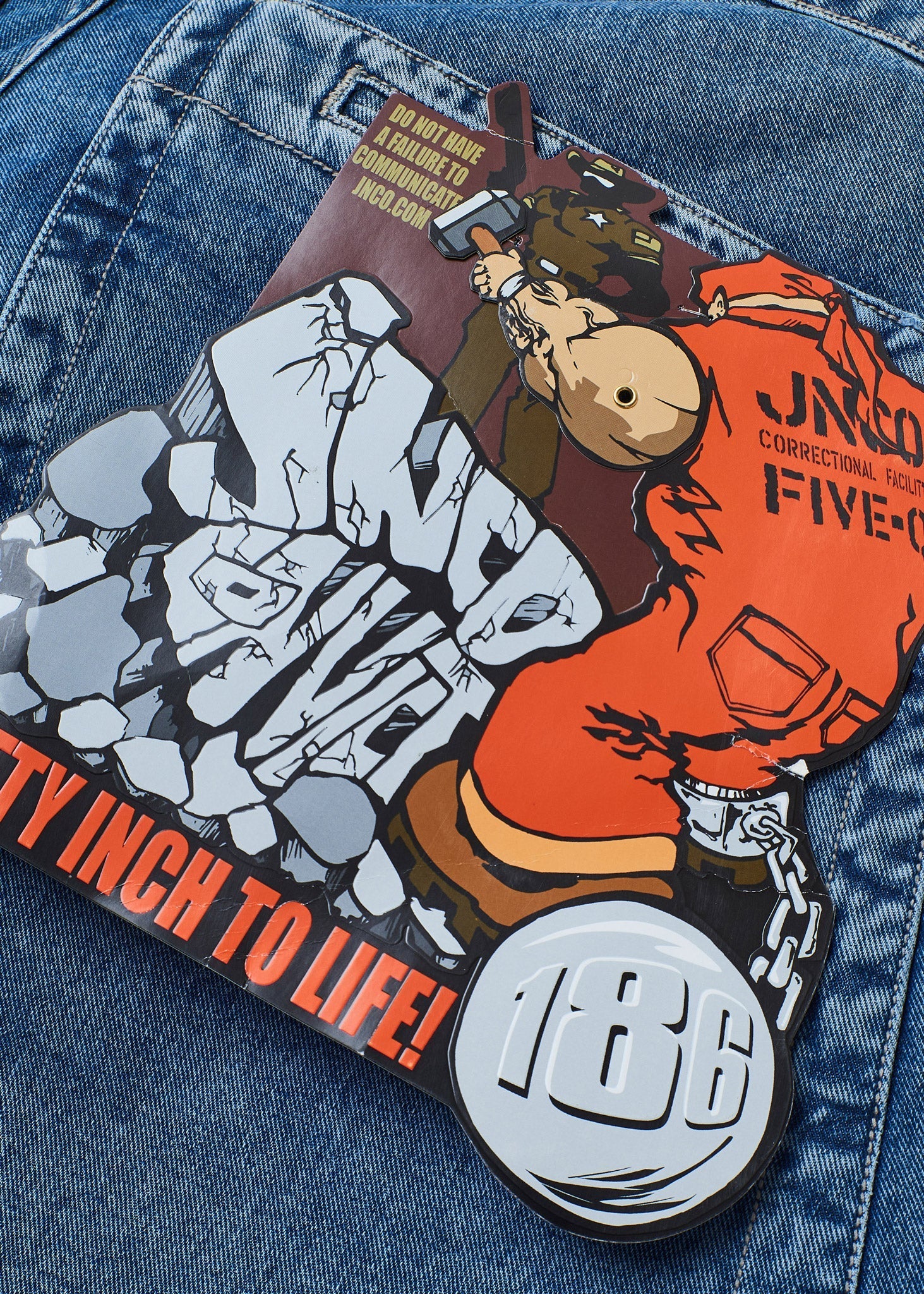 A collector’s item with a massive 50" bottom opening. Dark Stone Wash, 14 oz. 100% cotton, 3x1 left-hand weave. Back pocket features ball & chain embroidery with 28,388 stitches. Heavy thread and intricate details throughout. Collectible flasher with movable arm & hammer. Limited Edition – very limited stock.