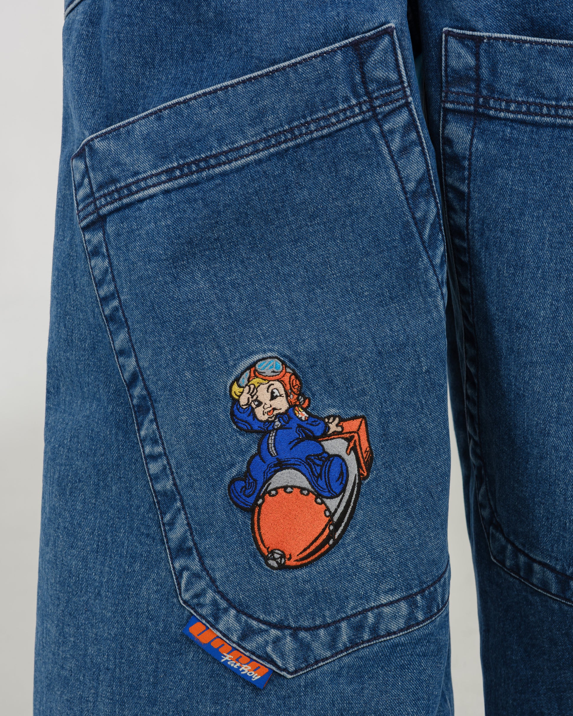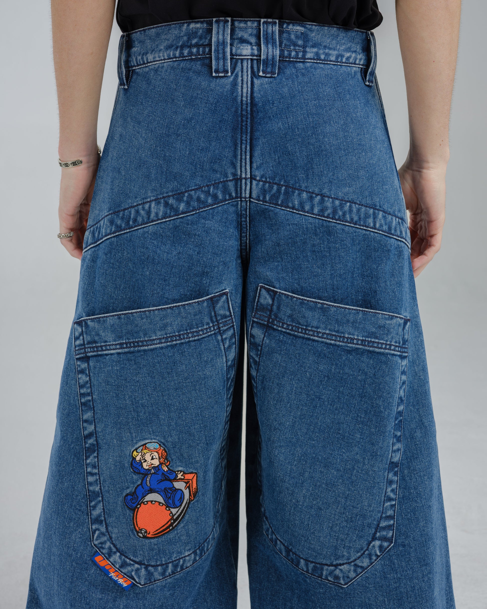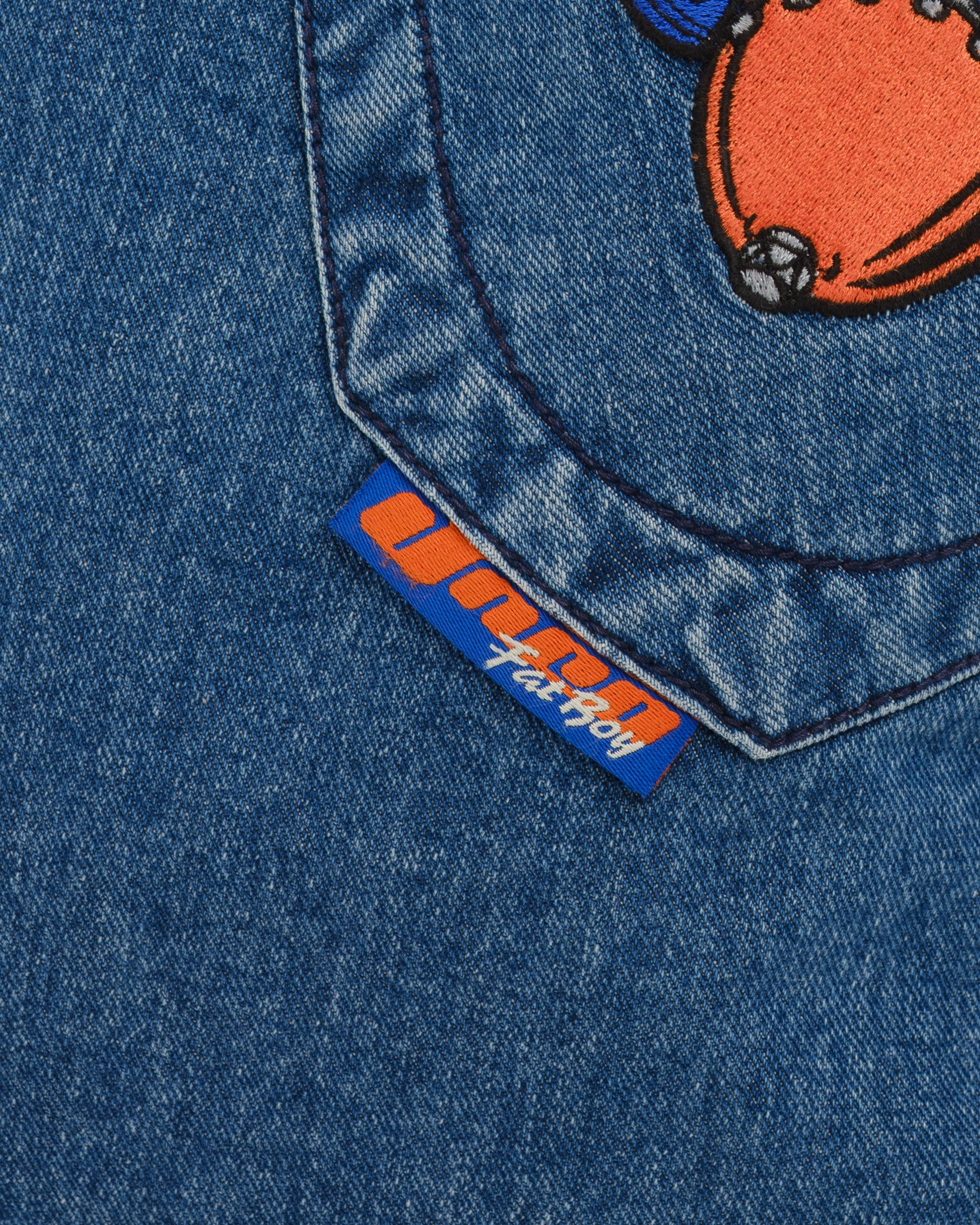 Collector classic — “The Mother of Em’ All.” Dark Stone Wash, 32" bottom opening. 14oz 100% cotton denim with heavy contrast double stitching. Includes original artwork, labels, and back pocket embroidery. Collectible Fat Boy Bacon flasher attached. Limited Edition – very limited stock.