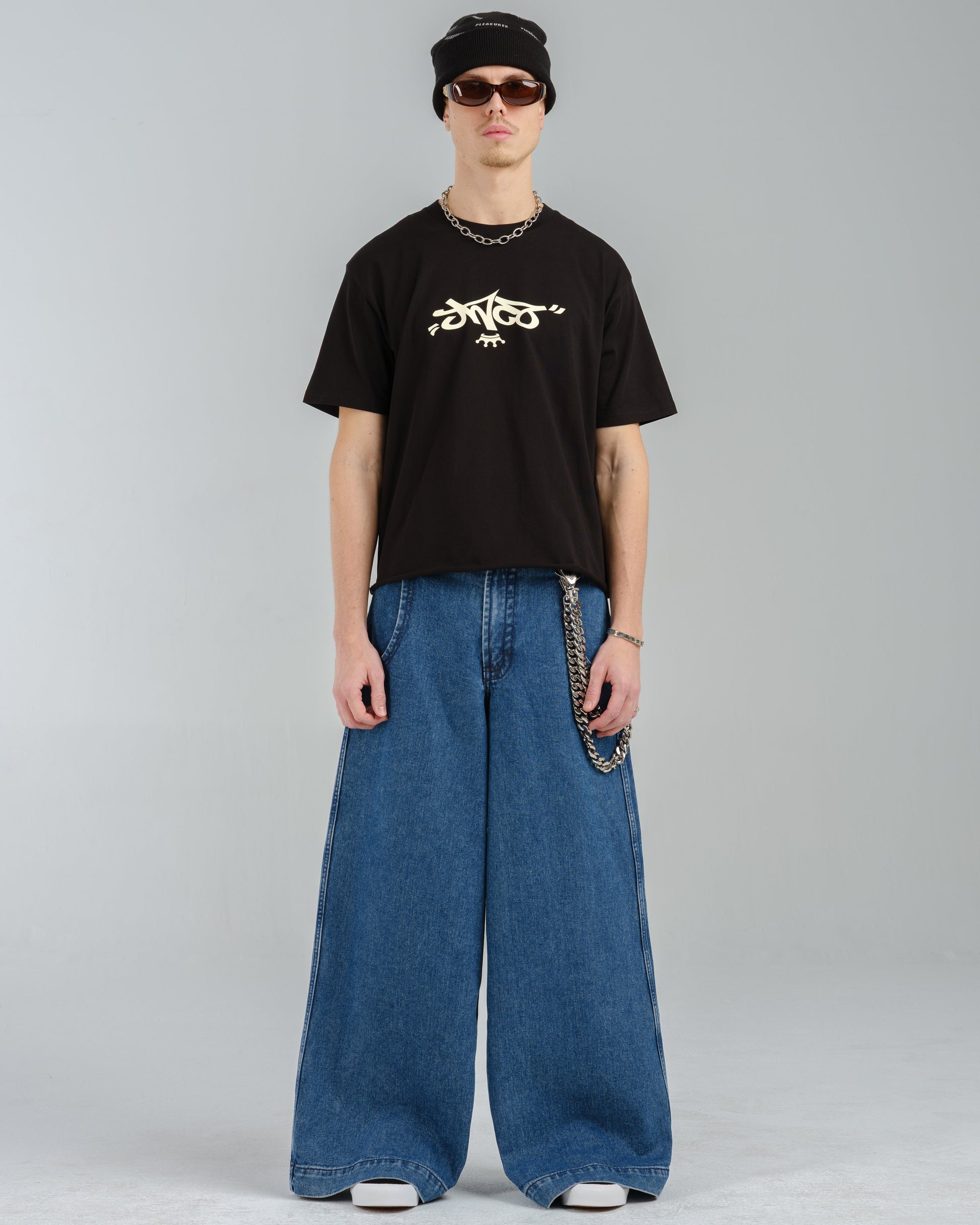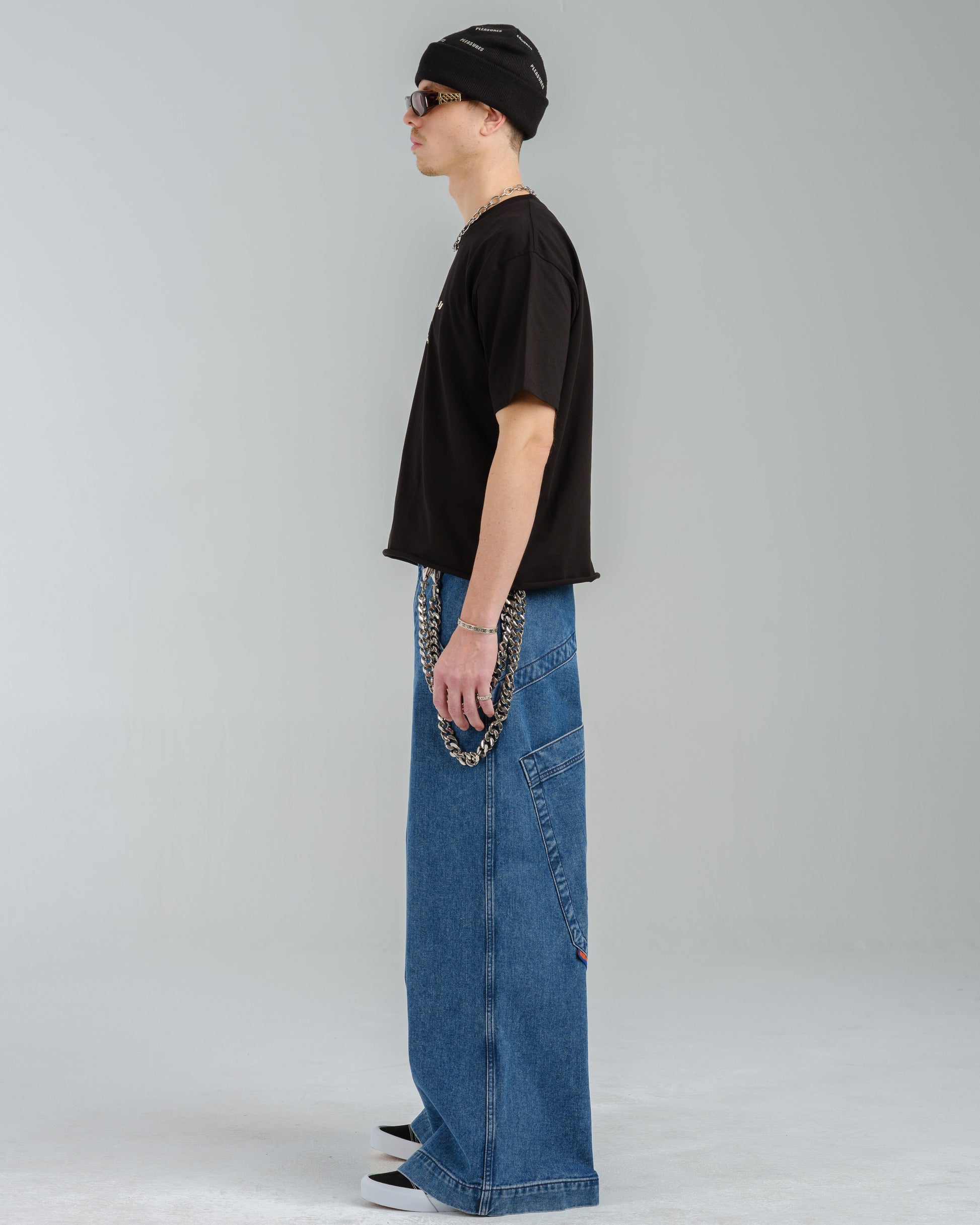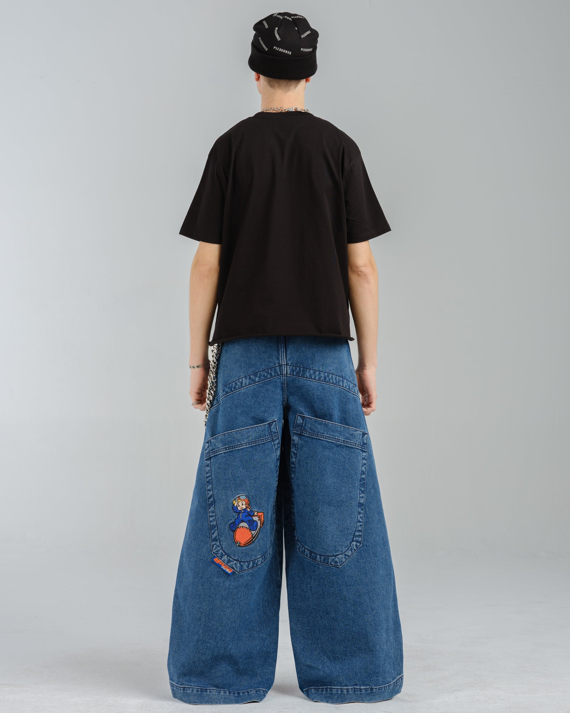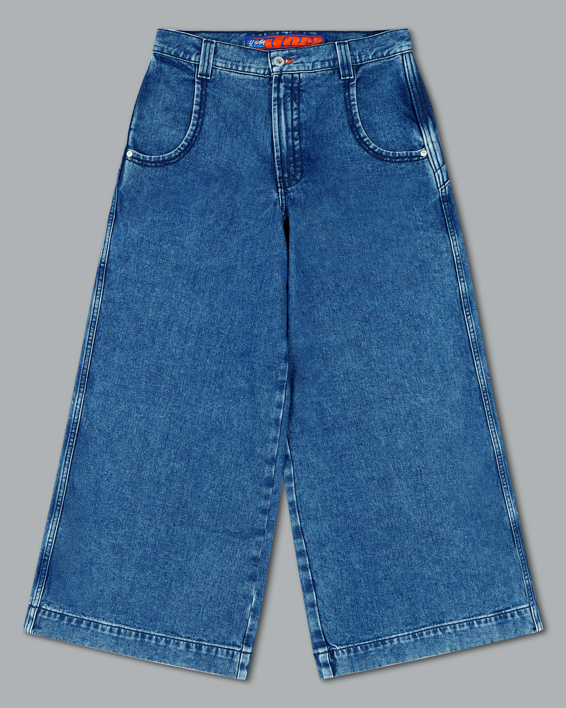 Collector classic — “The Mother of Em’ All.” Dark Stone Wash, 32" bottom opening. 14oz 100% cotton denim with heavy contrast double stitching. Includes original artwork, labels, and back pocket embroidery. Collectible Fat Boy Bacon flasher attached. Limited Edition – very limited stock.