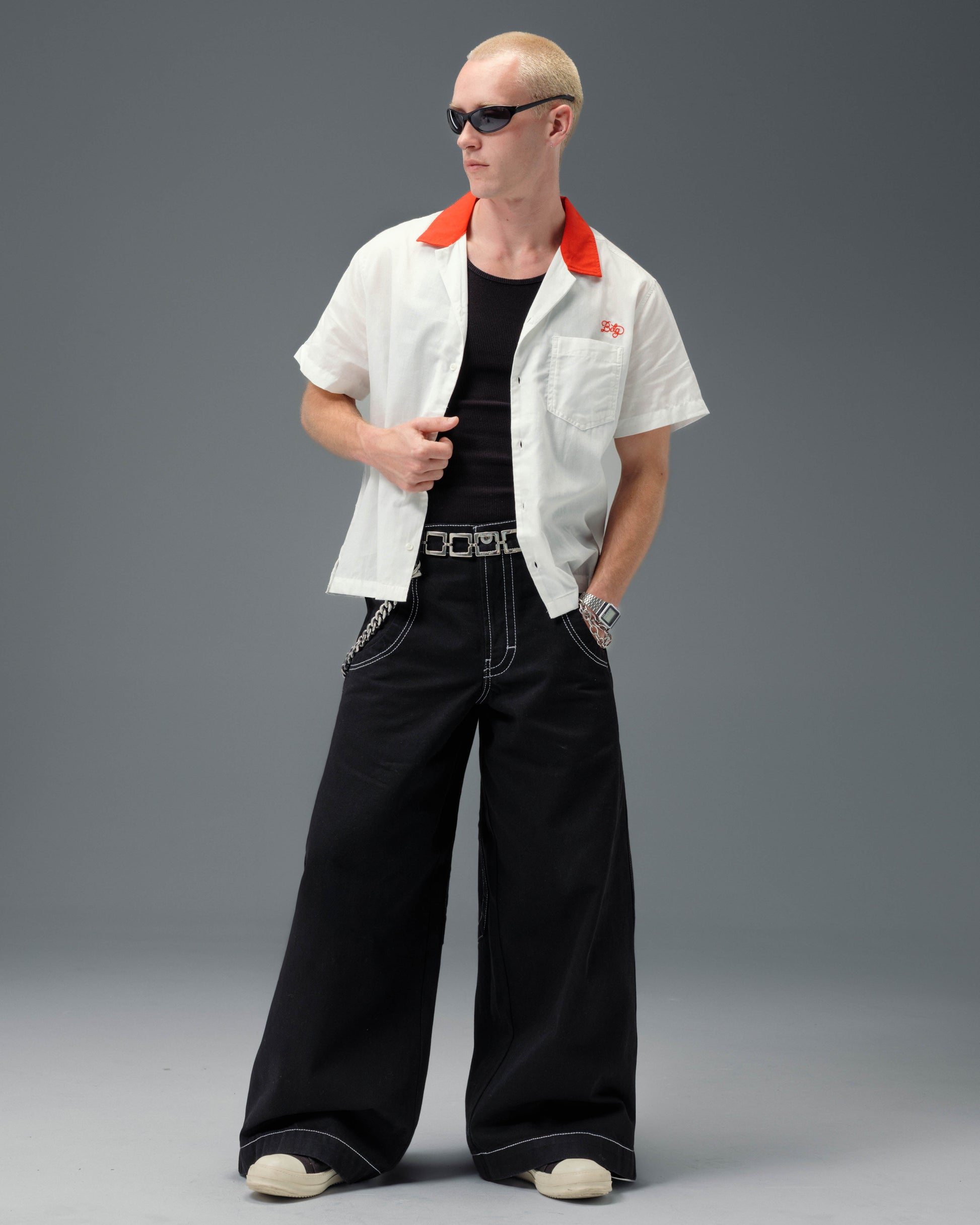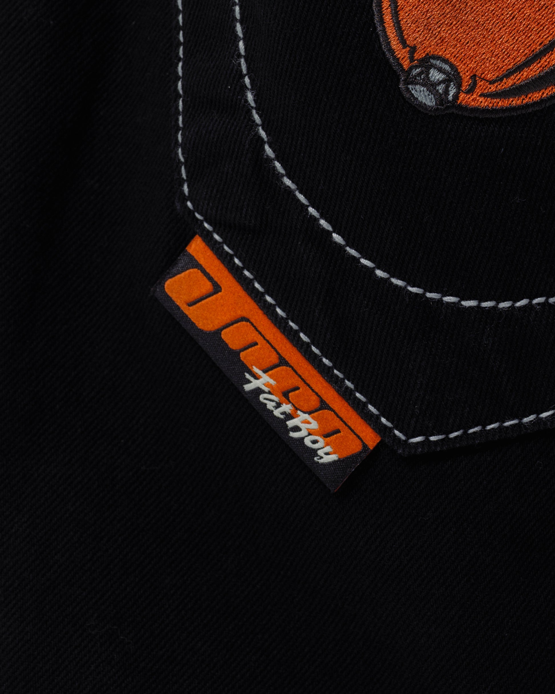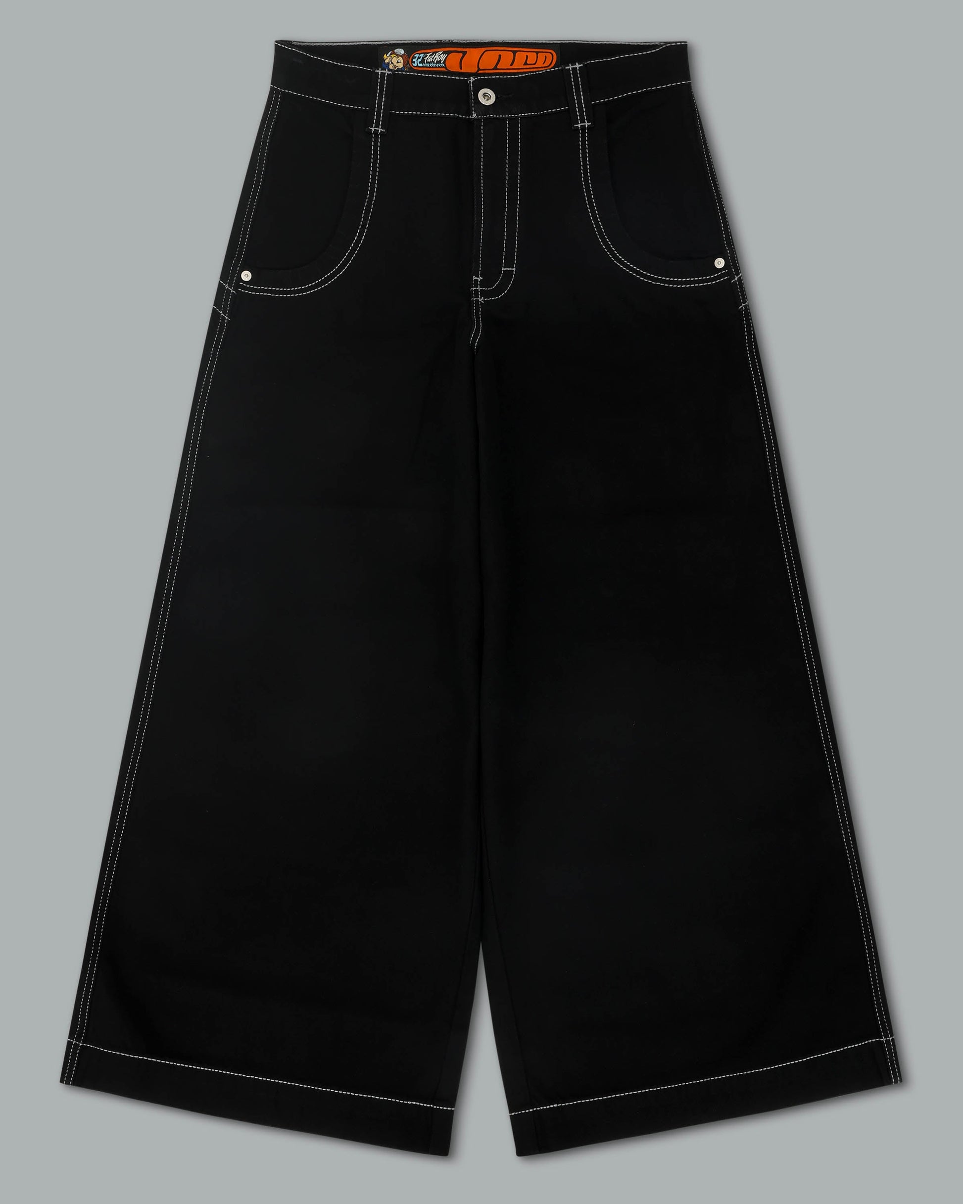 A JNCO collector classic — “The Mother of Em’ All.” Original Jet Black Denim. 32" bottom opening. 13oz 100% cotton rope-dyed with a luxe starch wax finish. Includes heavy contrast double thread, original artwork, labels, and back left pocket embroidery. Collectible Fat Boy Bacon flasher attached. Limited Edition – very Limited Stock.