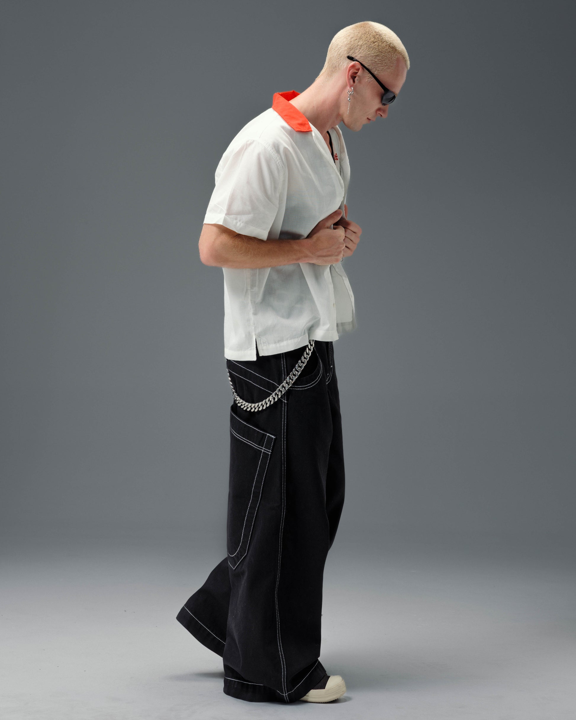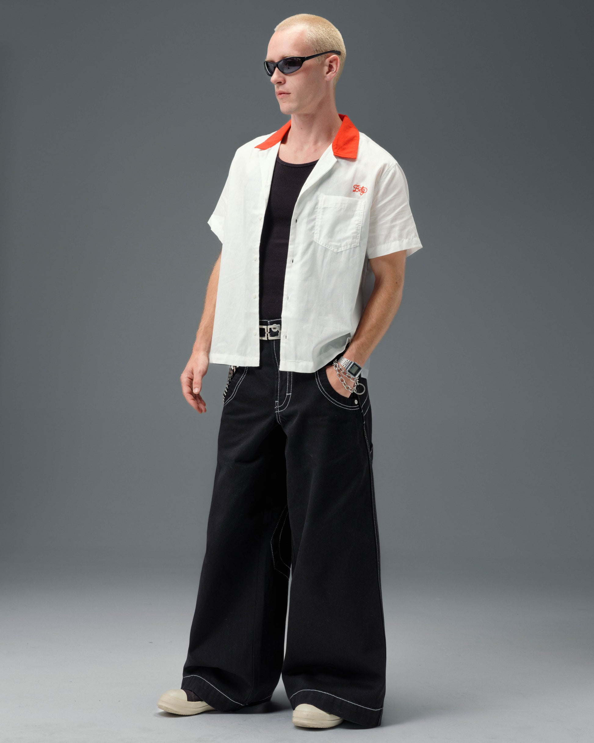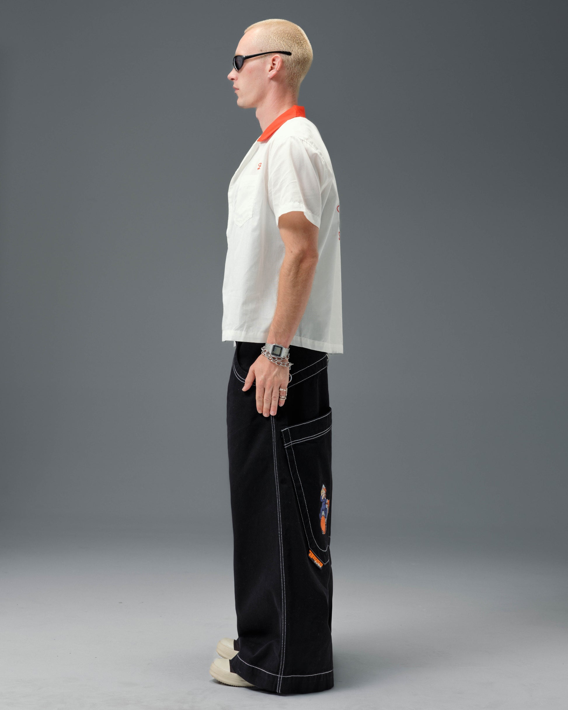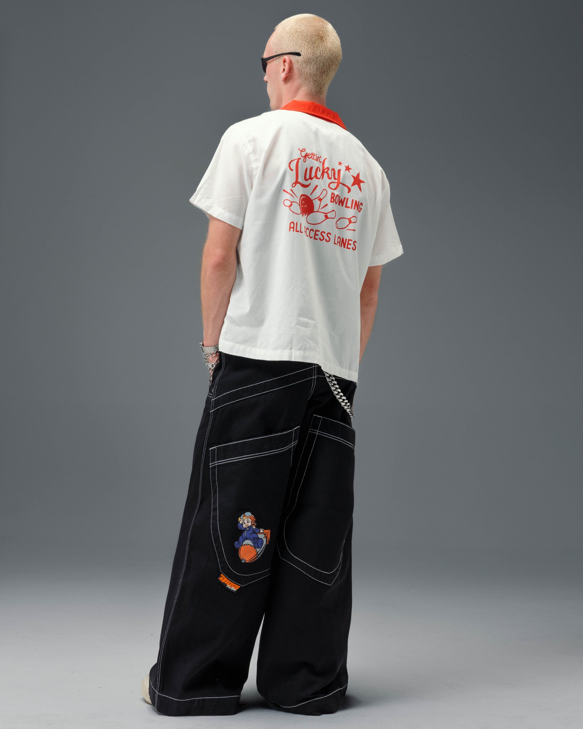 A JNCO collector classic — “The Mother of Em’ All.” Original Jet Black Denim. 32" bottom opening. 13oz 100% cotton rope-dyed with a luxe starch wax finish. Includes heavy contrast double thread, original artwork, labels, and back left pocket embroidery. Collectible Fat Boy Bacon flasher attached. Limited Edition – very Limited Stock.