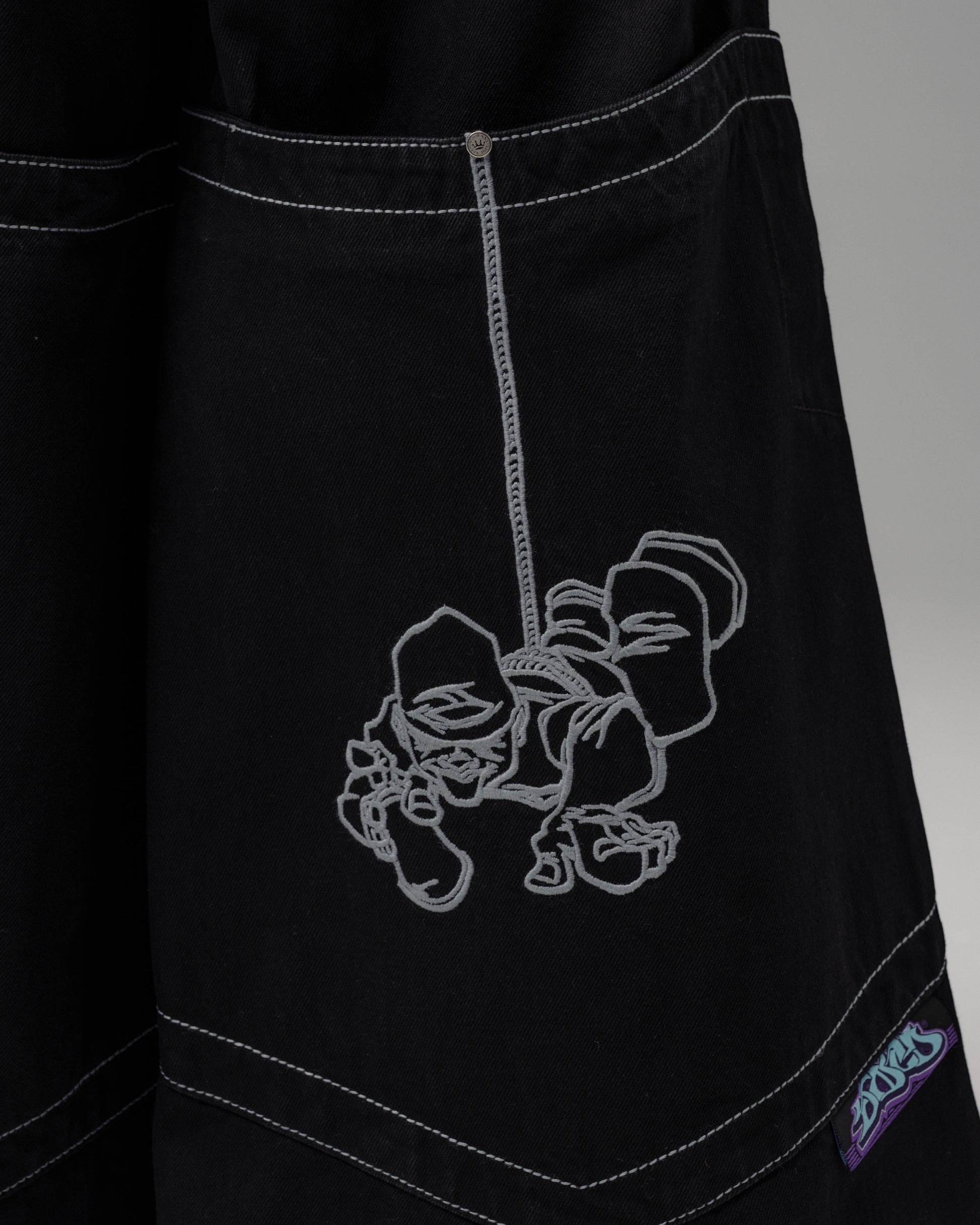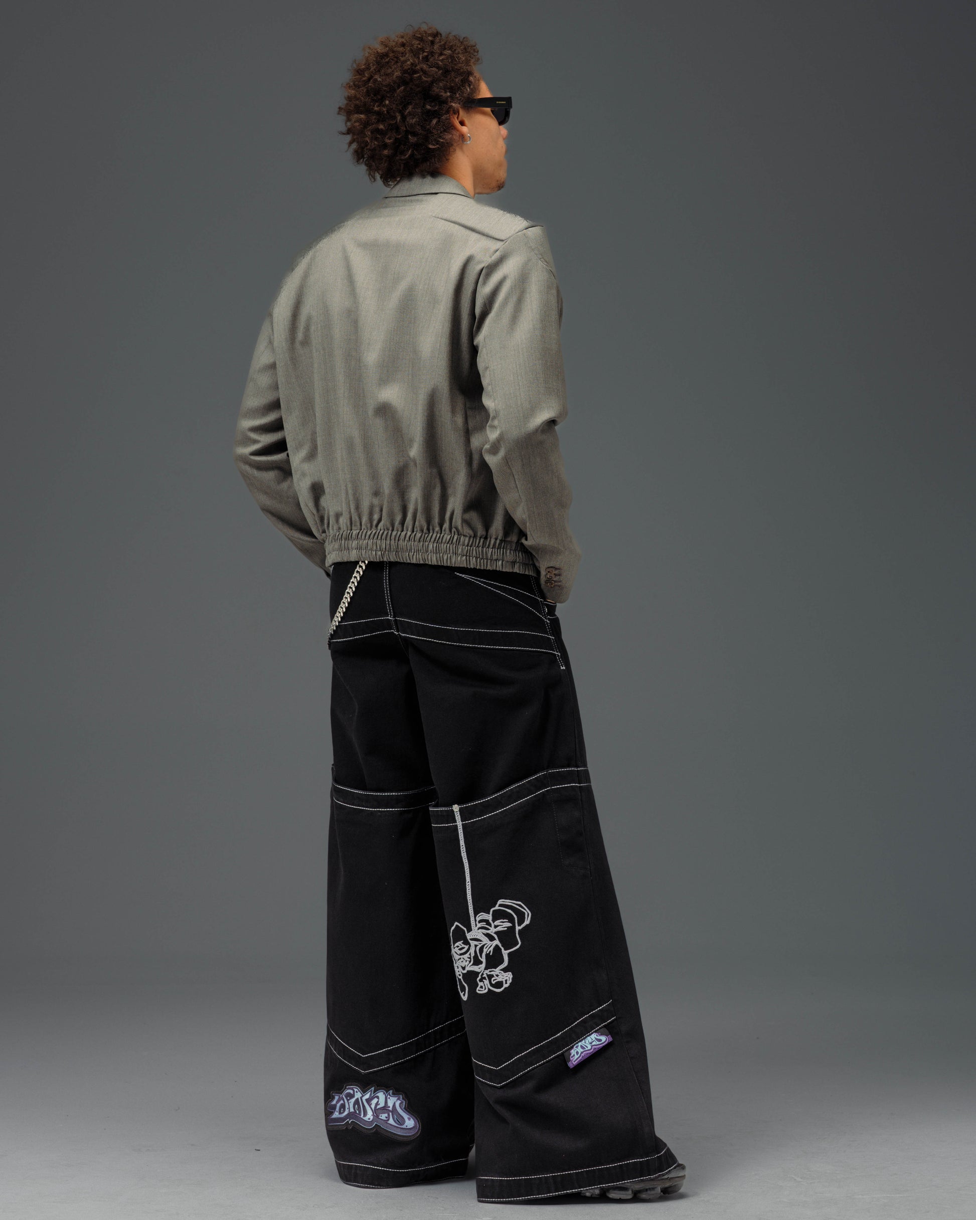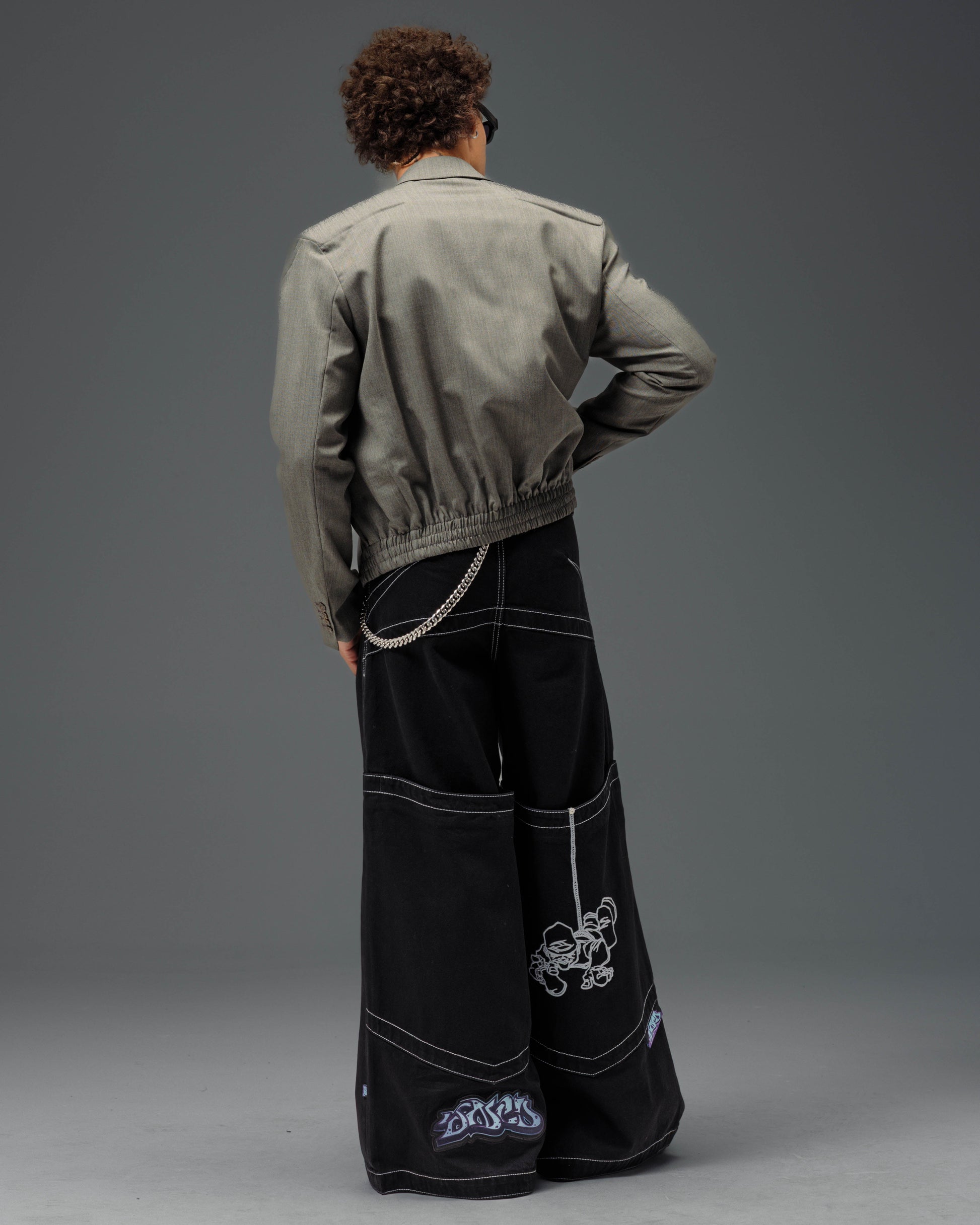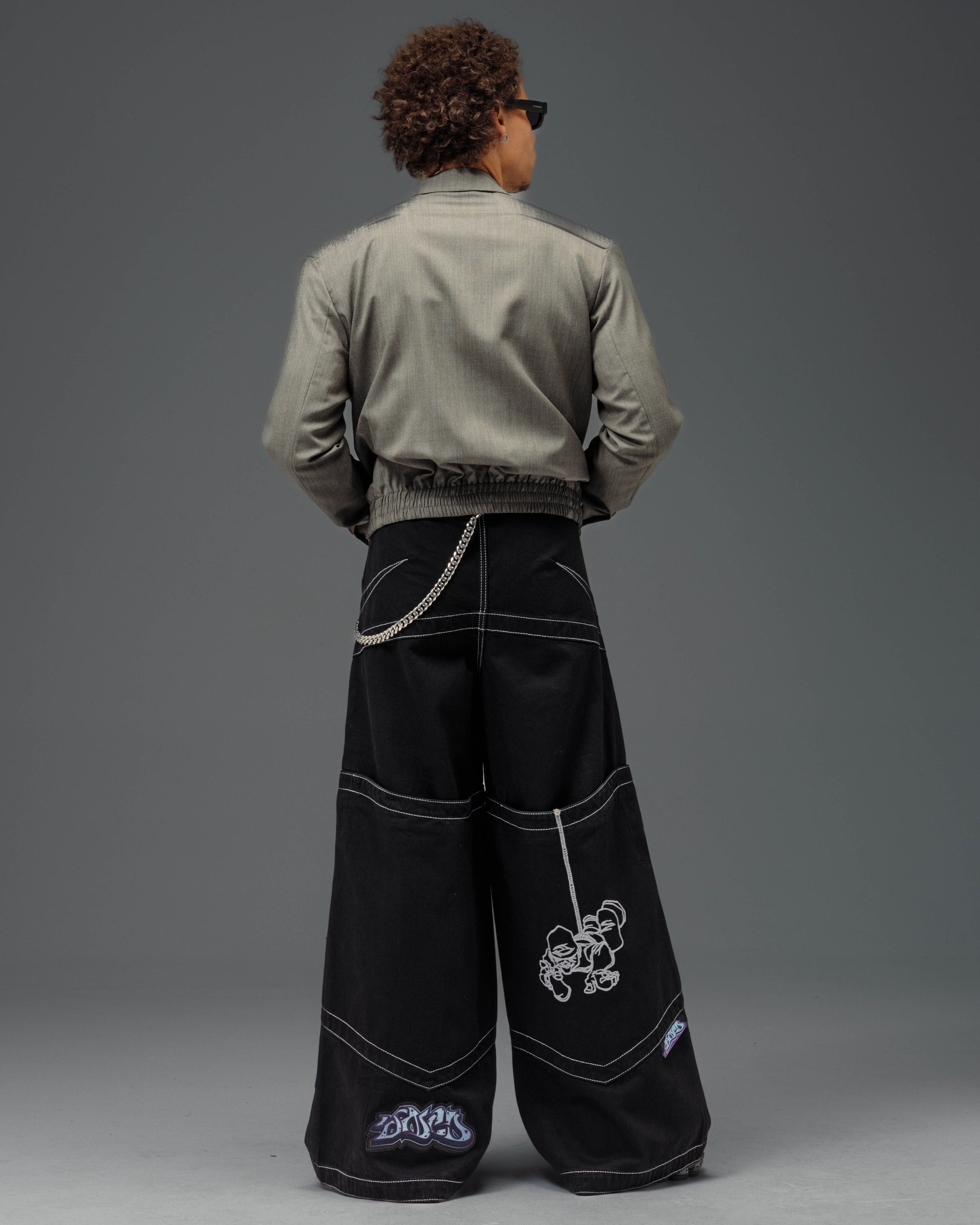Collector’s item from the original JNCO “Roots” line. Jet Black denim, 34" bottom opening. 13oz rope-dyed 100% cotton with a luxe starch wax finish. Heavy double contrast stitching. Oversized back pockets with JNCO logo and “hangin’ tagger” embroidery. Original labels and collectible metallic flasher. Limited Edition – very limited stock.