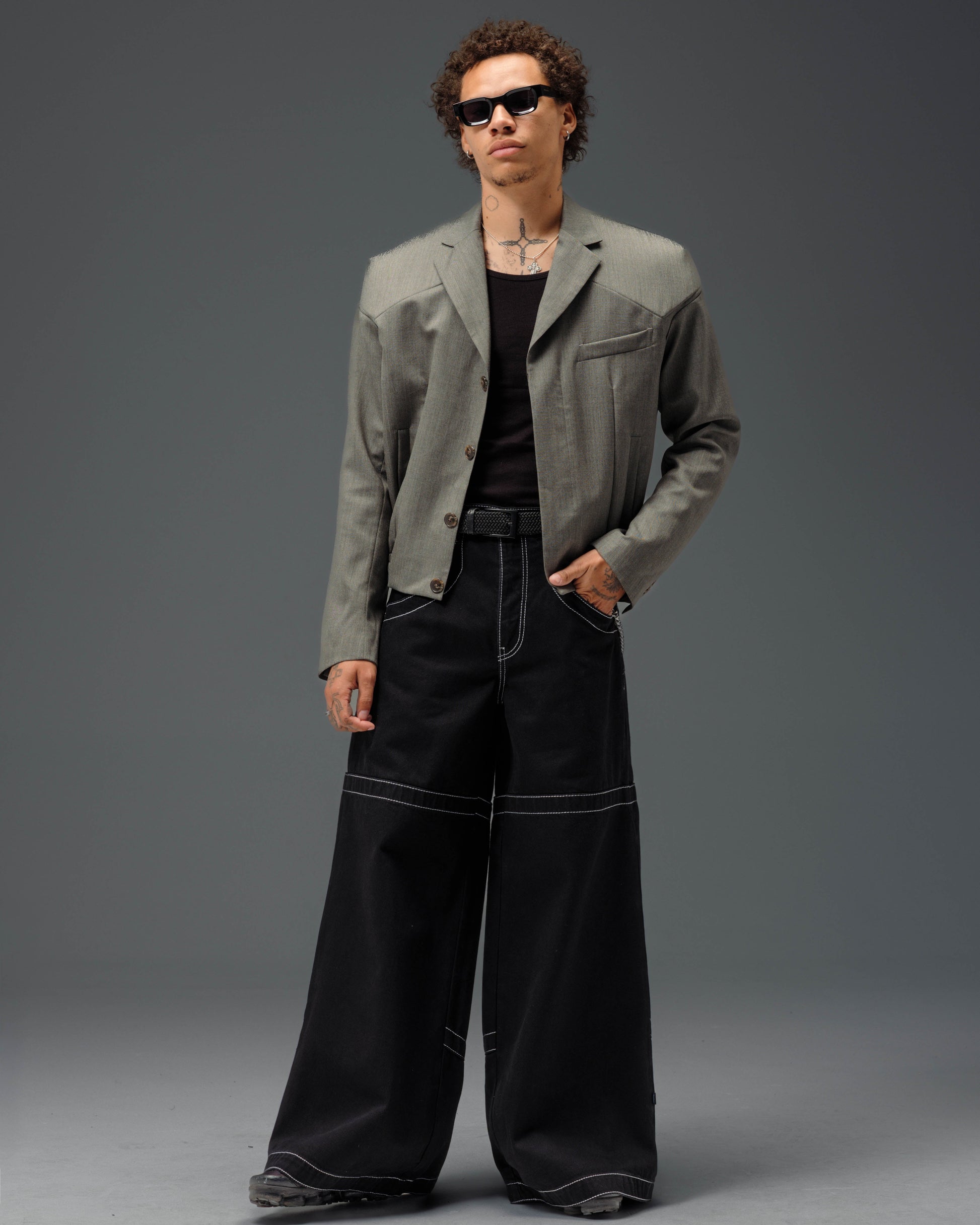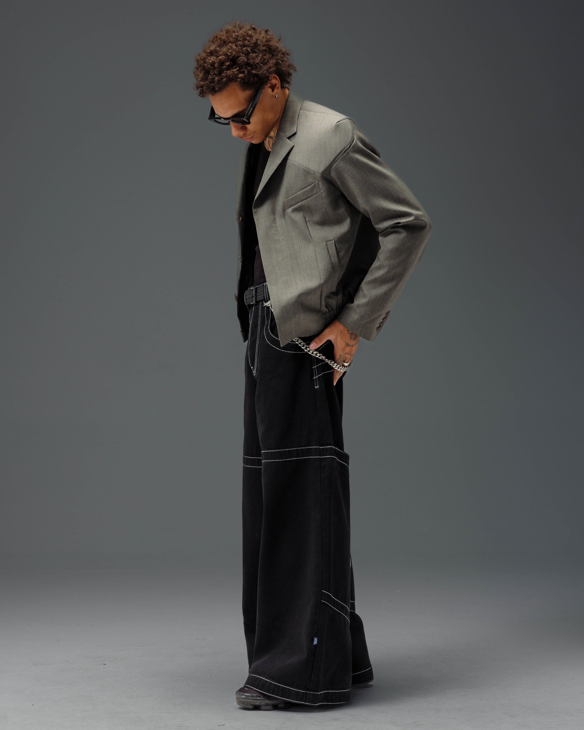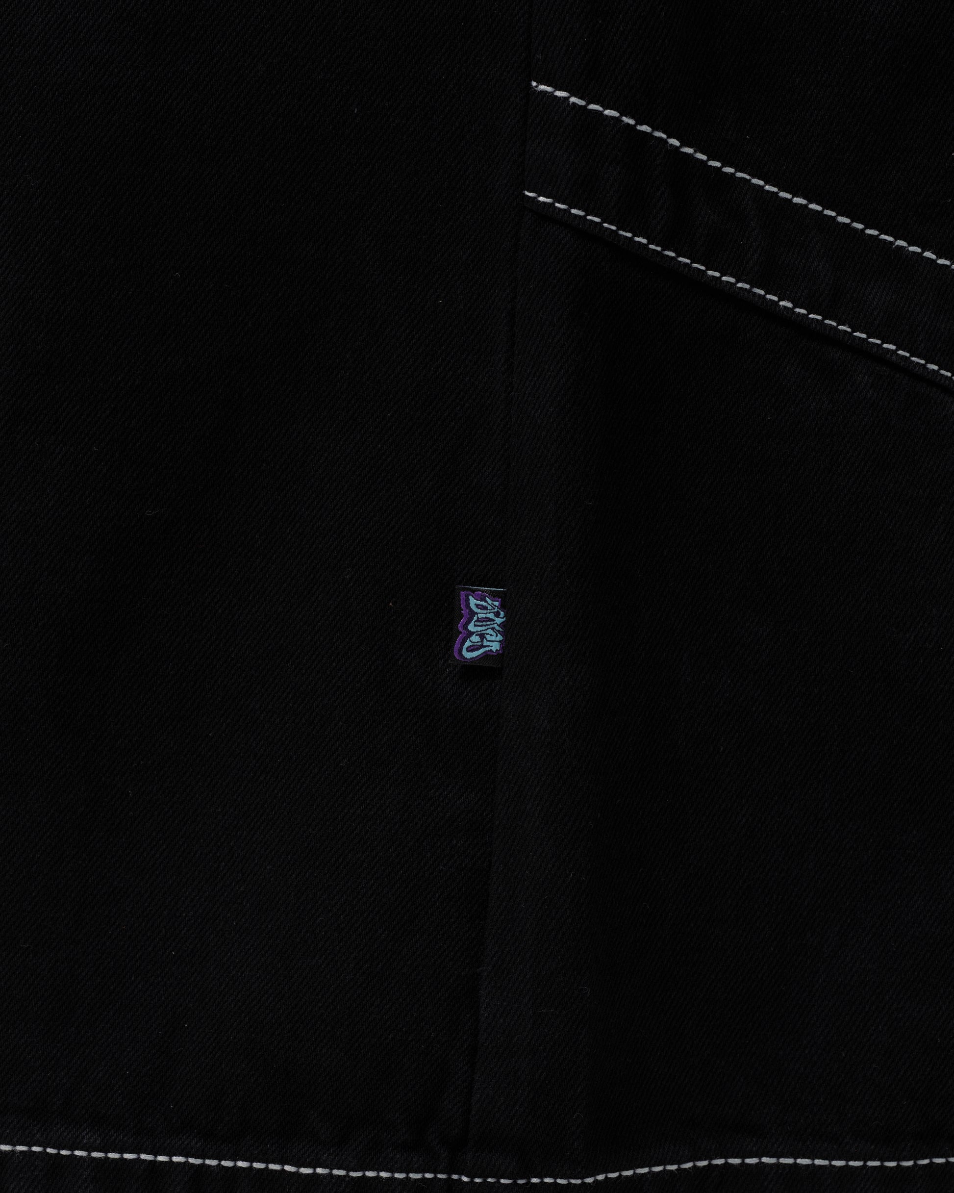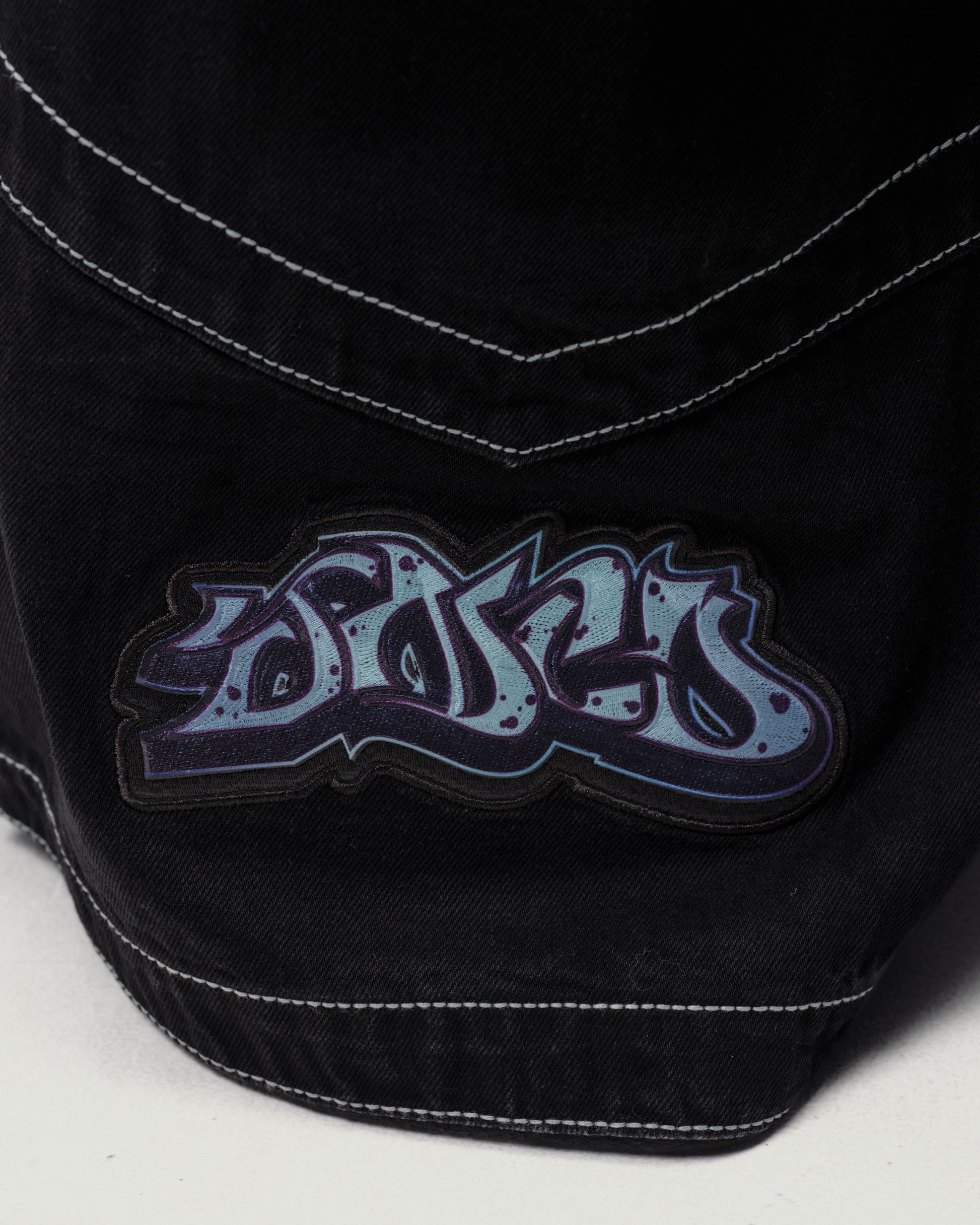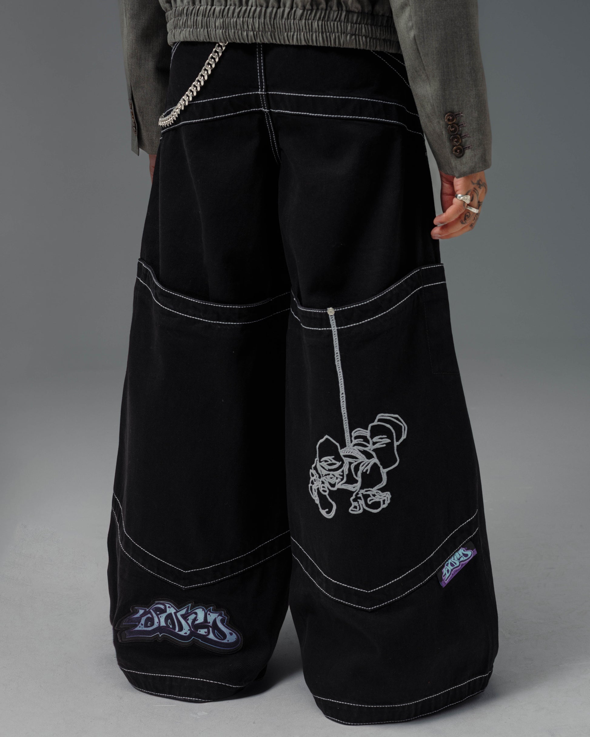 Collector’s item from the original JNCO “Roots” line. Jet Black denim, 34" bottom opening. 13oz rope-dyed 100% cotton with a luxe starch wax finish. Heavy double contrast stitching. Oversized back pockets with JNCO logo and “hangin’ tagger” embroidery. Original labels and collectible metallic flasher. Limited Edition – very limited stock.