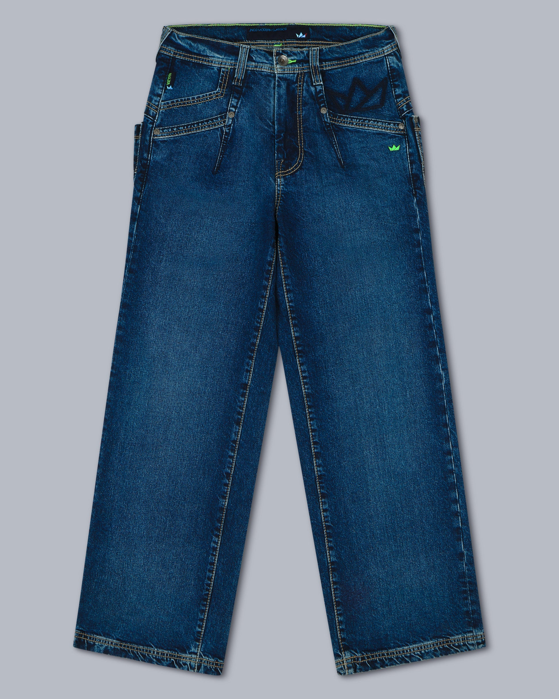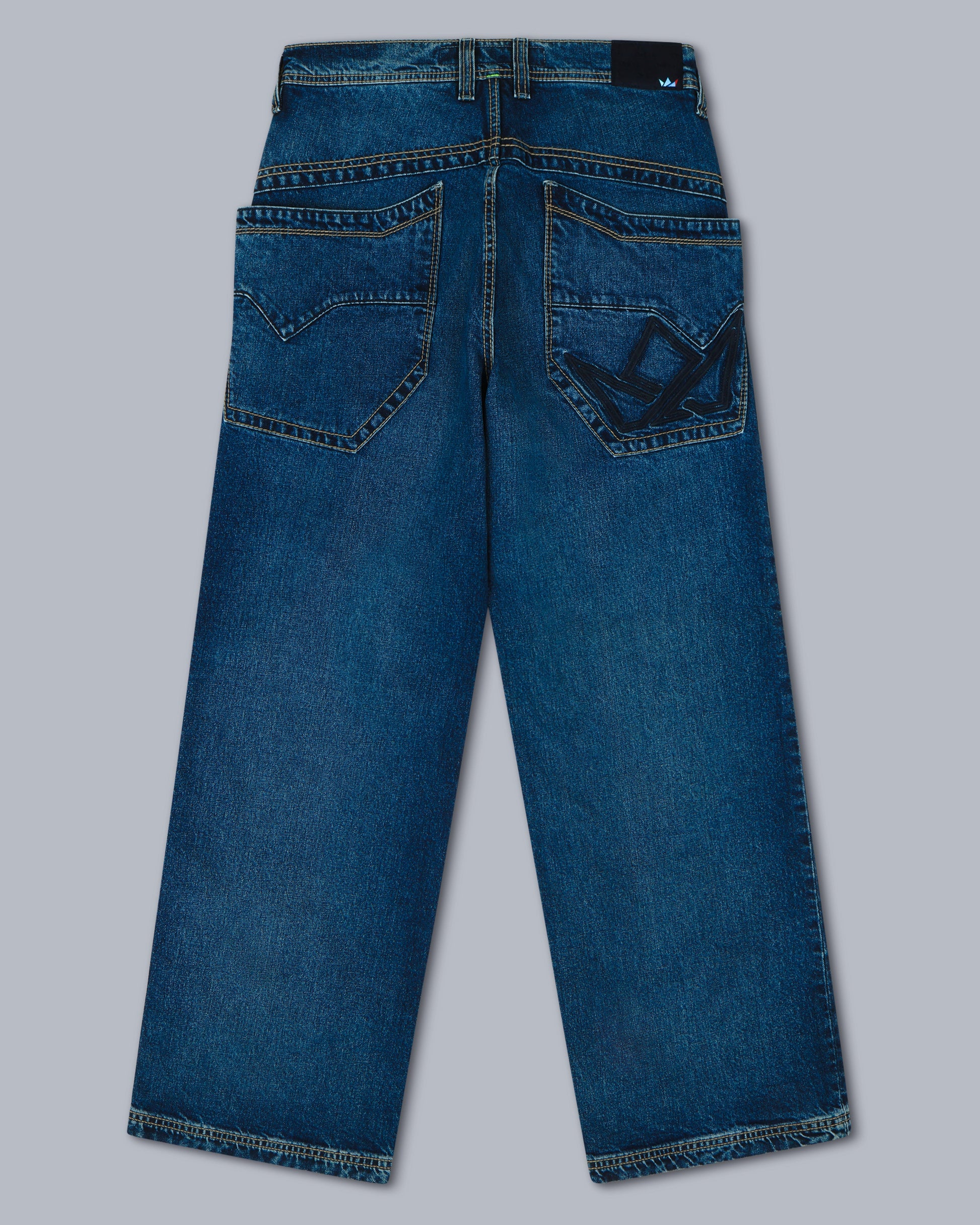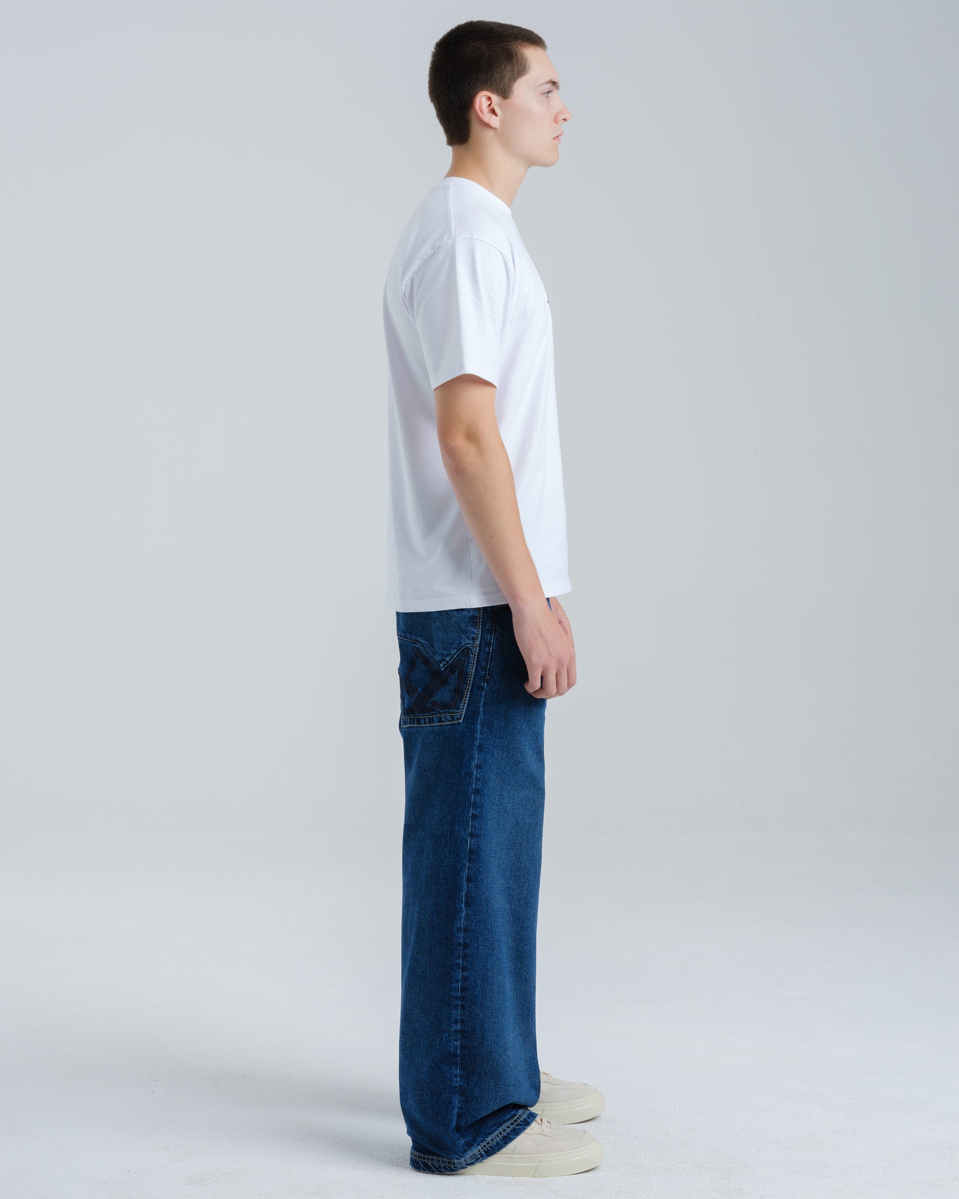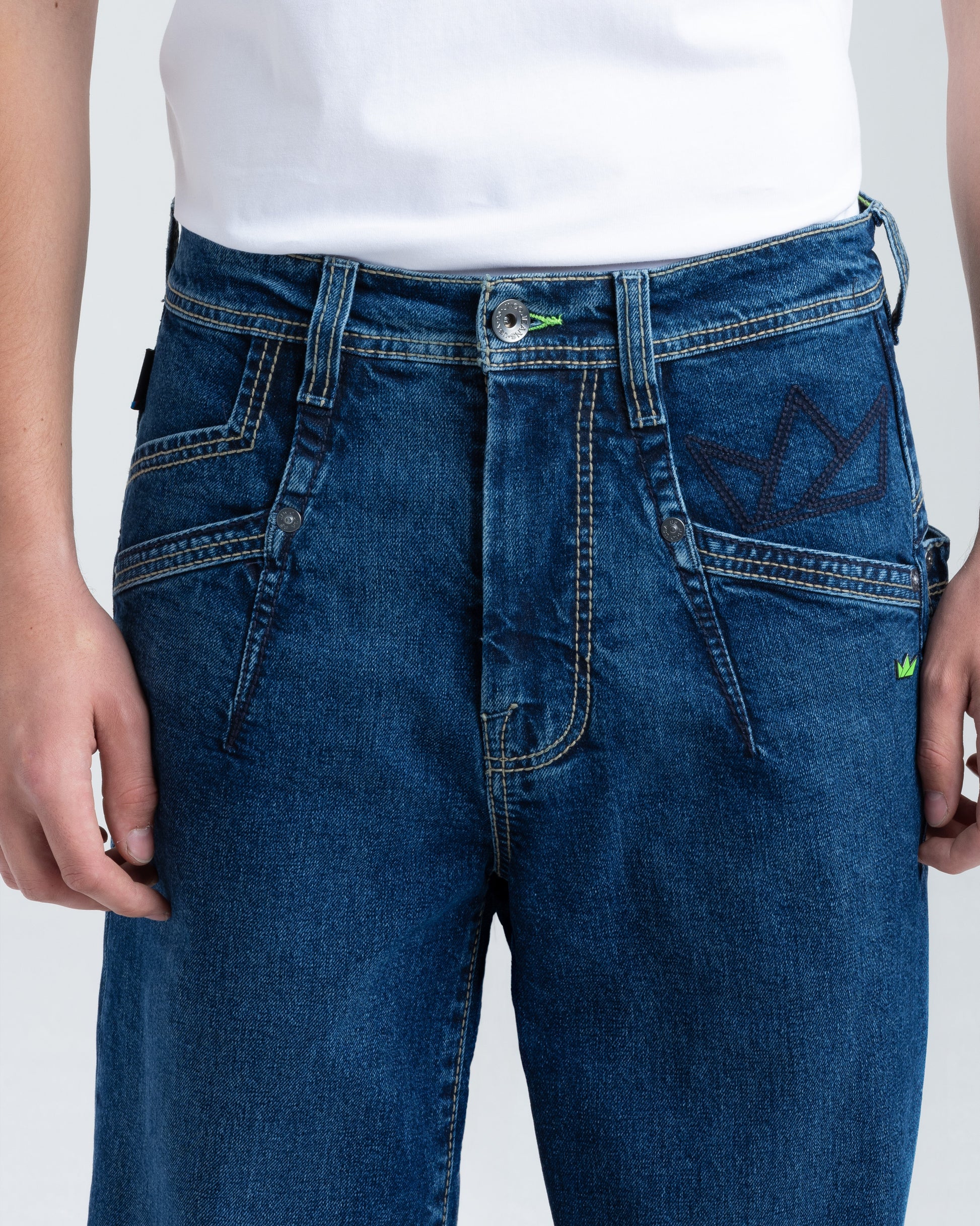 A fusion of clean lines and bold design, featuring the new Crown Geometric logo. 13oz “Ardesia Blue Shade” denim with slight stretch for comfort and durability. Regular rise with a wide, straight stove-pipe leg and 23" bottom opening. Includes oversized workwear-inspired back pockets with embroidered logo, angled front pockets, and a functional coin pocket. Finished with contrast stitching and premium hardware.