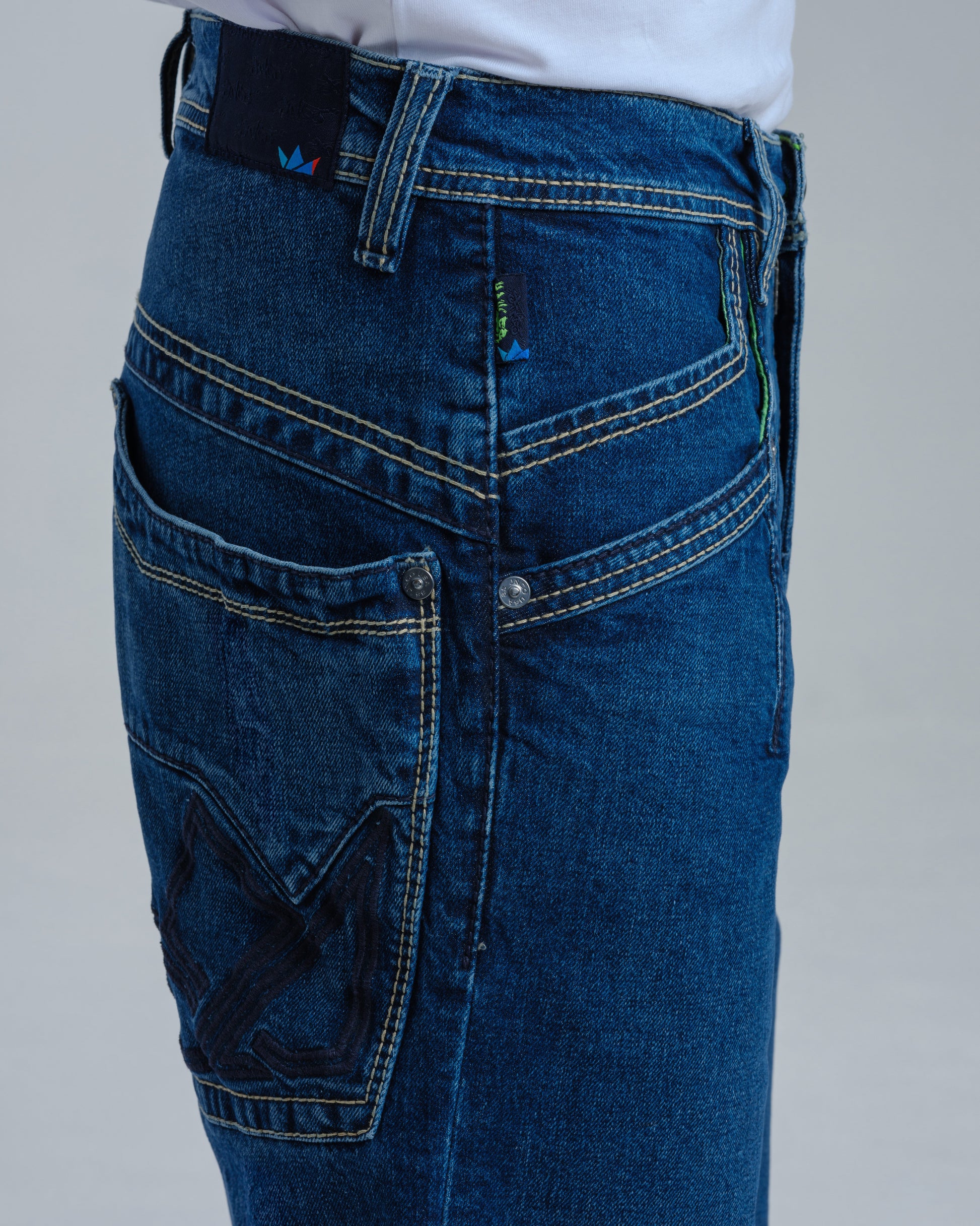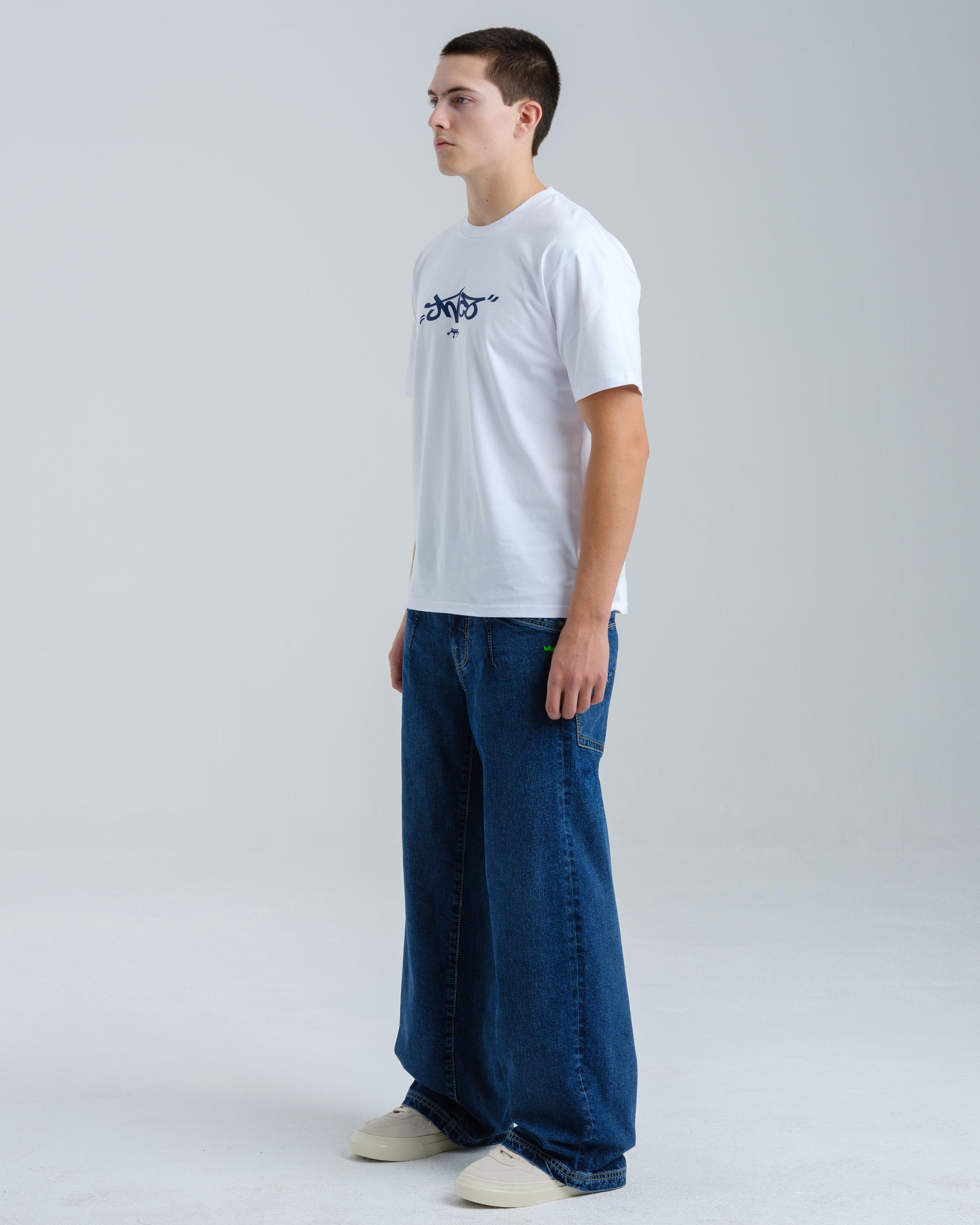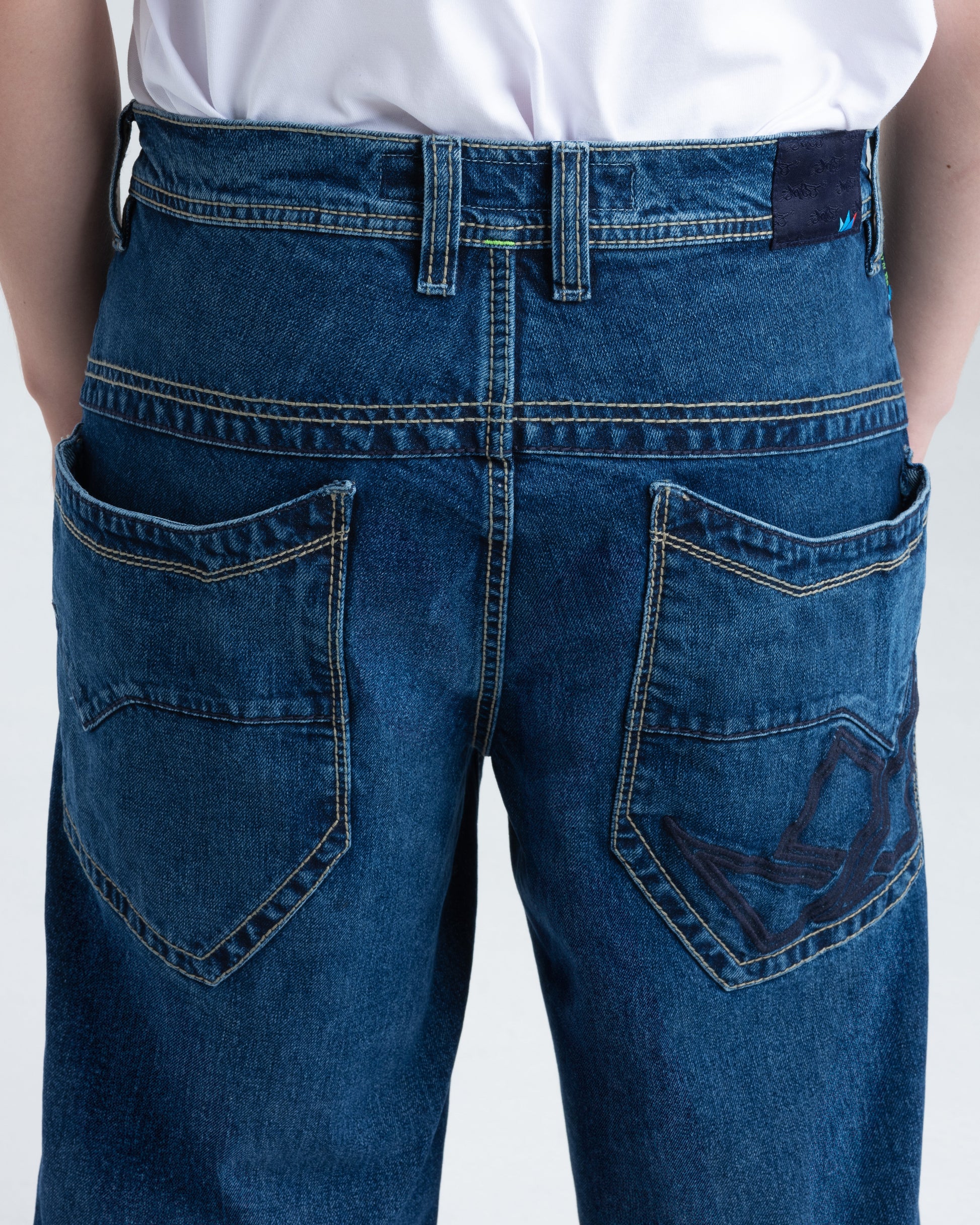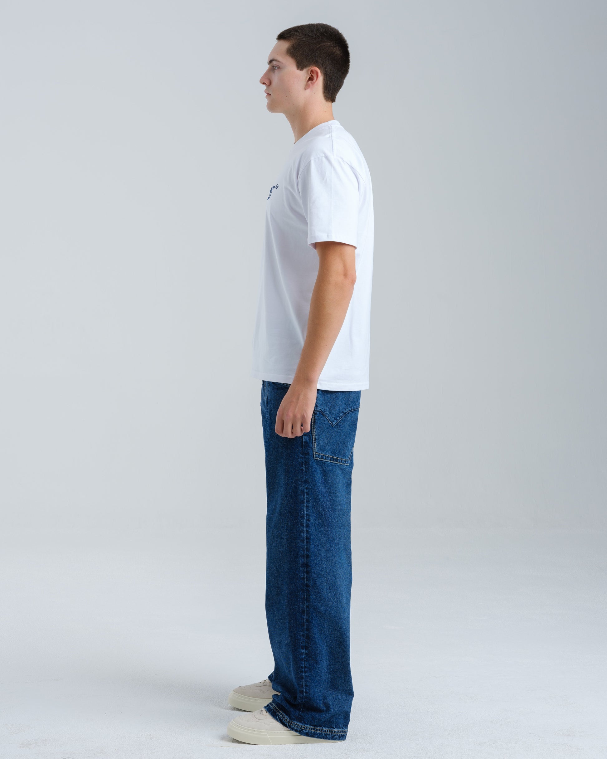 A fusion of clean lines and bold design, featuring the new Crown Geometric logo. 13oz “Ardesia Blue Shade” denim with slight stretch for comfort and durability. Regular rise with a wide, straight stove-pipe leg and 23" bottom opening. Includes oversized workwear-inspired back pockets with embroidered logo, angled front pockets, and a functional coin pocket. Finished with contrast stitching and premium hardware.