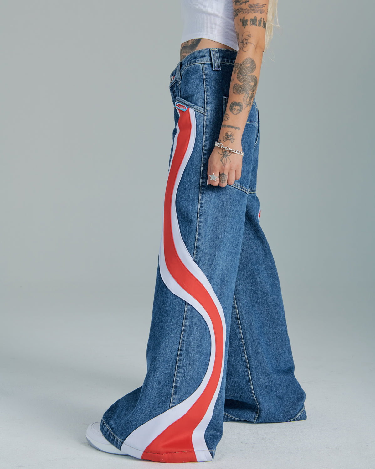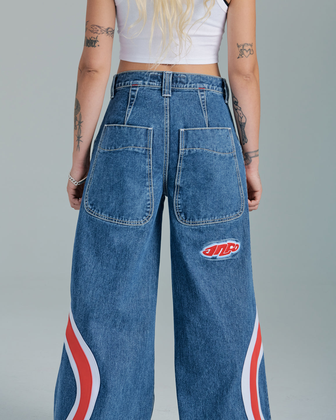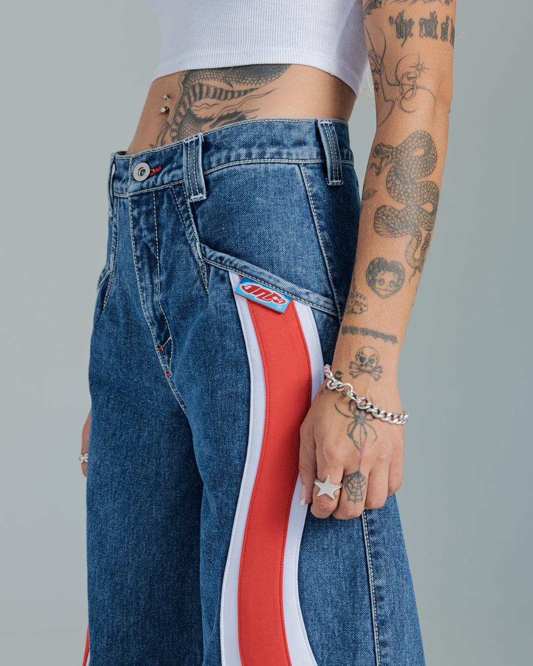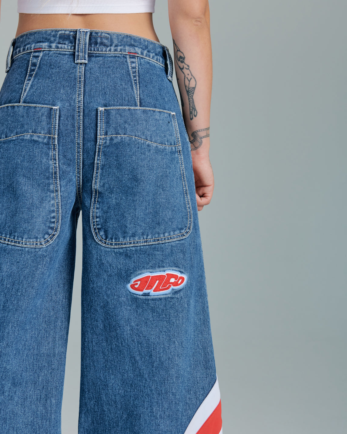 Iconic JNCO Women’s style from the Solid State Collection. Dark Stone Wash, 32" bottom opening. 14oz 100% cotton indigo denim with heavy double contrast stitching. Features large angular pockets, original wave panel, and mid-rise fit with concealed zip. “It’s Gonna Move You.” Limited Edition – very limited stock.