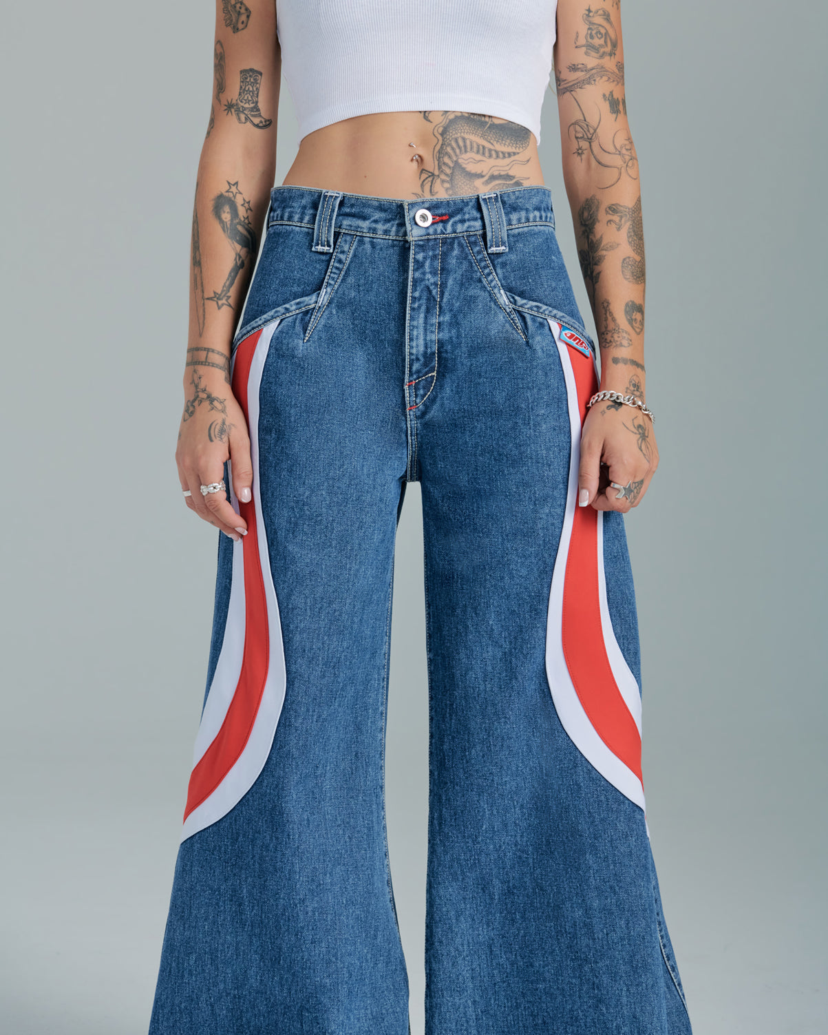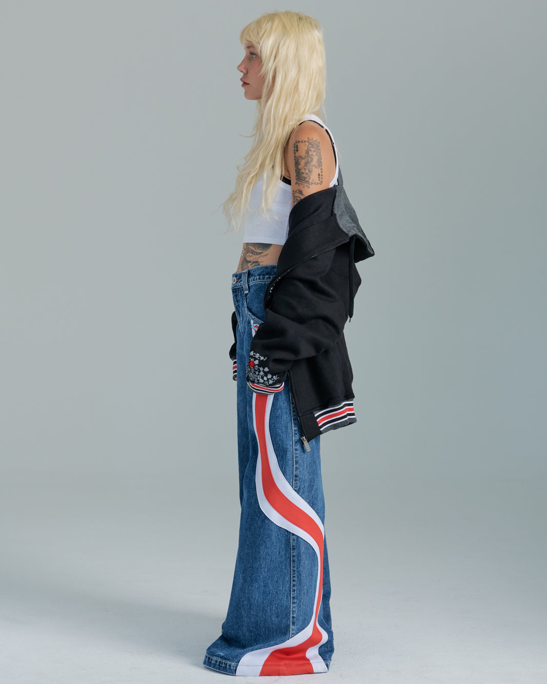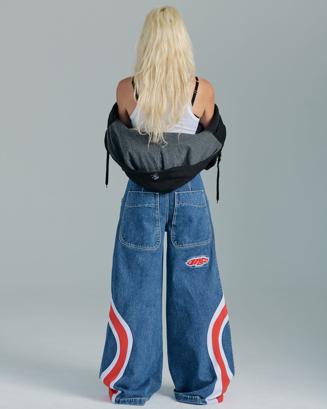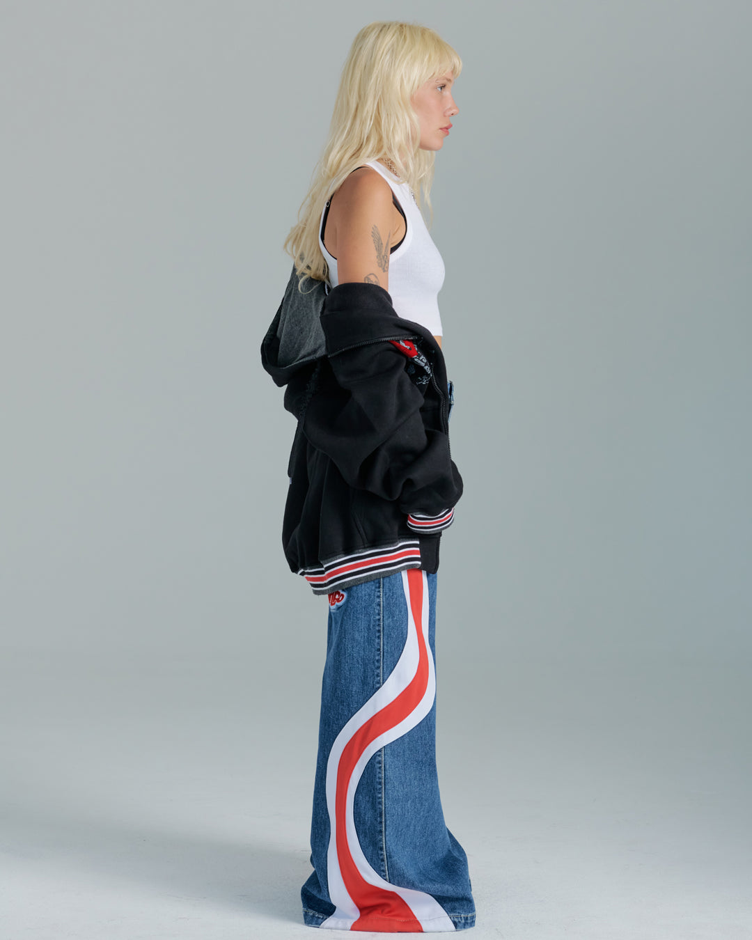 Iconic JNCO Women’s style from the Solid State Collection. Dark Stone Wash, 32" bottom opening. 14oz 100% cotton indigo denim with heavy double contrast stitching. Features large angular pockets, original wave panel, and mid-rise fit with concealed zip. “It’s Gonna Move You.” Limited Edition – very limited stock.