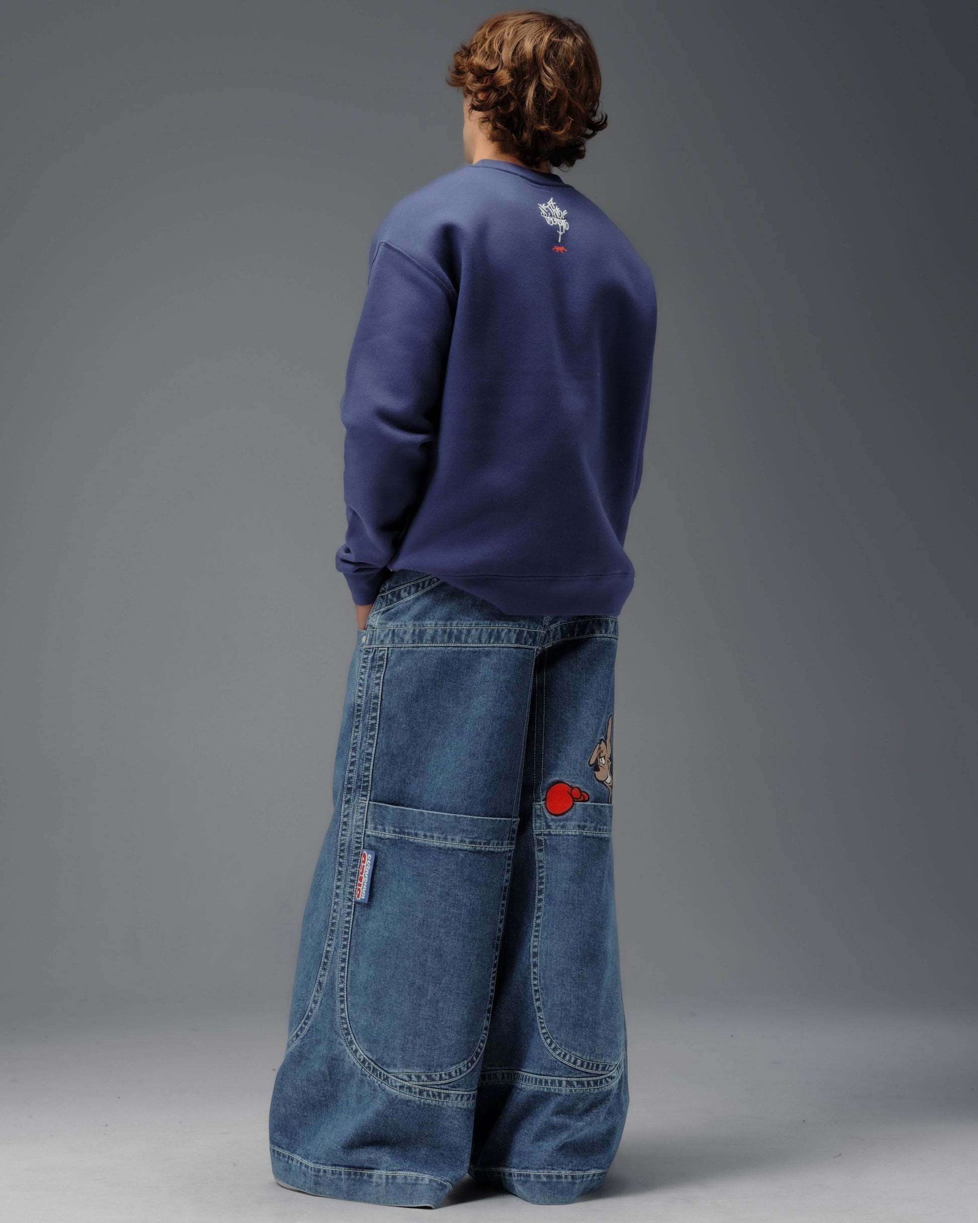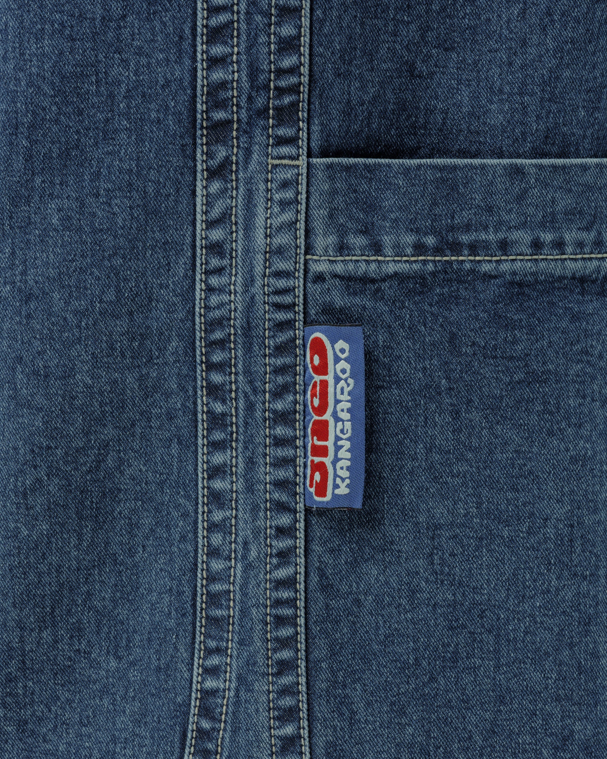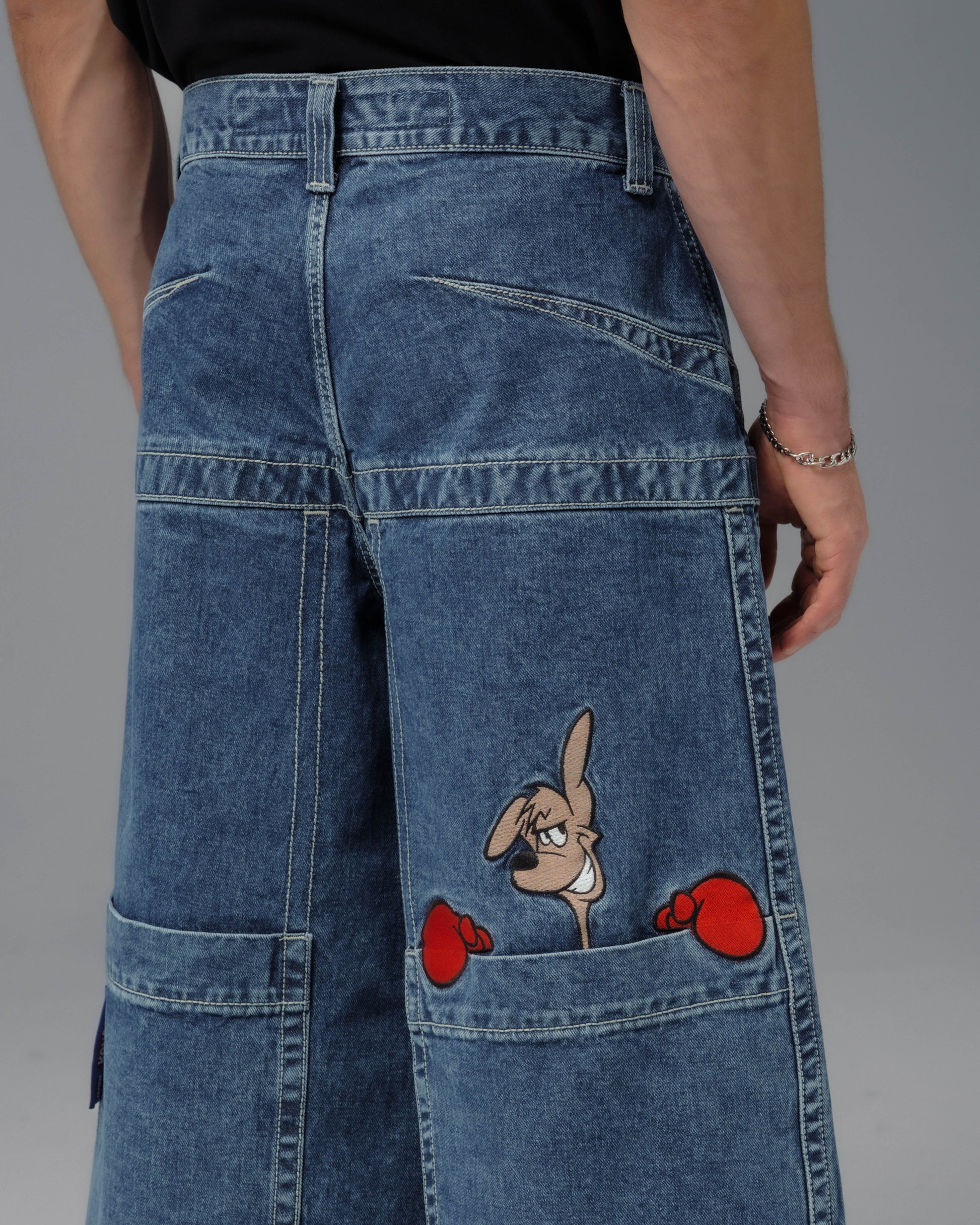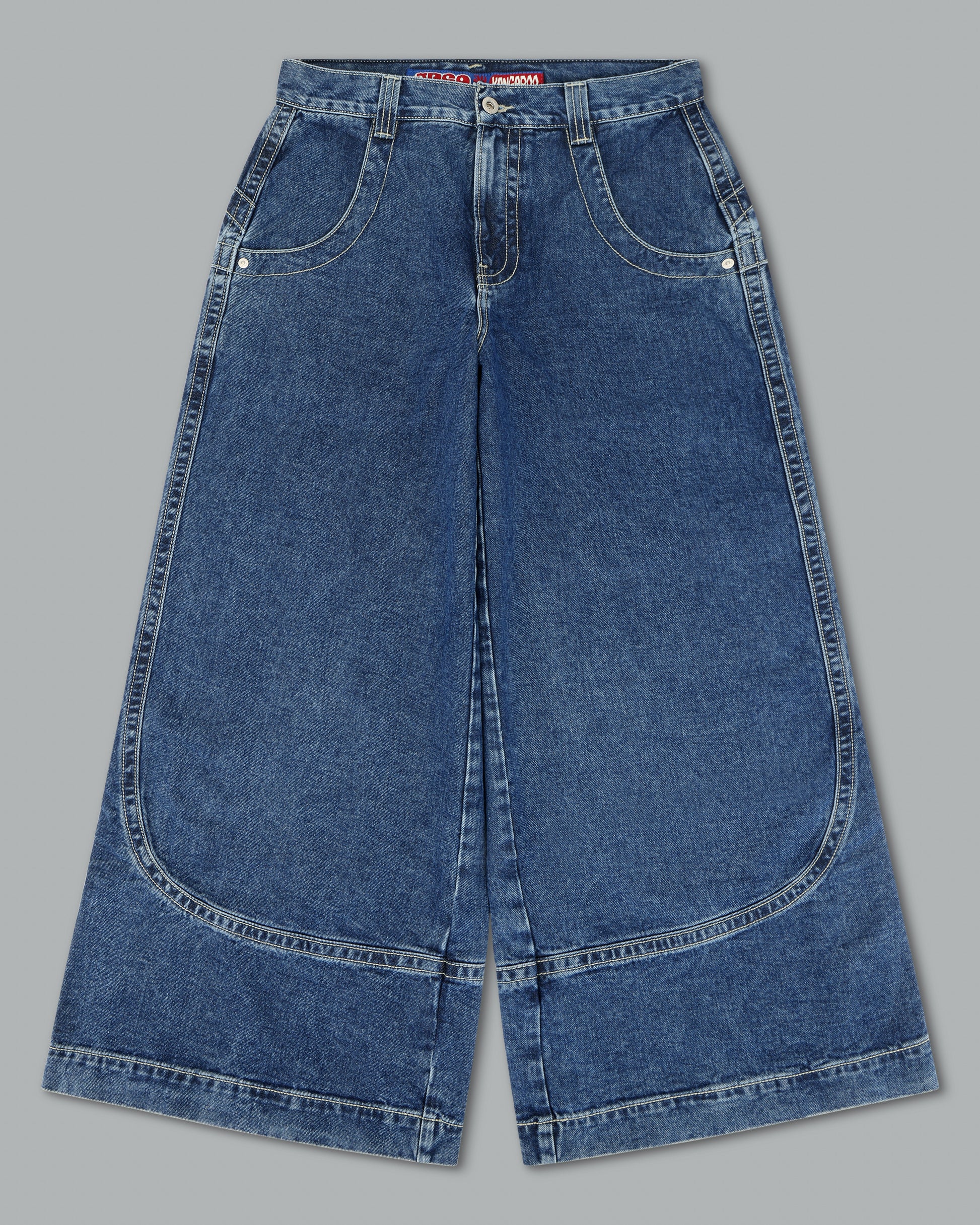 Collector’s classic in Dark Stone Wash with a 34" bottom opening. 14oz 100% cotton denim with heavy contrast stitching. Features iconic kangaroo embroidery with 26,000 dense stitches peeking from deep right pocket, and intricate stitch detailing. Includes collectible leather-feel boxing glove flasher. Limited Edition – very limited stock.