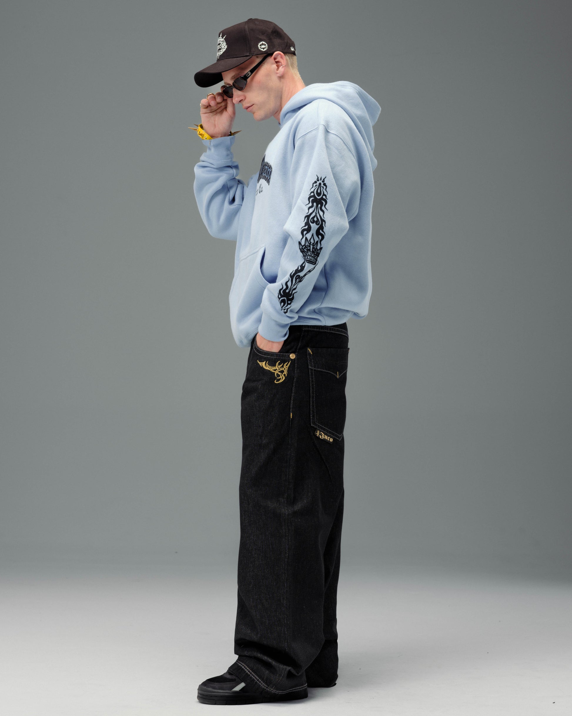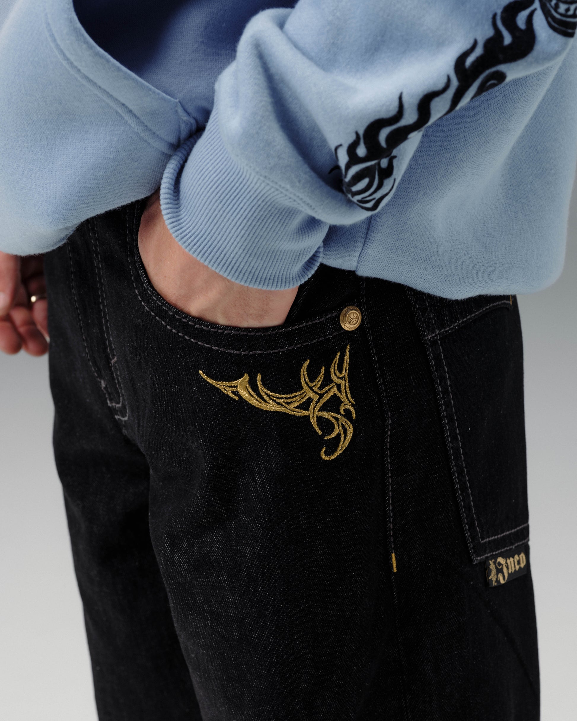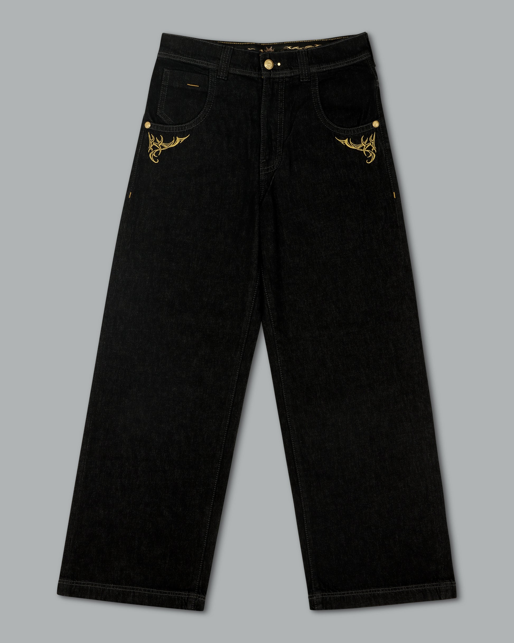 From the famous Tribal Collection. 13.5oz ring-spun denim in a rich Laser Black wash with an authentic marbled finish. 23" bottom opening with contrast stitching and a wide-leg fit. Features Celtic-inspired tribal embroidery on back pocket in antique gold metallic thread, with indigo-accented hems, front corner details, and a signature four-suit rivet. Collectible flasher included.