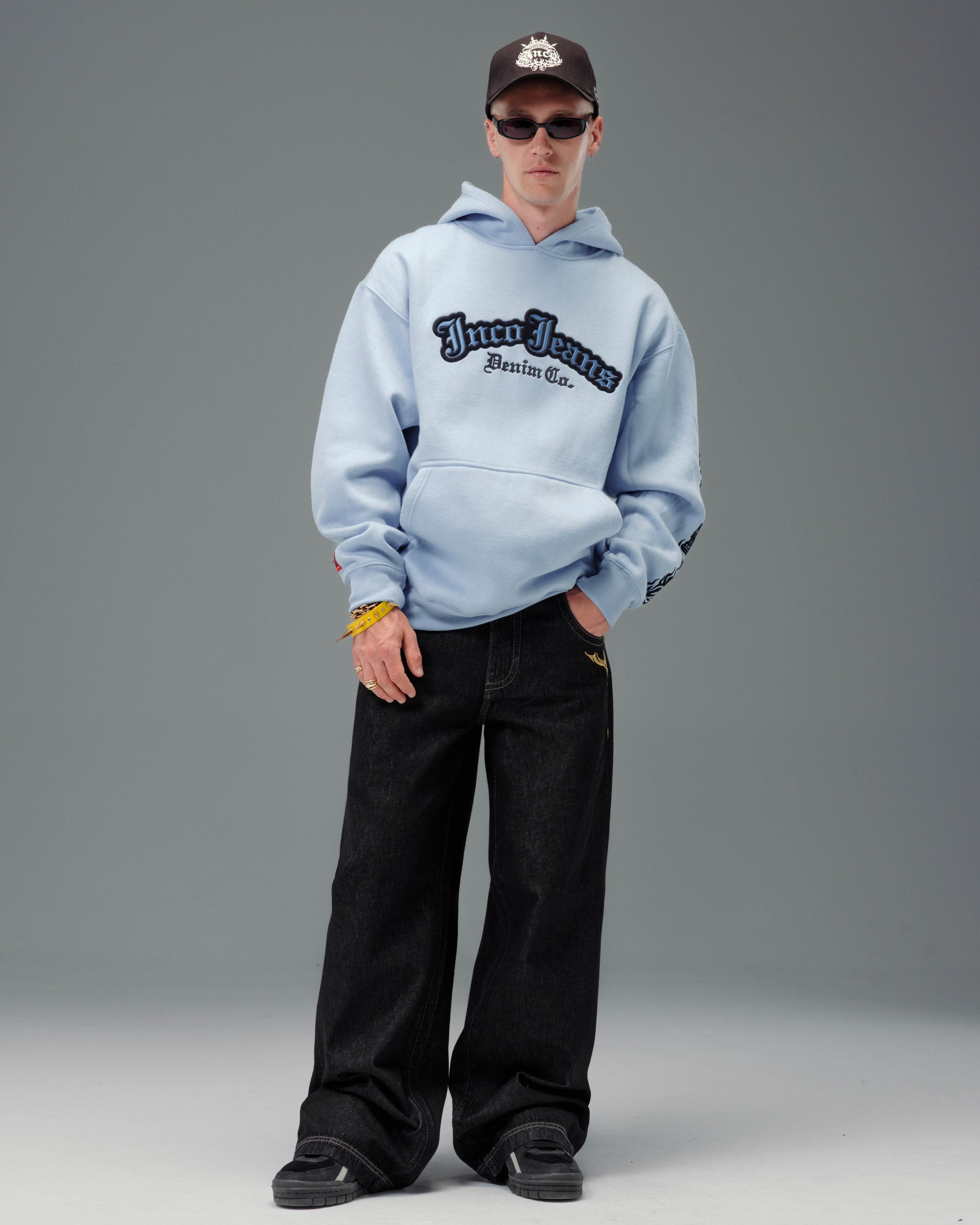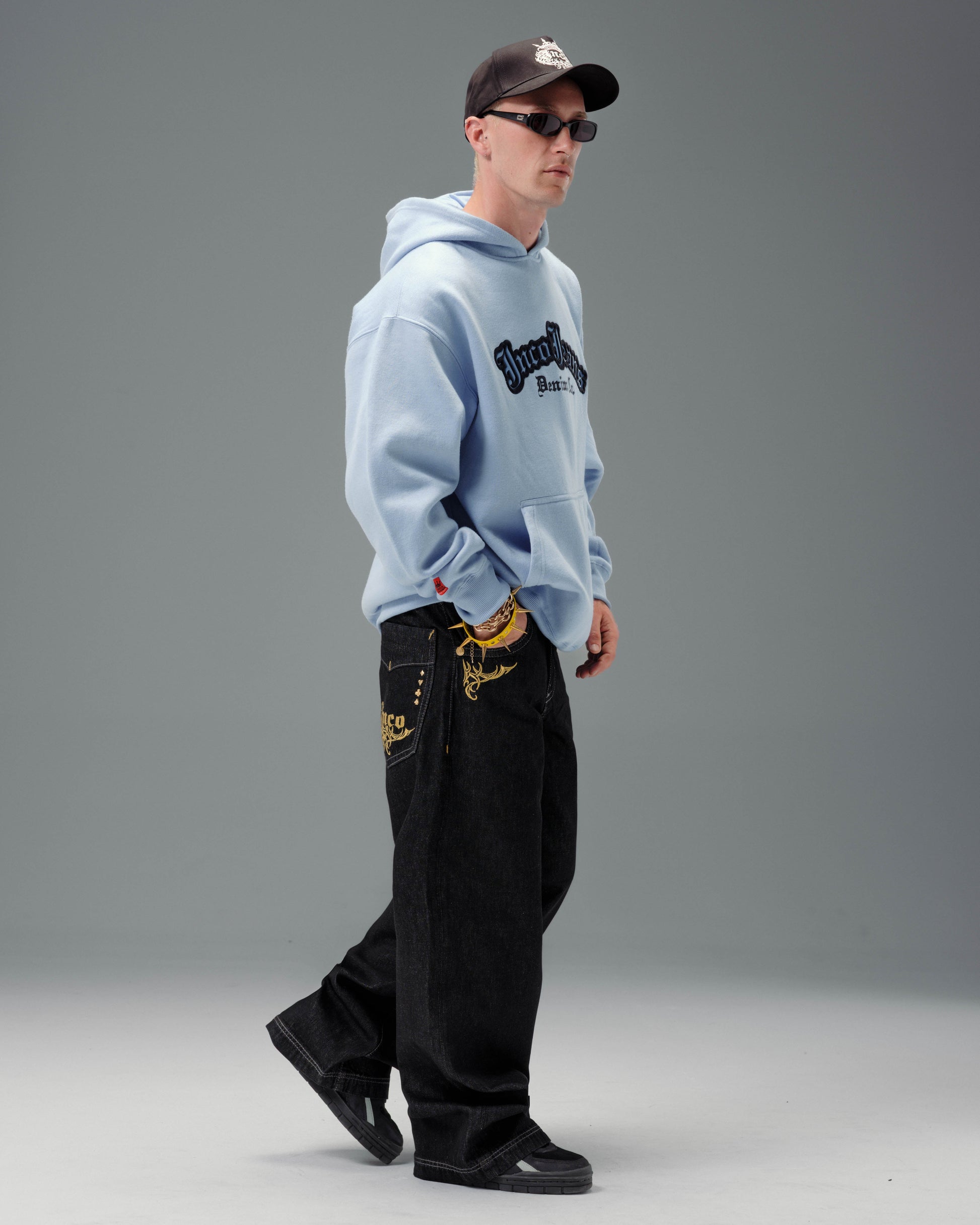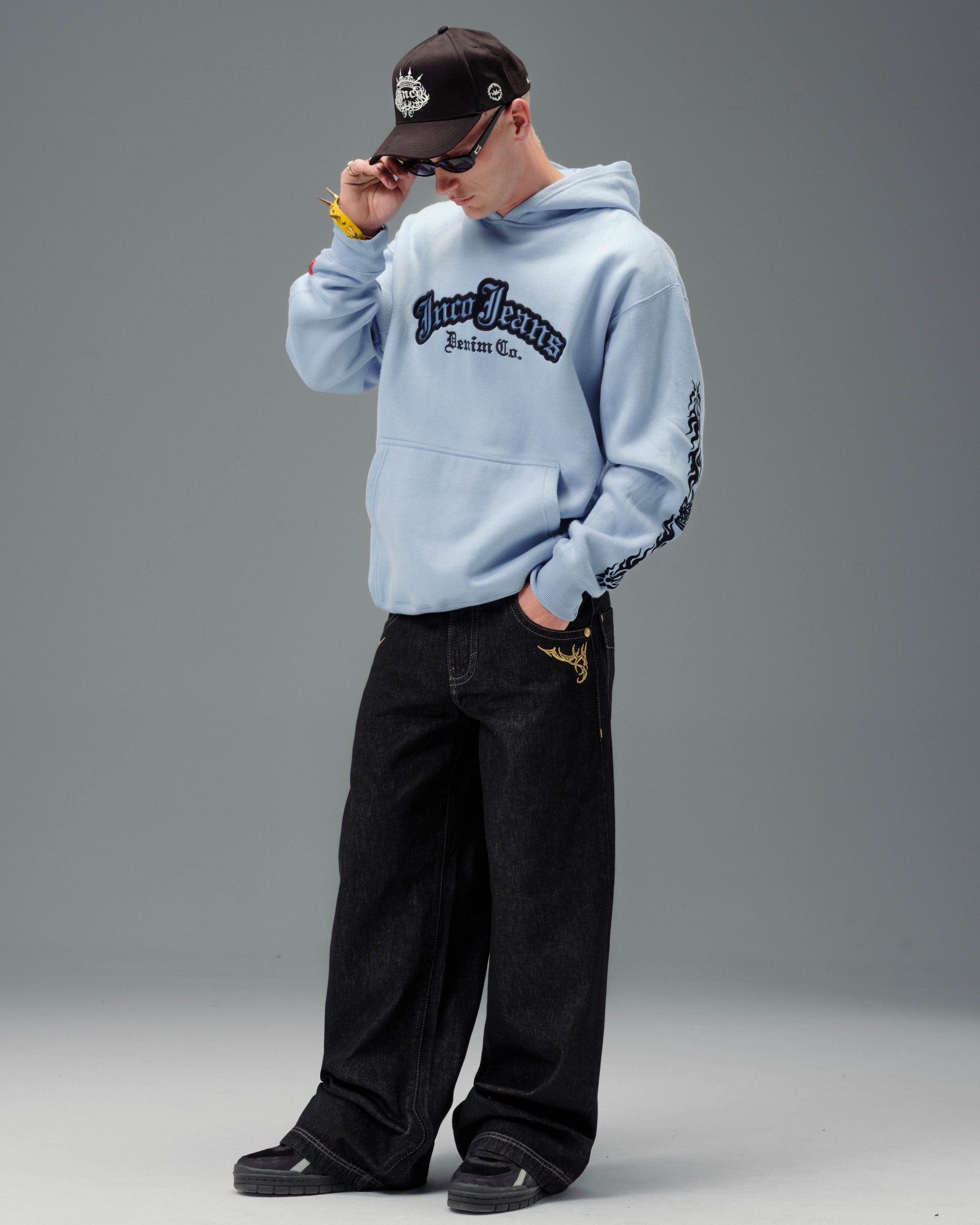 From the famous Tribal Collection. 13.5oz ring-spun denim in a rich Laser Black wash with an authentic marbled finish. 23" bottom opening with contrast stitching and a wide-leg fit. Features Celtic-inspired tribal embroidery on back pocket in antique gold metallic thread, with indigo-accented hems, front corner details, and a signature four-suit rivet. Collectible flasher included.