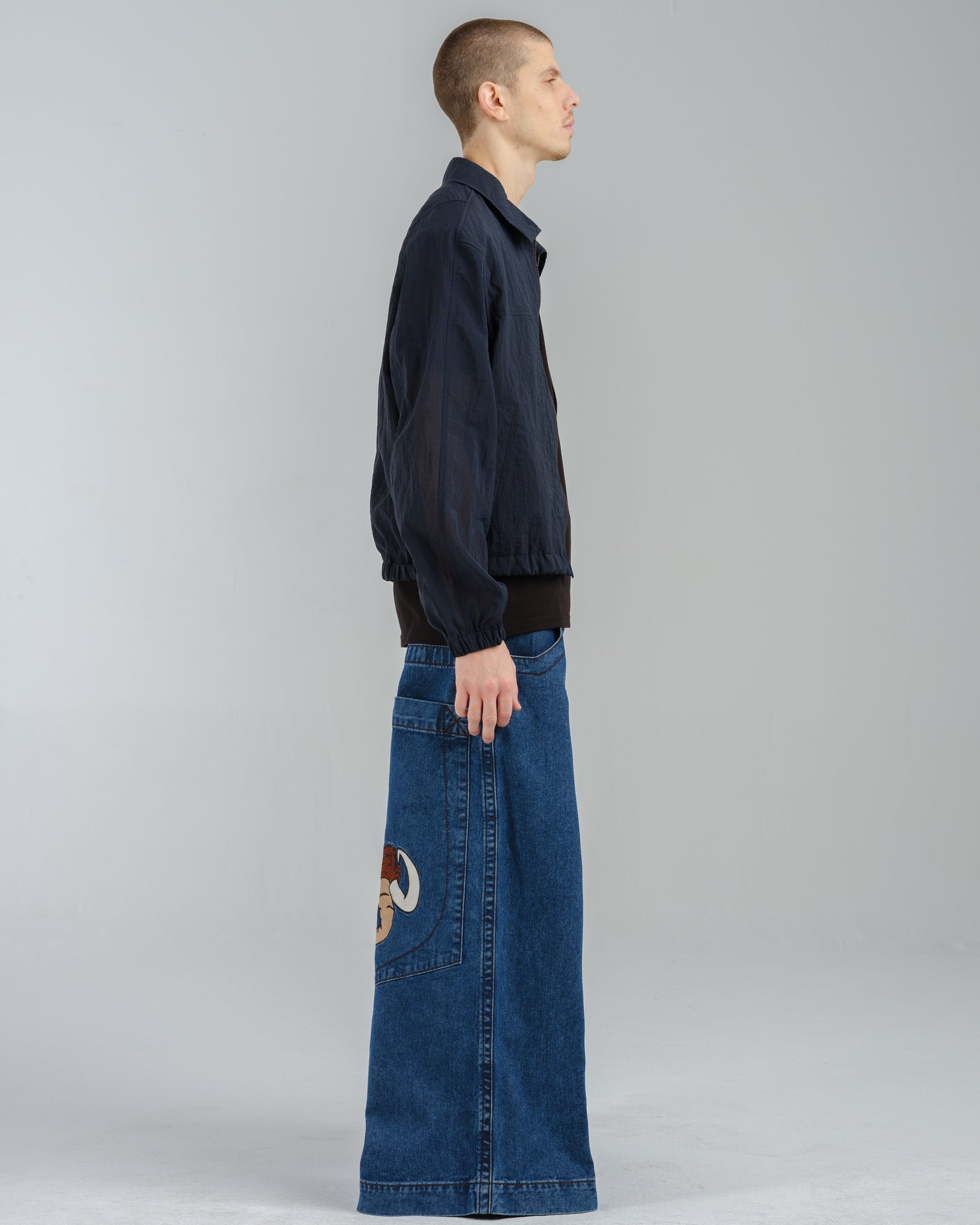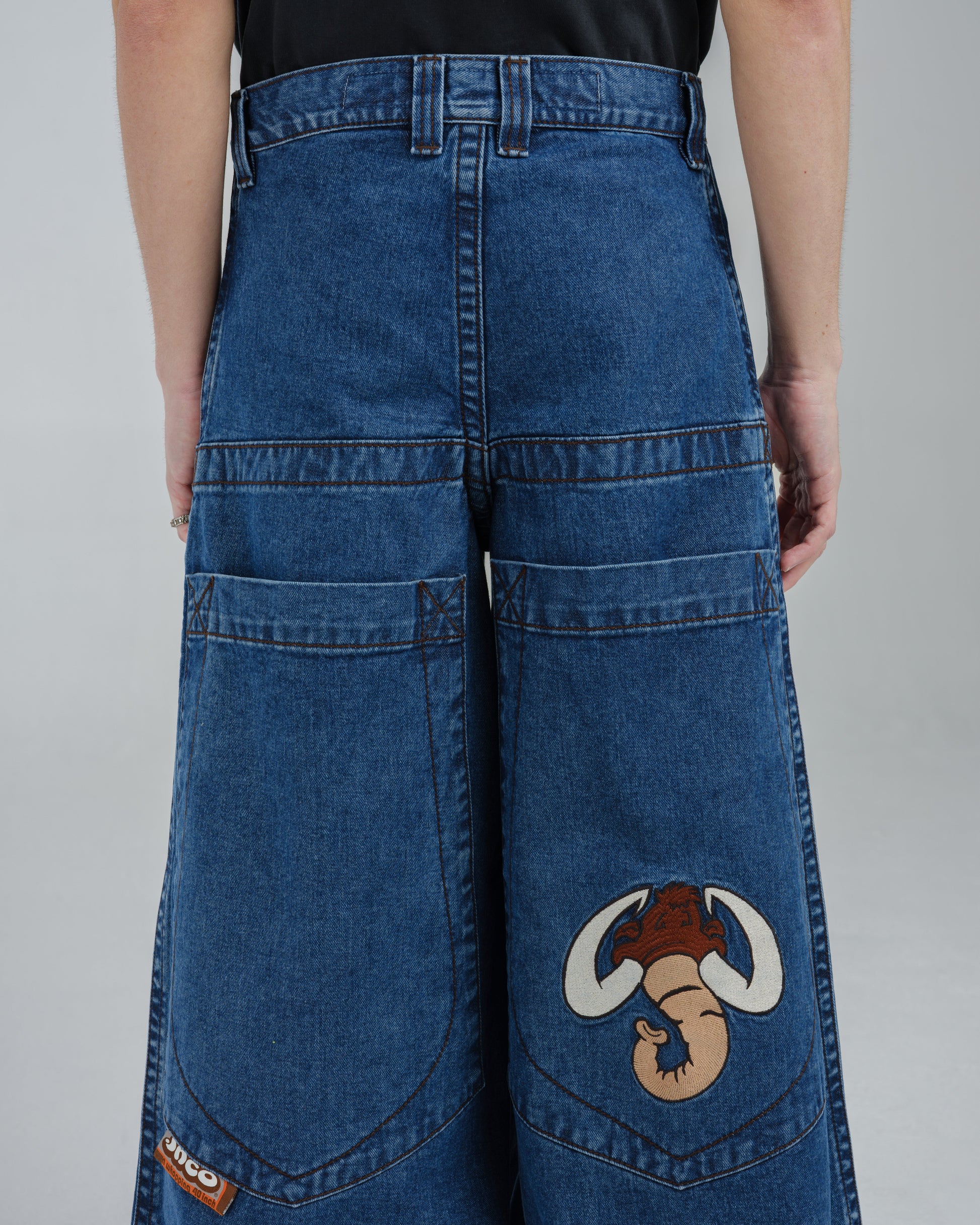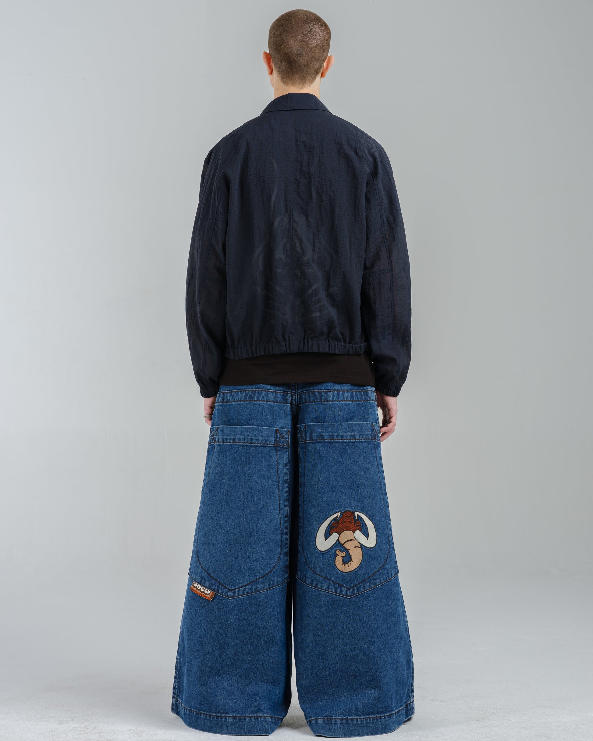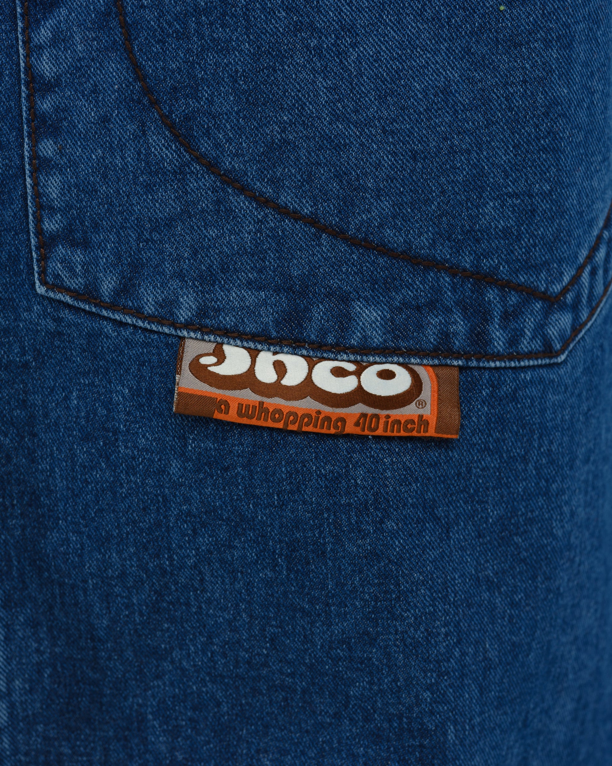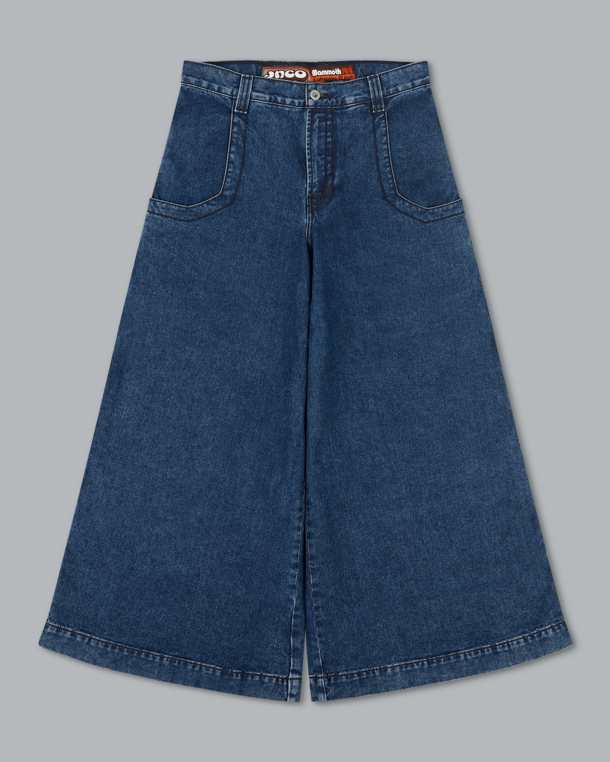 A legendary JNCO Collector classic in Dark Stone Wash denim with a massive 40" bottom opening. 14 oz. 100% cotton, 3x1 left-hand weave. Heavy contrast stitching and unique construction details. Back left pocket showcases the iconic 31,000-stitch Mammoth embroidery. Collectible Mammoth flasher attached. Limited Edition – very limited stock.