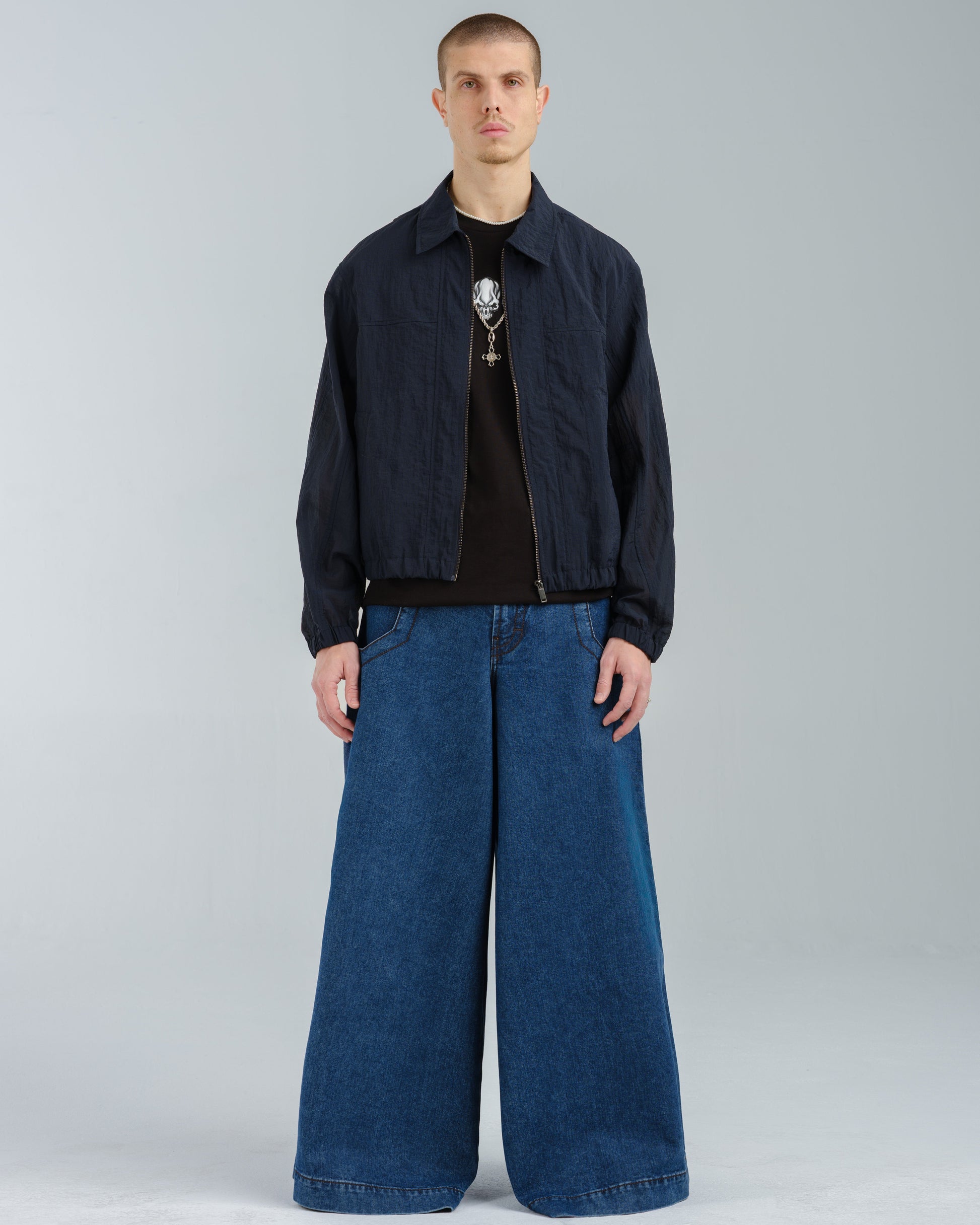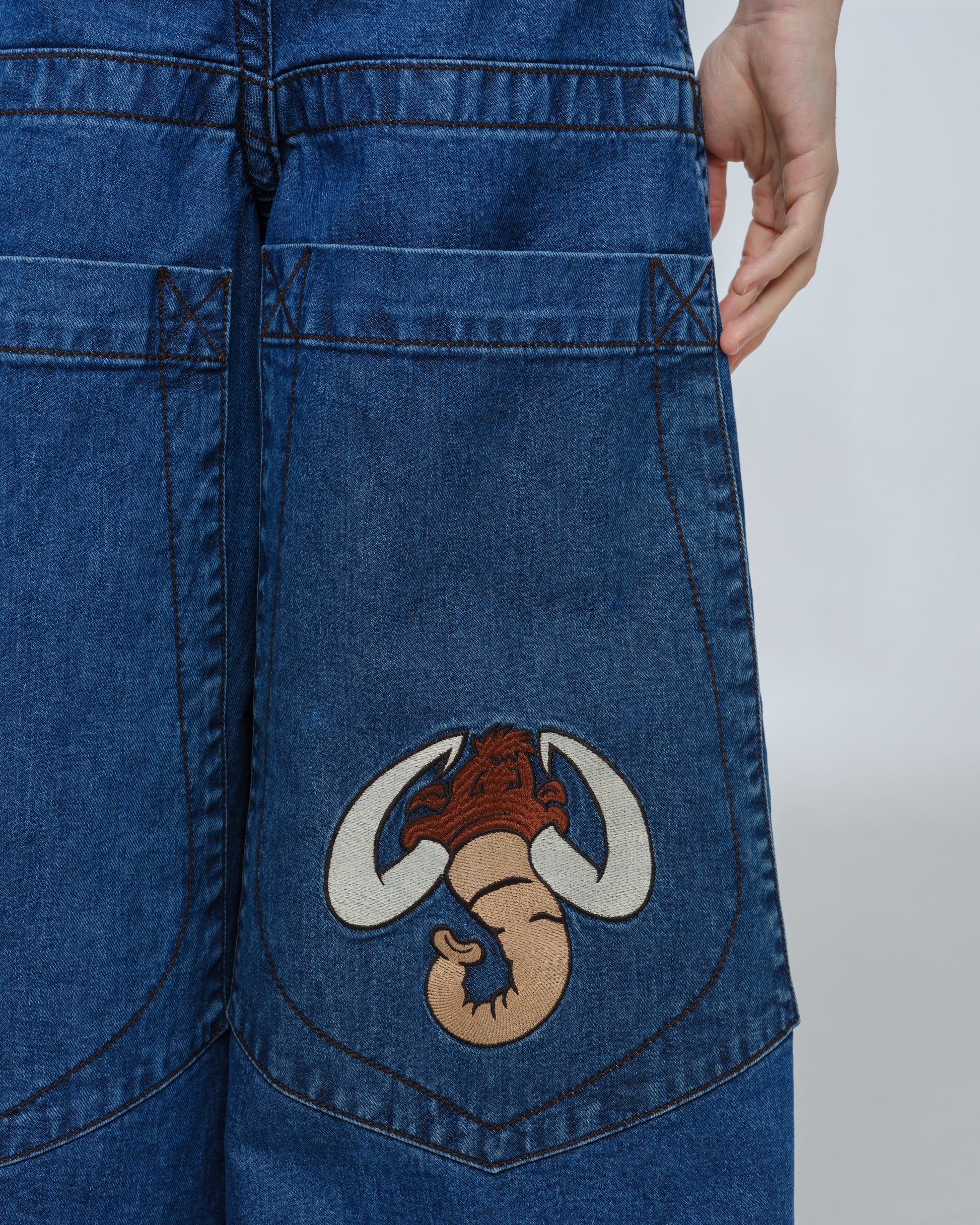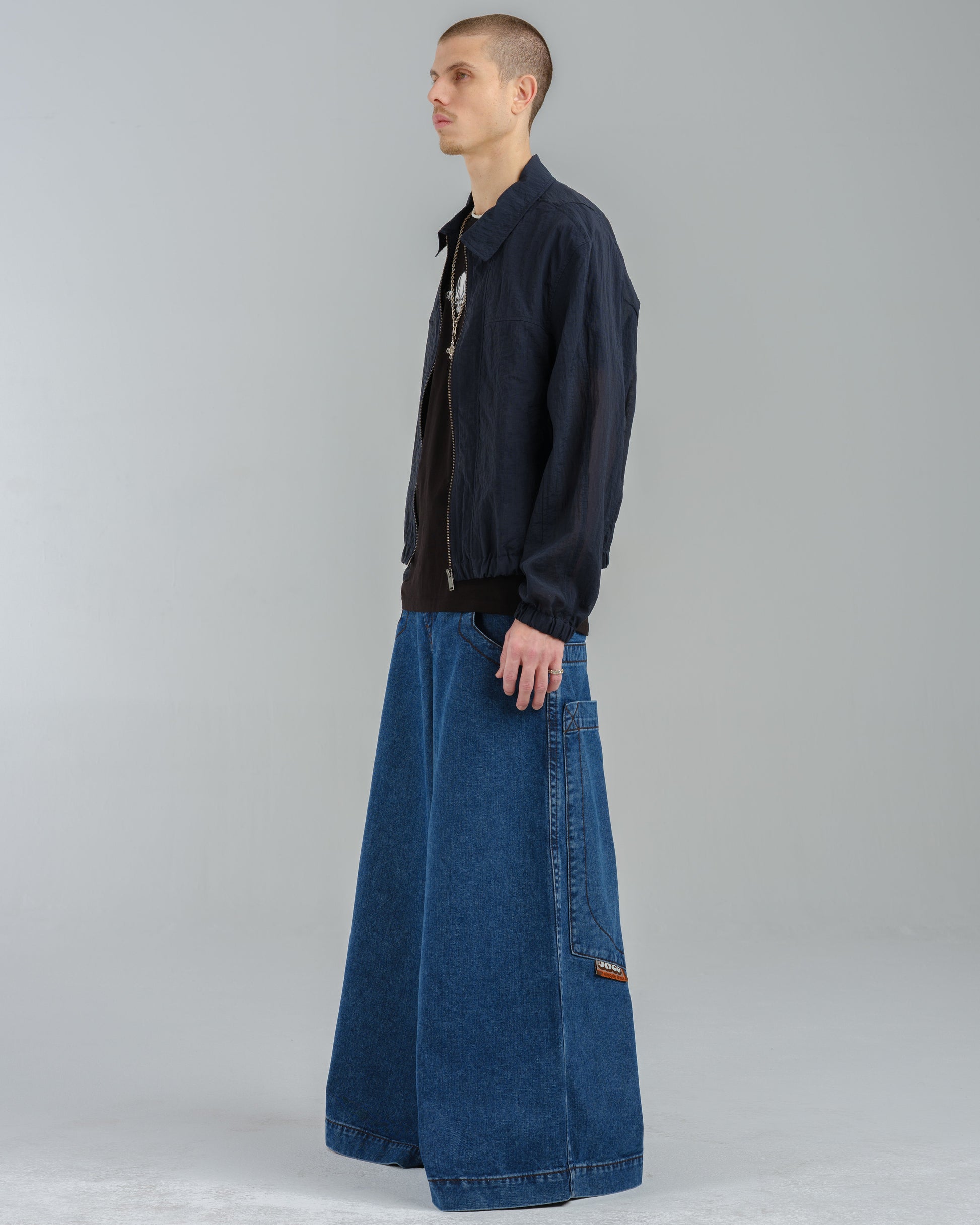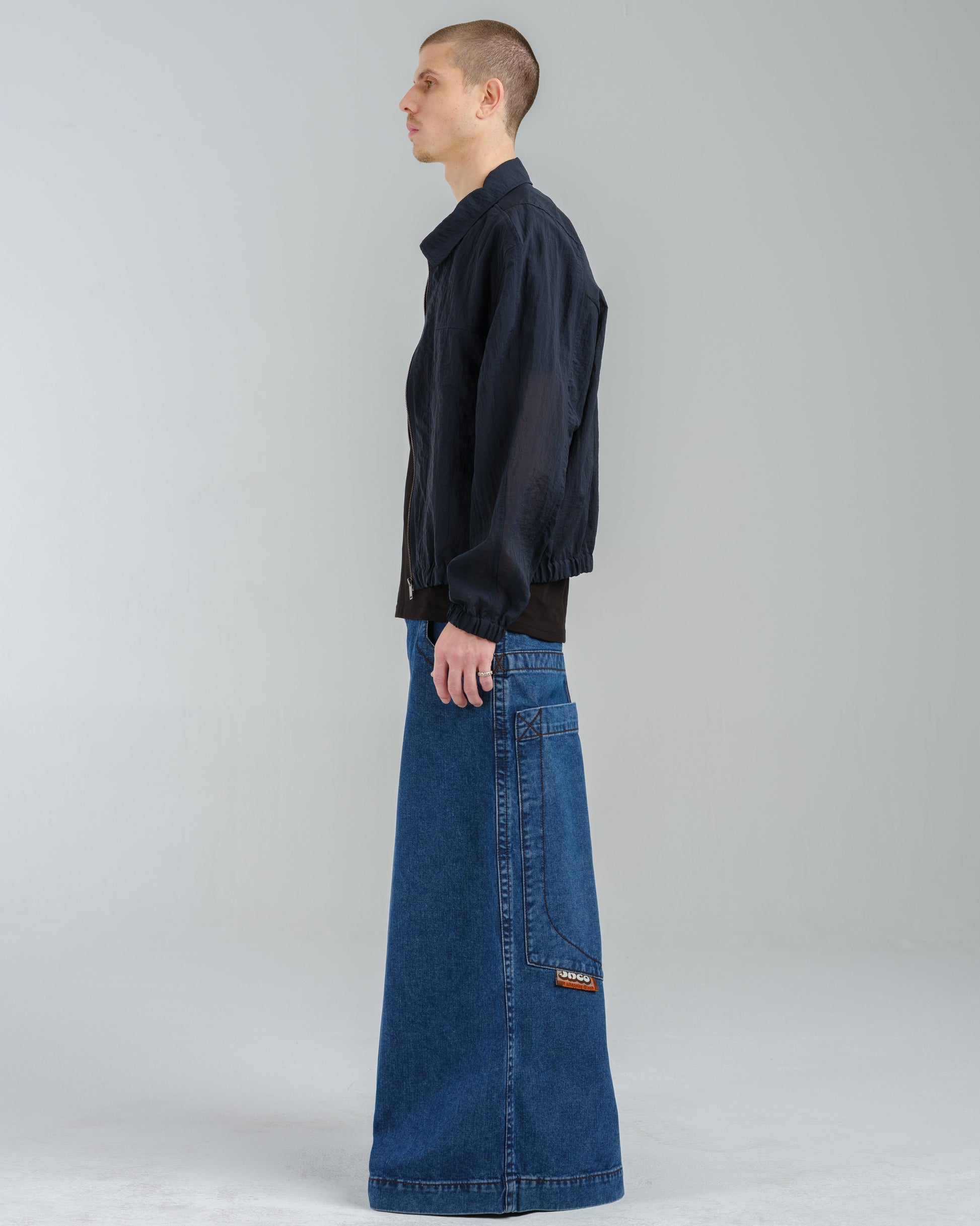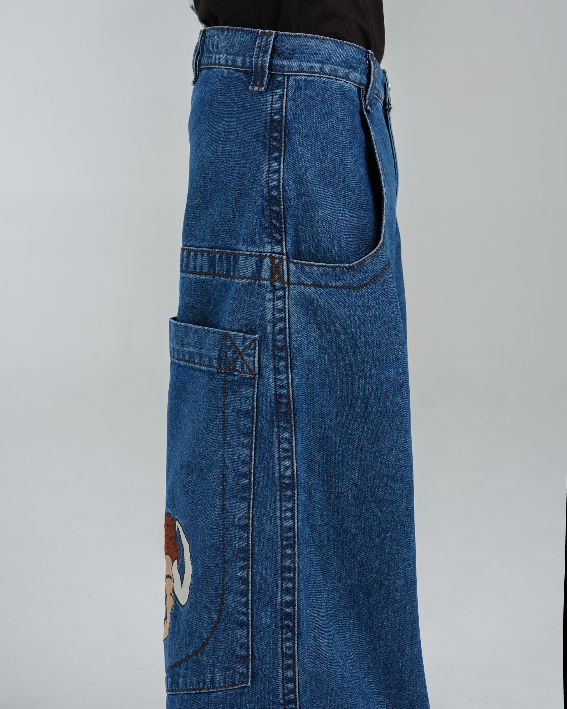 A legendary JNCO Collector classic in Dark Stone Wash denim with a massive 40" bottom opening. 14 oz. 100% cotton, 3x1 left-hand weave. Heavy contrast stitching and unique construction details. Back left pocket showcases the iconic 31,000-stitch Mammoth embroidery. Collectible Mammoth flasher attached. Limited Edition – very limited stock.
