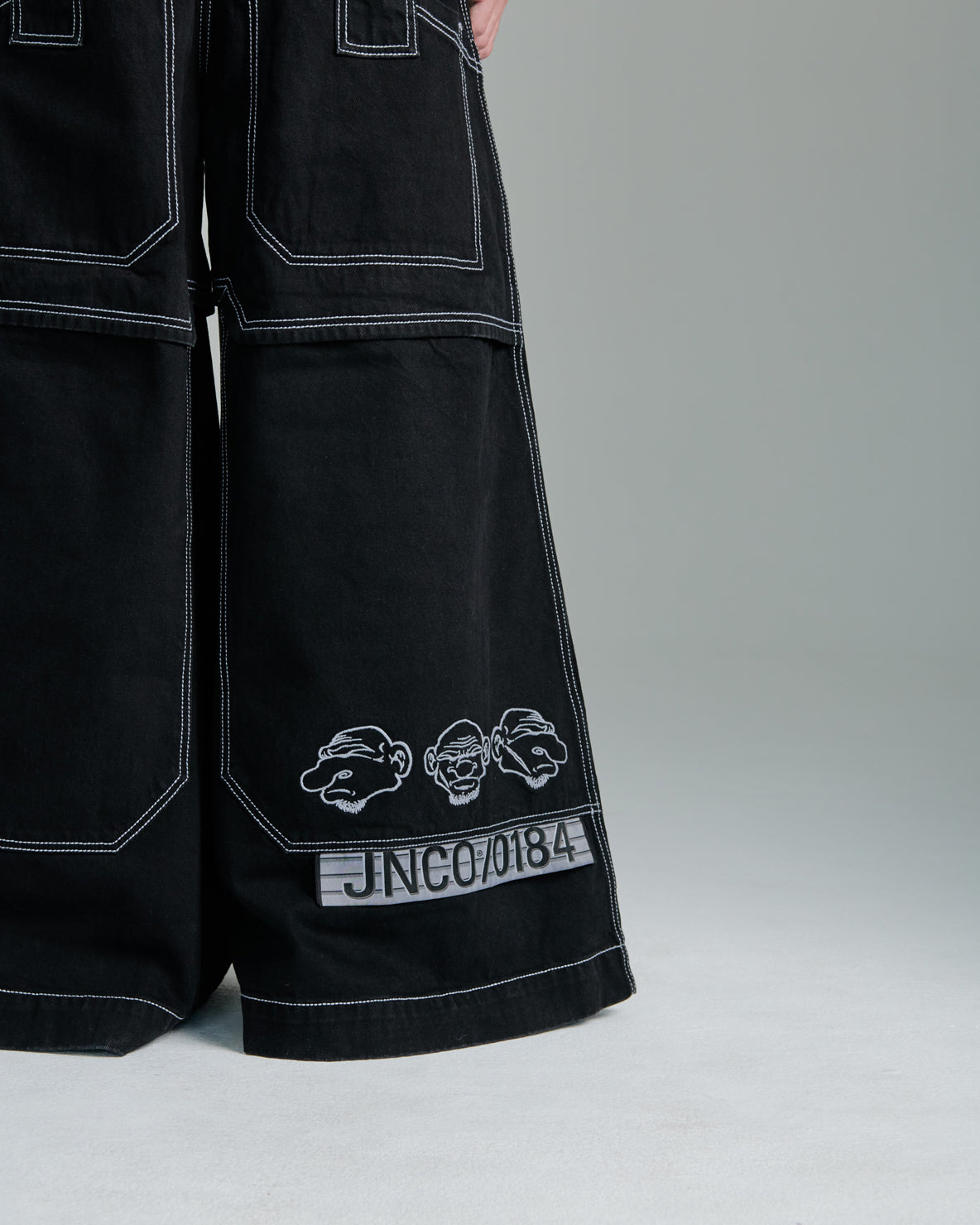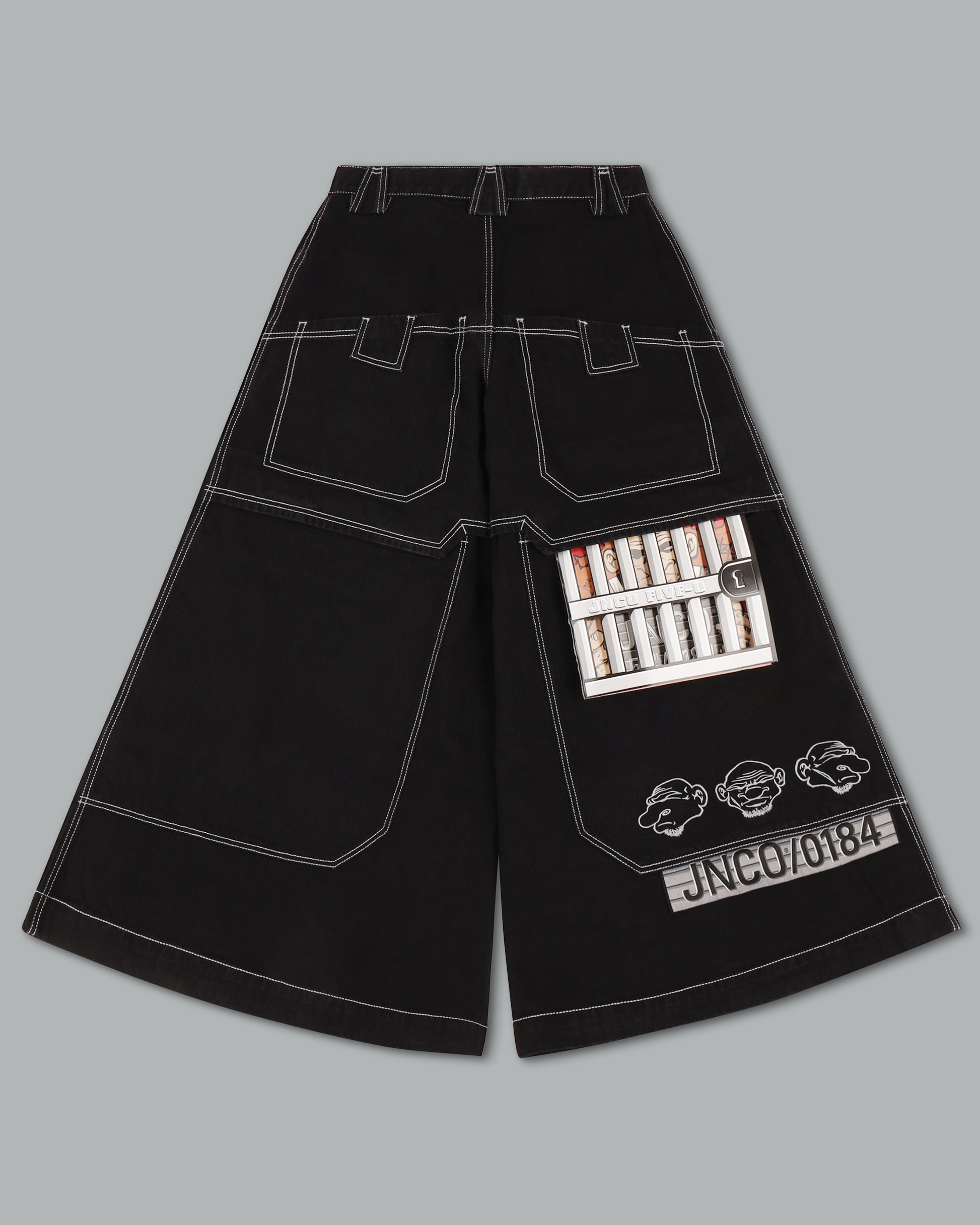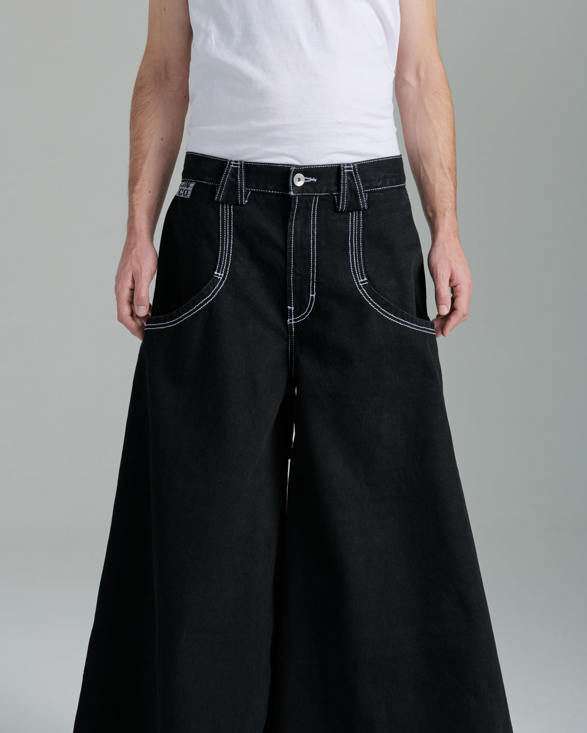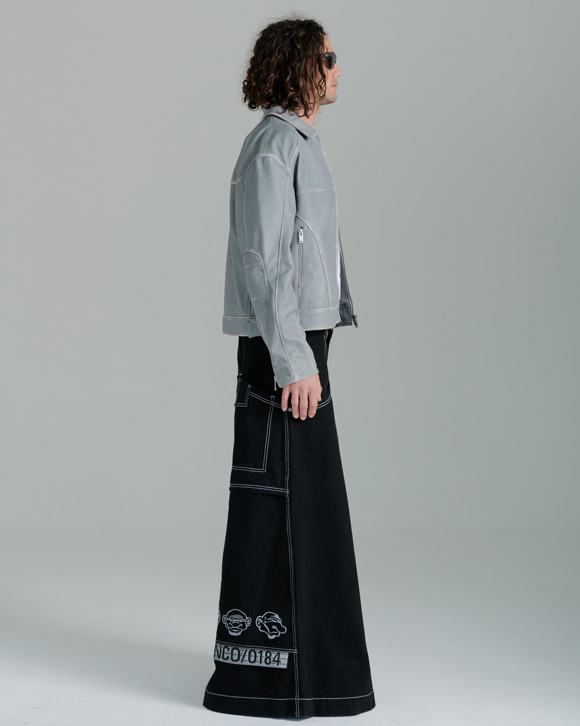 A rare icon from the FIVE-0 Series. Jet Black denim, 50" bottom opening. 13oz rope-dyed cotton with a waxed finish. Features the Mugshot embroidery, heavy contrast stitching, extra-long pocket, and wide belt loops. All original labels and collectible double-sided flasher attached. Limited Edition – very Limited Stock.