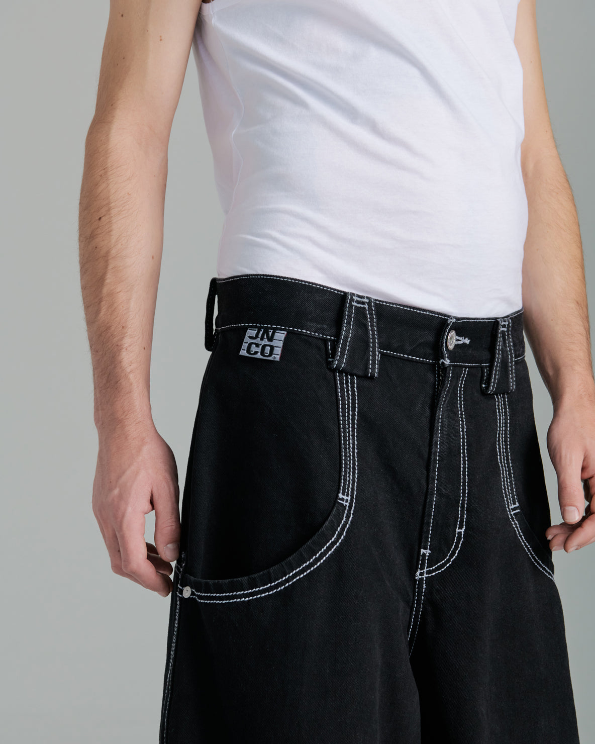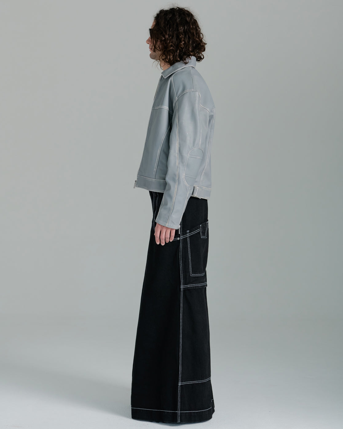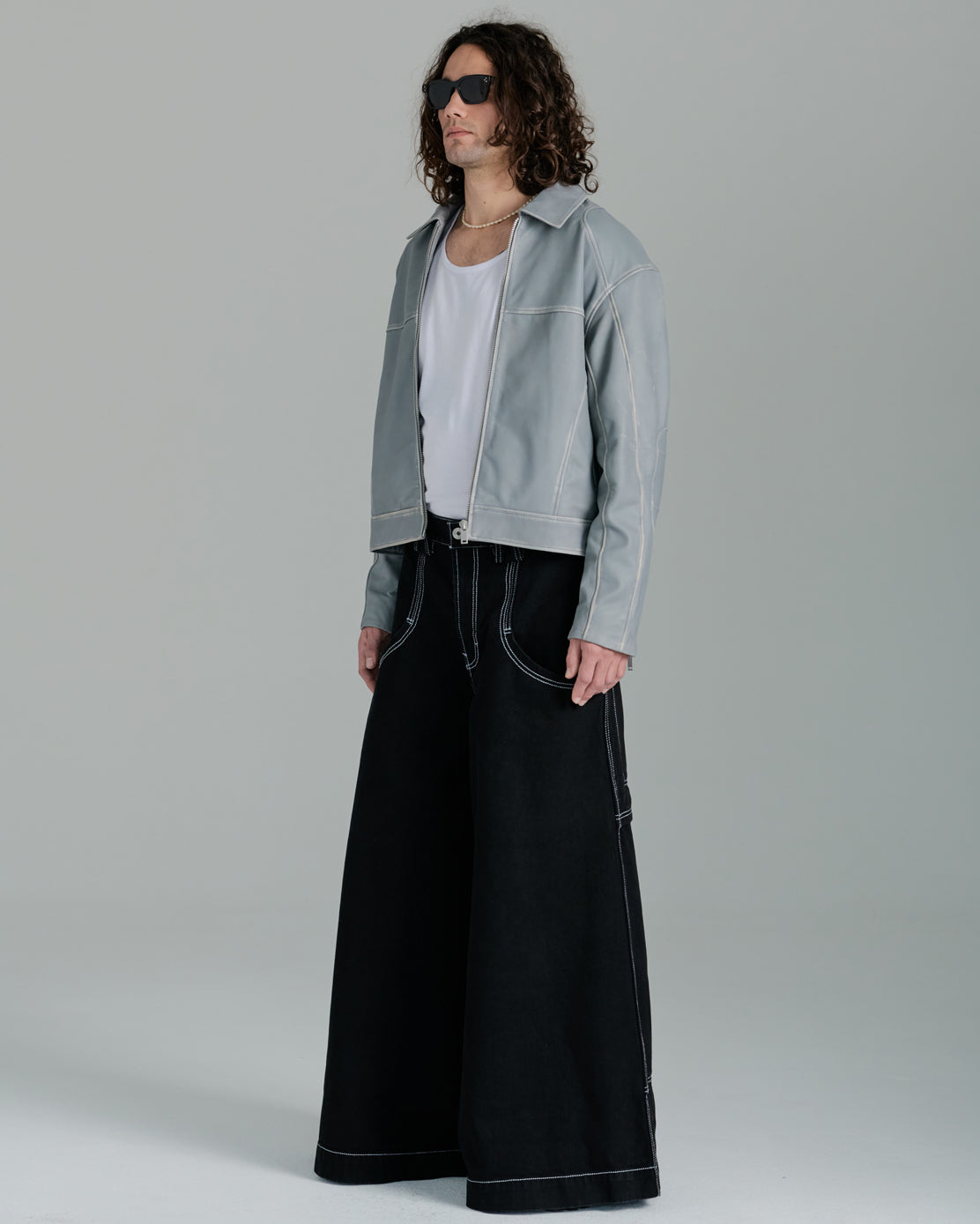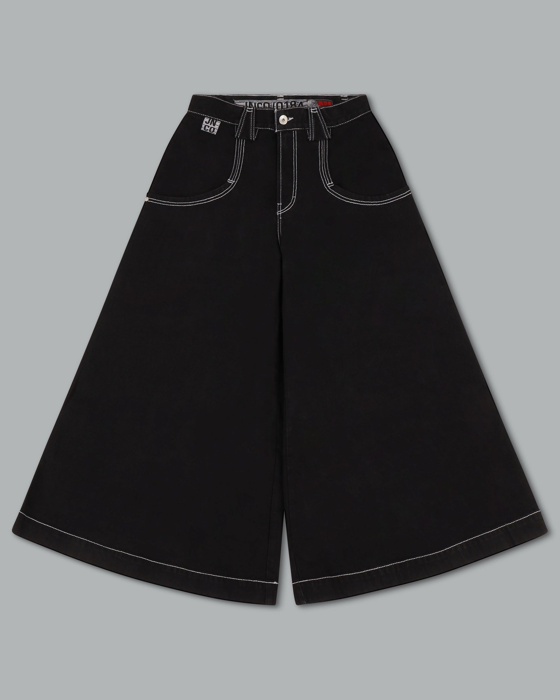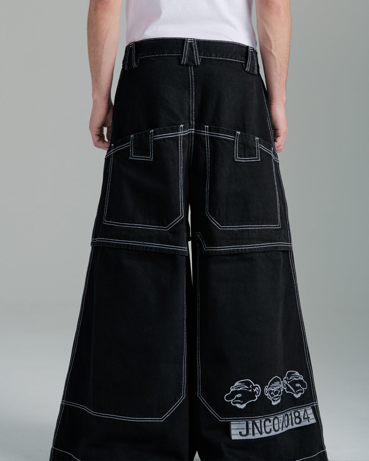 A rare icon from the FIVE-0 Series. Jet Black denim, 50" bottom opening. 13oz rope-dyed cotton with a waxed finish. Features the Mugshot embroidery, heavy contrast stitching, extra-long pocket, and wide belt loops. All original labels and collectible double-sided flasher attached. Limited Edition – very Limited Stock.