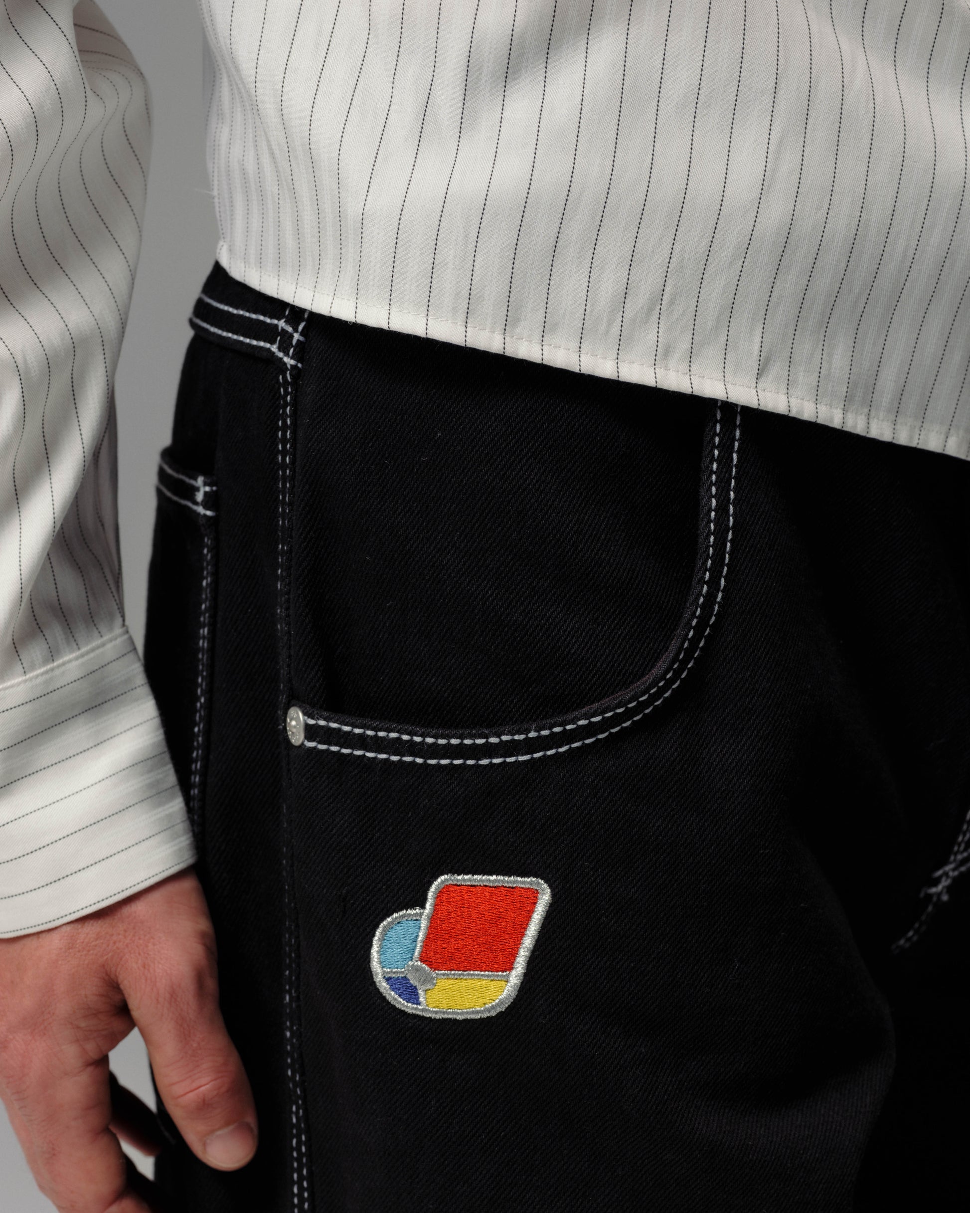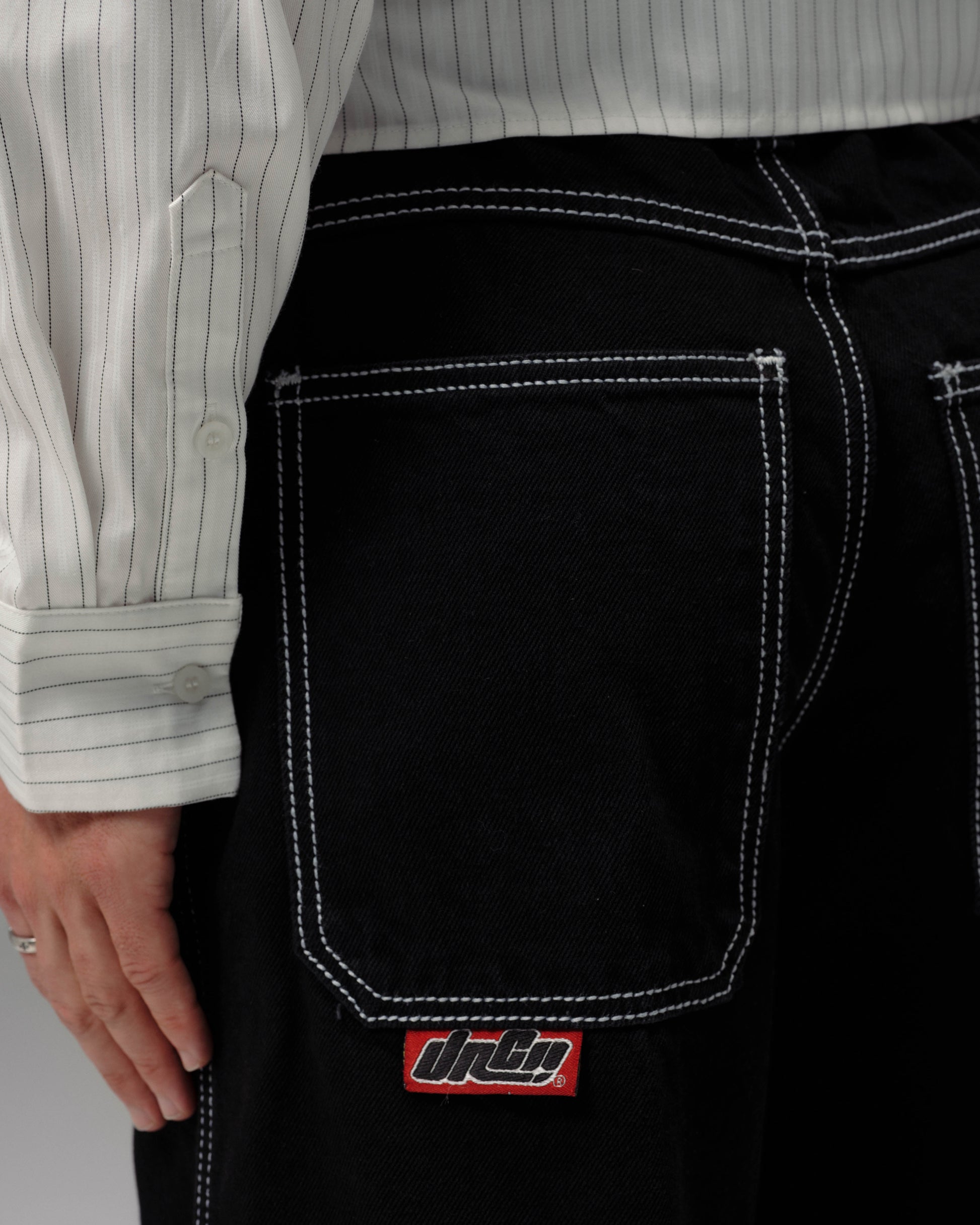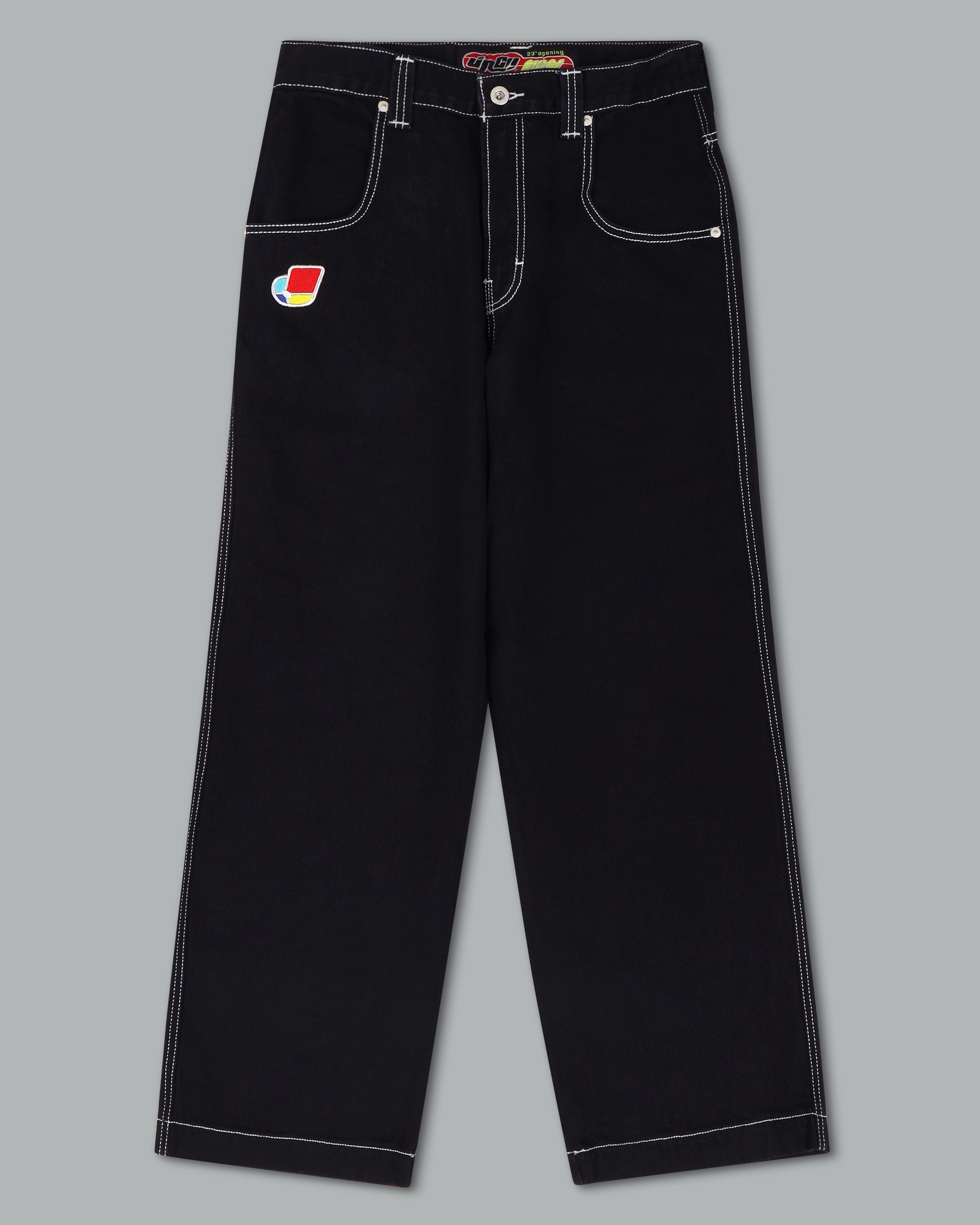 JNCO Classic in Original Jet Black Denim. 23" bottom opening with original artwork, labels, and front right pocket embroidery. 13oz 100% cotton rope-dyed with luxe starch wax finish. Contrast stitching throughout. Collectible flasher attached.