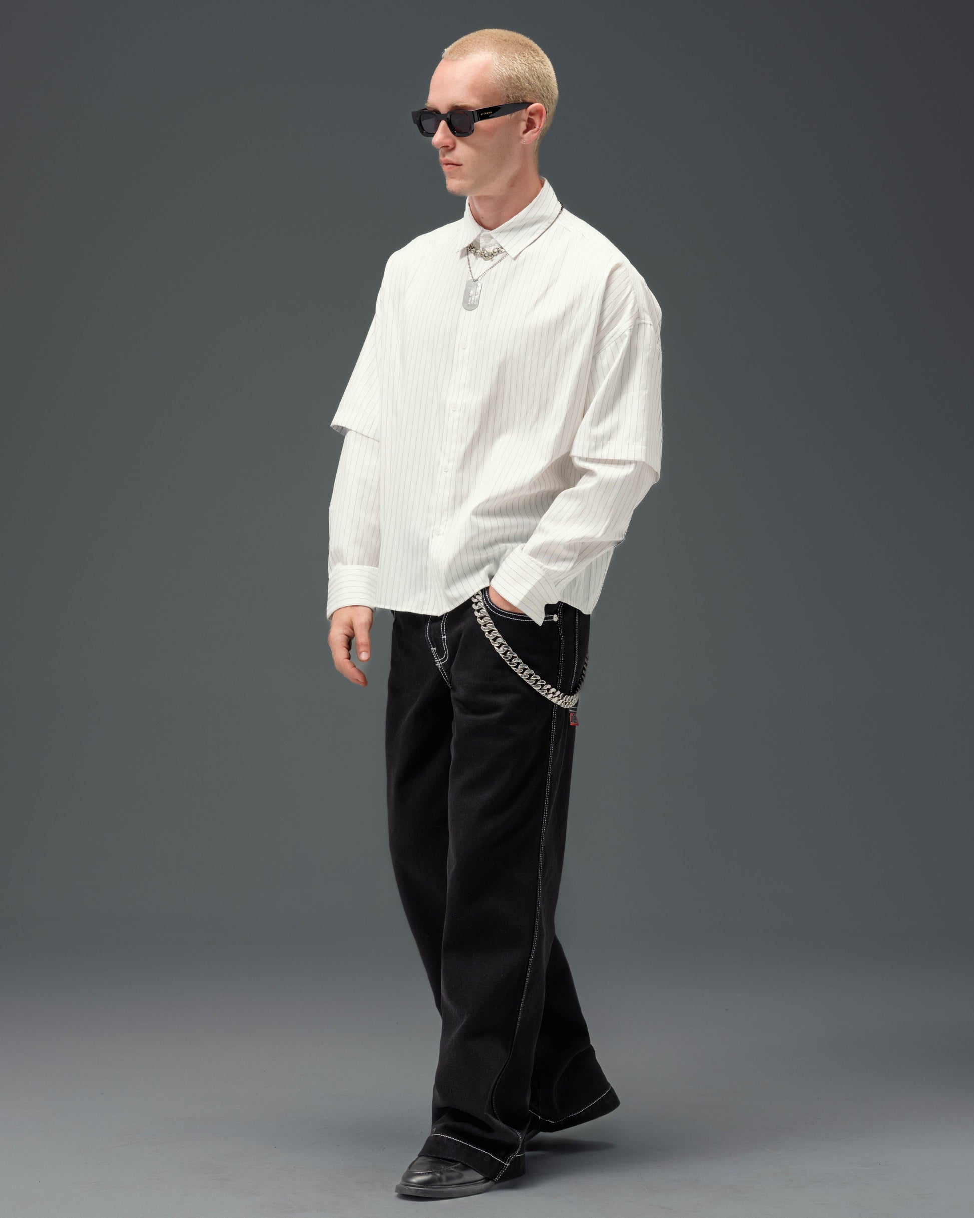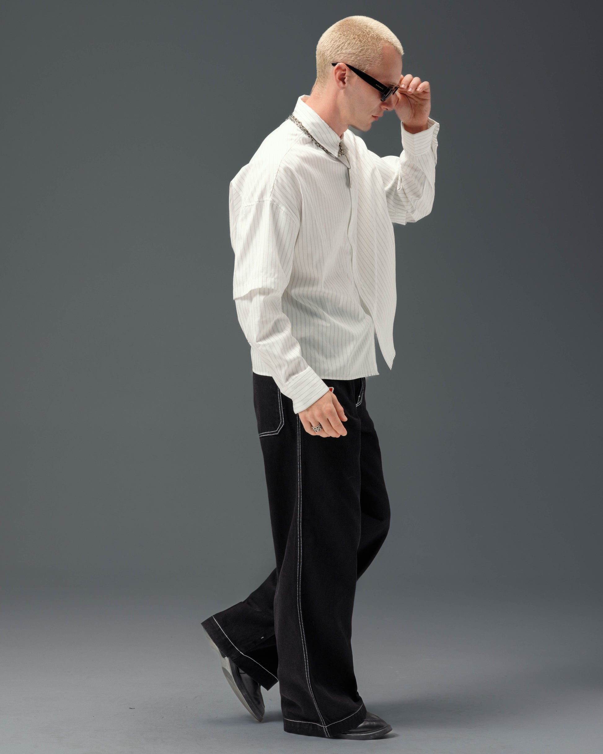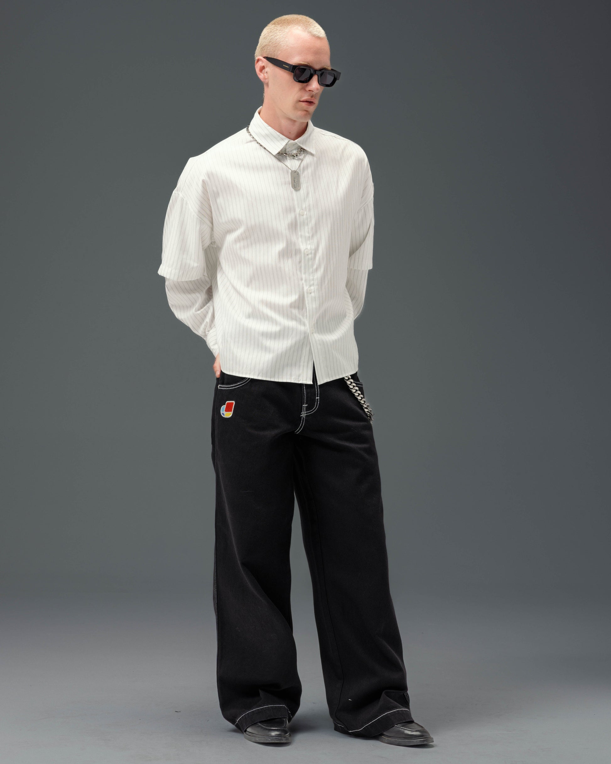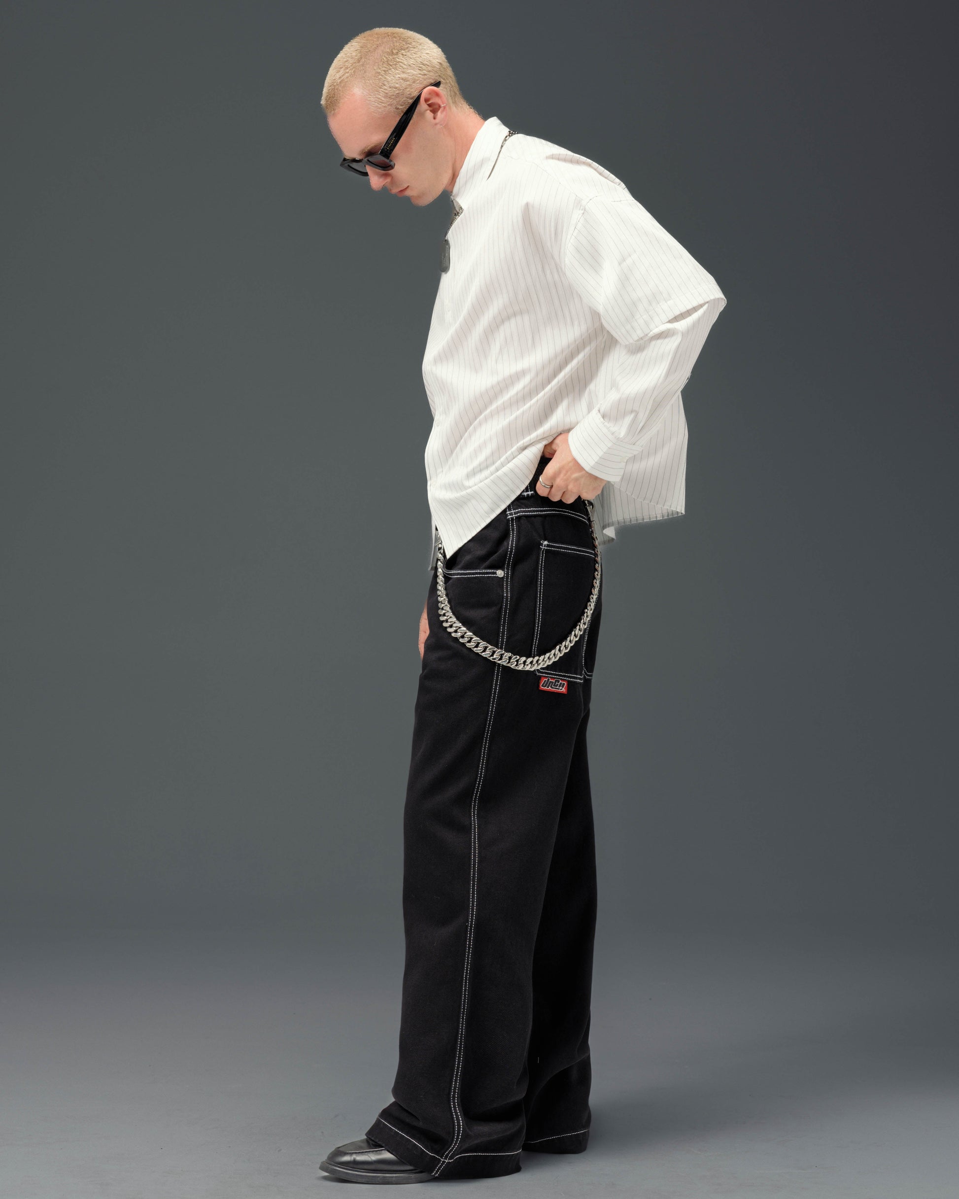 JNCO Classic in Original Jet Black Denim. 23" bottom opening with original artwork, labels, and front right pocket embroidery. 13oz 100% cotton rope-dyed with luxe starch wax finish. Contrast stitching throughout. Collectible flasher attached.