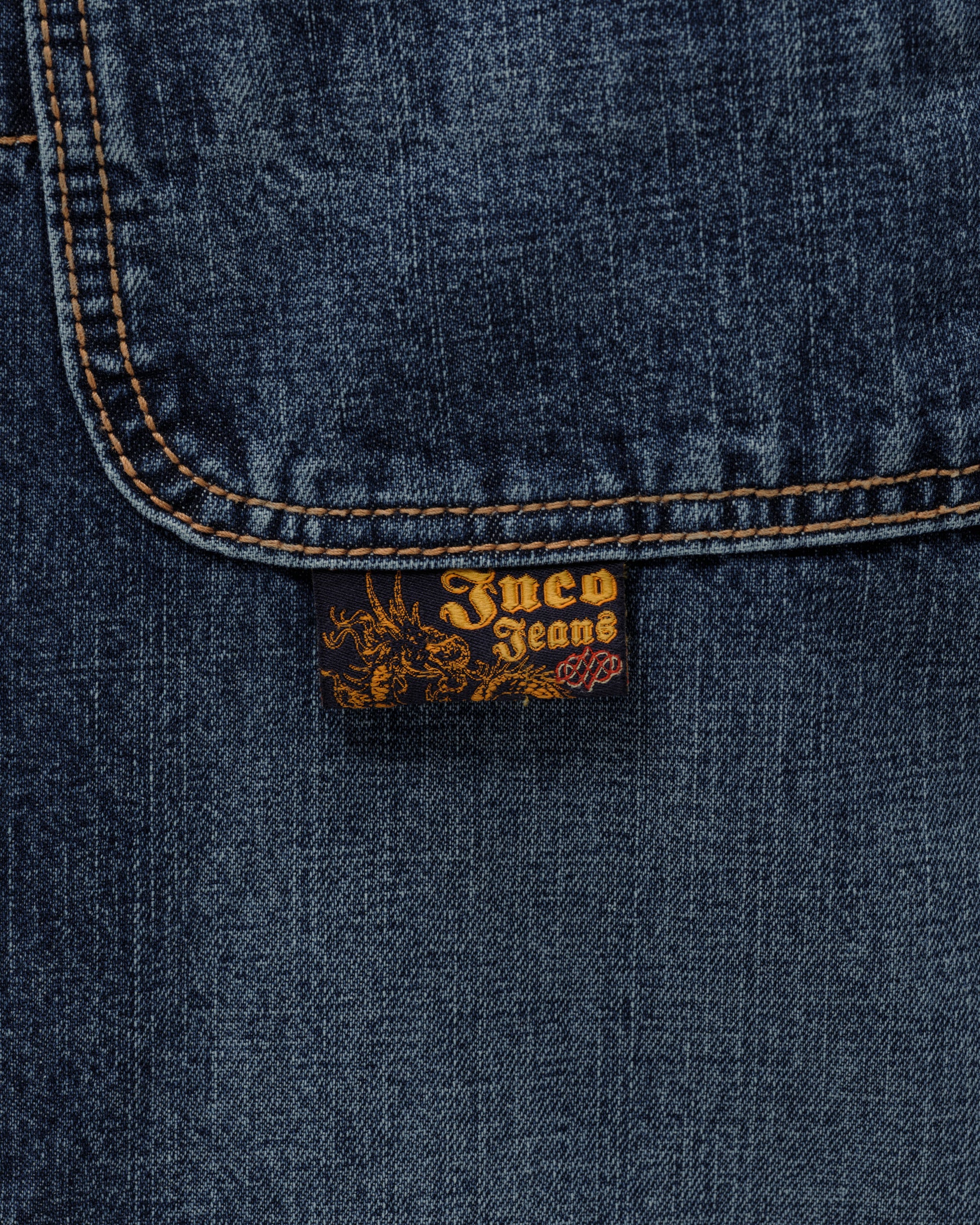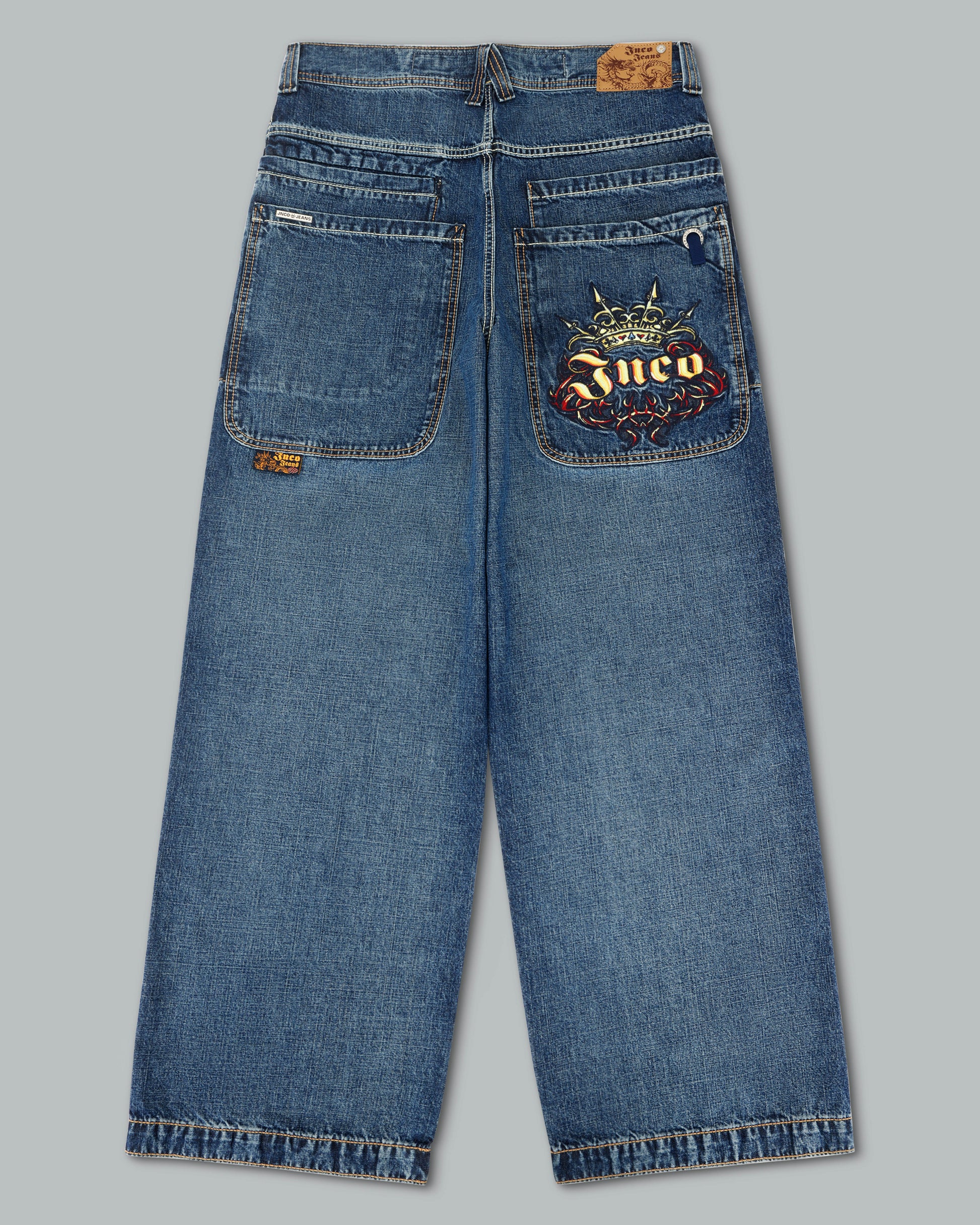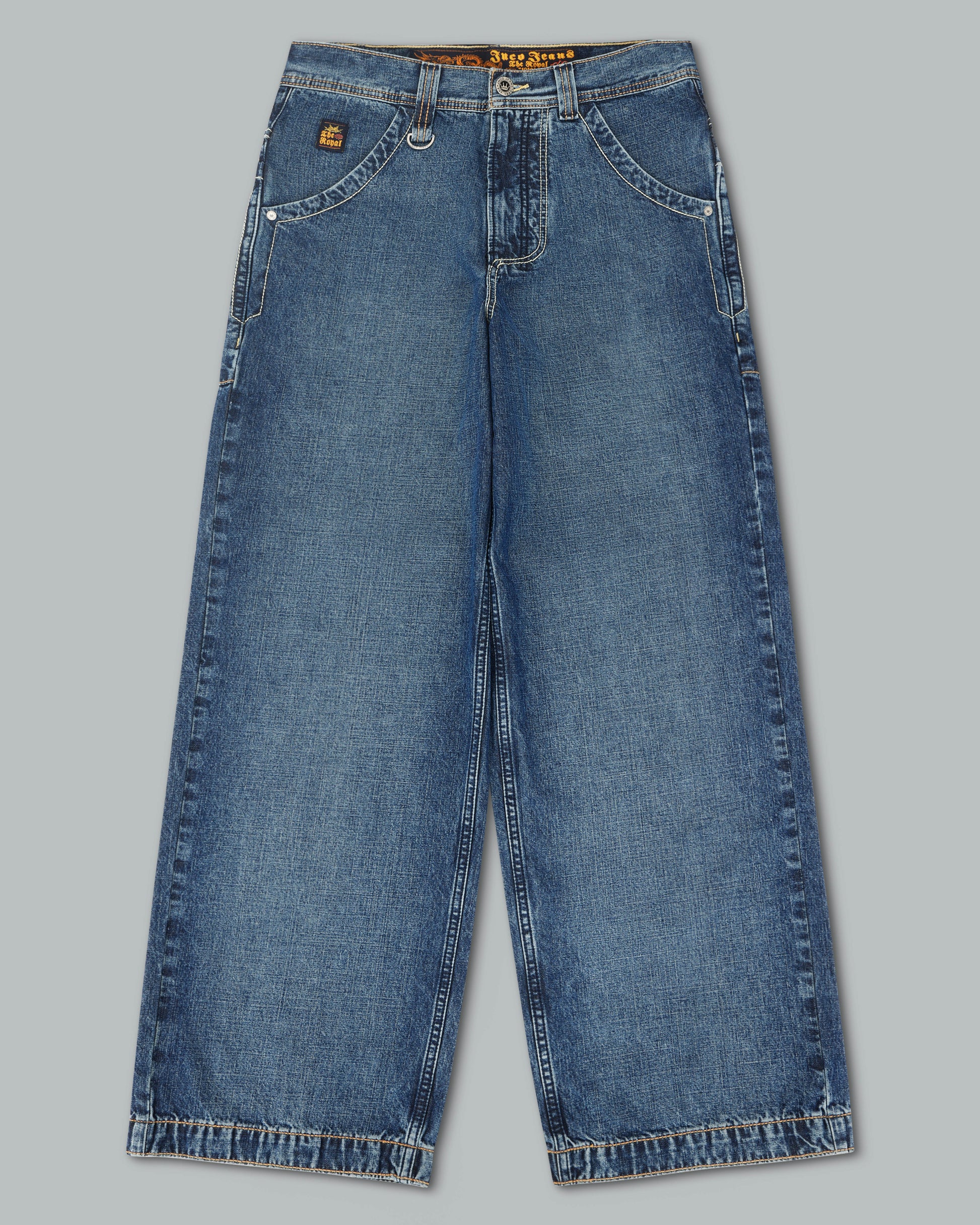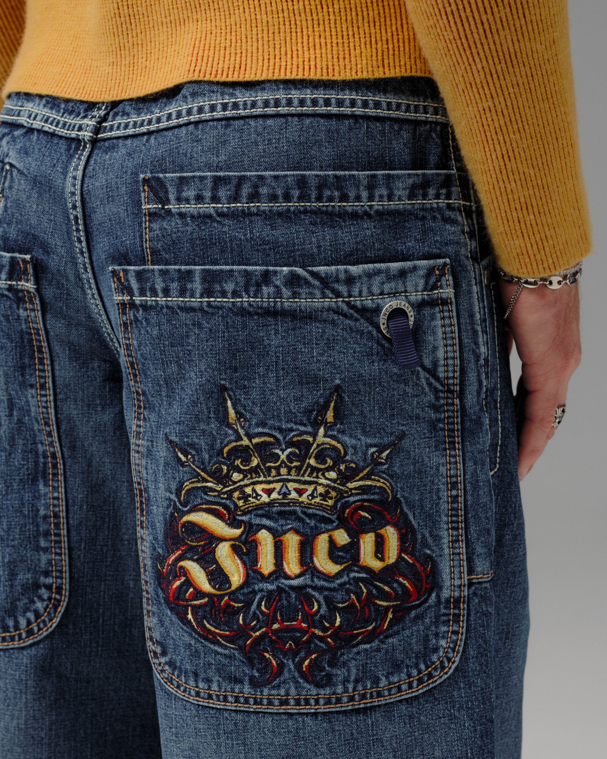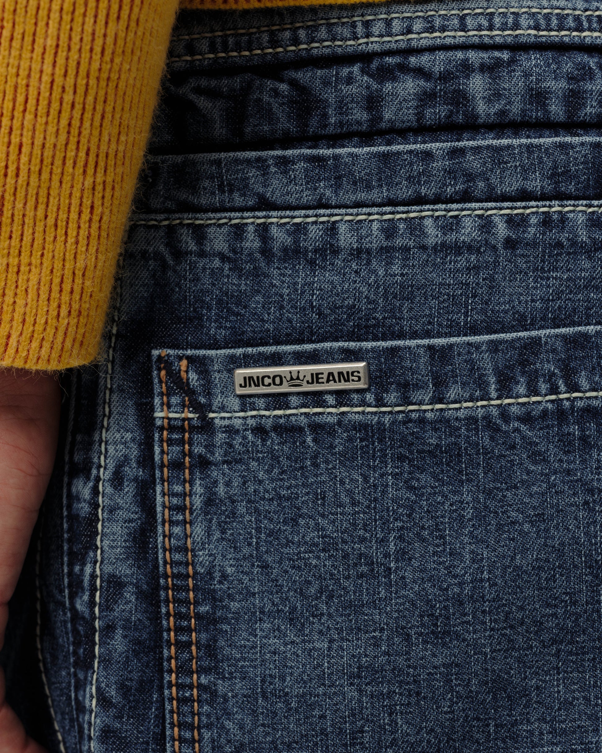 Collector’s item from JNCO’s workwear-inspired line. Hand-Sand Medium Dark Stone Wash, 23" bottom opening. 12.5oz 100% cotton cross-hatch denim with four-thread contrast stitching. 4 back pockets, “JNCO Jeans '85” dragon patch, crown plaque, and chain loops (chain not included). Original “JNCO Royal” embroidery with 80,000 stitches. Collectible matte and gloss flasher included. Limited Edition – very limited stock.