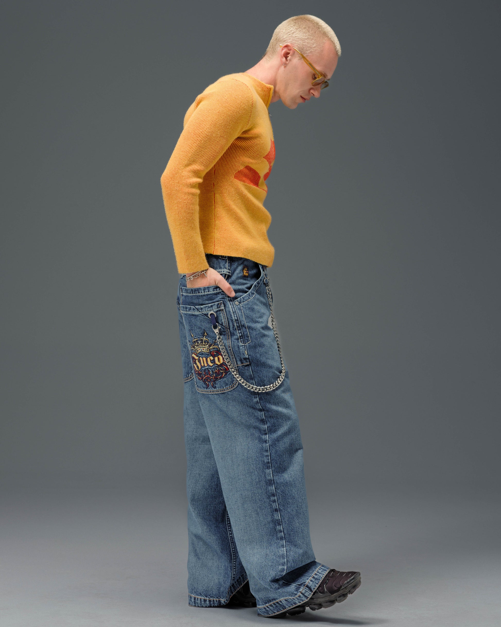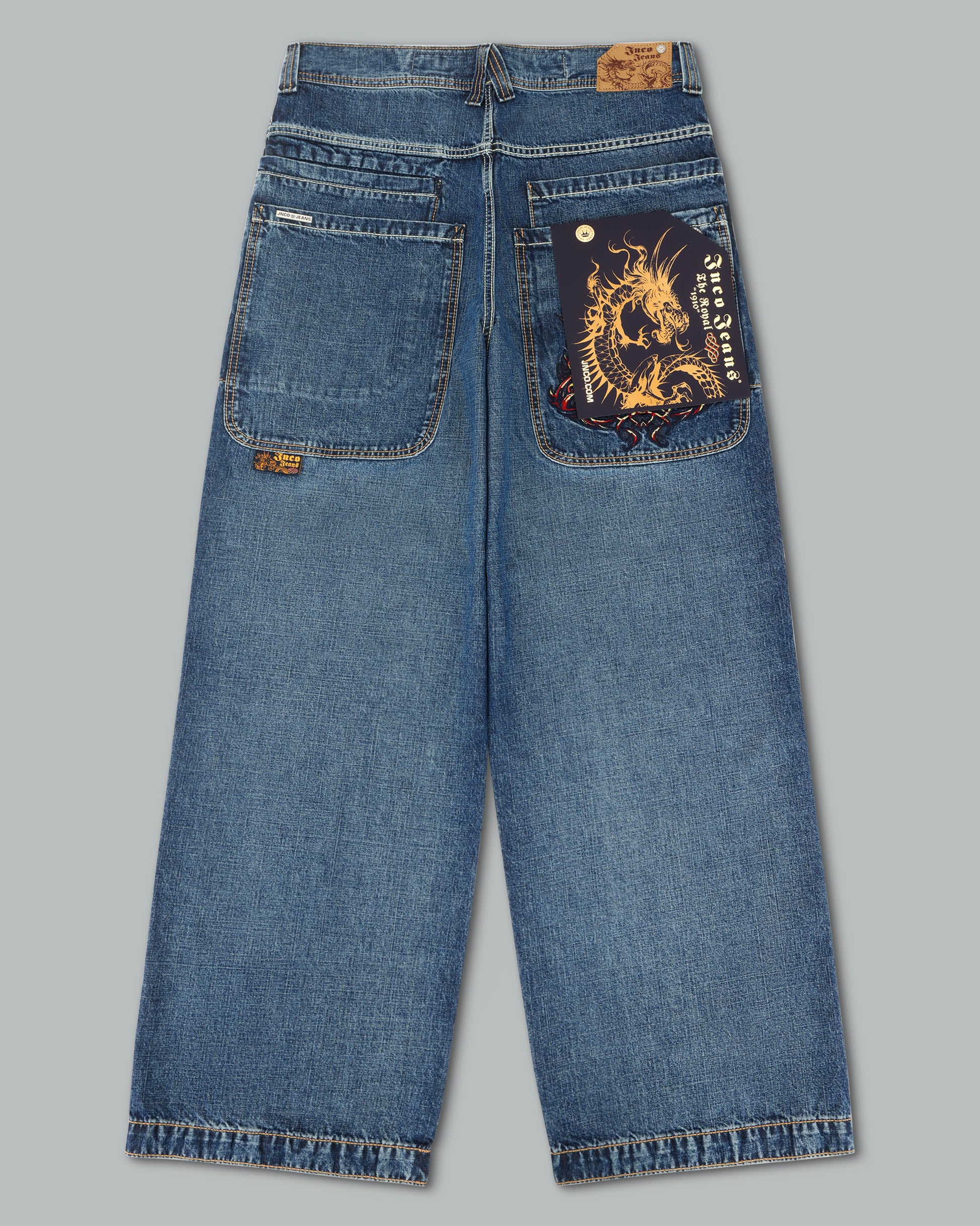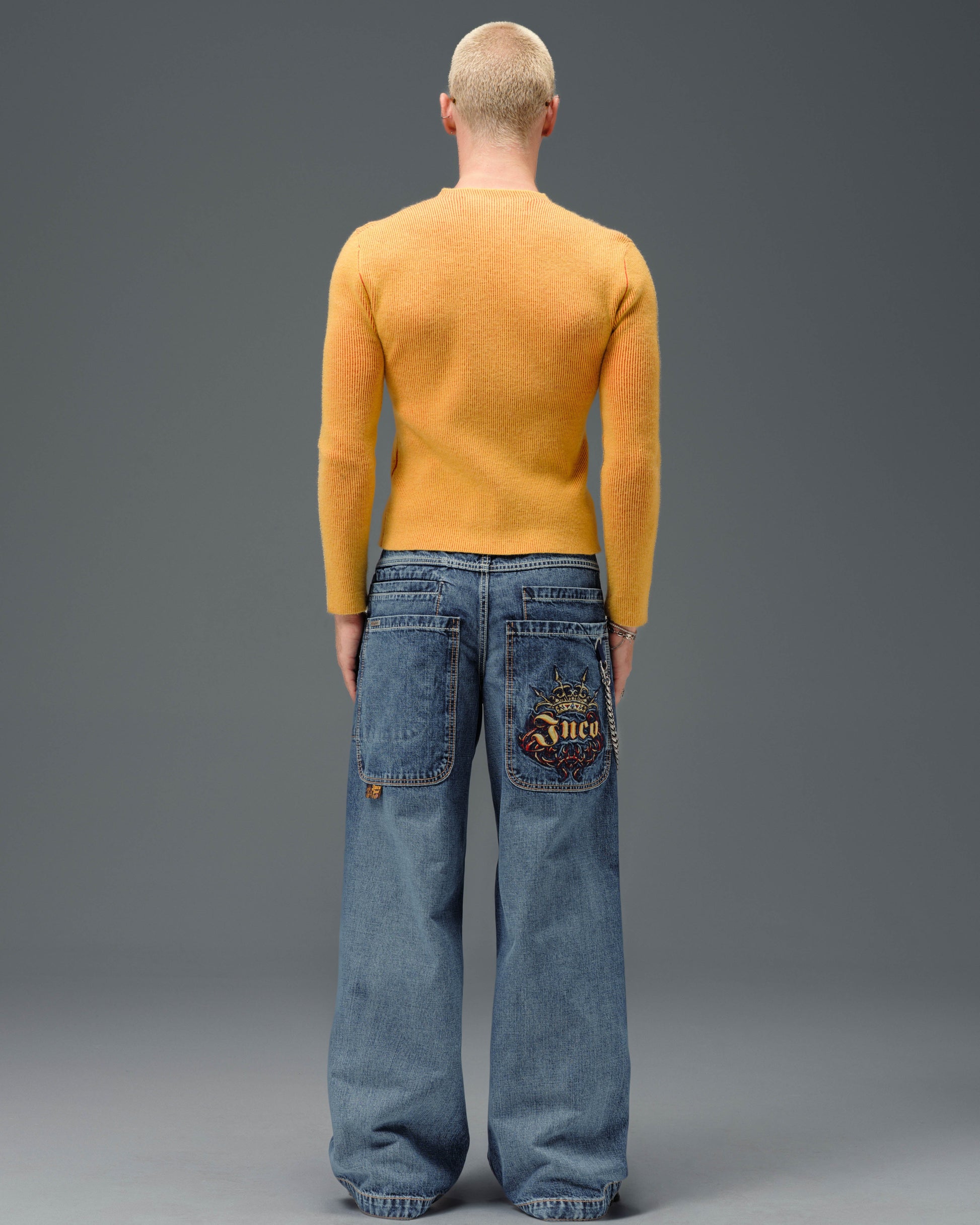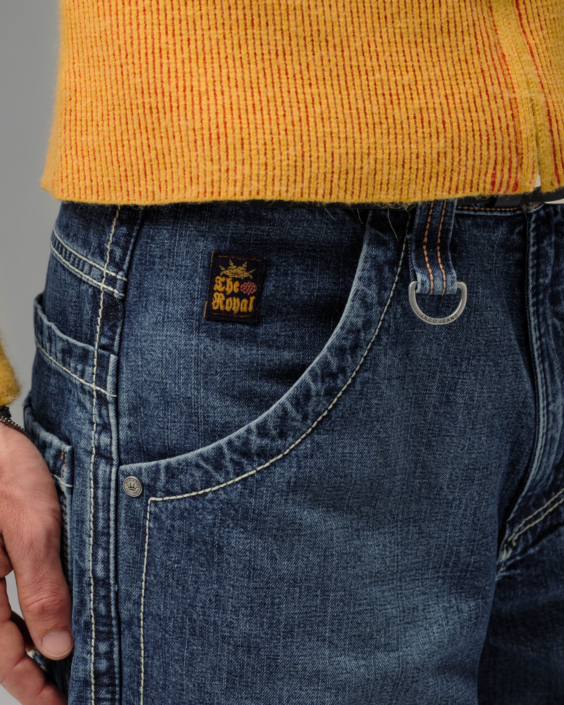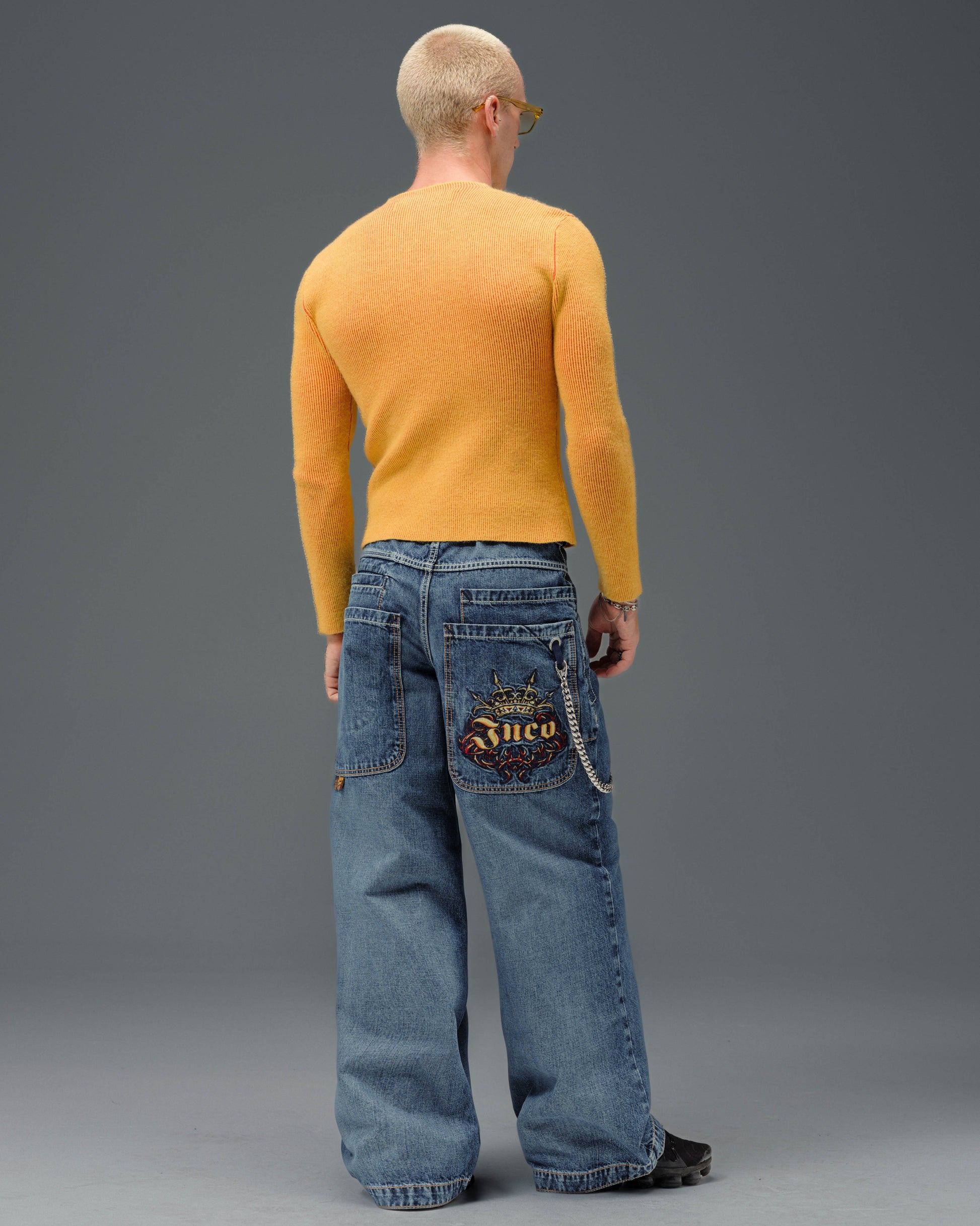 Collector’s item from JNCO’s workwear-inspired line. Hand-Sand Medium Dark Stone Wash, 23" bottom opening. 12.5oz 100% cotton cross-hatch denim with four-thread contrast stitching. 4 back pockets, “JNCO Jeans '85” dragon patch, crown plaque, and chain loops (chain not included). Original “JNCO Royal” embroidery with 80,000 stitches. Collectible matte and gloss flasher included. Limited Edition – very limited stock.