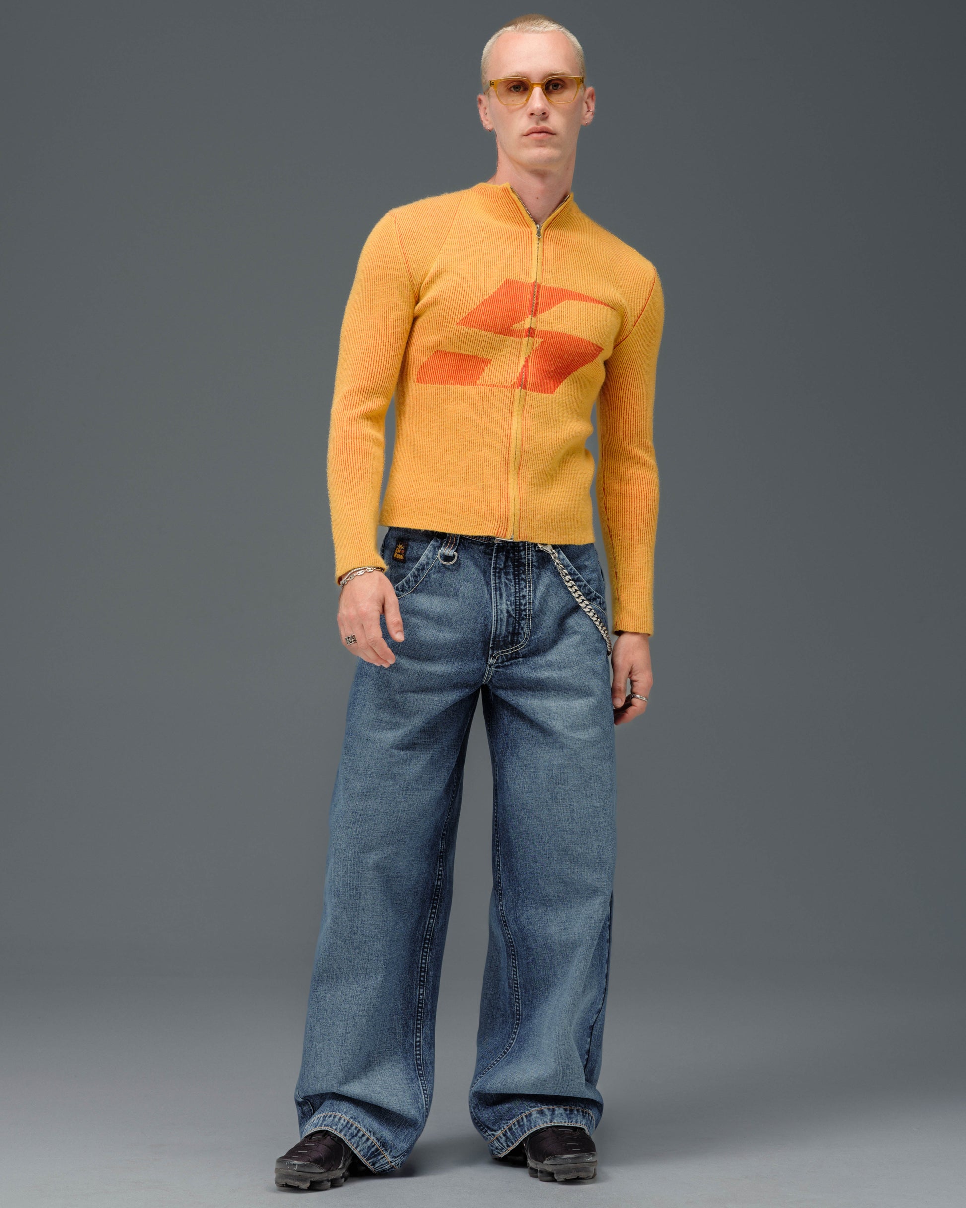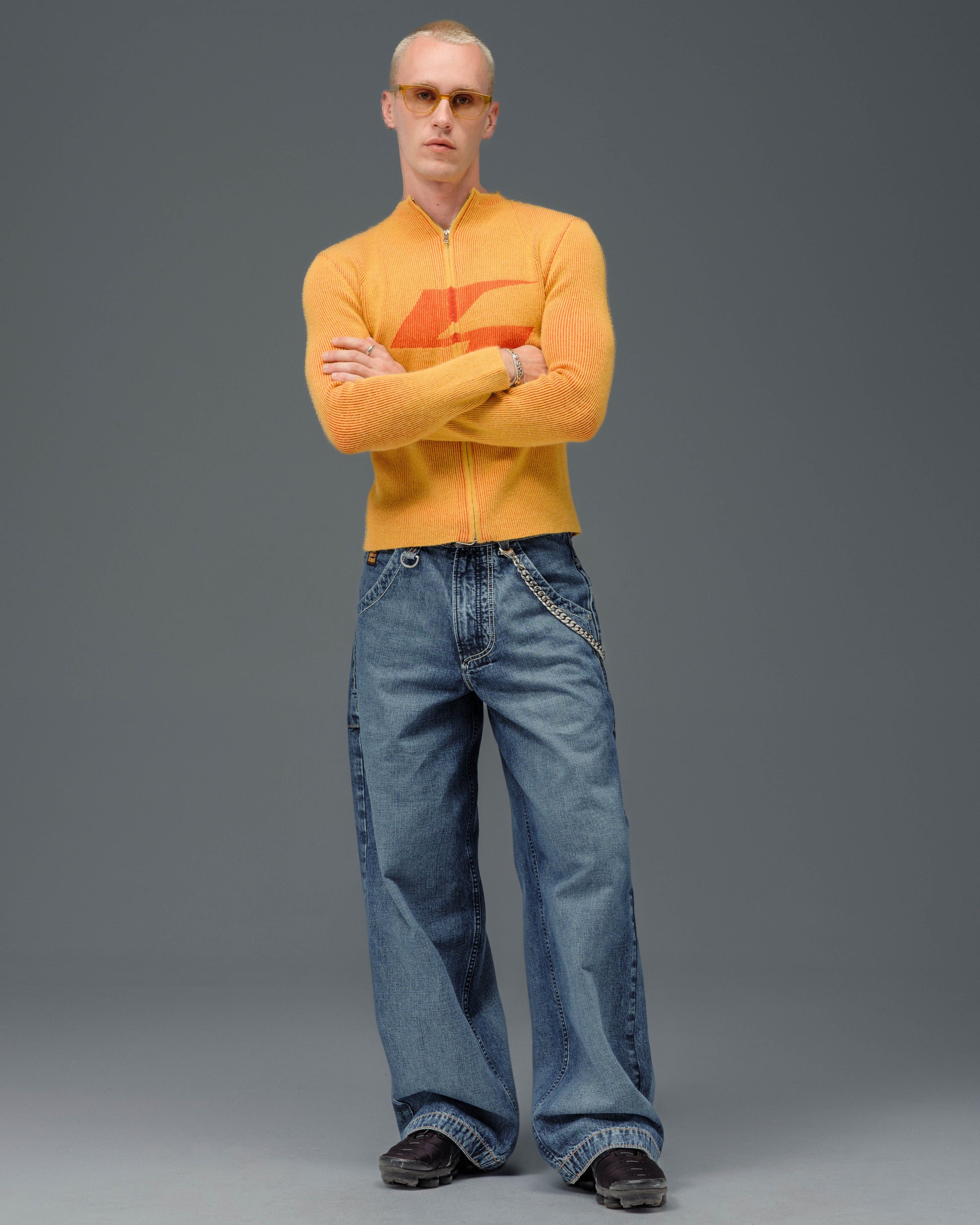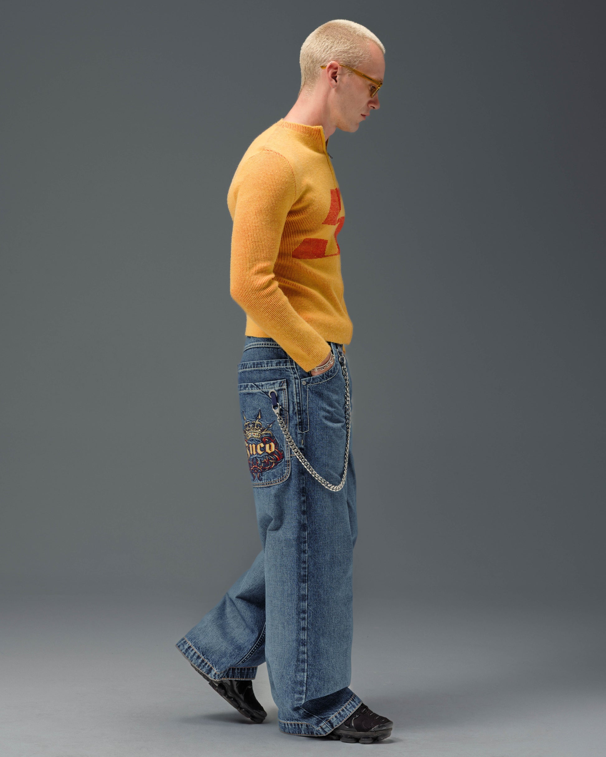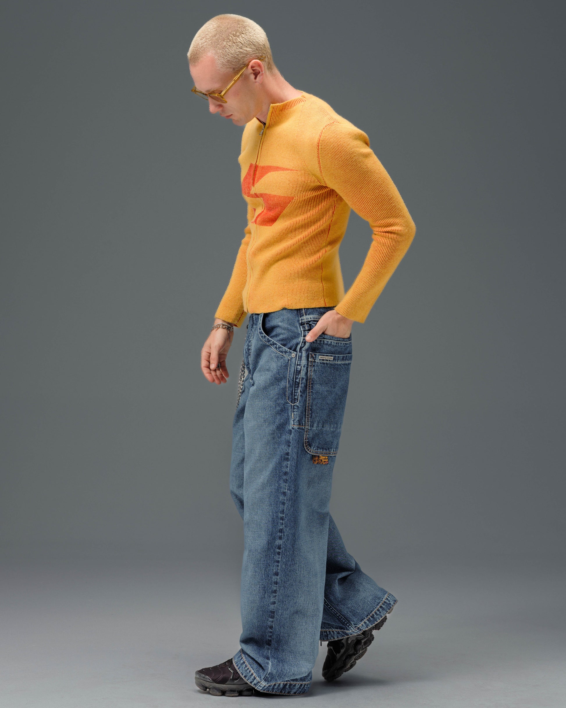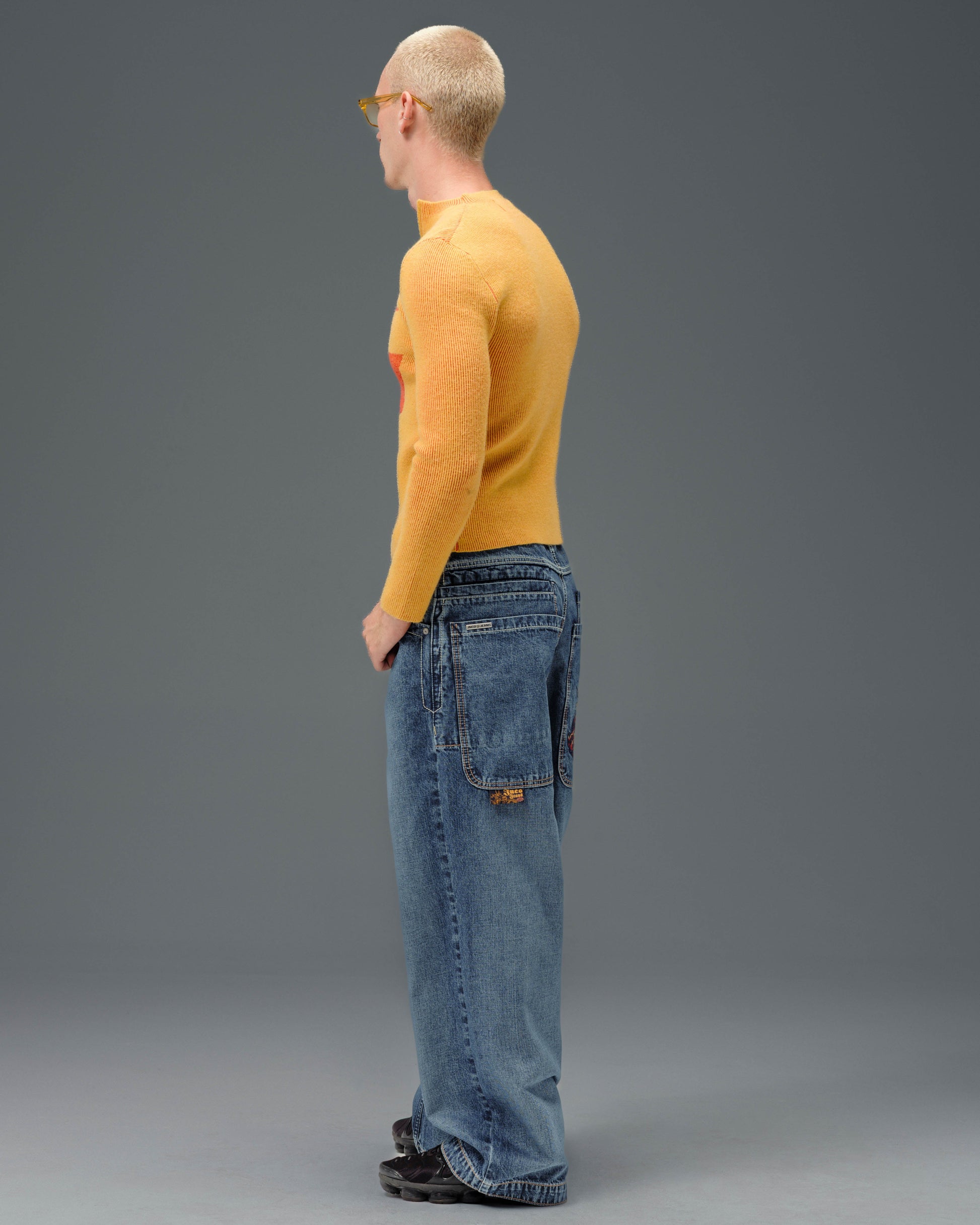 Collector’s item from JNCO’s workwear-inspired line. Hand-Sand Medium Dark Stone Wash, 23" bottom opening. 12.5oz 100% cotton cross-hatch denim with four-thread contrast stitching. 4 back pockets, “JNCO Jeans '85” dragon patch, crown plaque, and chain loops (chain not included). Original “JNCO Royal” embroidery with 80,000 stitches. Collectible matte and gloss flasher included. Limited Edition – very limited stock.