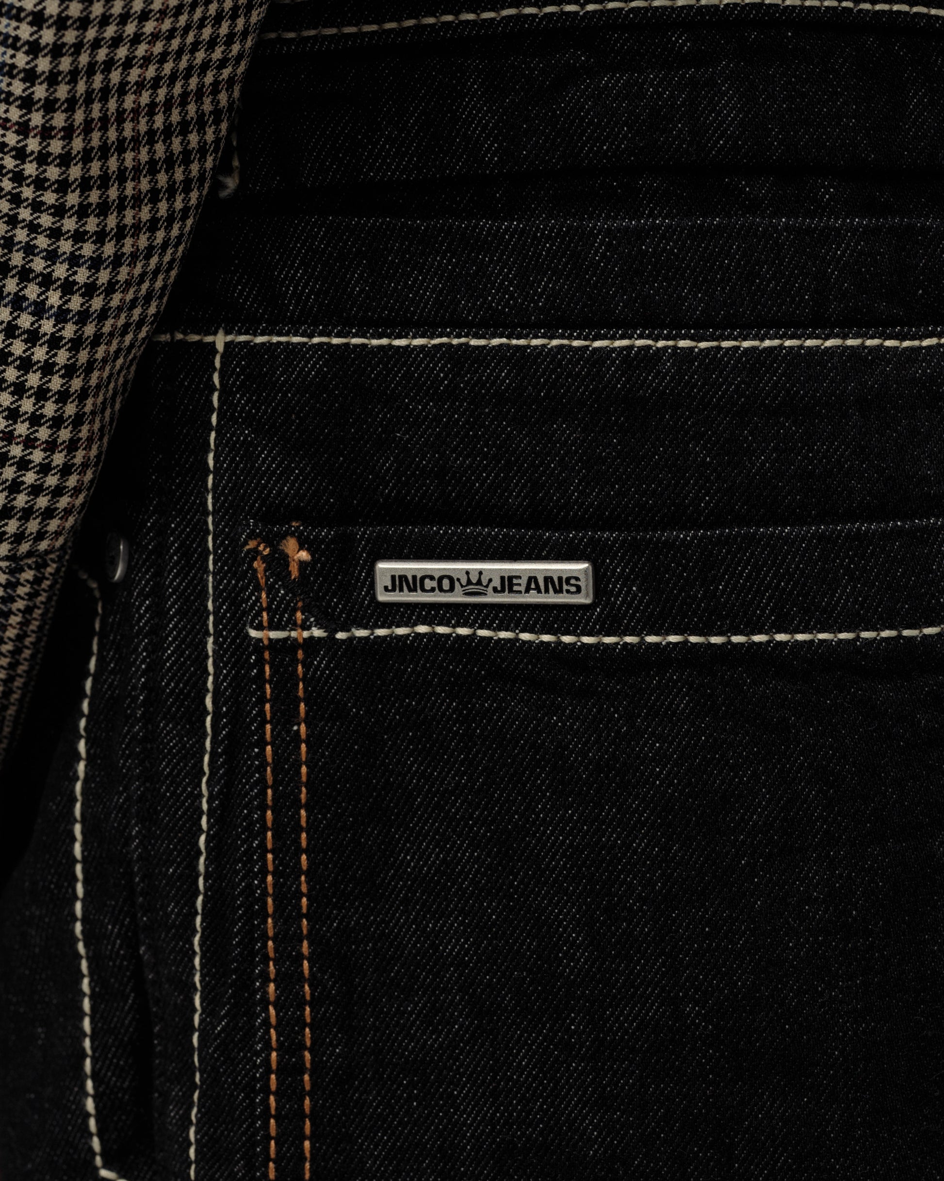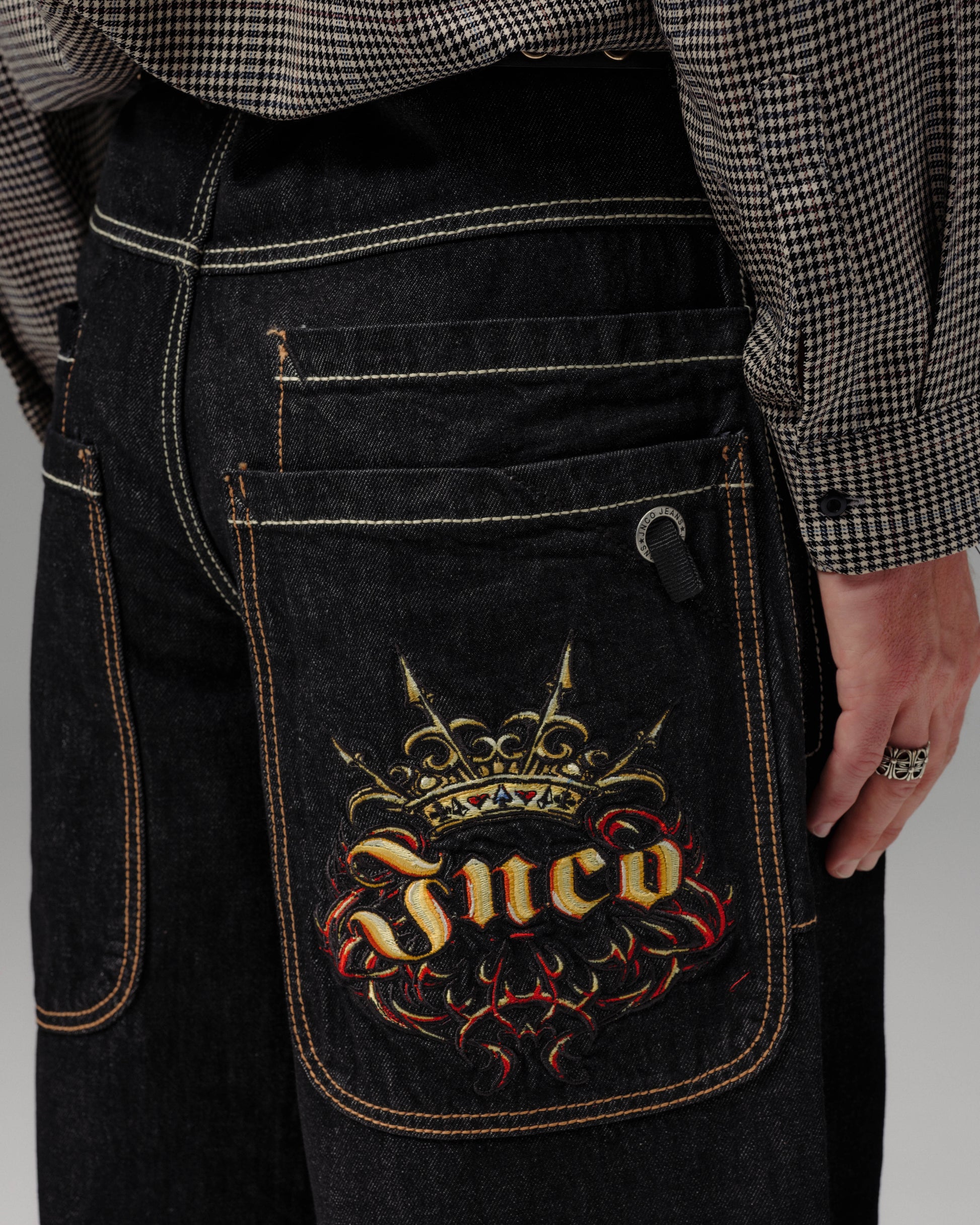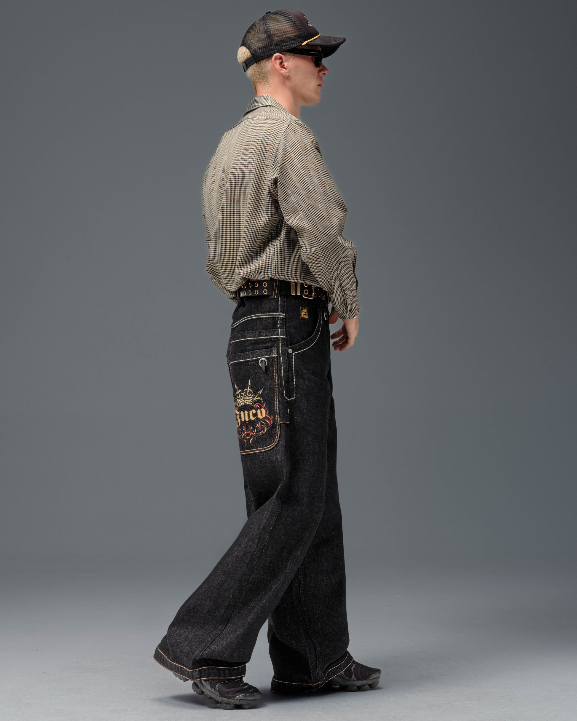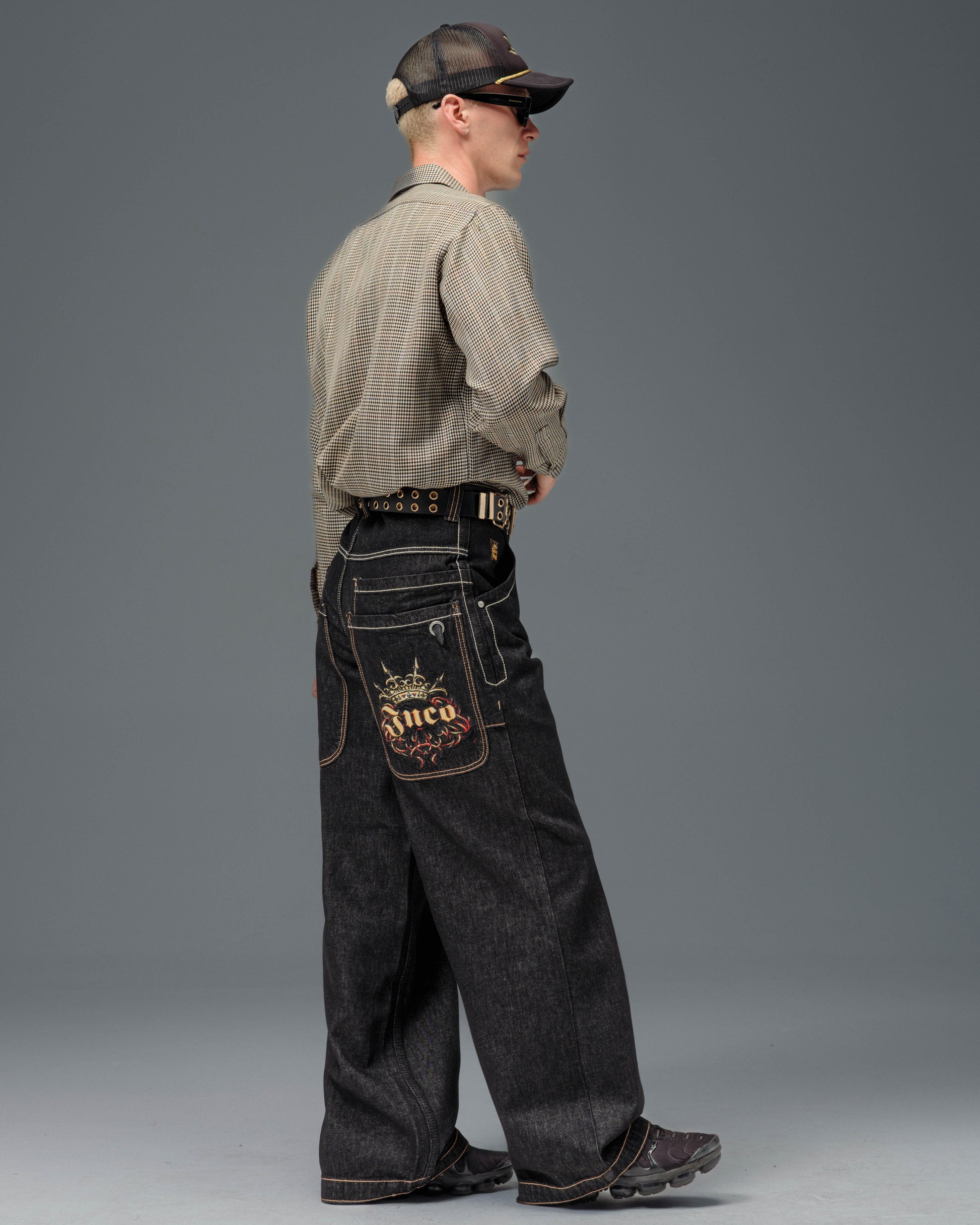 Laser Black denim, 23" bottom opening. 100% cotton rope-dyed with luxe starch wax finish. Heavy double contrast stitching in four thread colors. 4 back pockets, “JNCO Jeans '85” dragon patch, metal crown plaque, and chain loops (chain not included). Original “JNCO Royal” embroidery with 80,000 stitches and all original labels. Includes collectible matte and gloss flasher. Limited Edition – very limited stock.