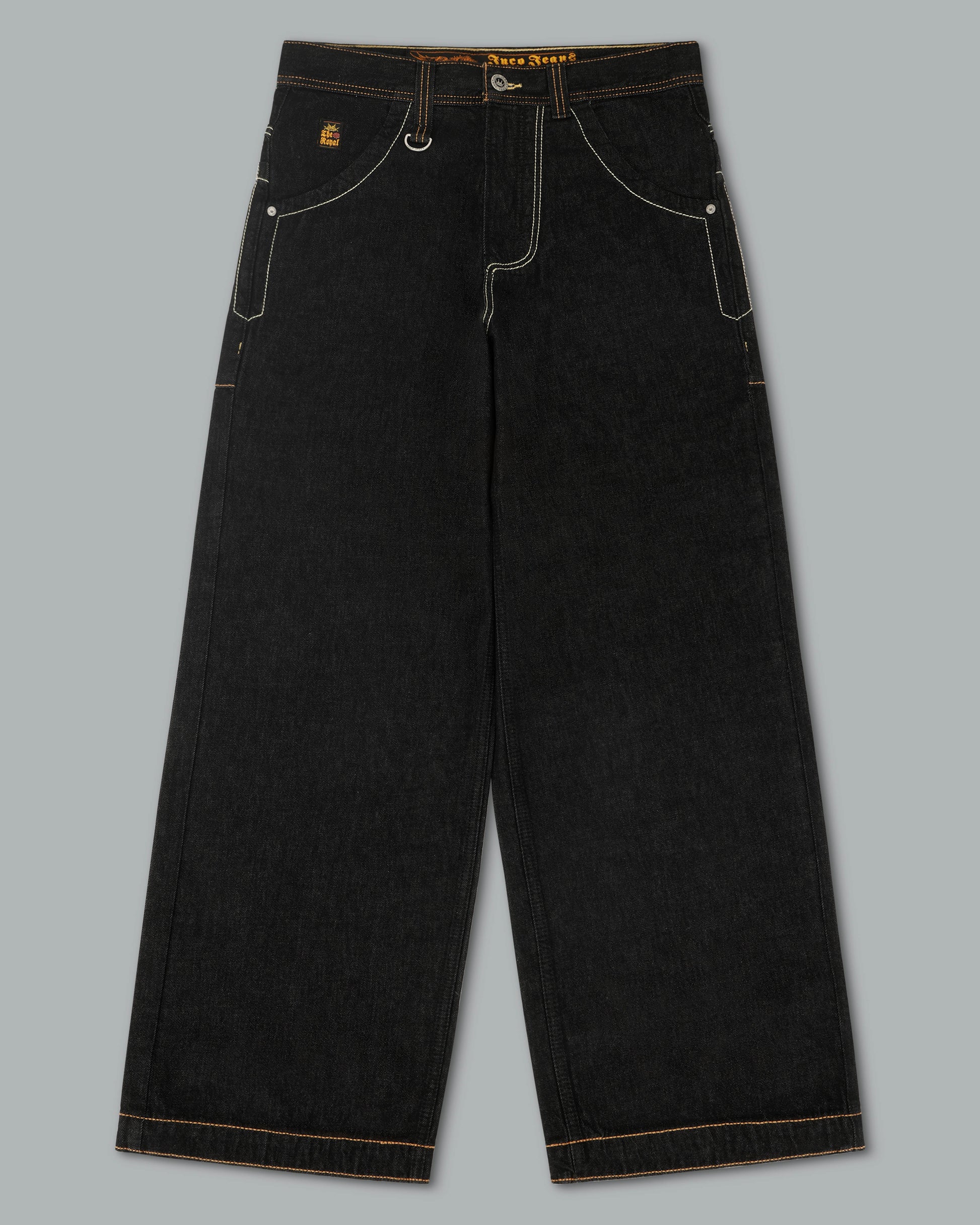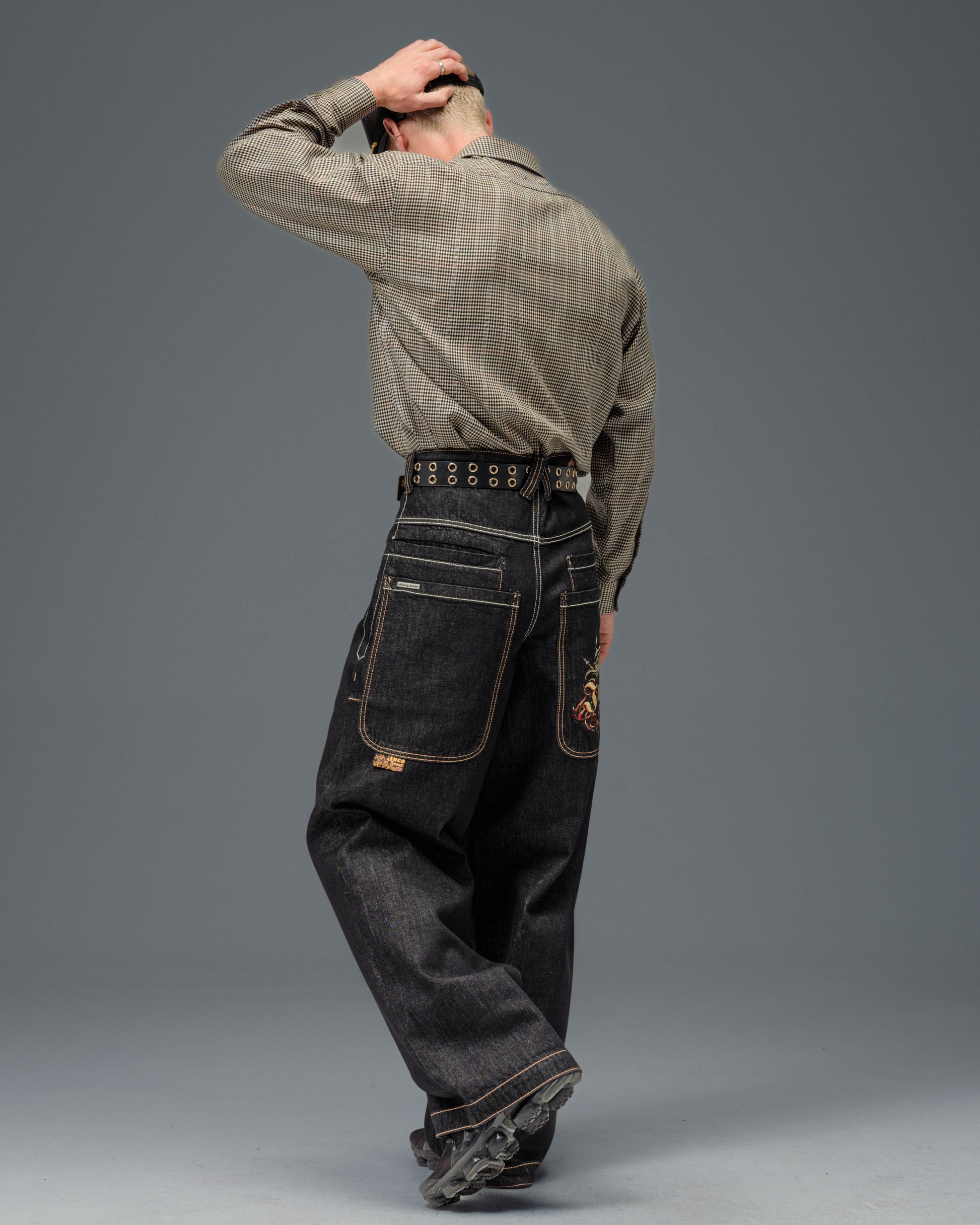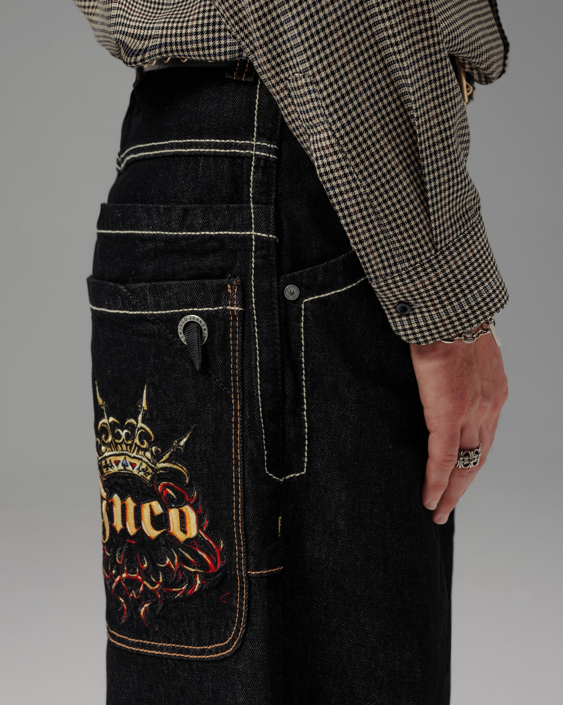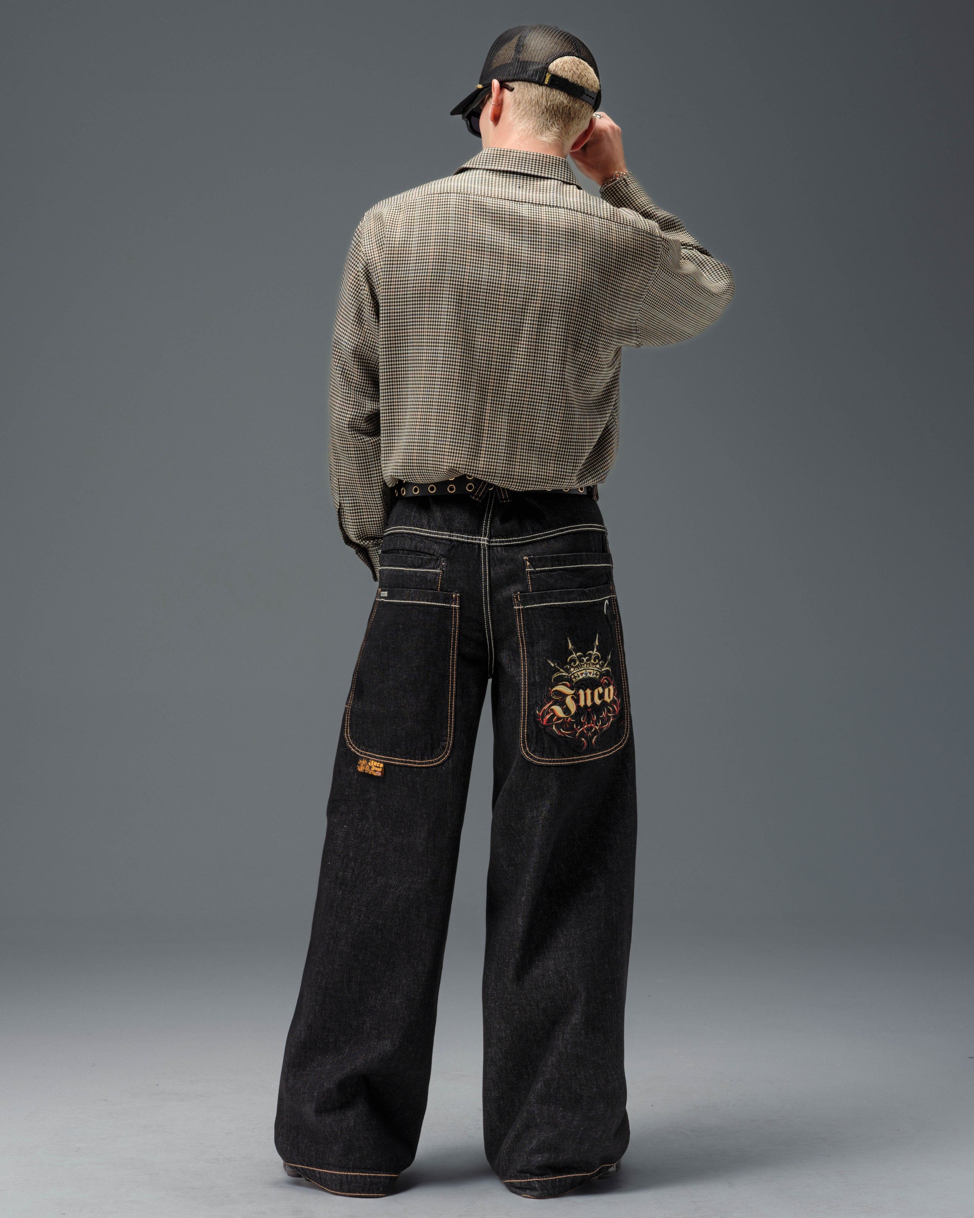 Laser Black denim, 23" bottom opening. 100% cotton rope-dyed with luxe starch wax finish. Heavy double contrast stitching in four thread colors. 4 back pockets, “JNCO Jeans '85” dragon patch, metal crown plaque, and chain loops (chain not included). Original “JNCO Royal” embroidery with 80,000 stitches and all original labels. Includes collectible matte and gloss flasher. Limited Edition – very limited stock.
