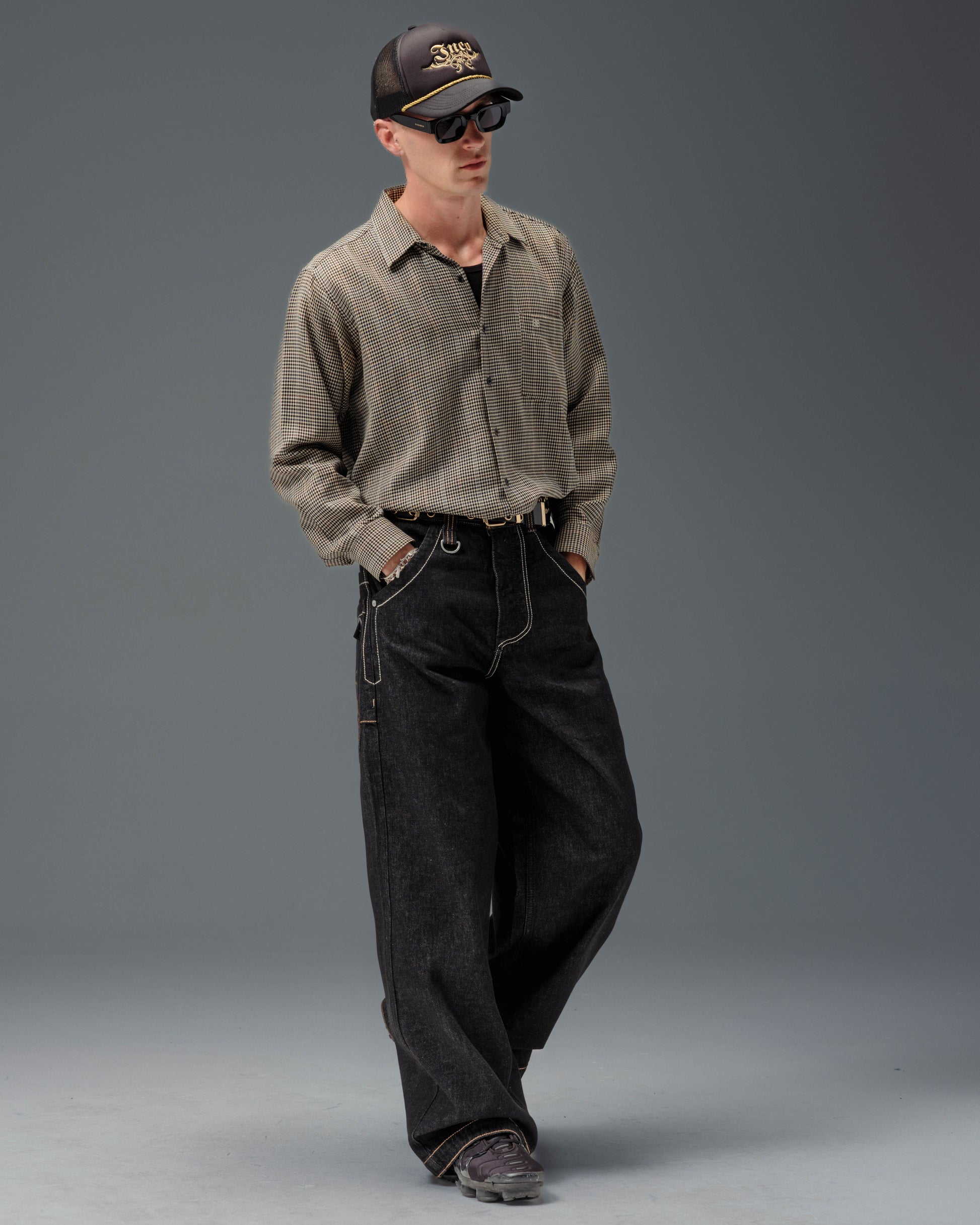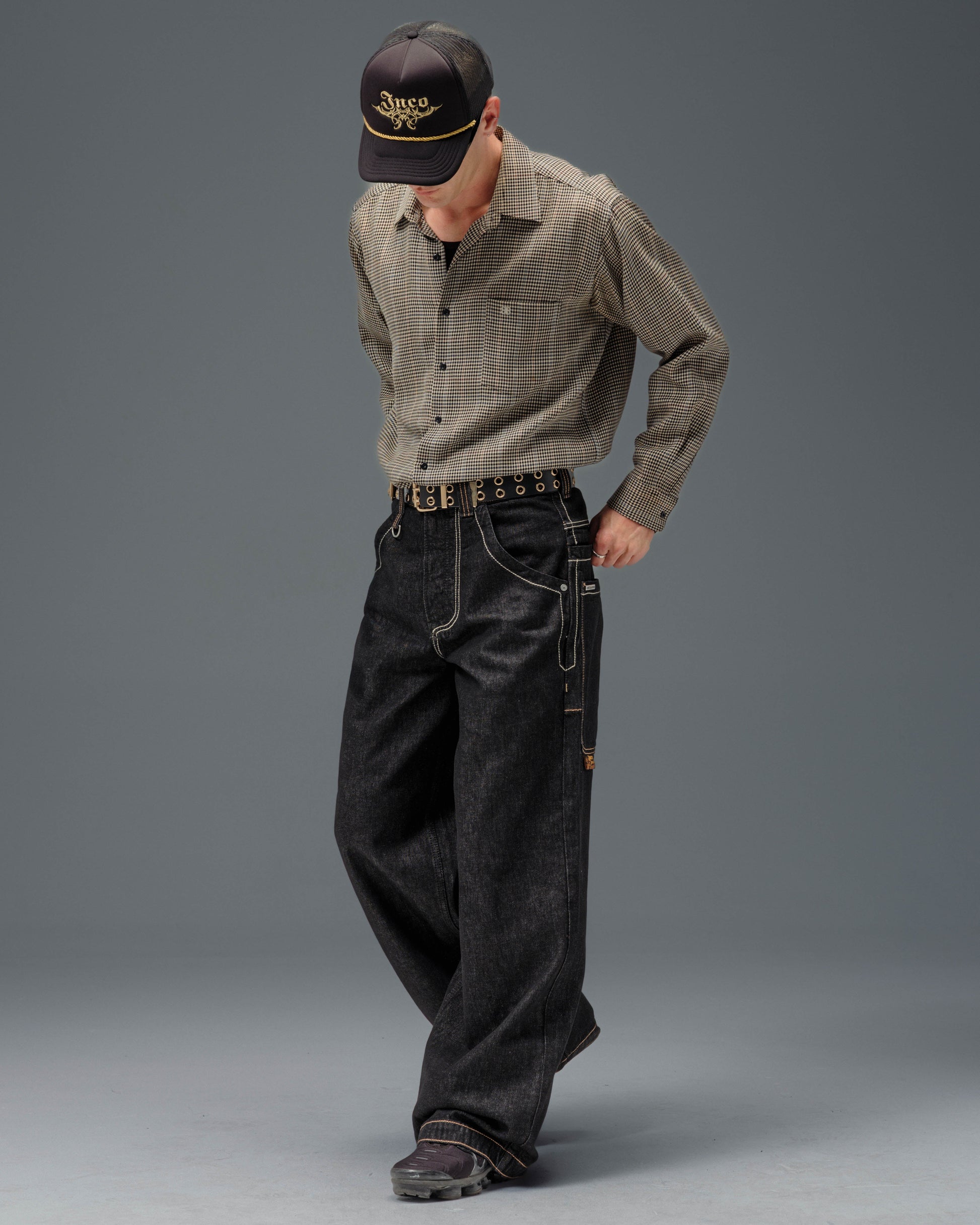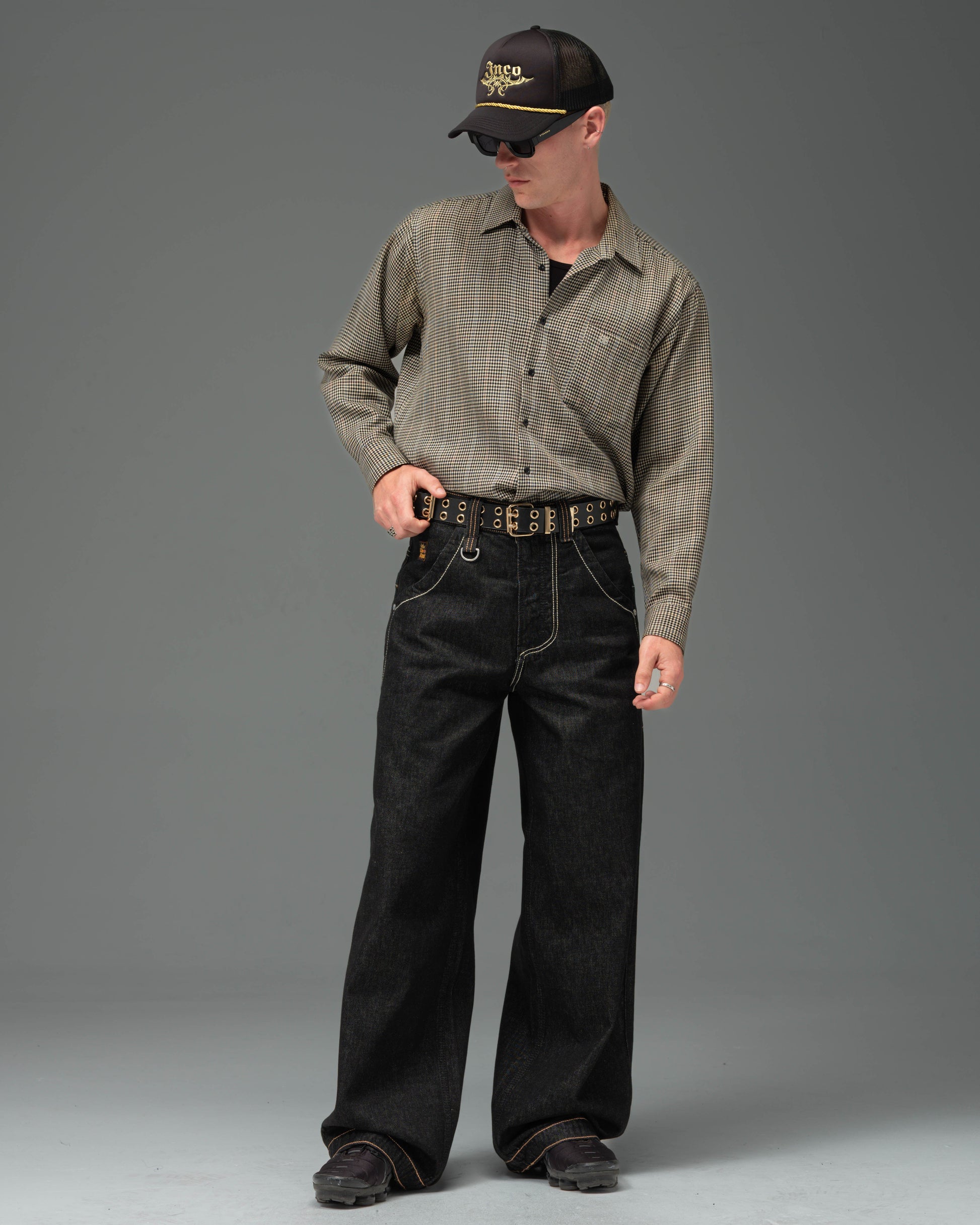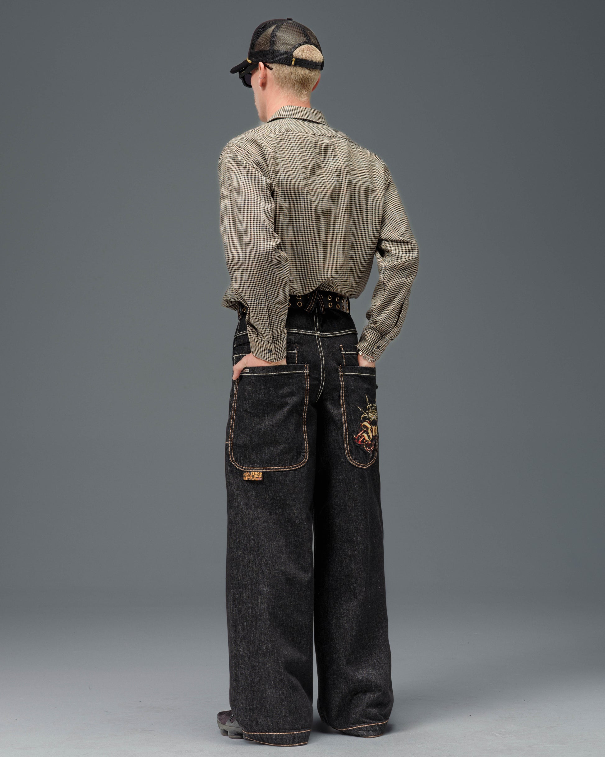 Laser Black denim, 23" bottom opening. 100% cotton rope-dyed with luxe starch wax finish. Heavy double contrast stitching in four thread colors. 4 back pockets, “JNCO Jeans '85” dragon patch, metal crown plaque, and chain loops (chain not included). Original “JNCO Royal” embroidery with 80,000 stitches and all original labels. Includes collectible matte and gloss flasher. Limited Edition – very limited stock.
