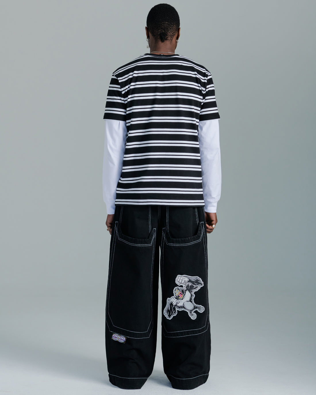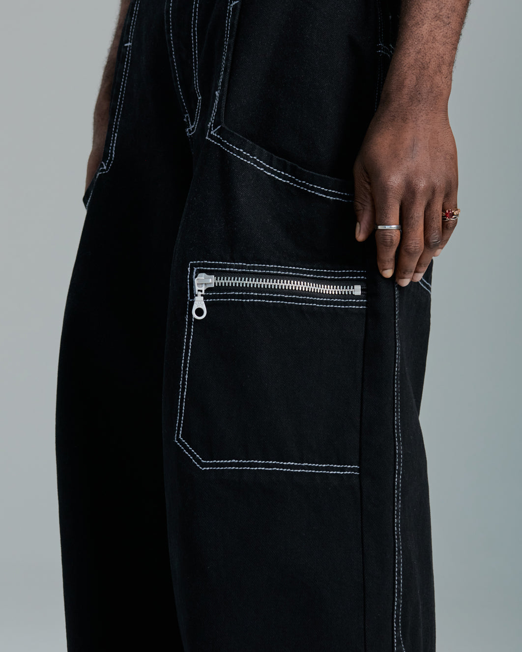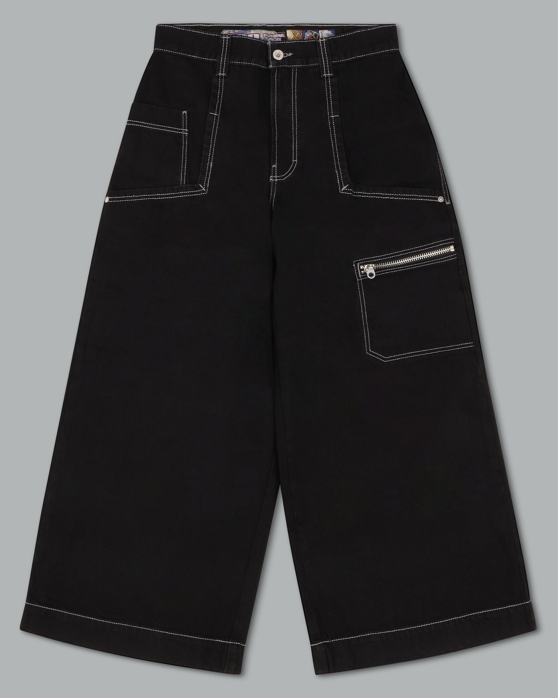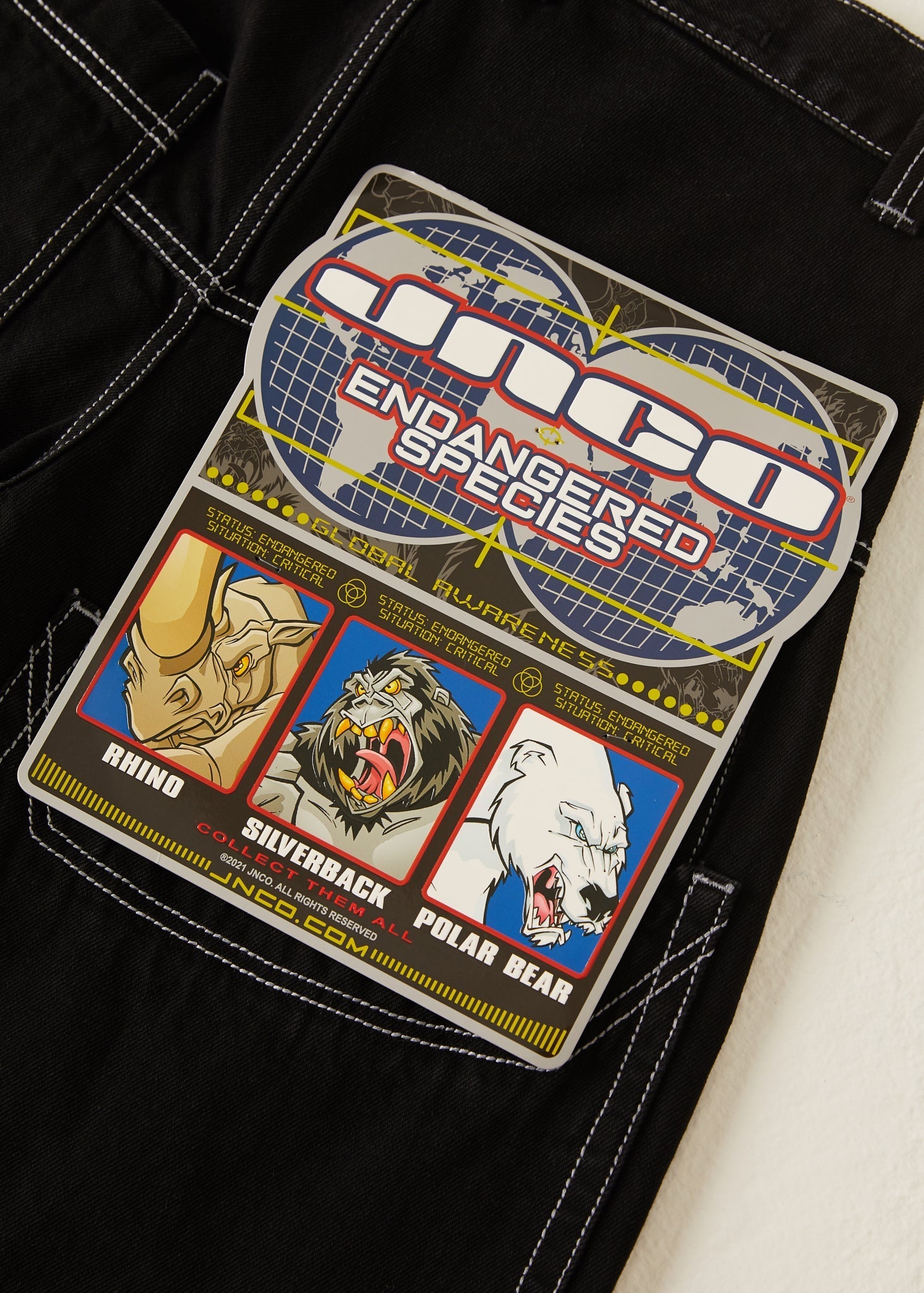 A collector’s piece from the Endangered Species Series. Jet Black denim, 32" bottom opening. 13oz rope-dyed cotton with a waxed finish. Features the 140,000-stitch Silverback patch, 4 oversized back pockets, and a zippered front pocket. Collectible Endangered Species flasher attached. Limited Edition – very Limited Stock.