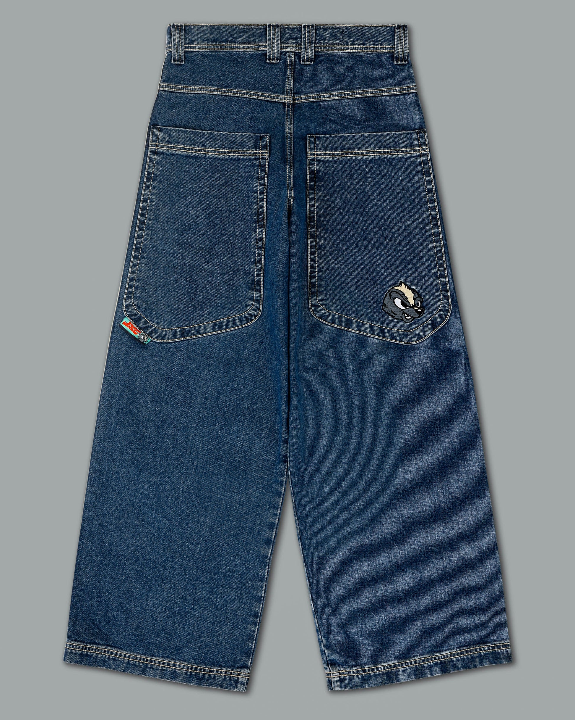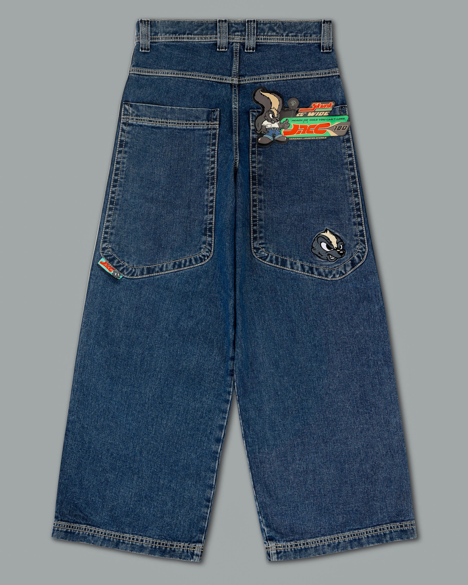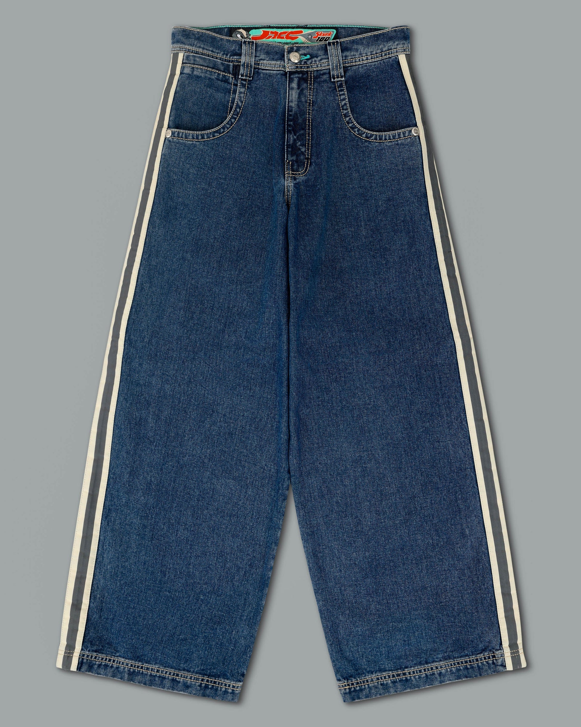 A Collector’s Edition style in Original Dark Stone wash. 26" bottom opening. 14 oz. 100% cotton. 3x1 left hand weave. Features signature leg tape in natural and charcoal, and the original embroidered Skunk face. Detailed stitching, custom hardware, collectible flasher, and original labels. Limited Edition – very limited stock.