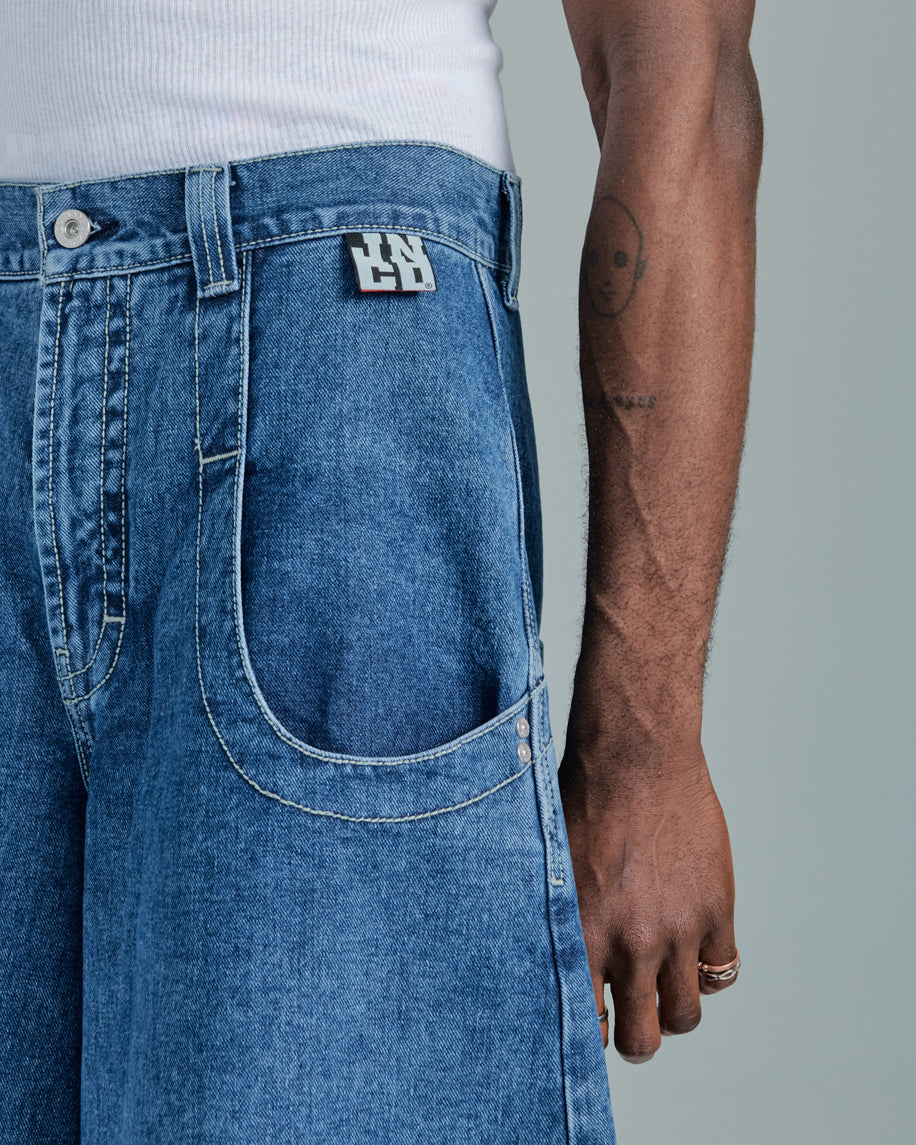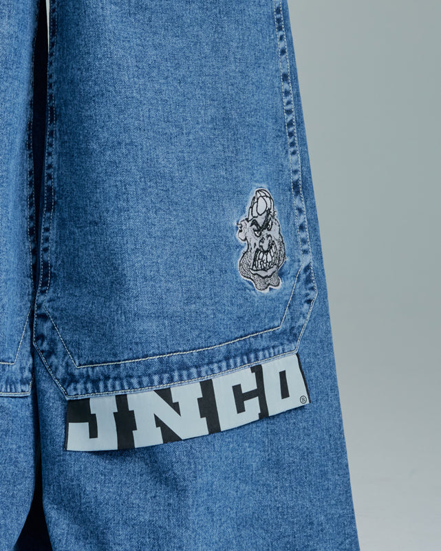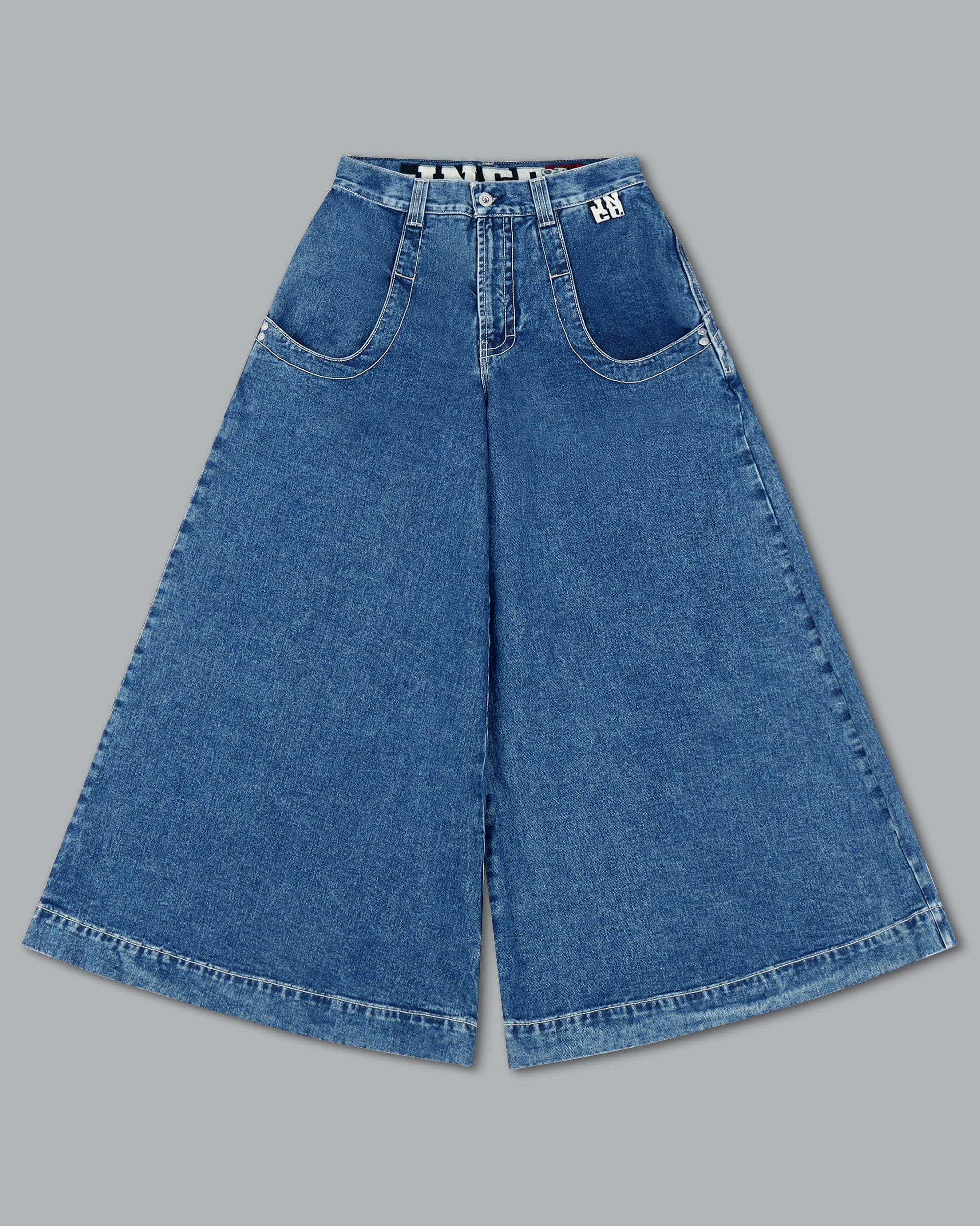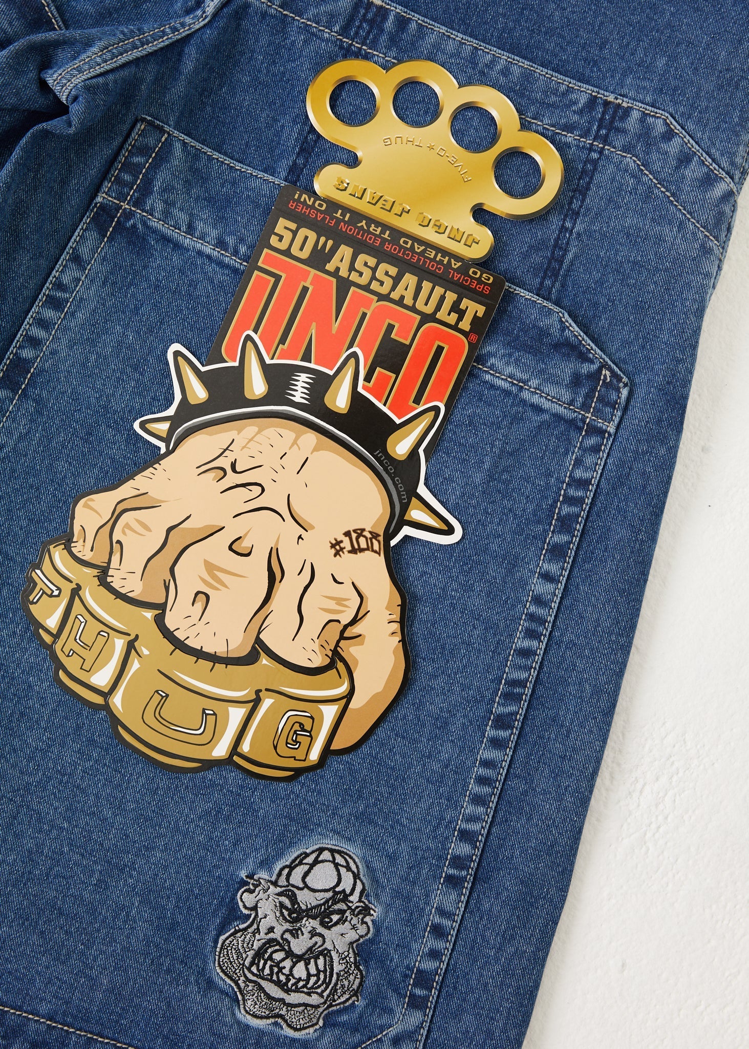 A legendary piece from the FIVE-0 Collection. Dark Stone Wash, 50" bottom opening. 14oz 100% cotton, 3x1 weave. Features the famous Thug embroidery, heavy double thread, FIVE-0 label, and bold zippered back pocket. Collectible Brass Knuckle flasher attached. Limited Edition – very Limited Stock.