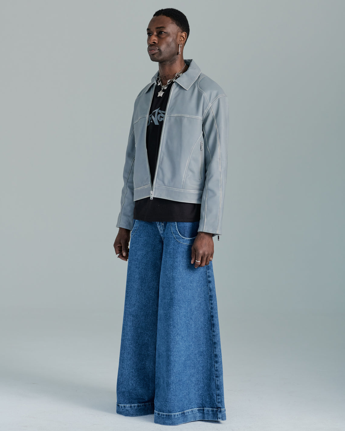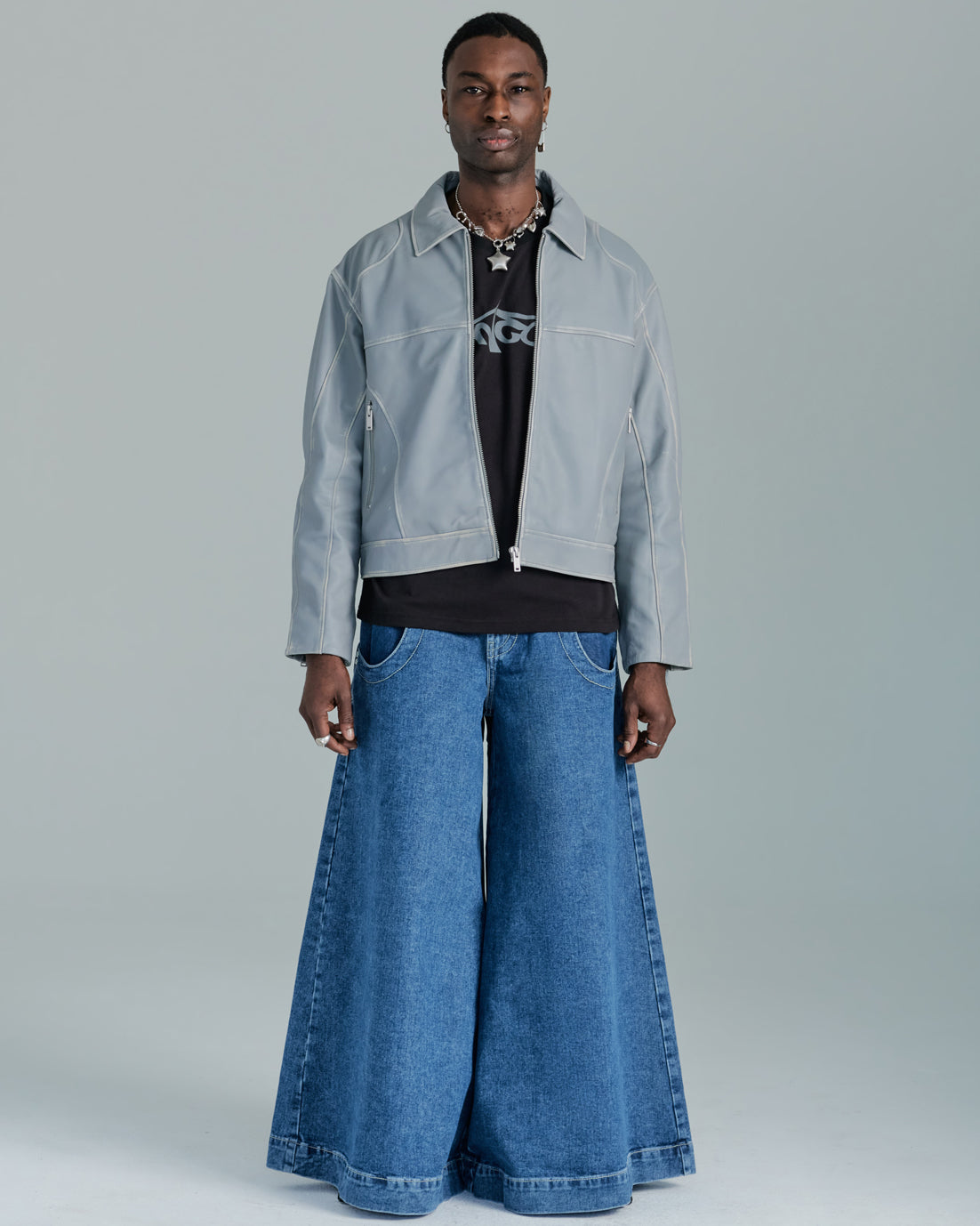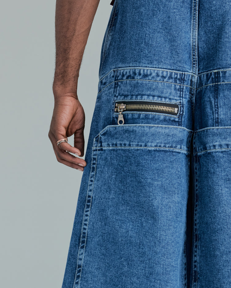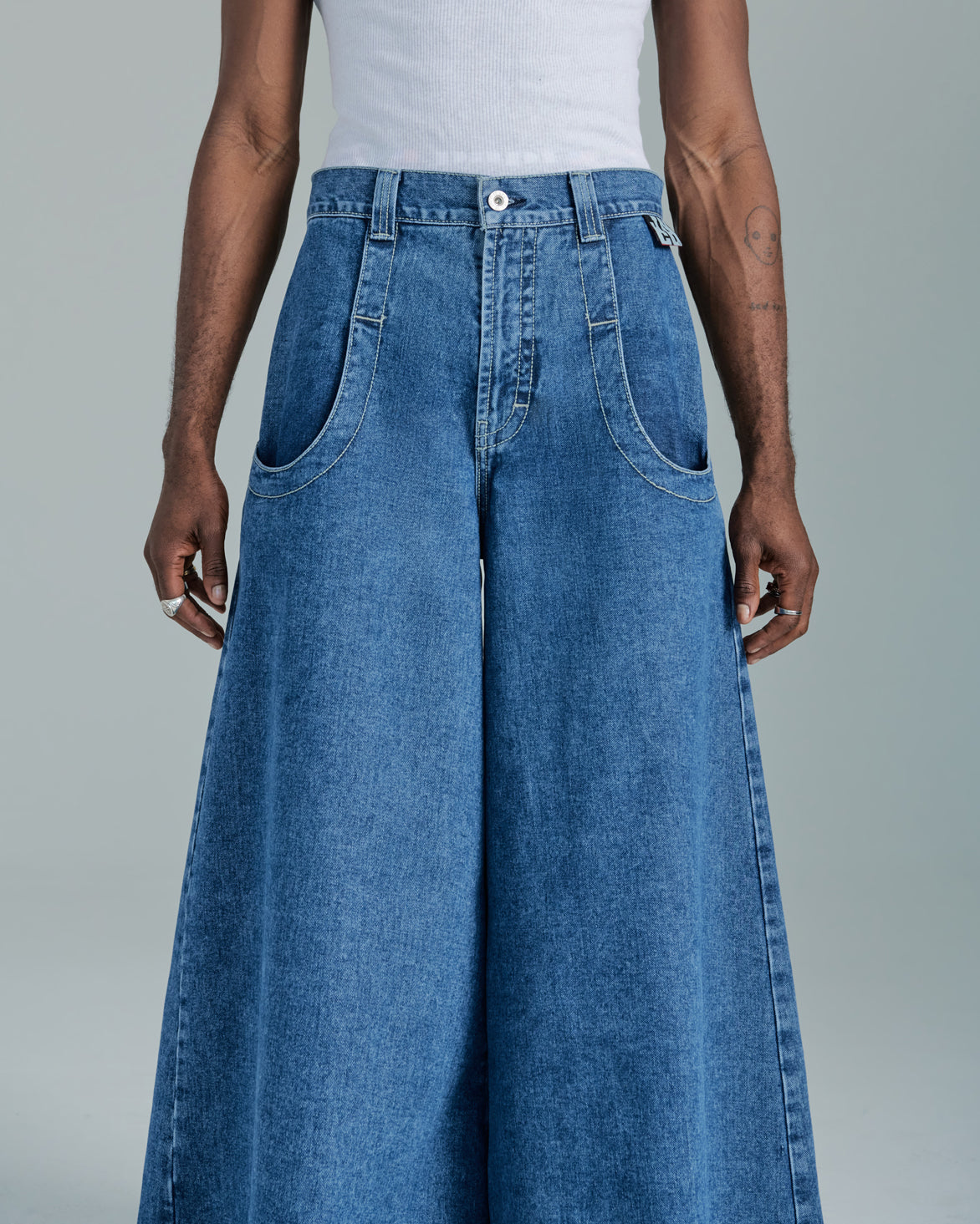 A legendary piece from the FIVE-0 Collection. Dark Stone Wash, 50" bottom opening. 14oz 100% cotton, 3x1 weave. Features the famous Thug embroidery, heavy double thread, FIVE-0 label, and bold zippered back pocket. Collectible Brass Knuckle flasher attached. Limited Edition – very Limited Stock.