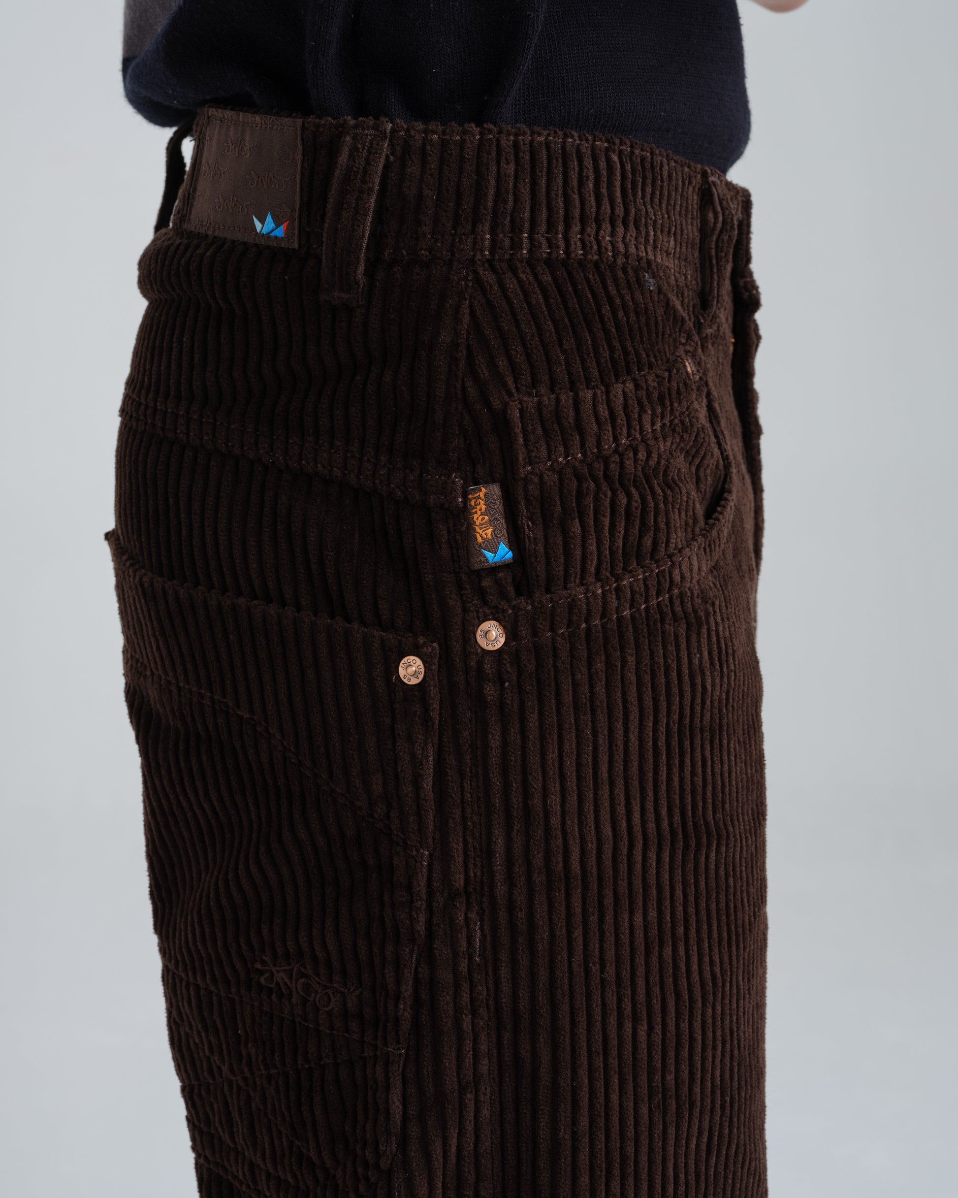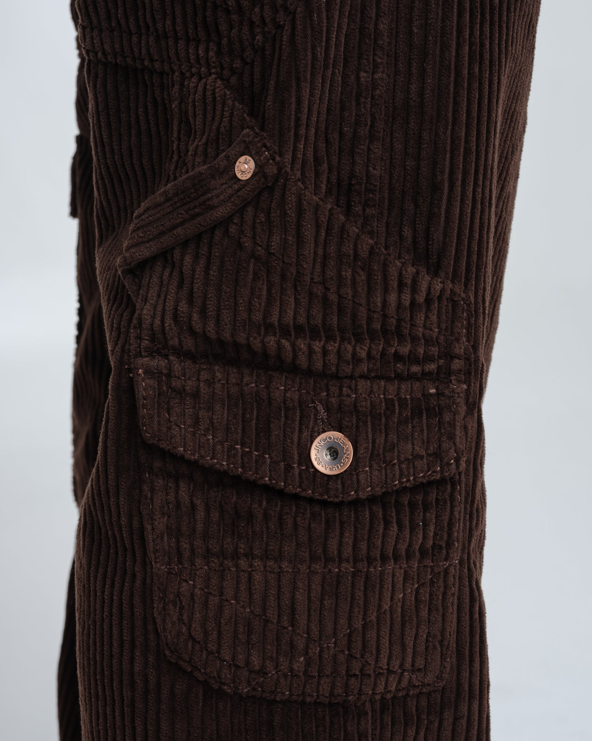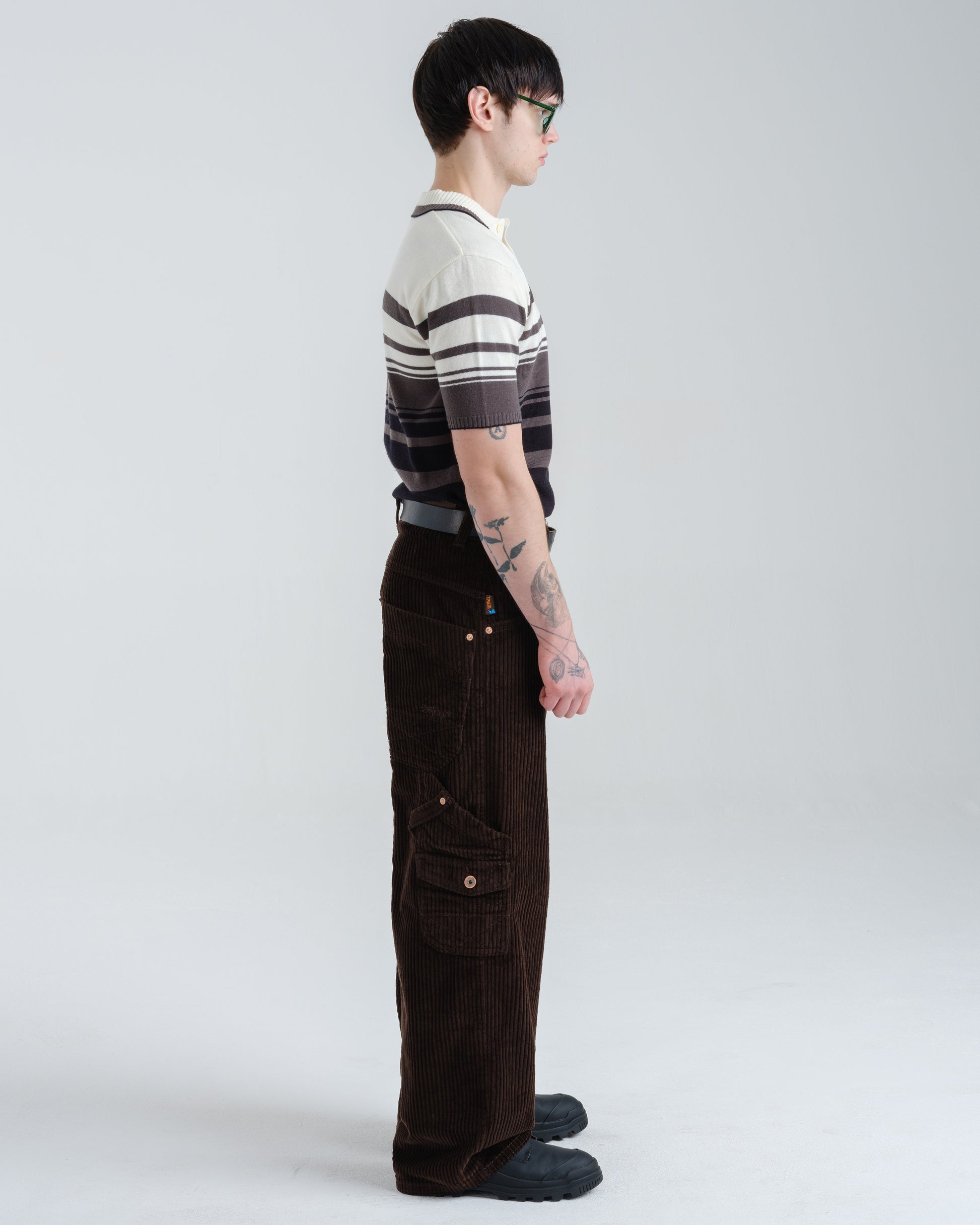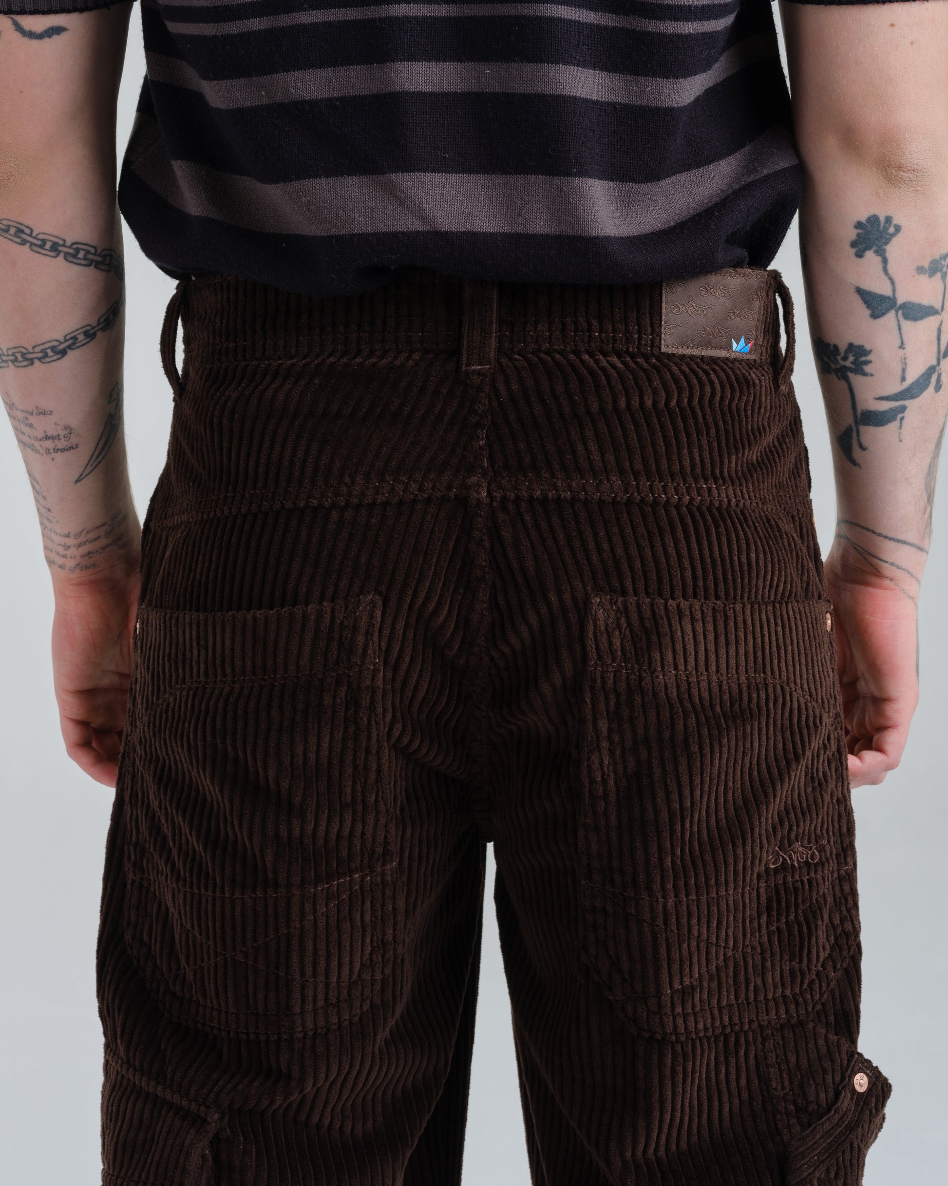 A modern twist on a classic workwear staple. 12oz 100% 4-Wale Corduroy in rich Java Brown. 23" stove-pipe bottom opening with a relaxed, wide-leg fit. Features a signature carpenter pocket and asymmetrical cargo pocket, and vintage-inspired details like angled front pockets, a hand-watch pocket, and oversized back patch pockets with mitered corners and “X” stitching. Finished with tonal stitching, reinforced utility belt loops, and premium hardware.