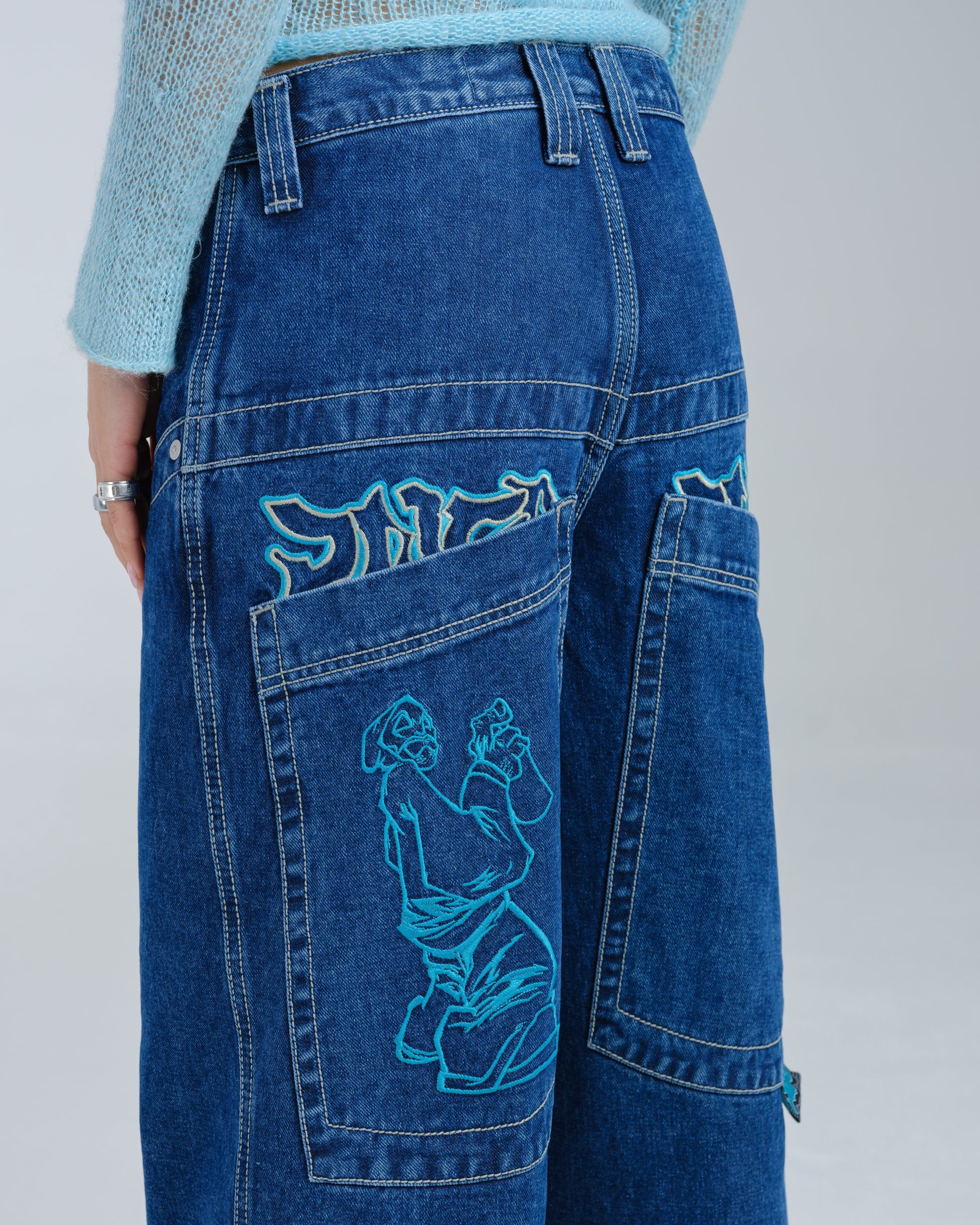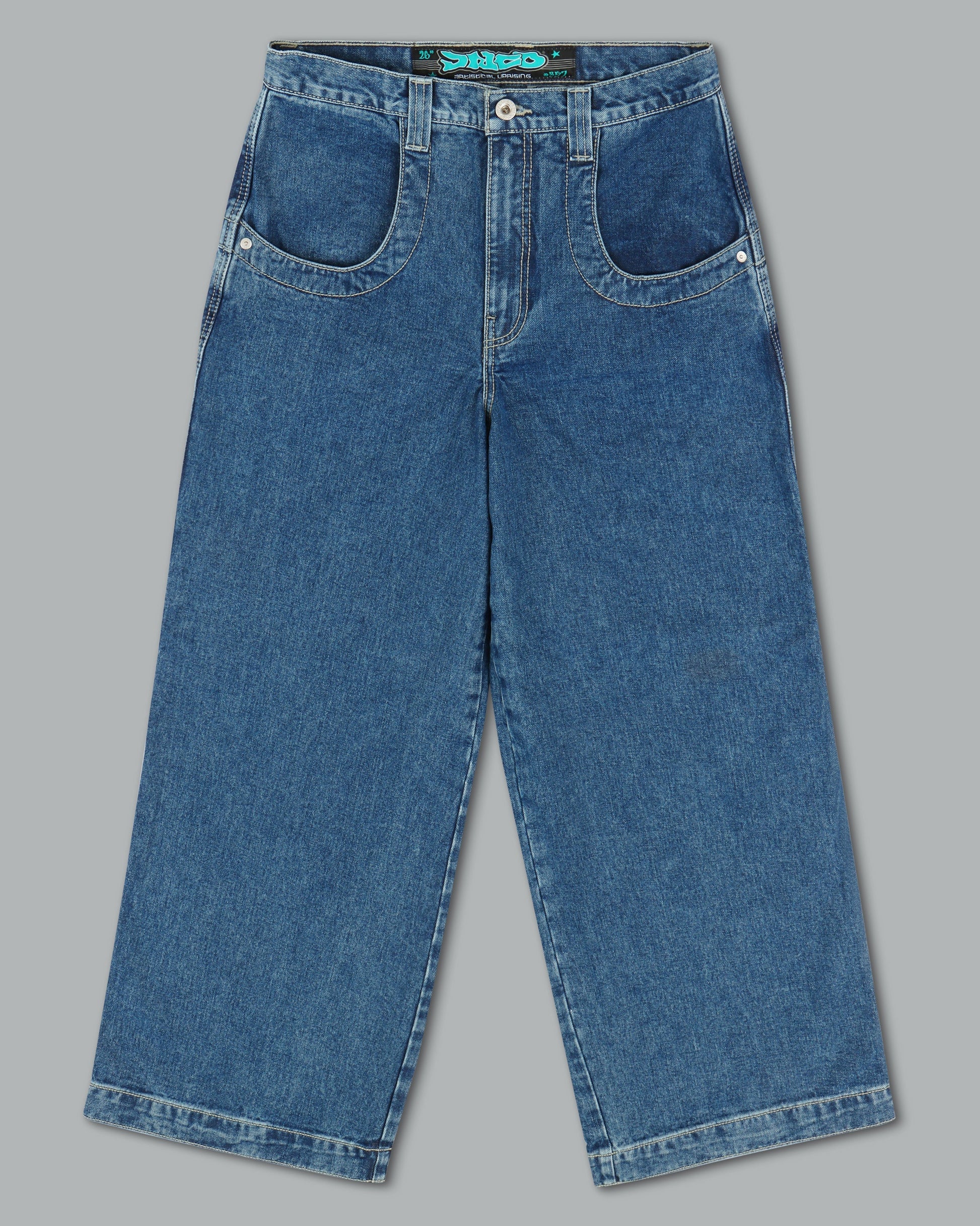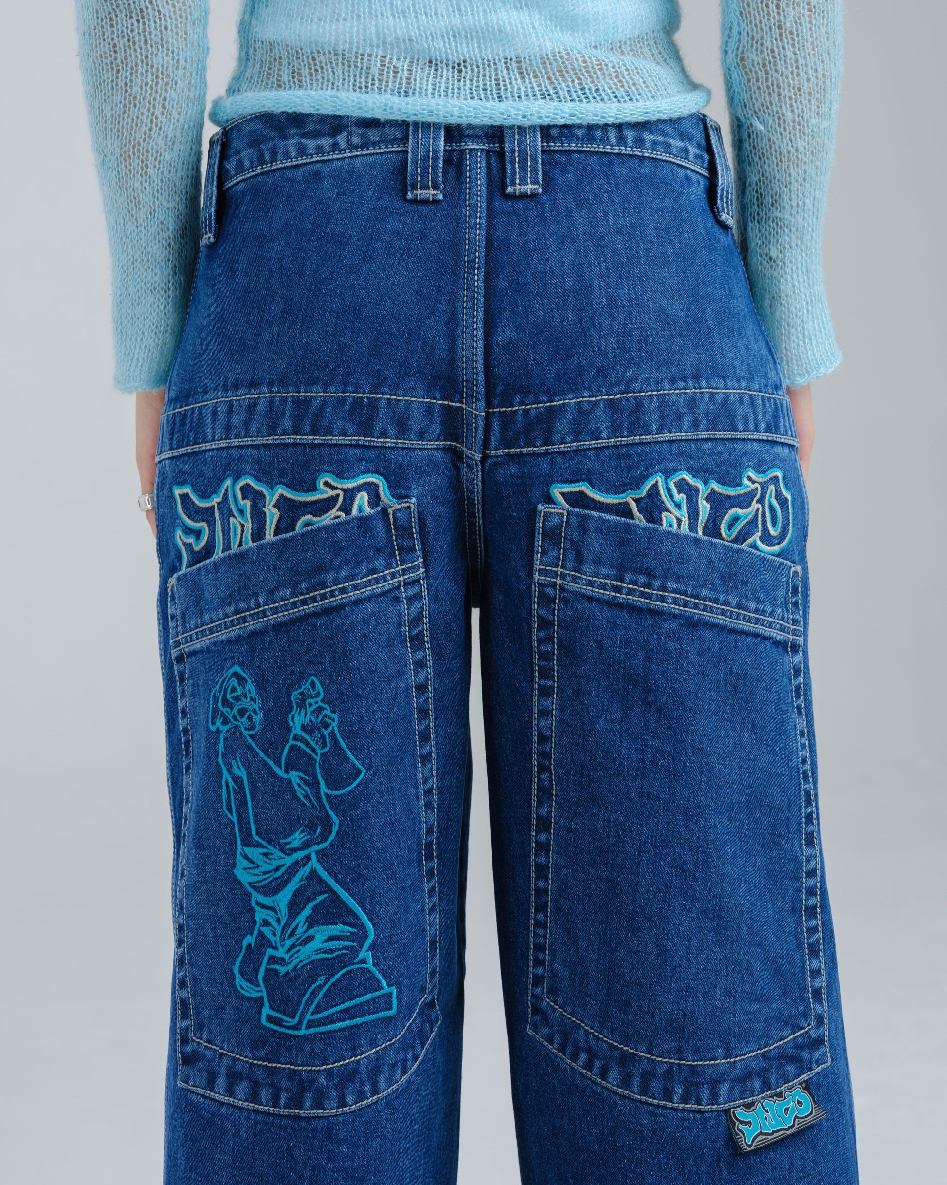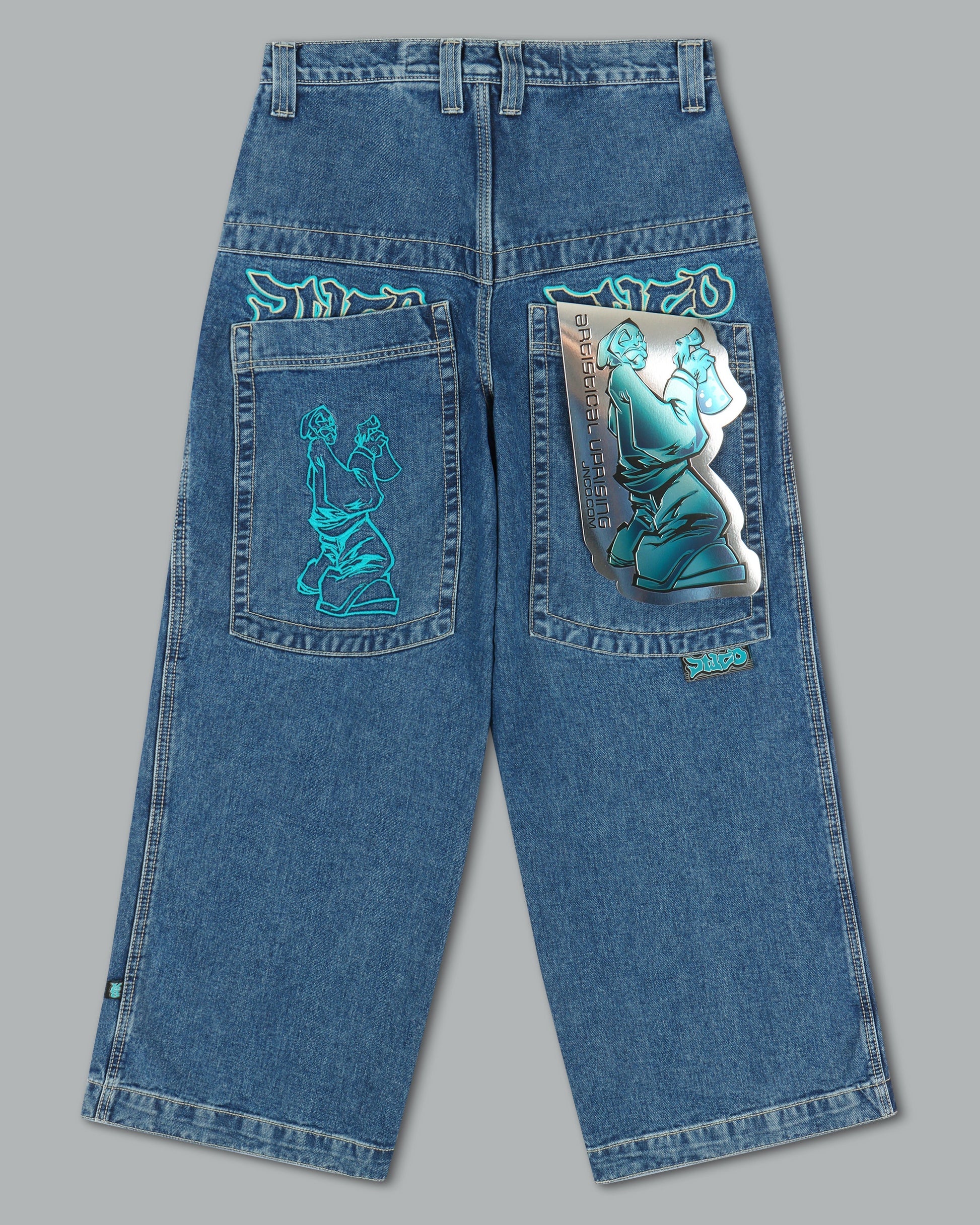 14oz 100% cotton denim with heavy double contrast stitching. JNCO logo embroidery above both back pockets with "tagger" embroidery below. Original labels, metallic Artistical Uprising flasher included. Limited Edition – very limited stock.
