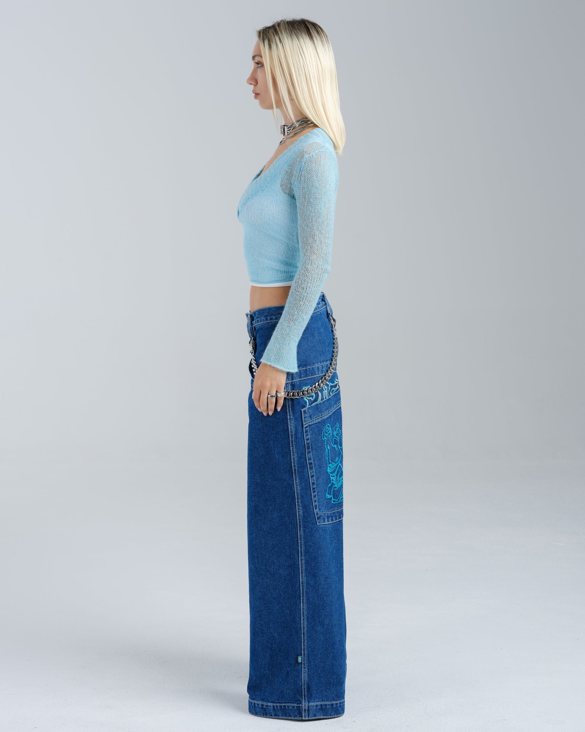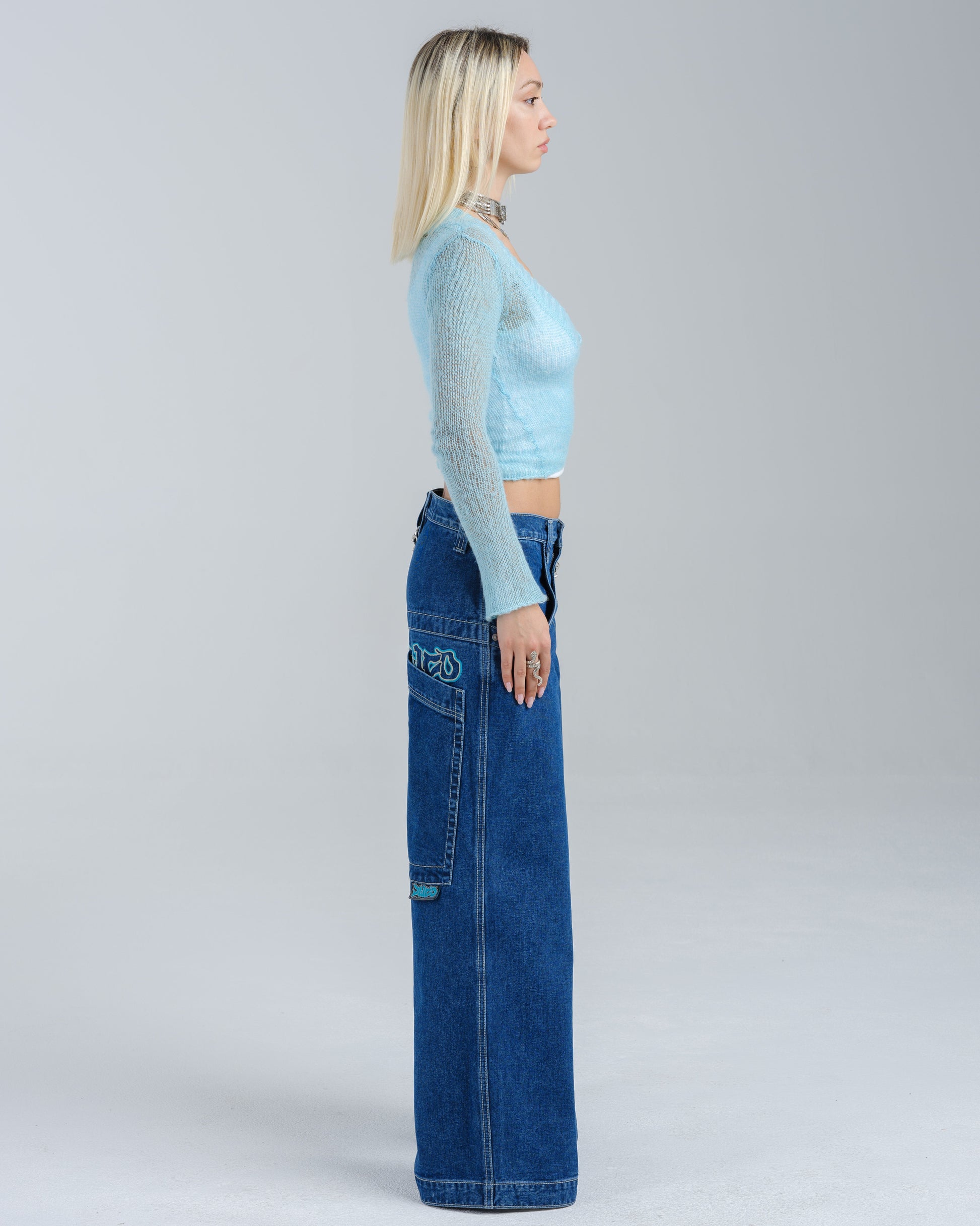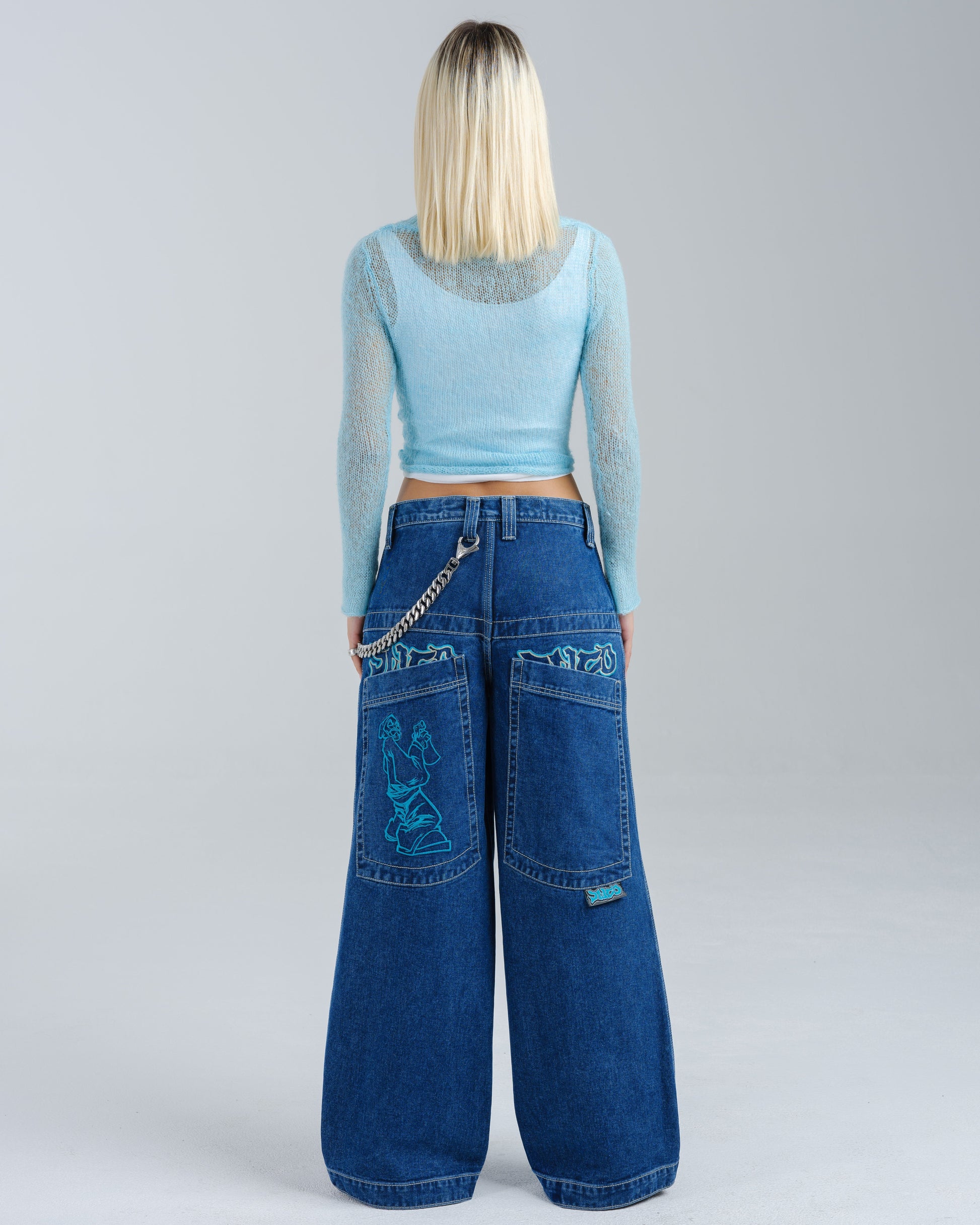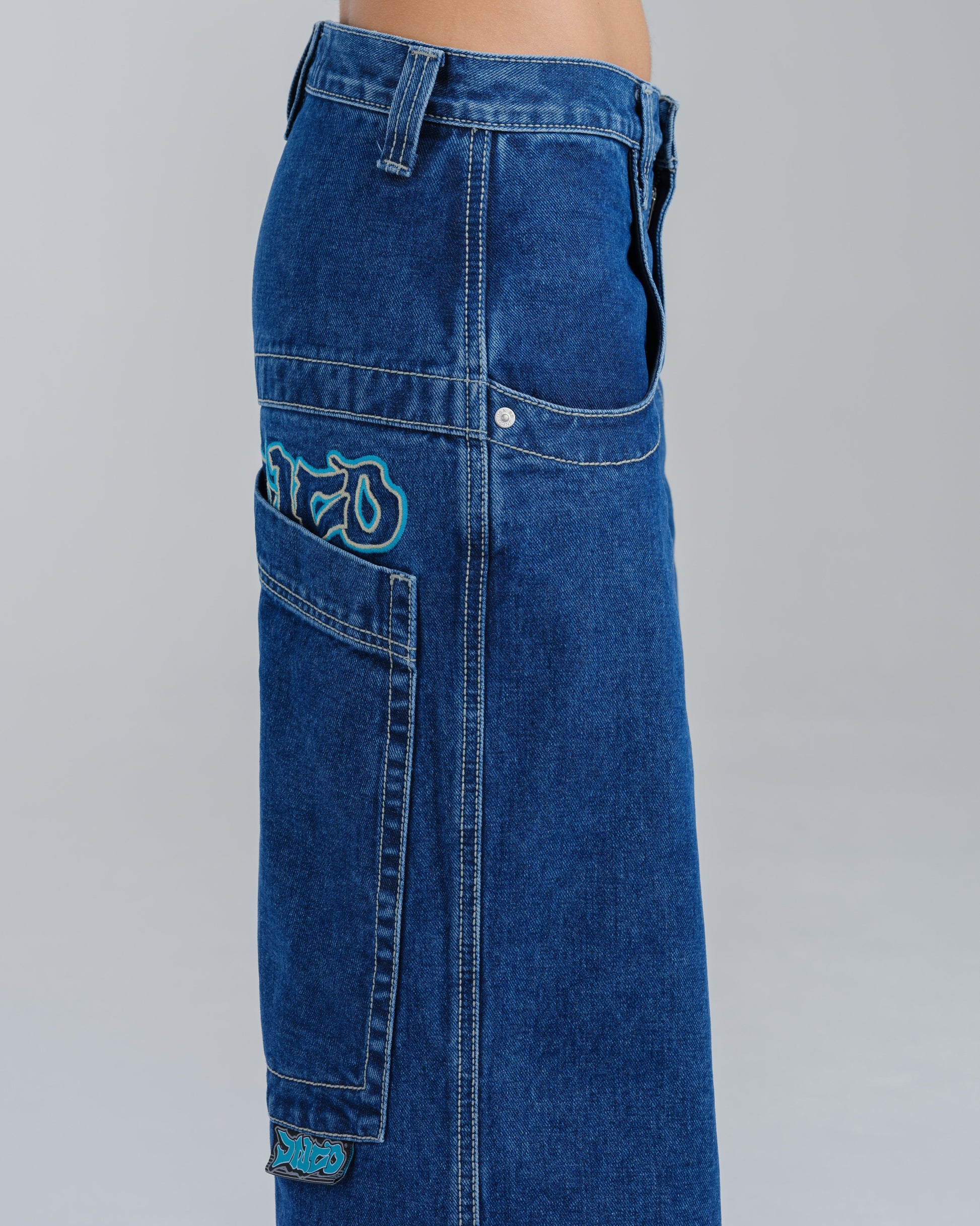 14oz 100% cotton denim with heavy double contrast stitching. JNCO logo embroidery above both back pockets with "tagger" embroidery below. Original labels, metallic Artistical Uprising flasher included. Limited Edition – very limited stock.
