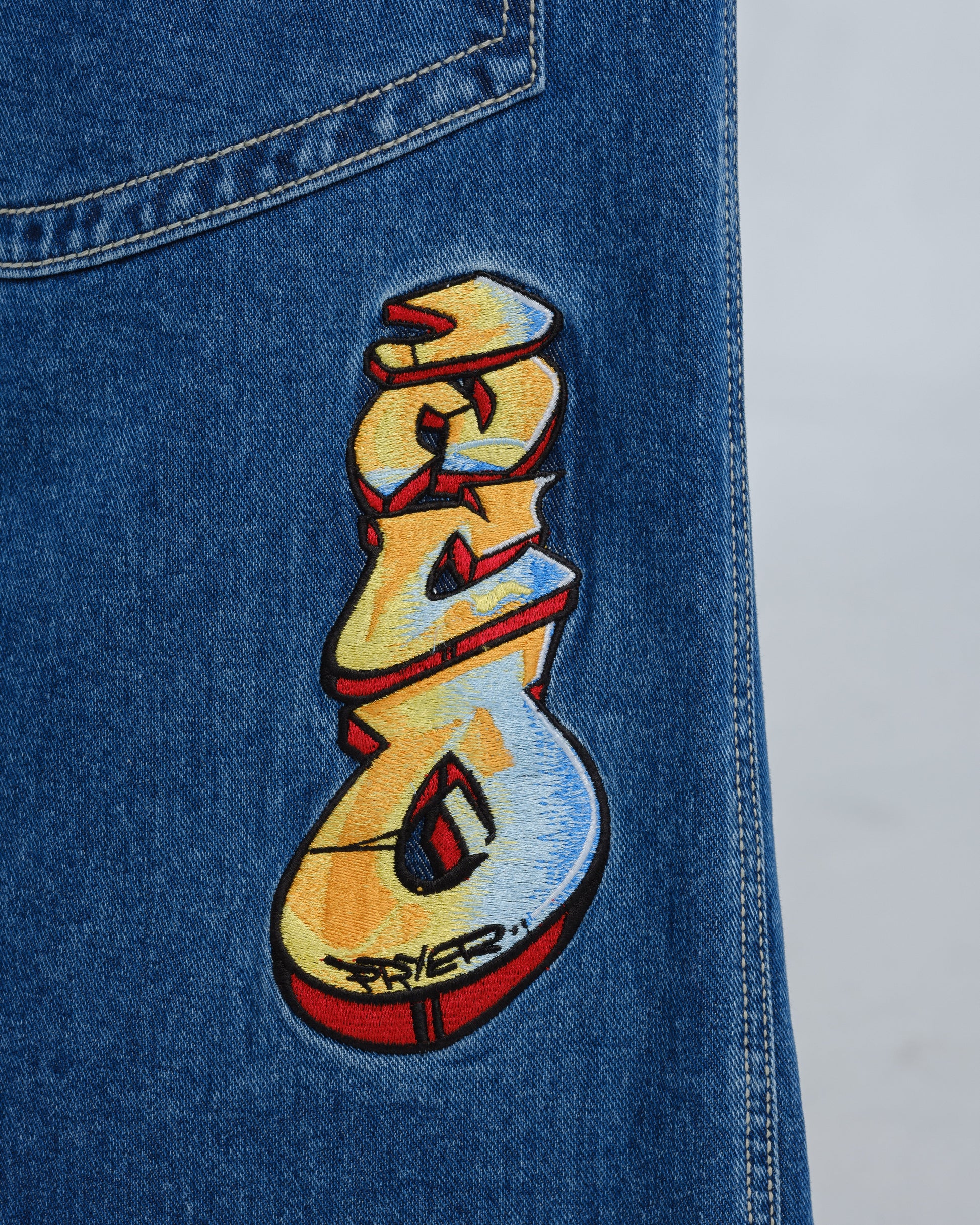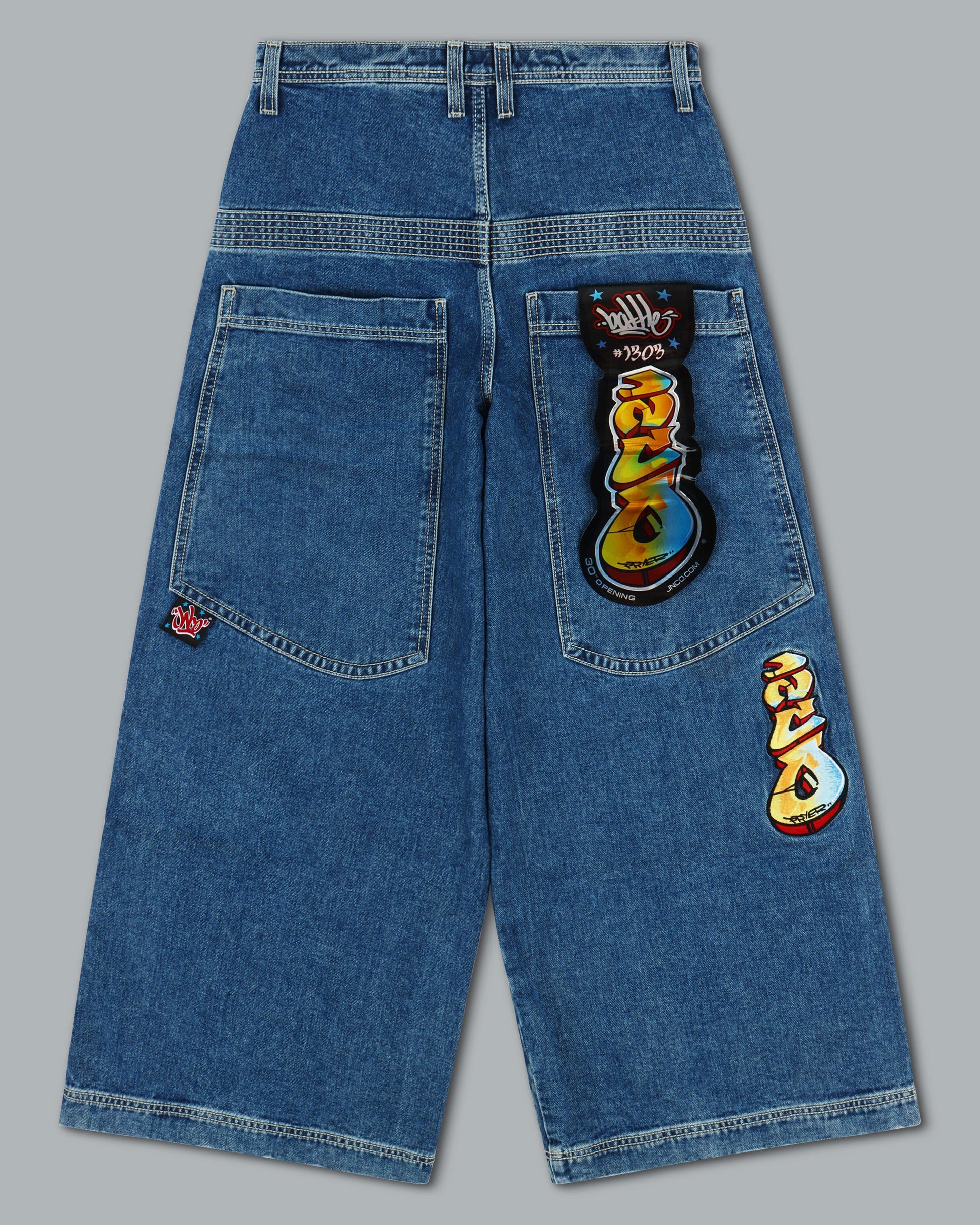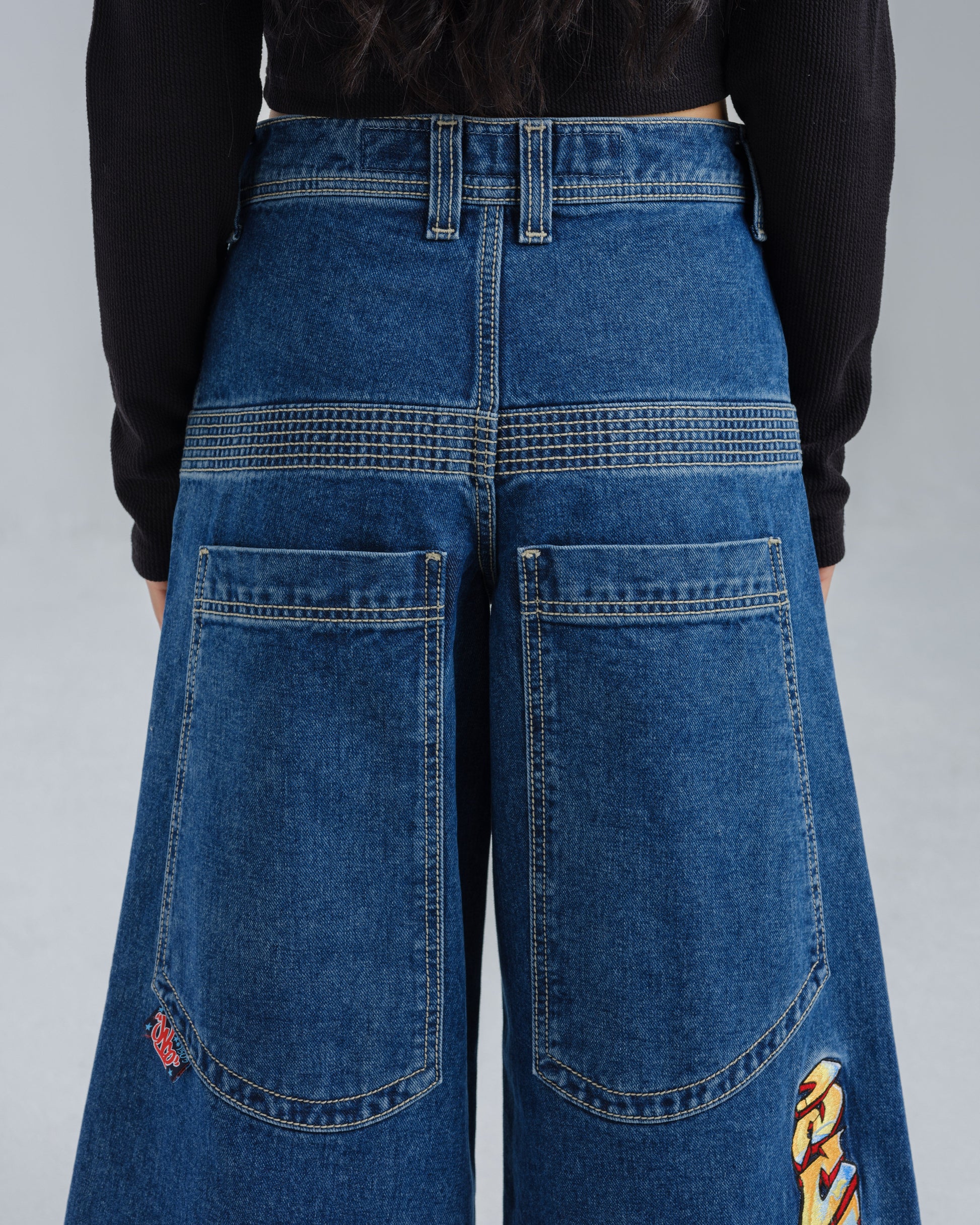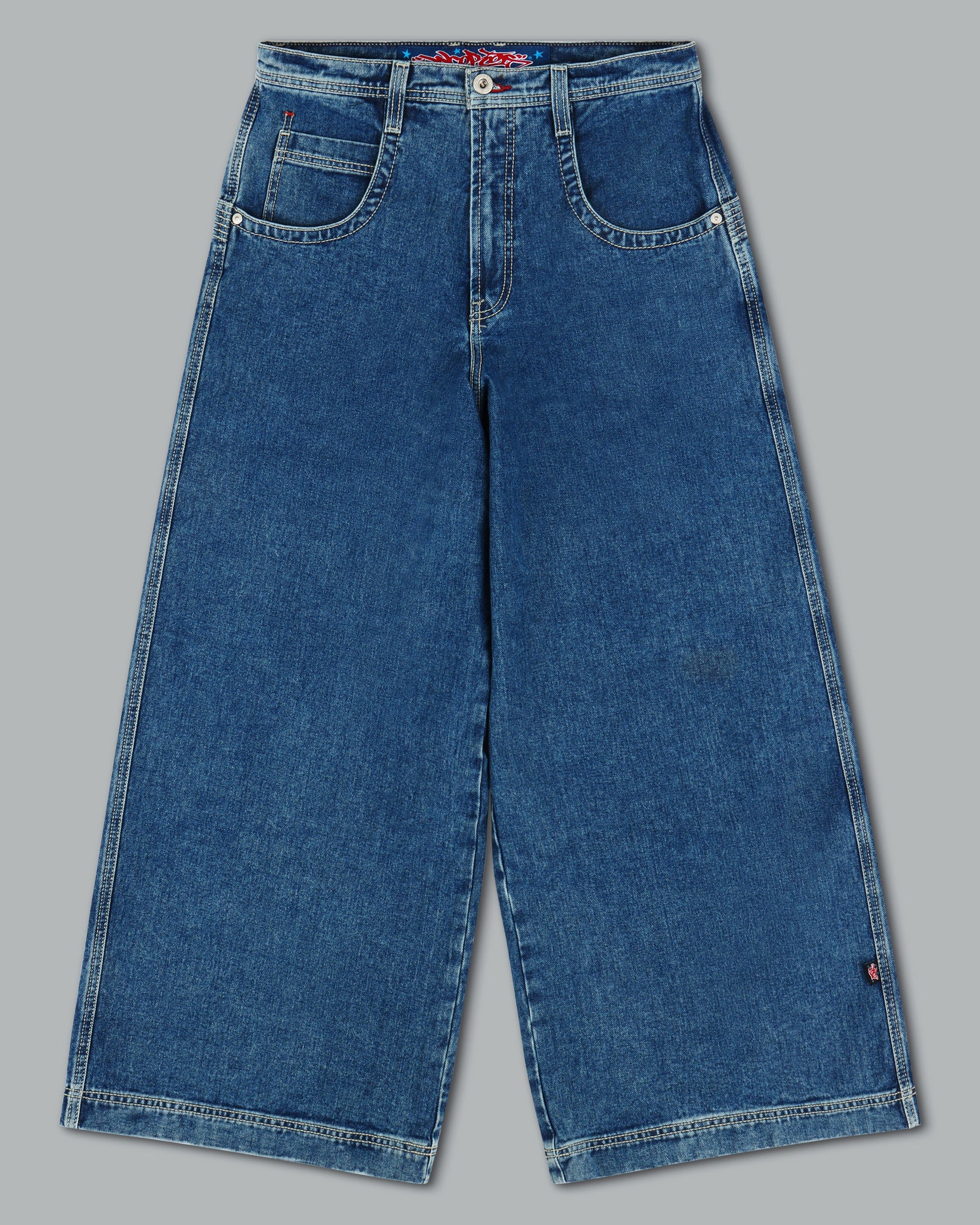 Collector’s item from the original JNCO Roots line. Dark Stone Wash, 30" bottom opening. 14oz 100% cotton denim with heavy double contrast stitching and six rows on back yoke. Back leg logo embroidery with 50,000+ stitches, signed by the original graffiti artist. Original labels, collectible flasher, and JNCO Roots stickers. Limited Edition – very limited stock.