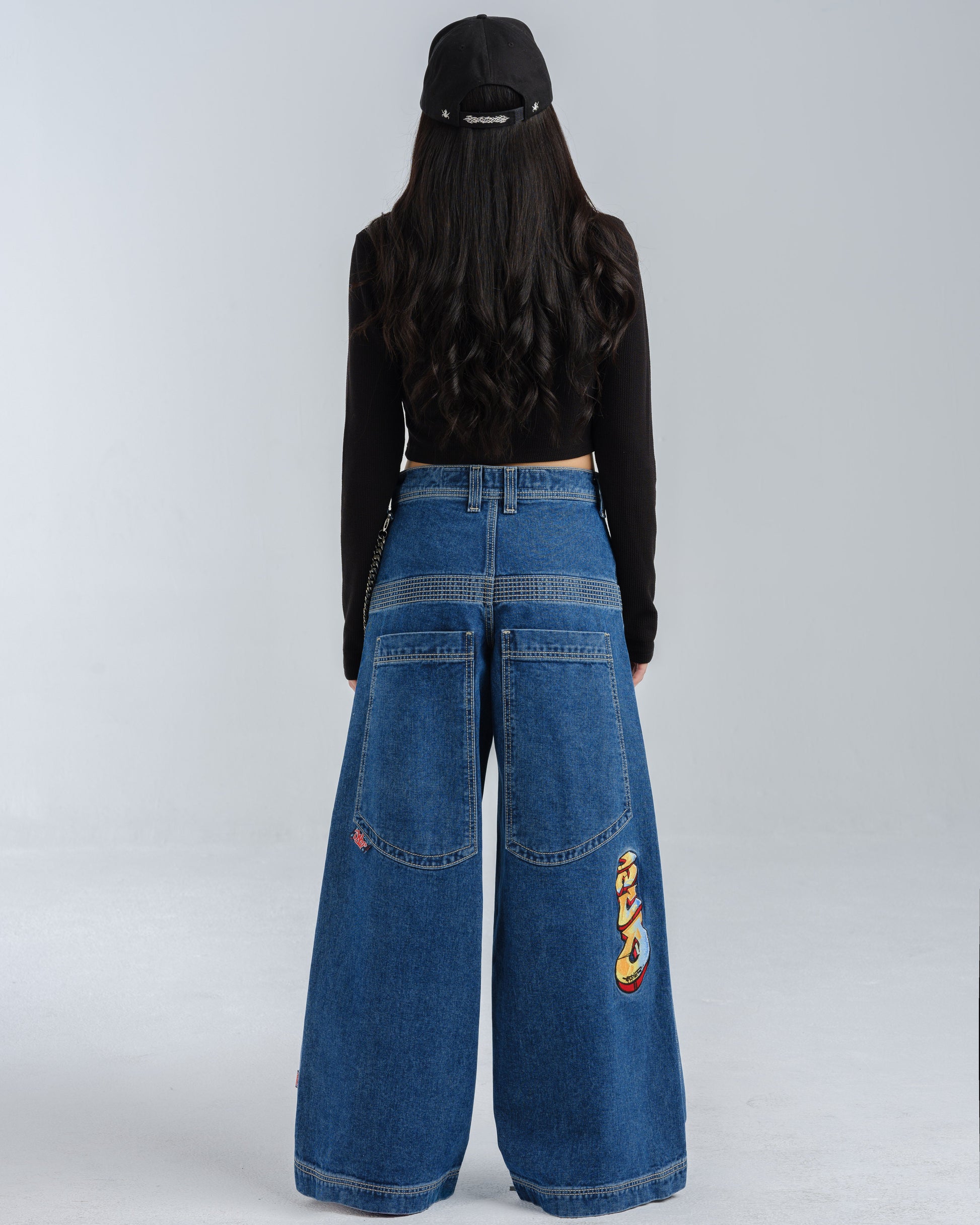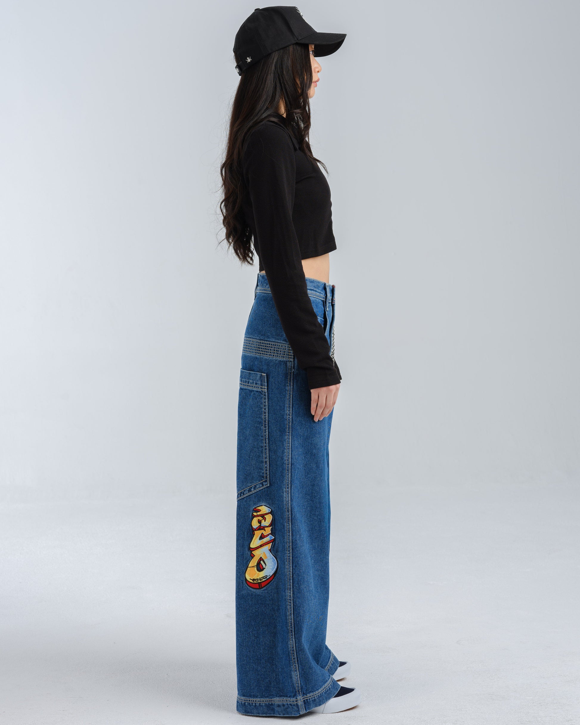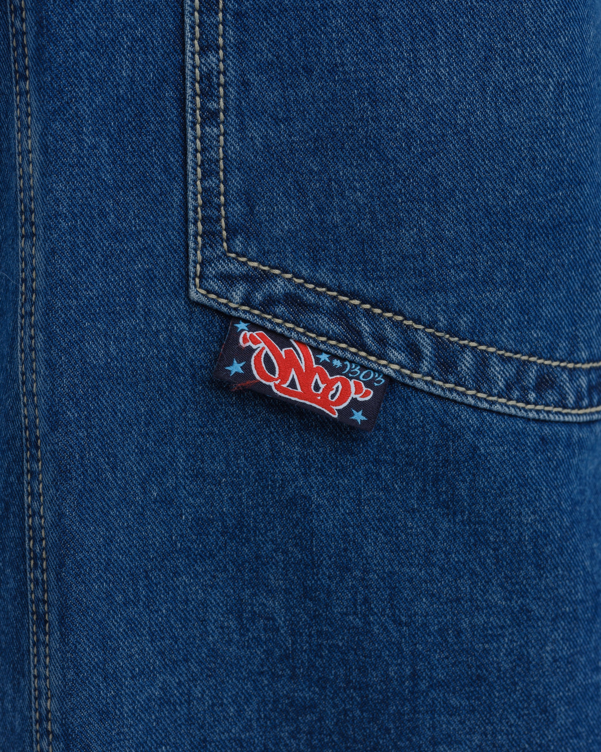 Collector’s item from the original JNCO Roots line. Dark Stone Wash, 30" bottom opening. 14oz 100% cotton denim with heavy double contrast stitching and six rows on back yoke. Back leg logo embroidery with 50,000+ stitches, signed by the original graffiti artist. Original labels, collectible flasher, and JNCO Roots stickers. Limited Edition – very limited stock.