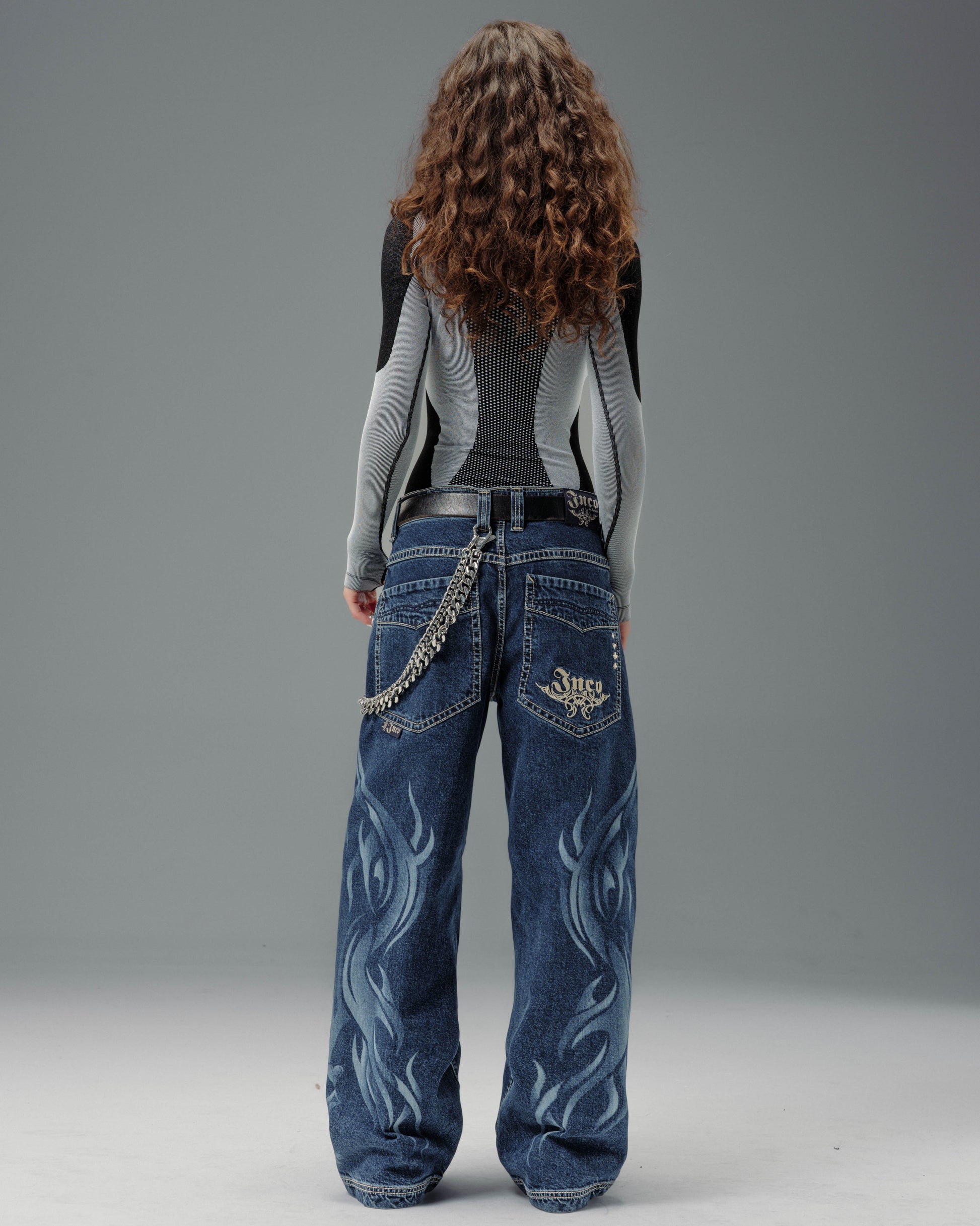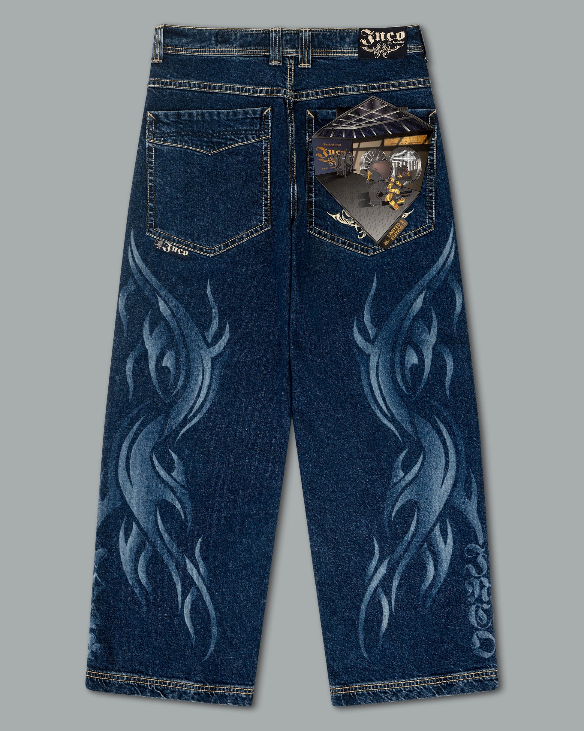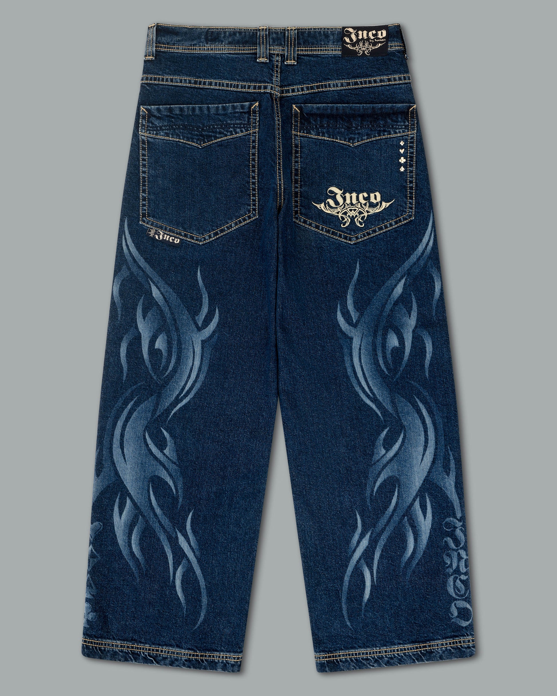 From the famous Tribal Collection. 13oz ring-spun denim in a Dark Stone wash with a deep indigo tone and a structured, smooth silhouette. 23" bottom opening with contrast stitching and a wide-leg fit. Features laser-etched tribal flame artwork down both legs, original Celtic-inspired tribal embroidery on the back pocket in palladium metallic thread, and the signature four-suit rivets. Collectible flasher included.