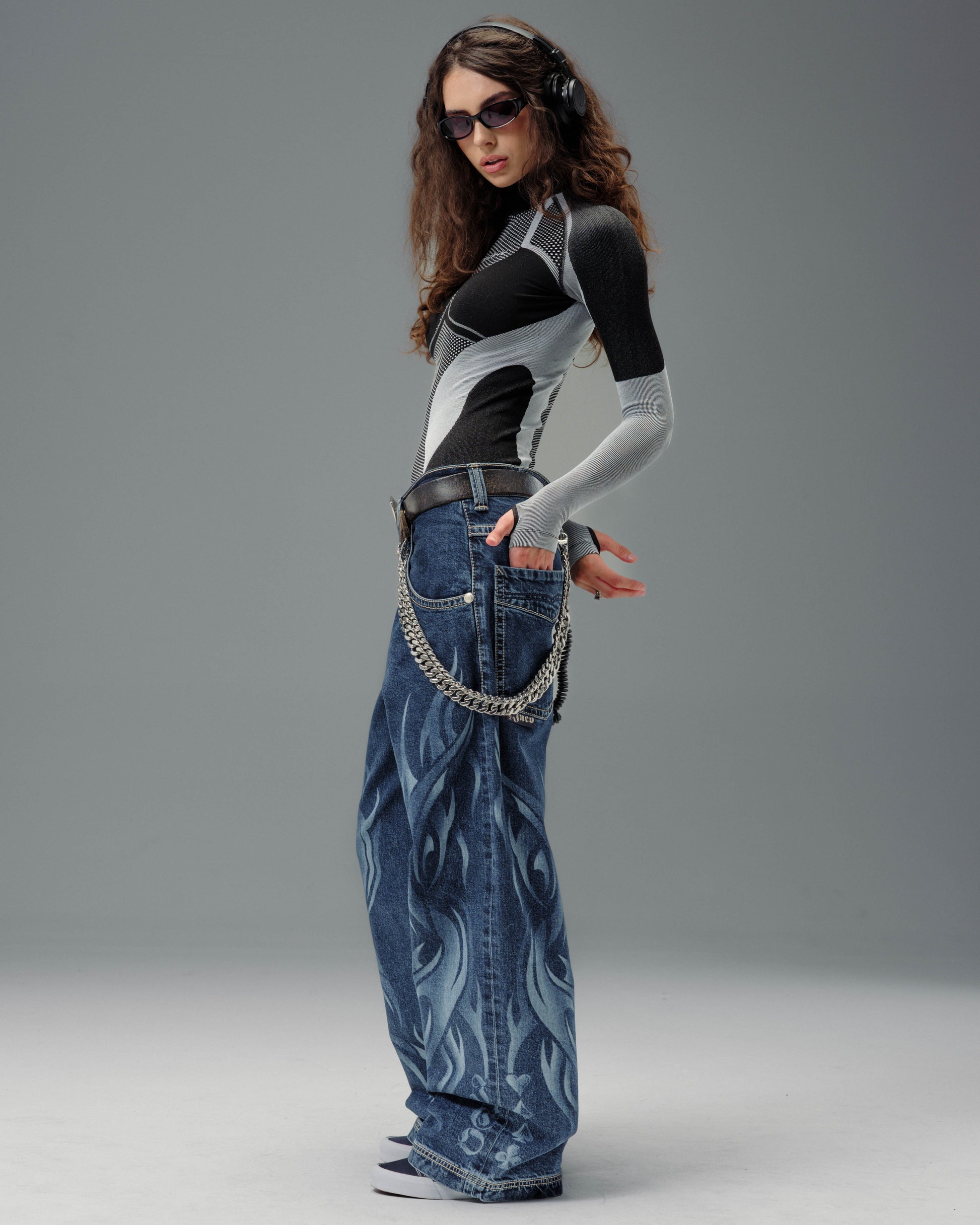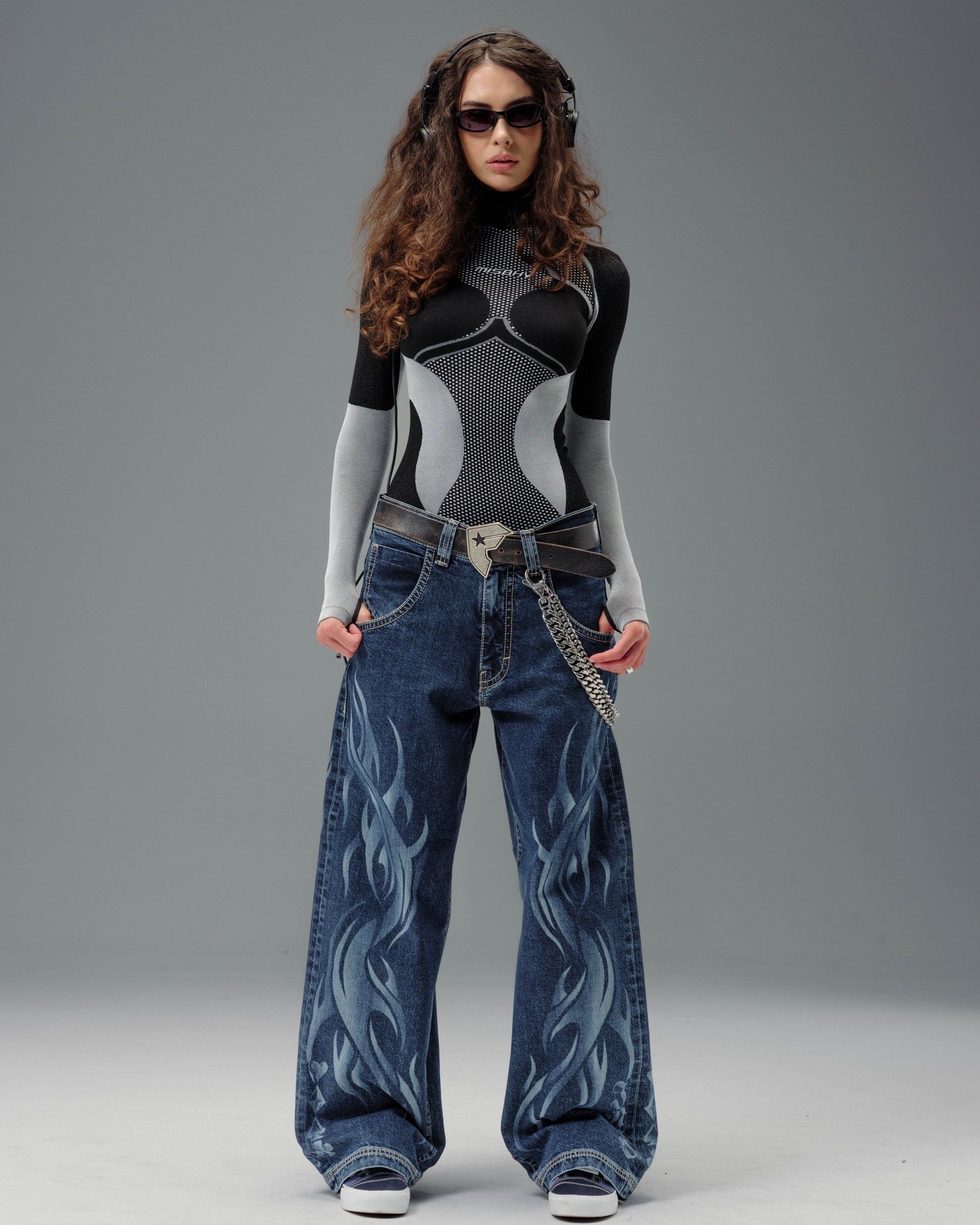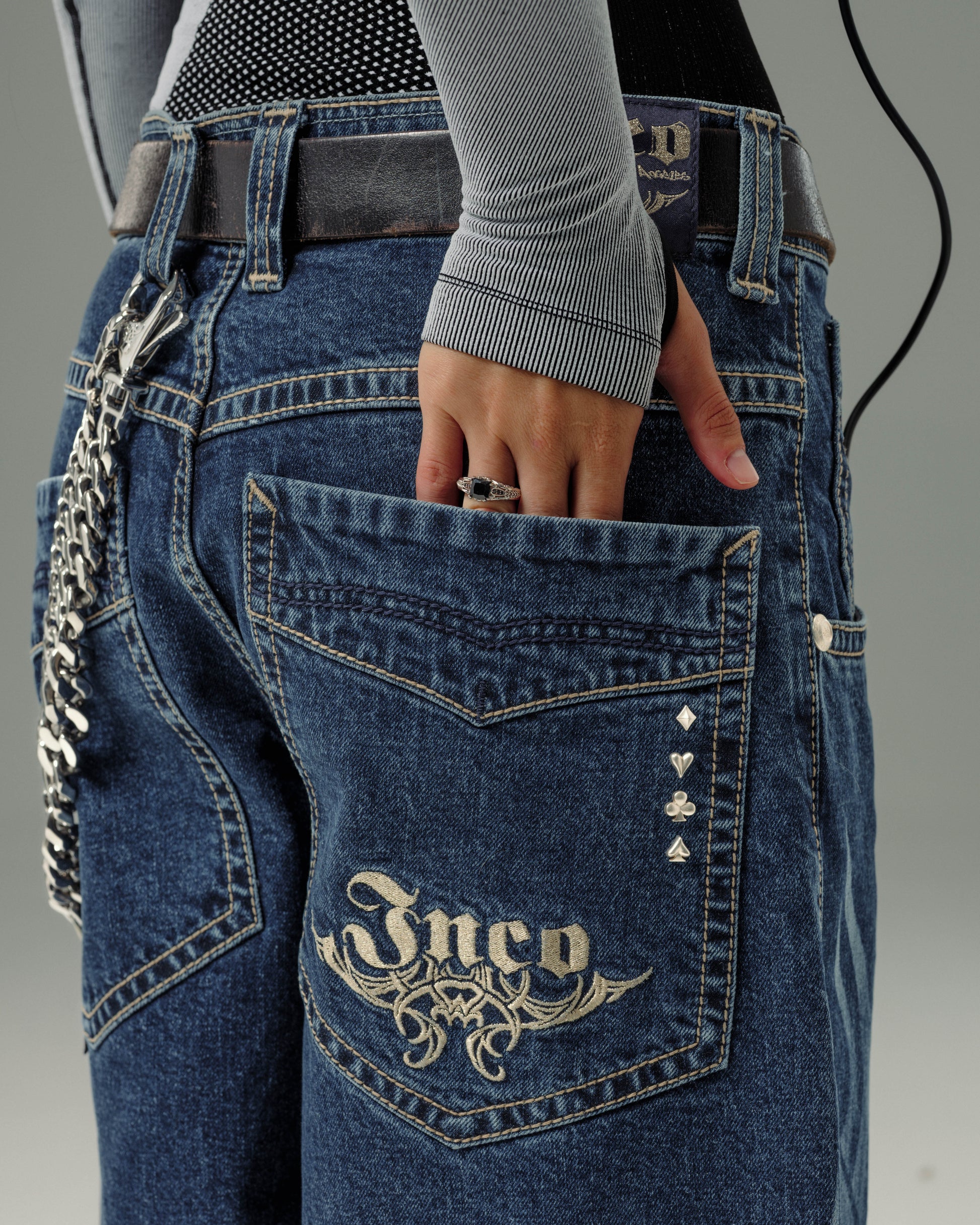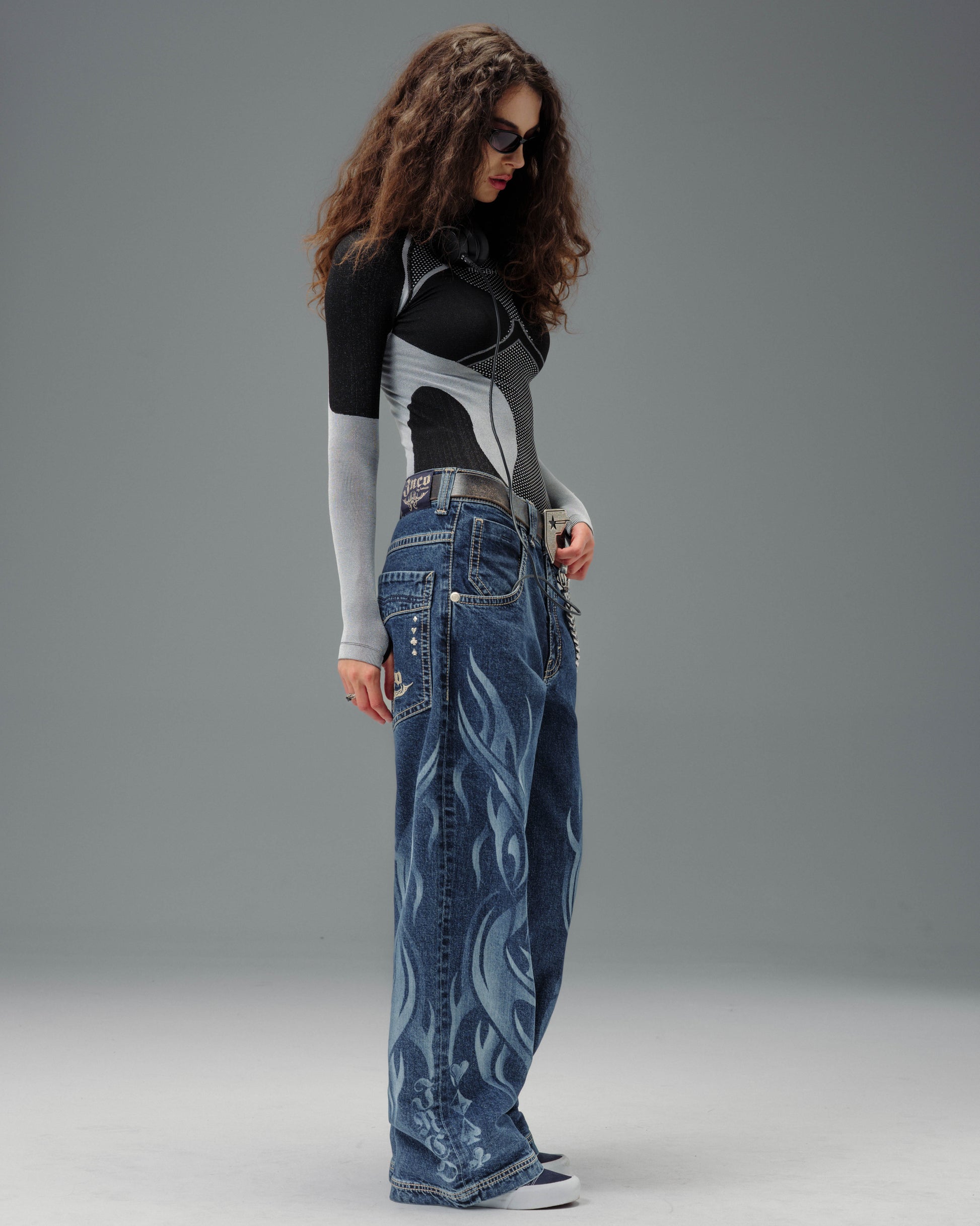 From the famous Tribal Collection. 13oz ring-spun denim in a Dark Stone wash with a deep indigo tone and a structured, smooth silhouette. 23" bottom opening with contrast stitching and a wide-leg fit. Features laser-etched tribal flame artwork down both legs, original Celtic-inspired tribal embroidery on the back pocket in palladium metallic thread, and the signature four-suit rivets. Collectible flasher included.
